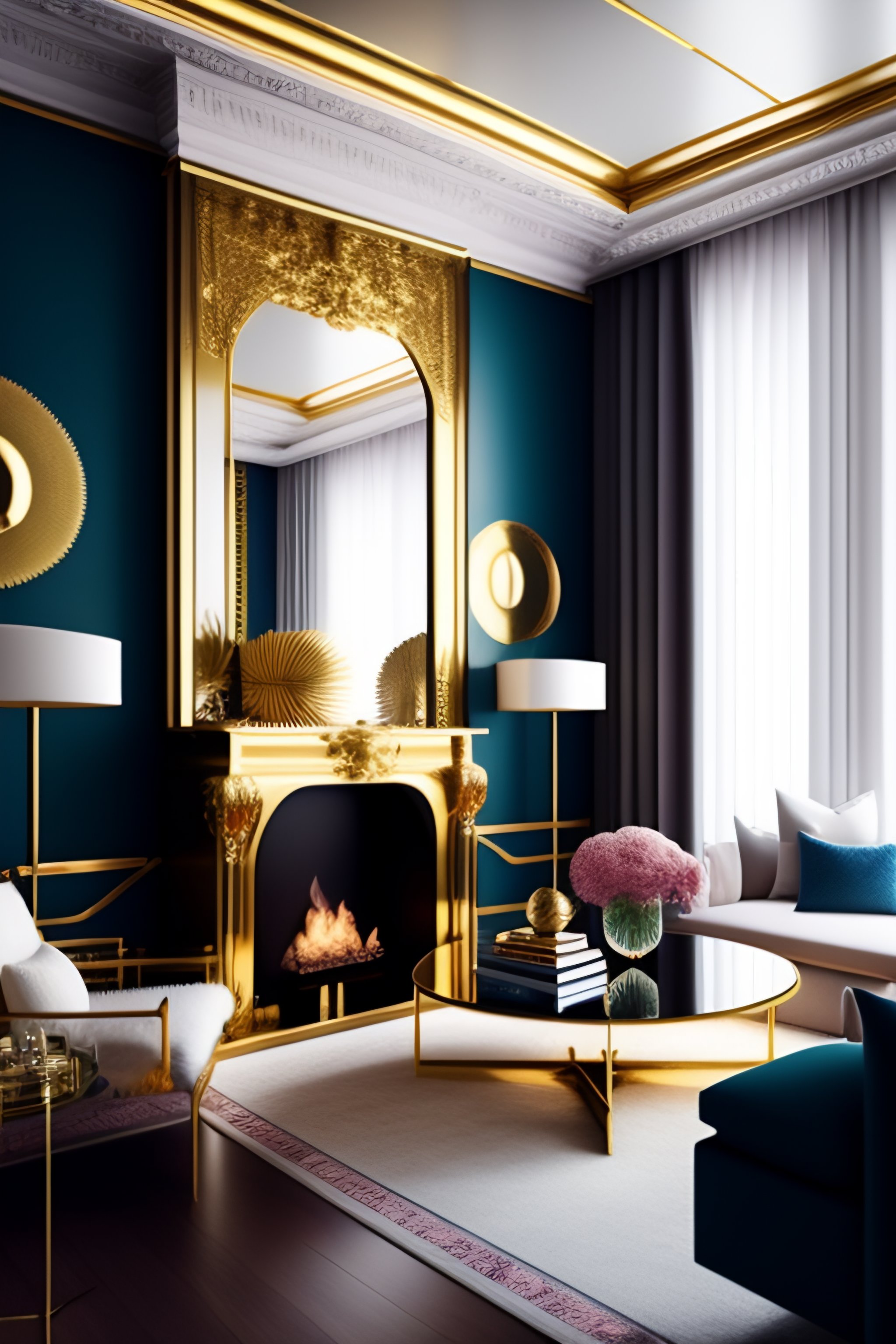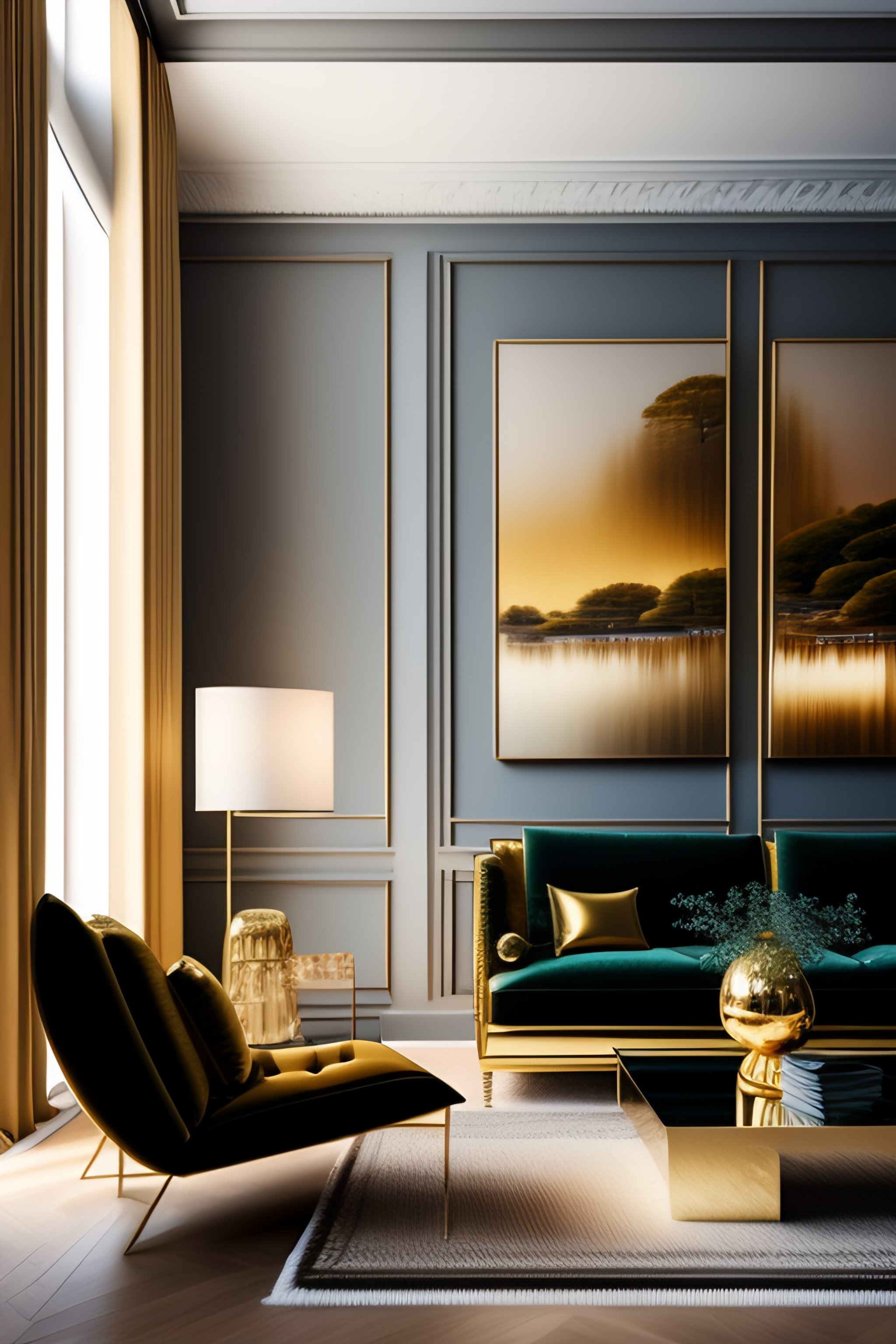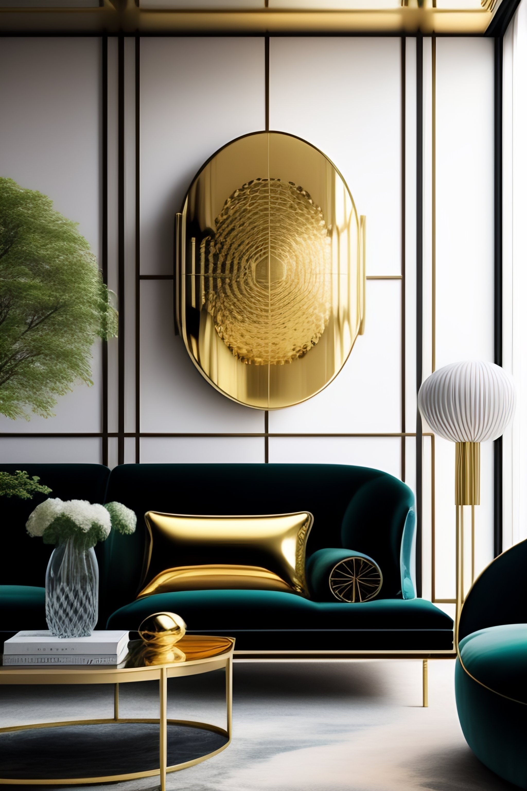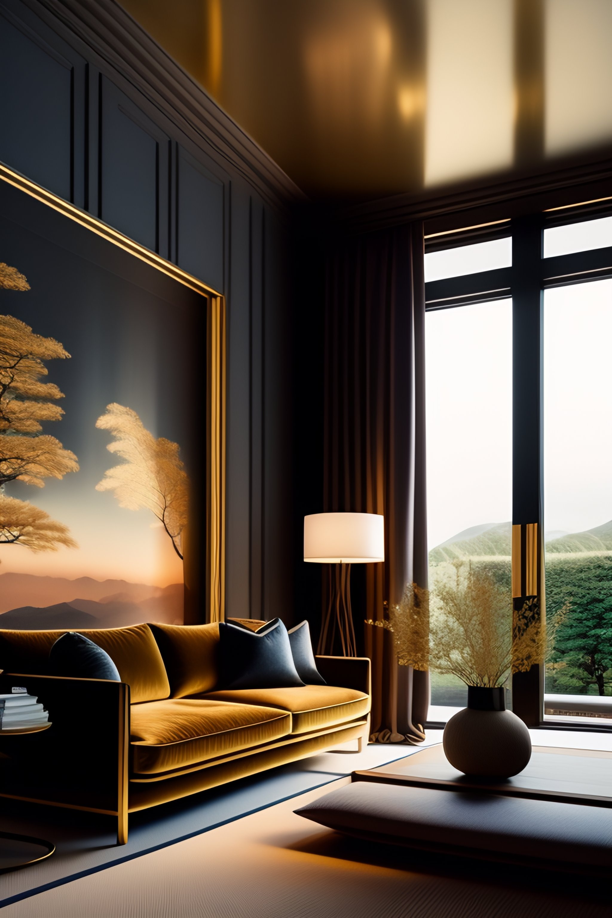 Architectural digest photo of a japanese and scandinavian design style living room with lots of golden light, hyperrealistic surrealism, award winning masterpiece with incredible details, epic stunning