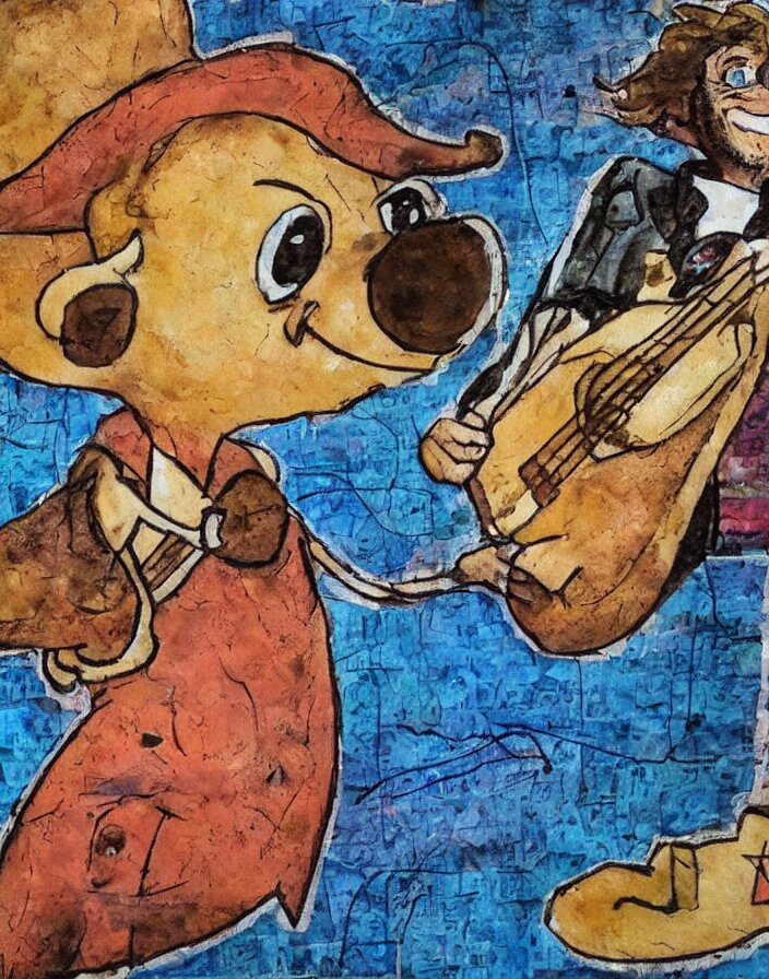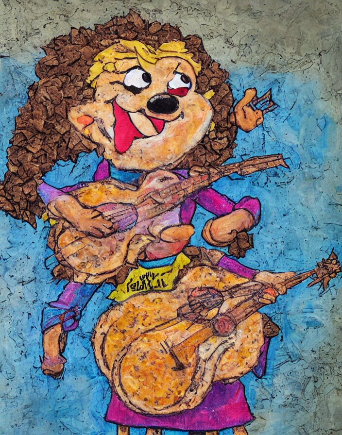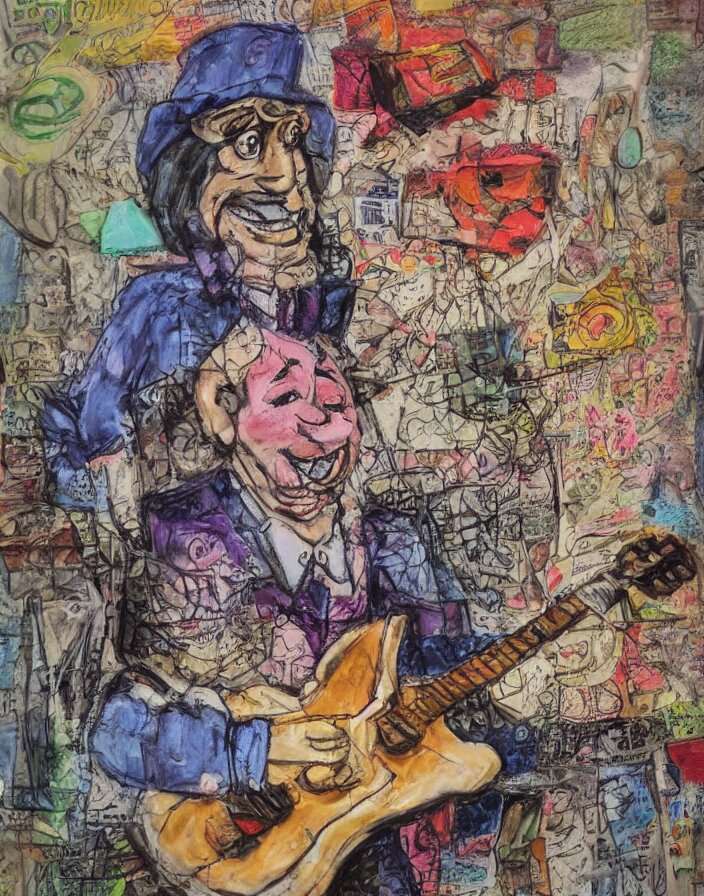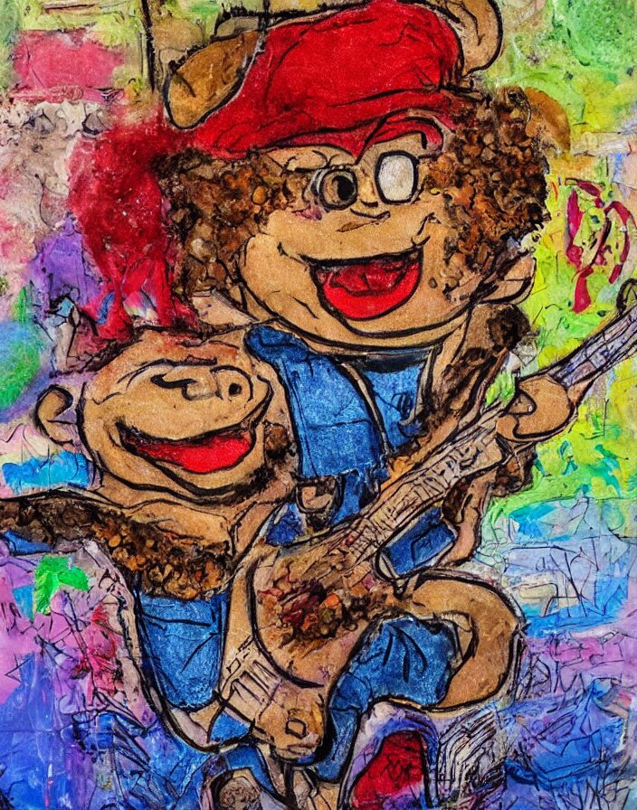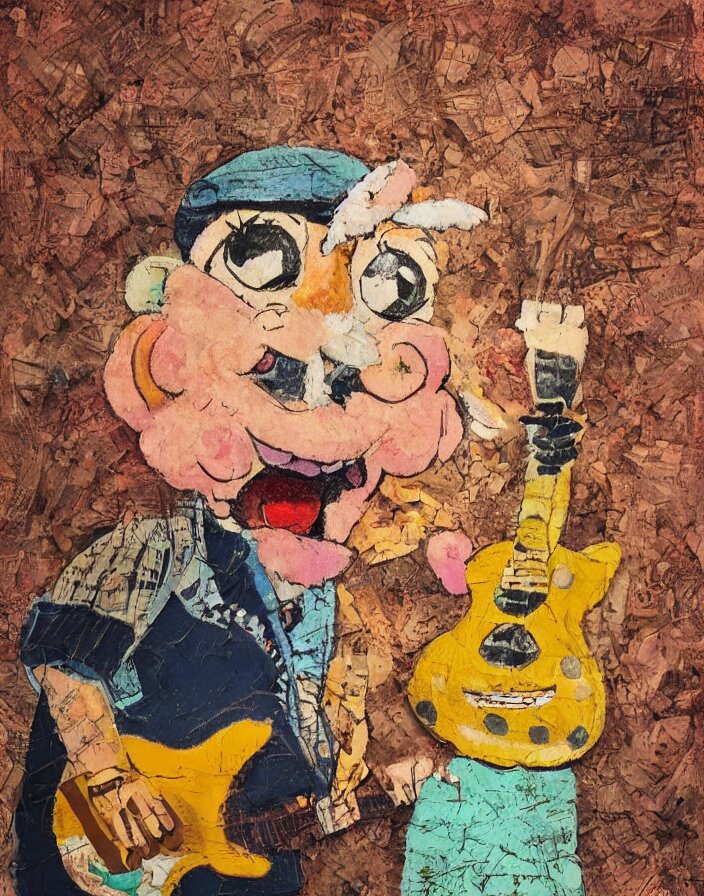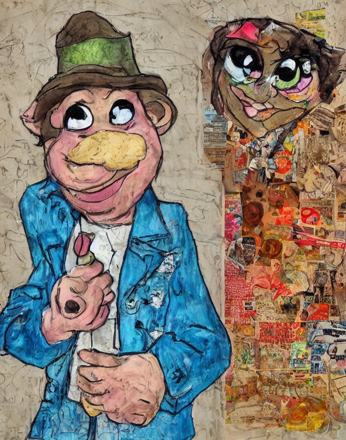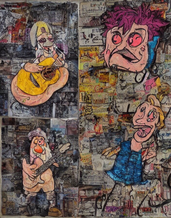 Schnitzel from chowder as a 1970s street performer, detailed and highly reliefed analogue mixed media collage with canvas texture in style of conteporary art, photorealistic, expressionism, masterpiece, perfect composition, hyperrealistic beautiful face, spectacular quality, intricate oil pastel glow, dynamic lighting, photorealistic, fantasy concept art, ambient lighting, atmospheric, stunning visuals, creative, cinematic, ultra detailed, trending on art station