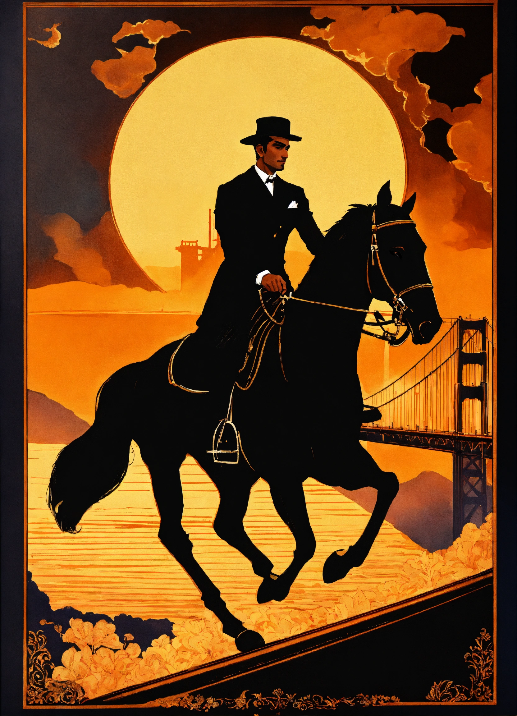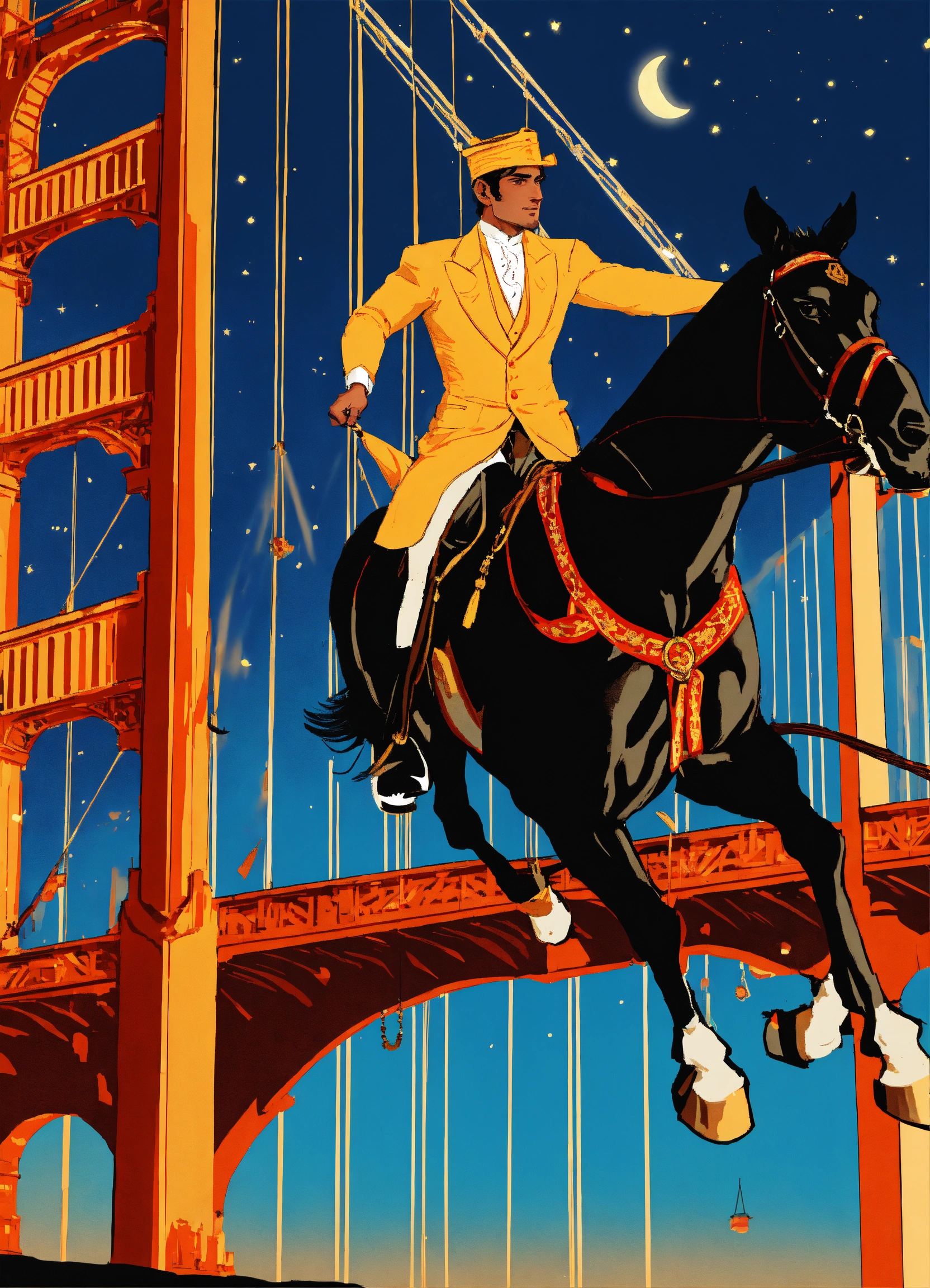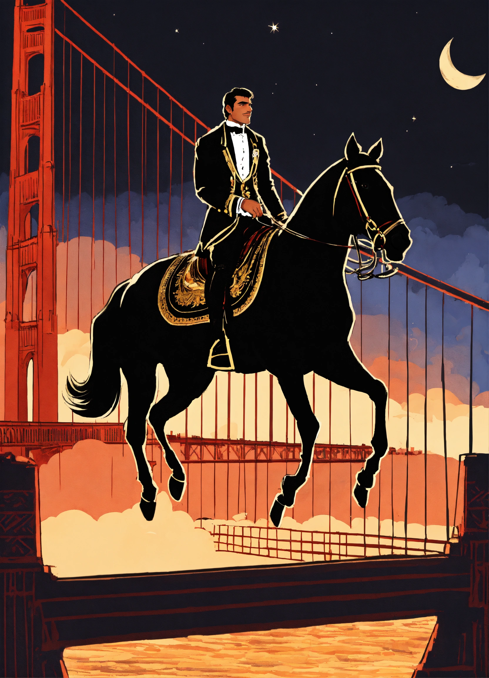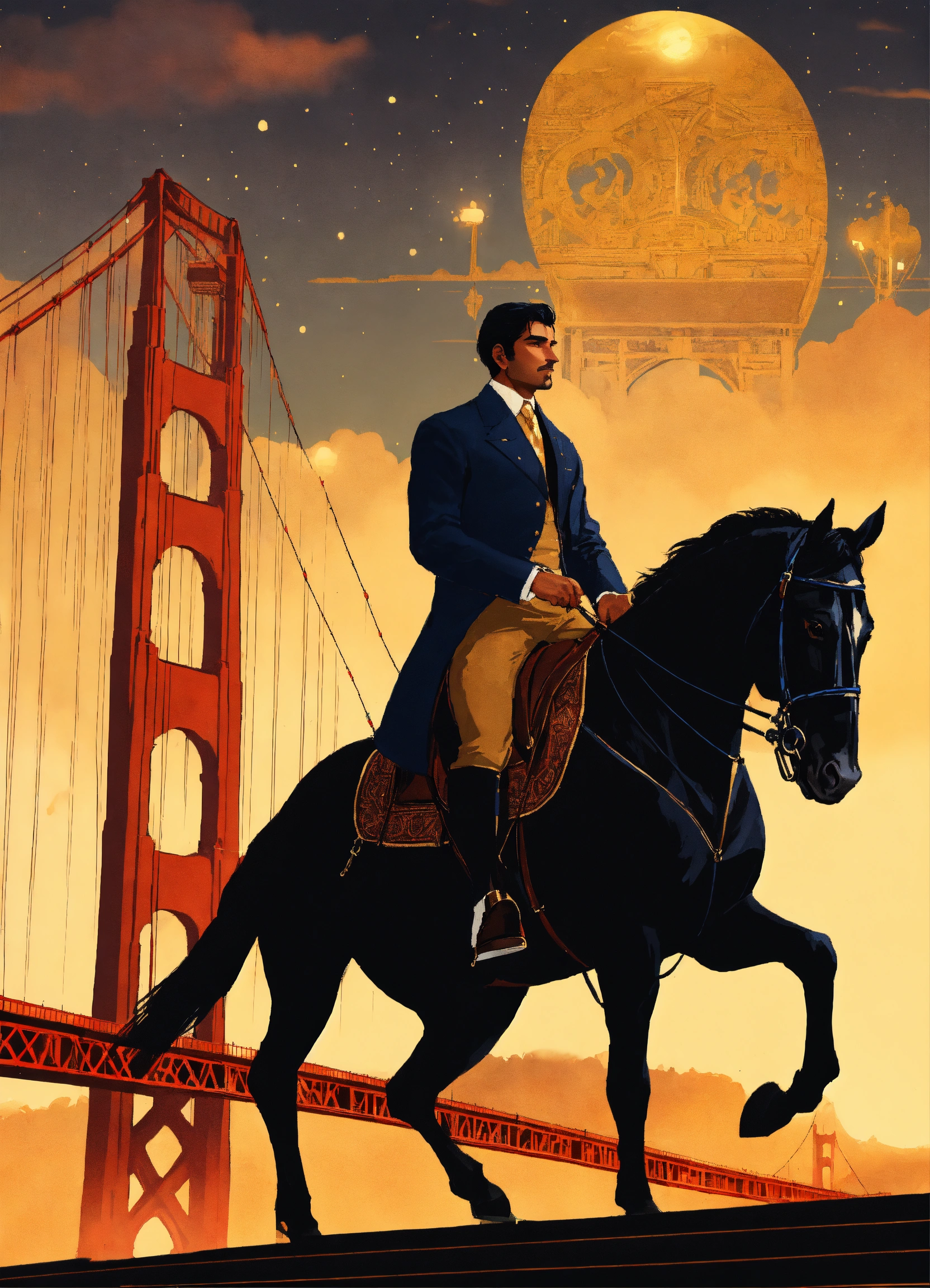 Animated handsome indian aristocrat on a jumping horse that is tall on the golden gate bridge, black suit, night time, during year 1910, golden gate bridge, fine digital art