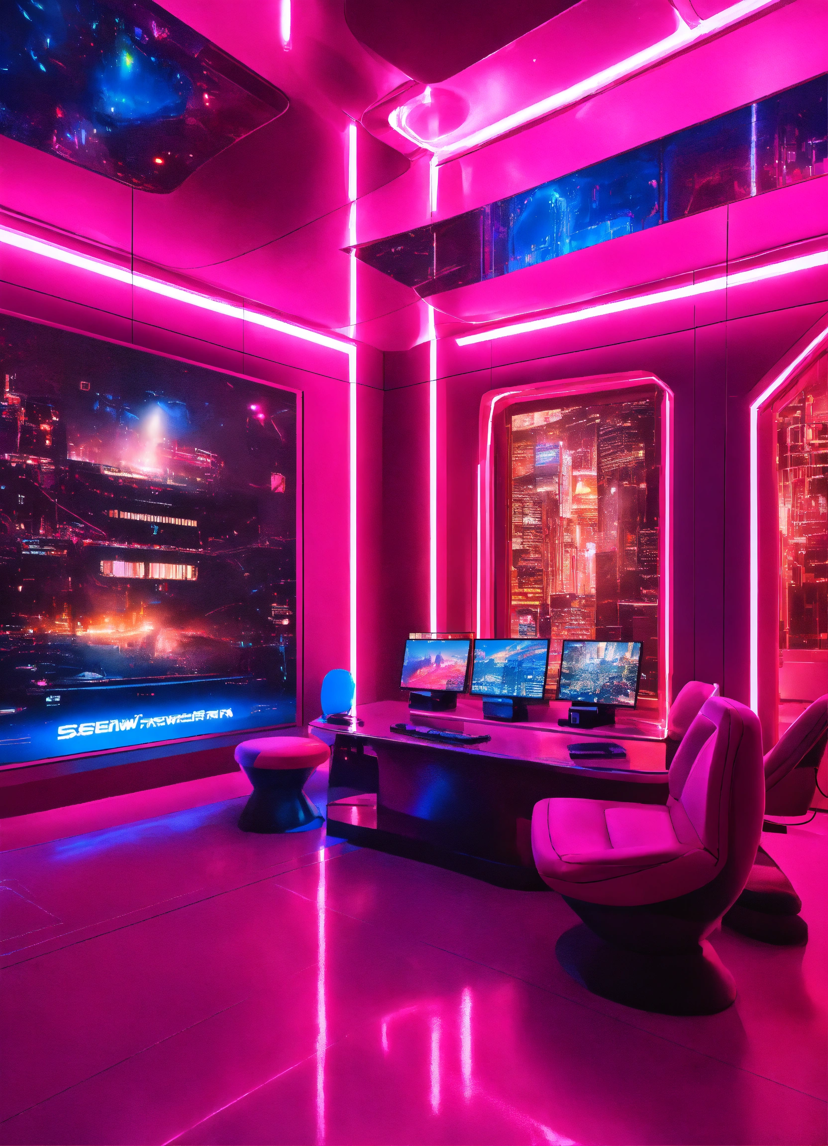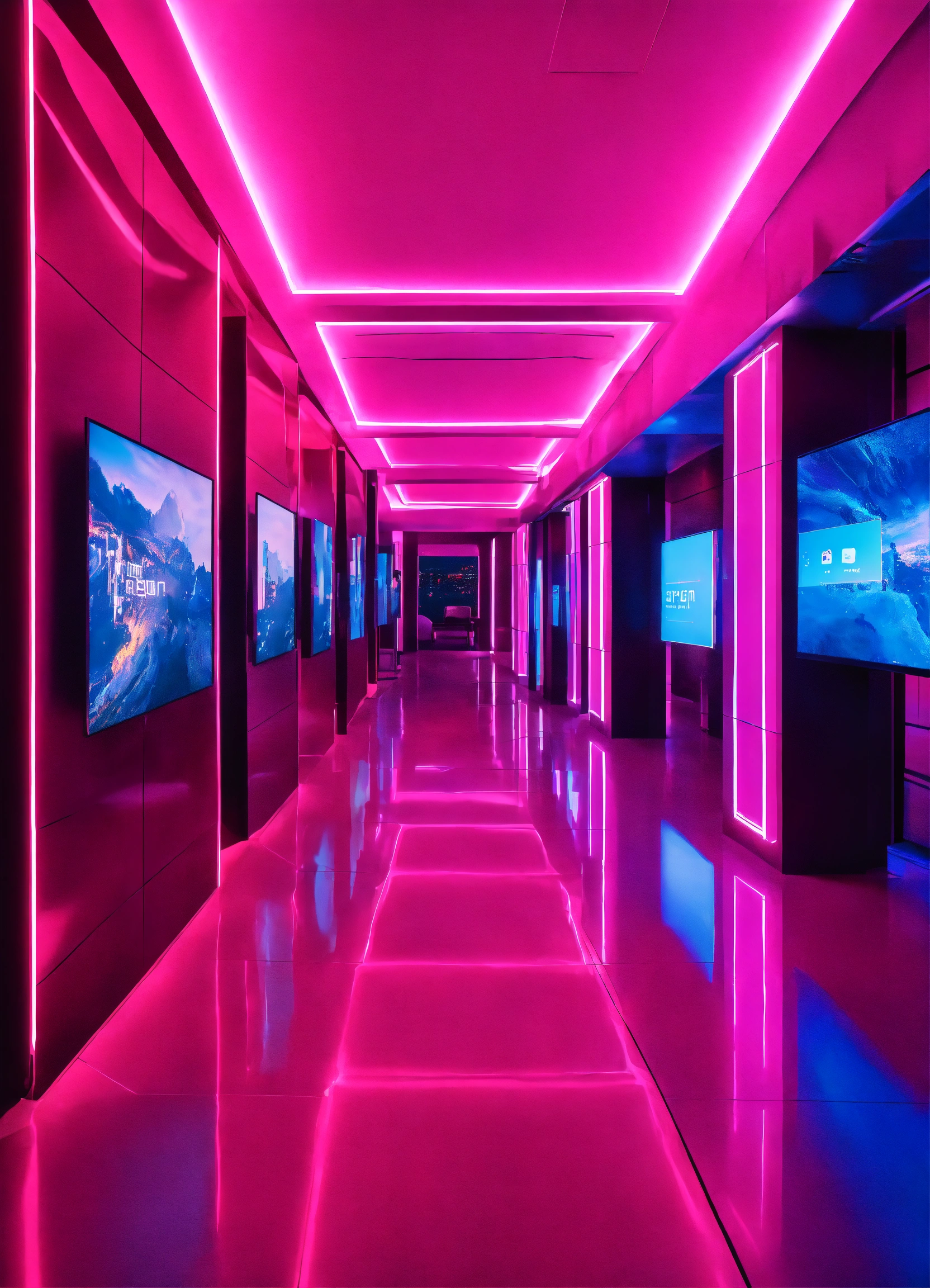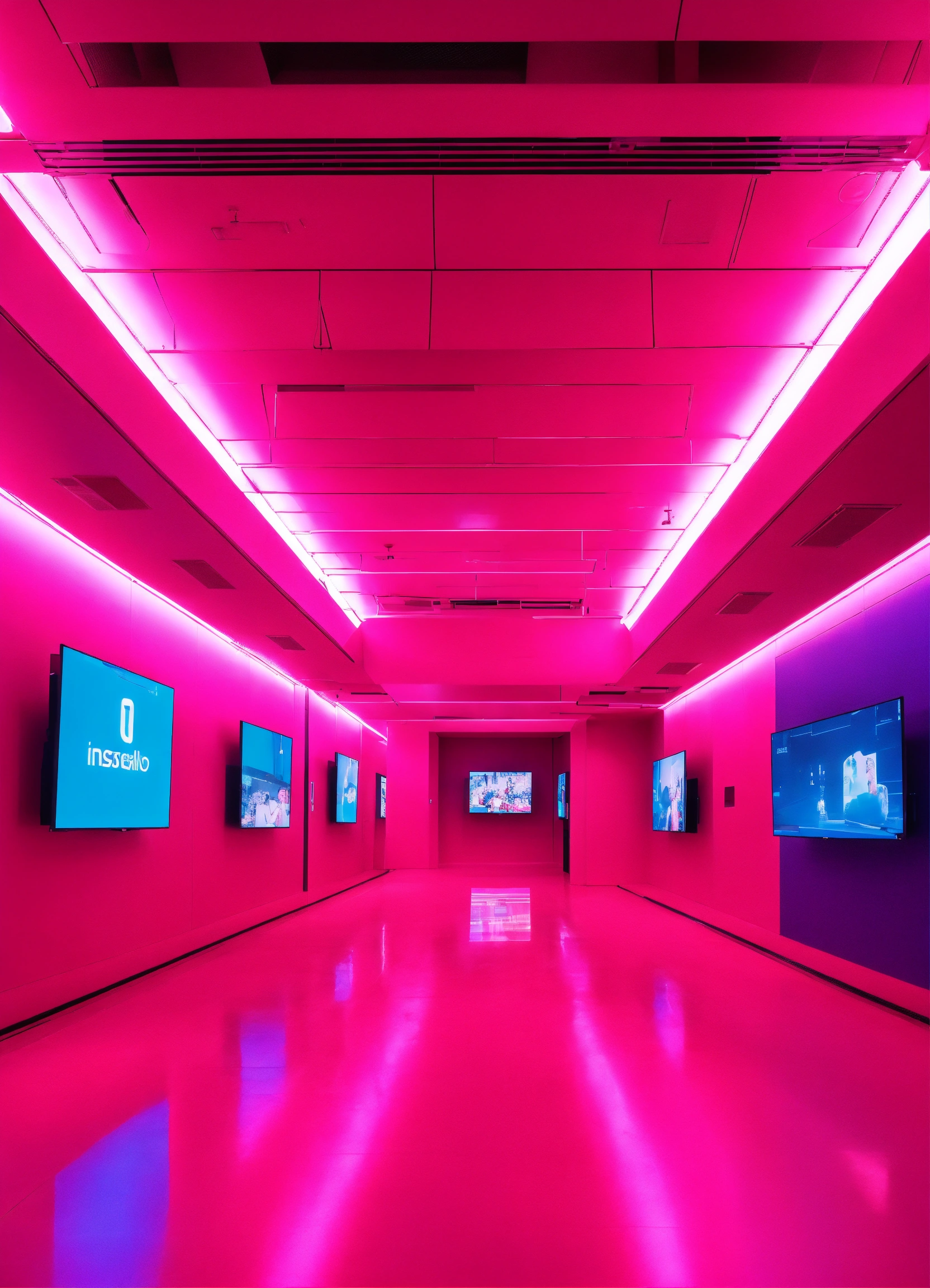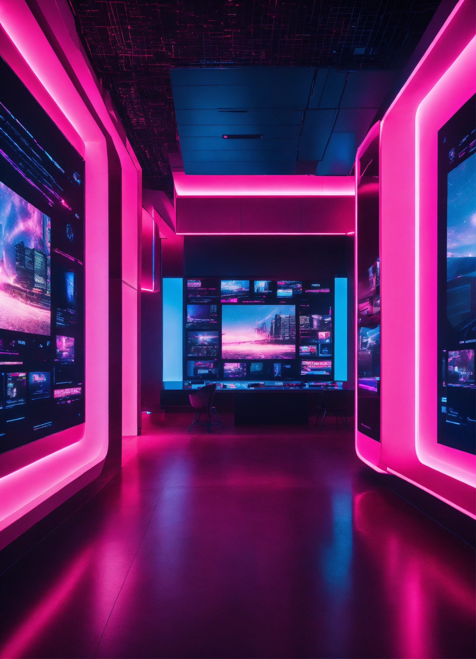 Luxury interior in sci-fi building full of screens, where we see icons of social networks and news, vibrant pink and blue lights colors.