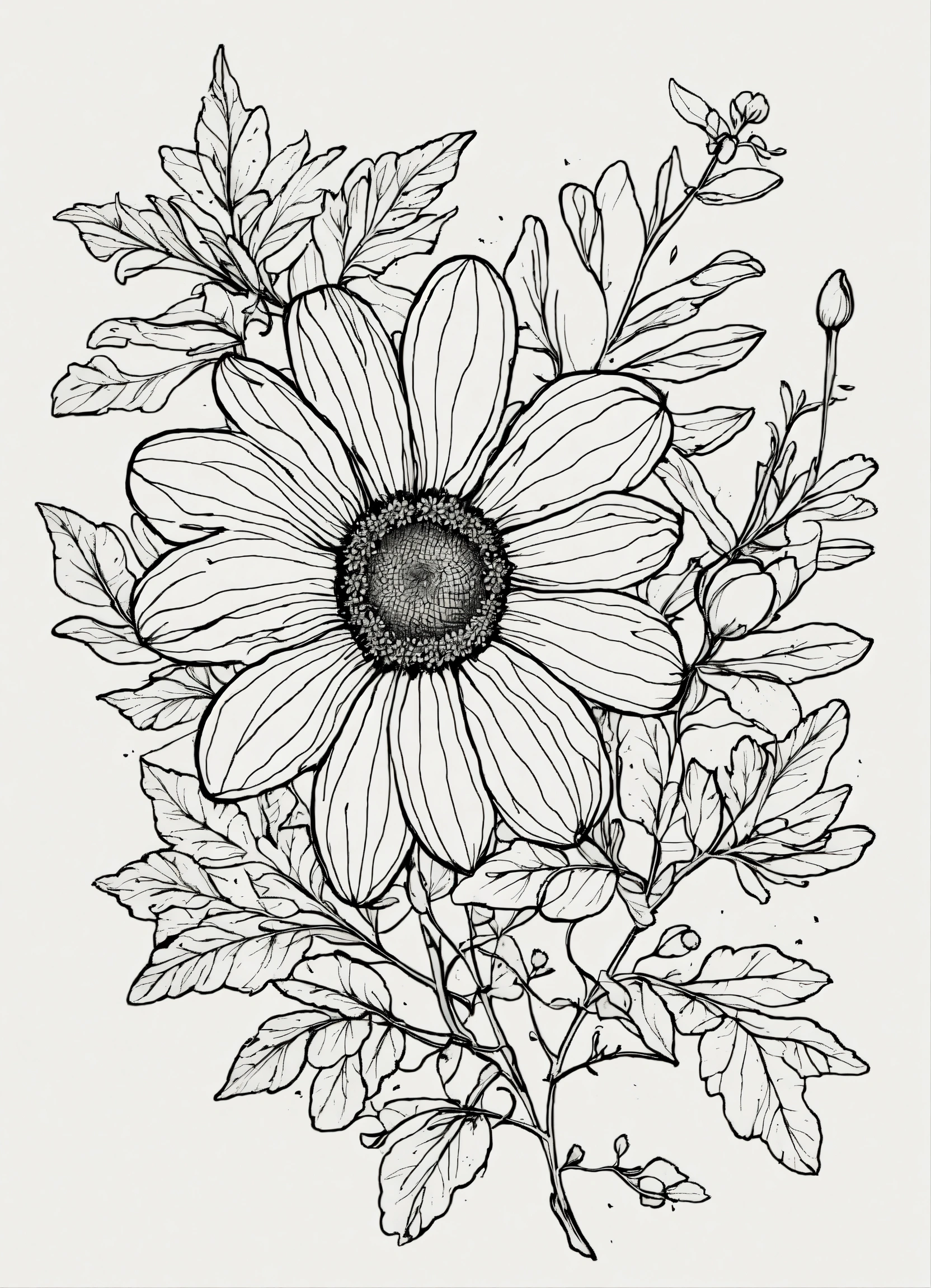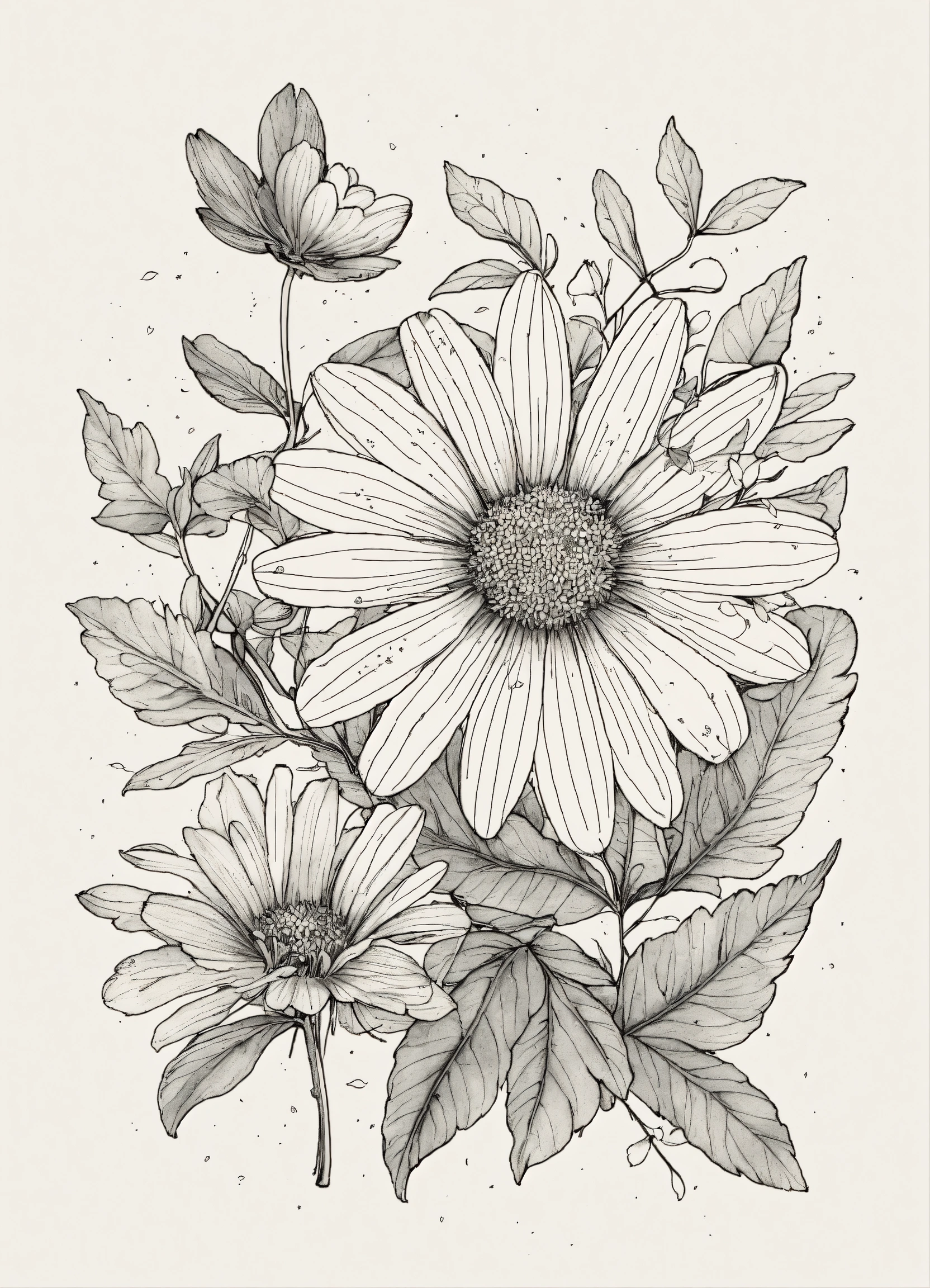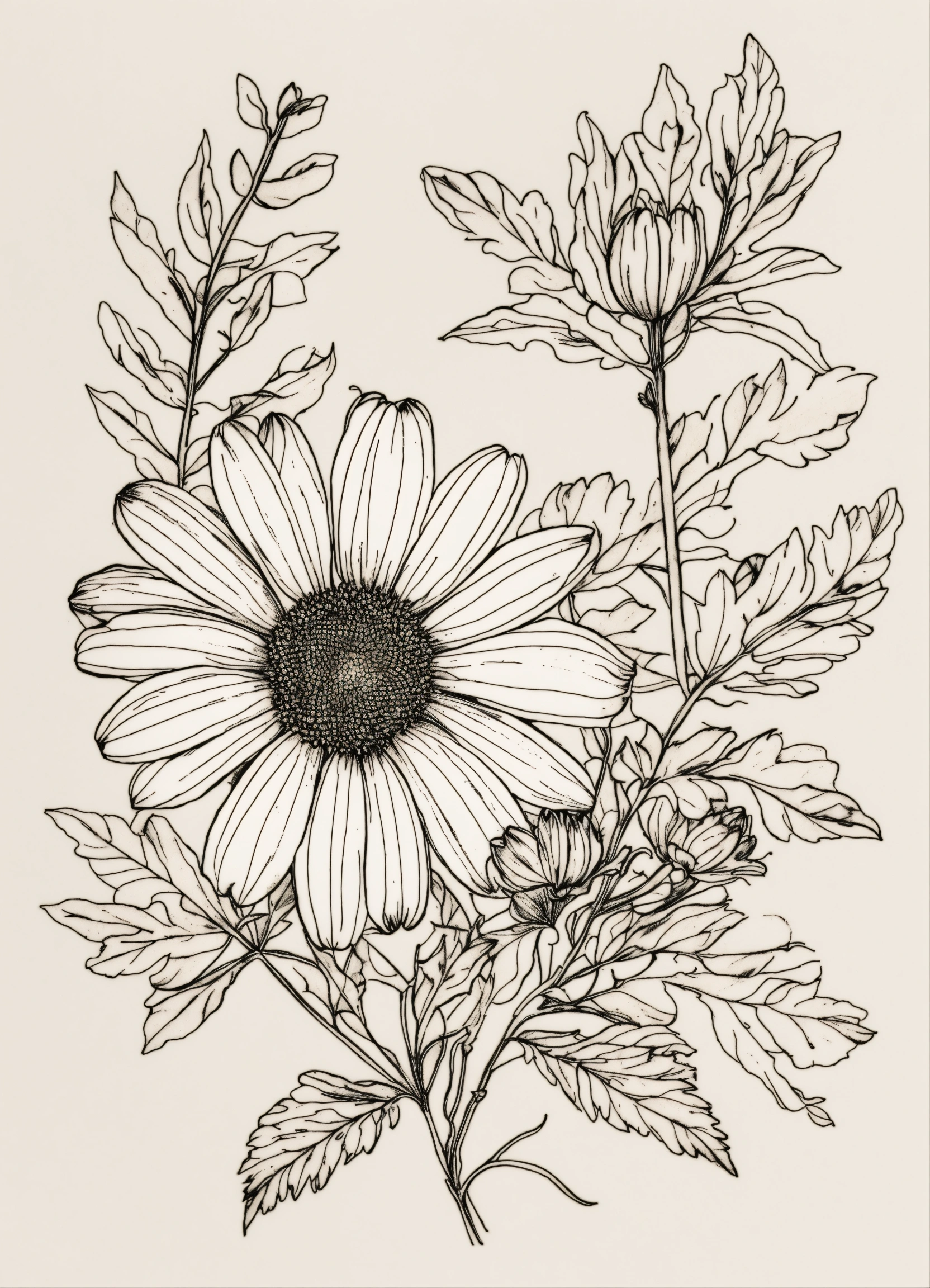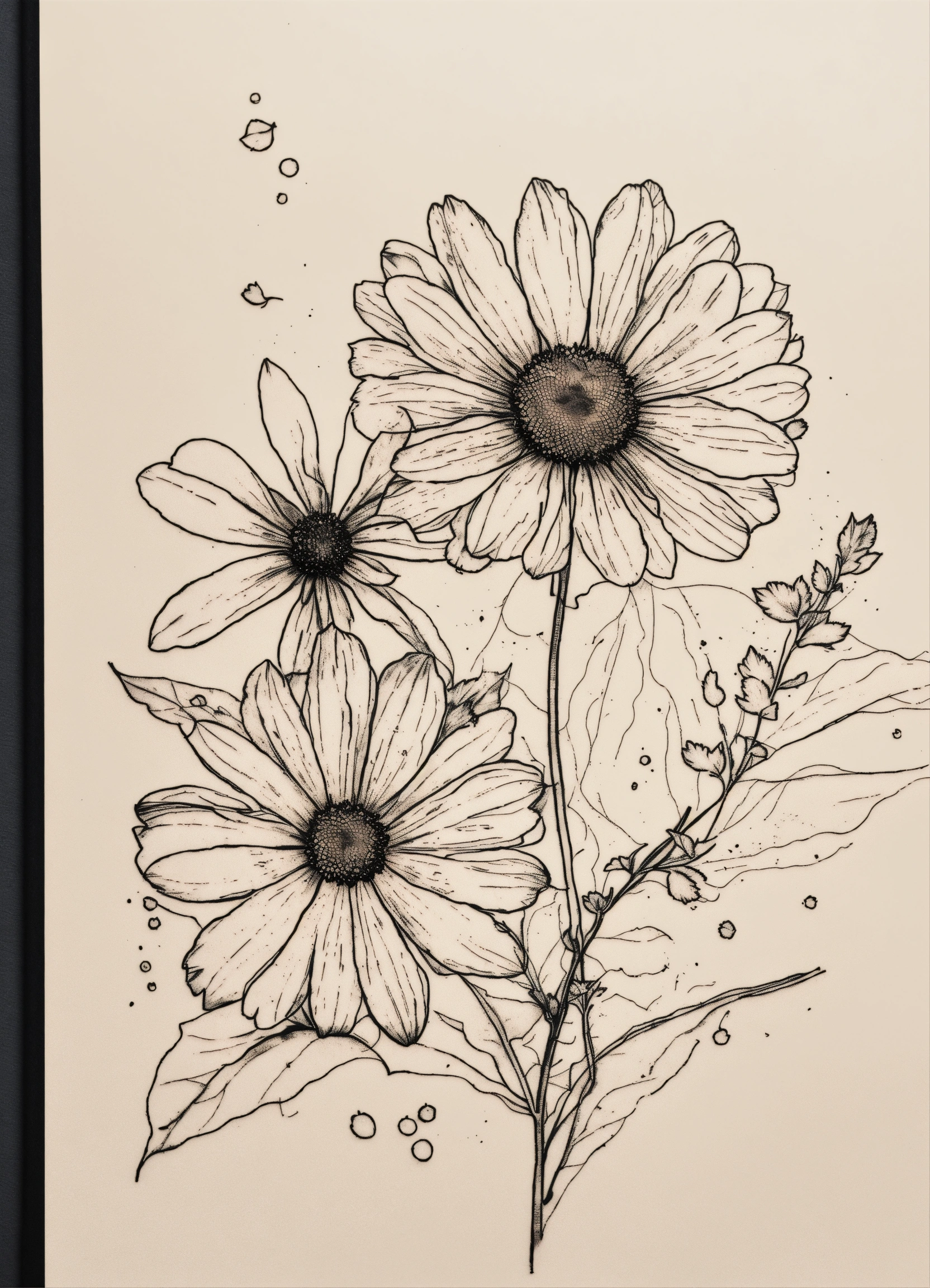A minimalist tattoo line art of a pressed daisy and little leaves with old lines, cottage core style, white background