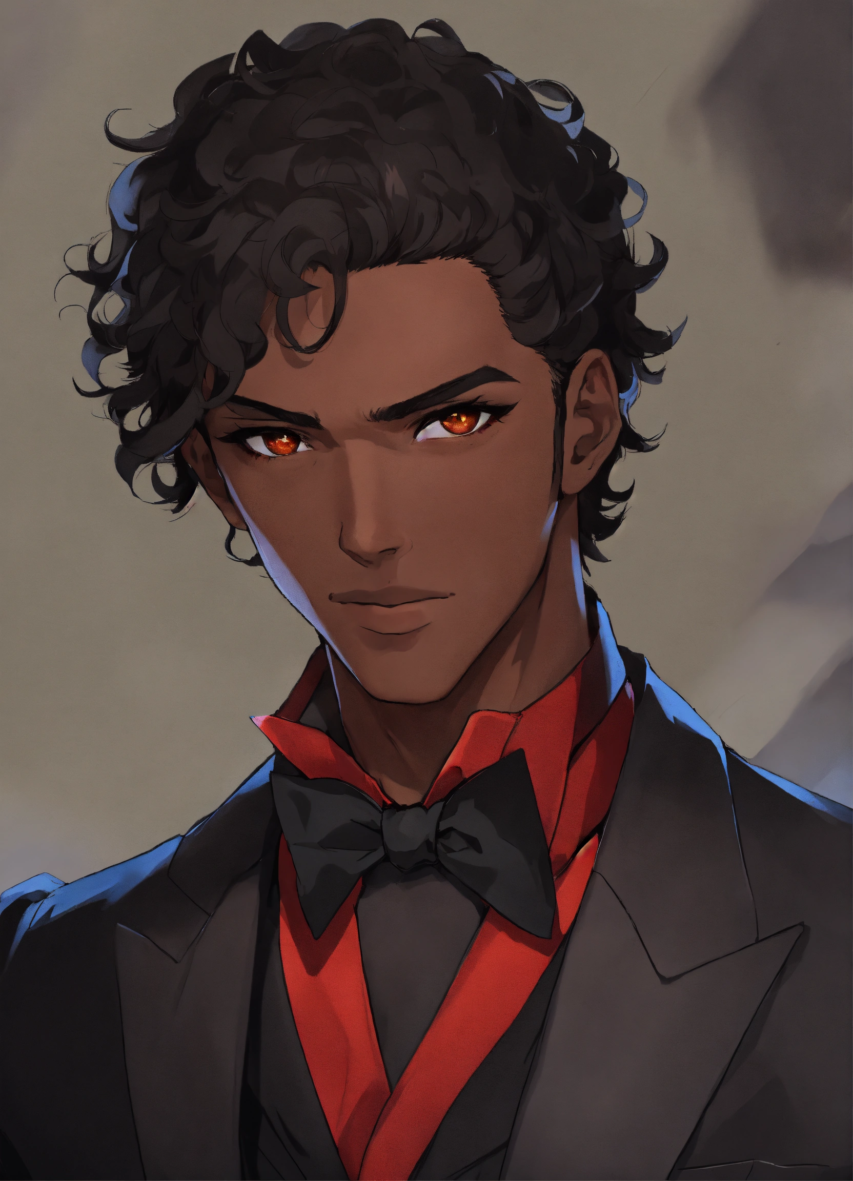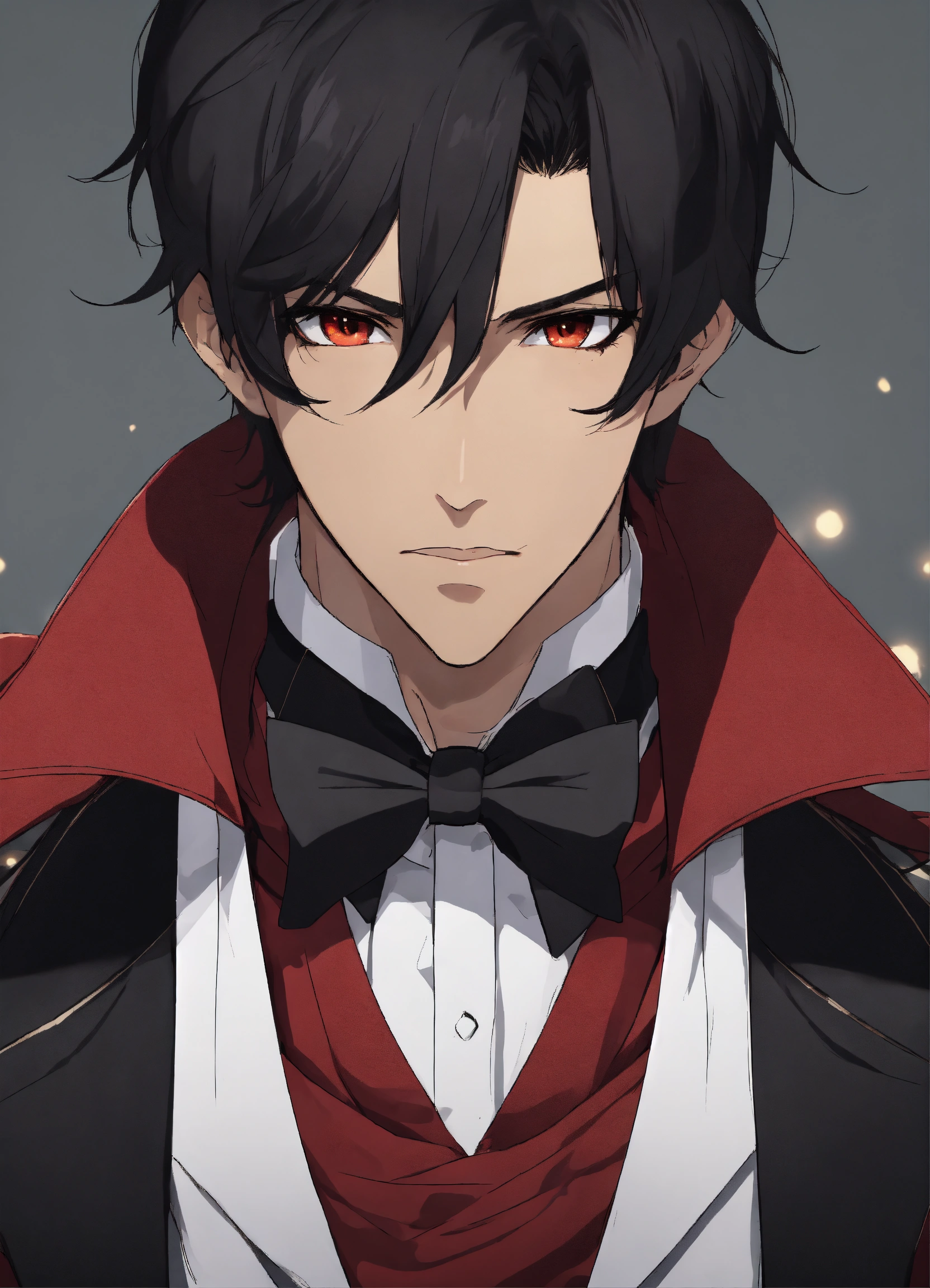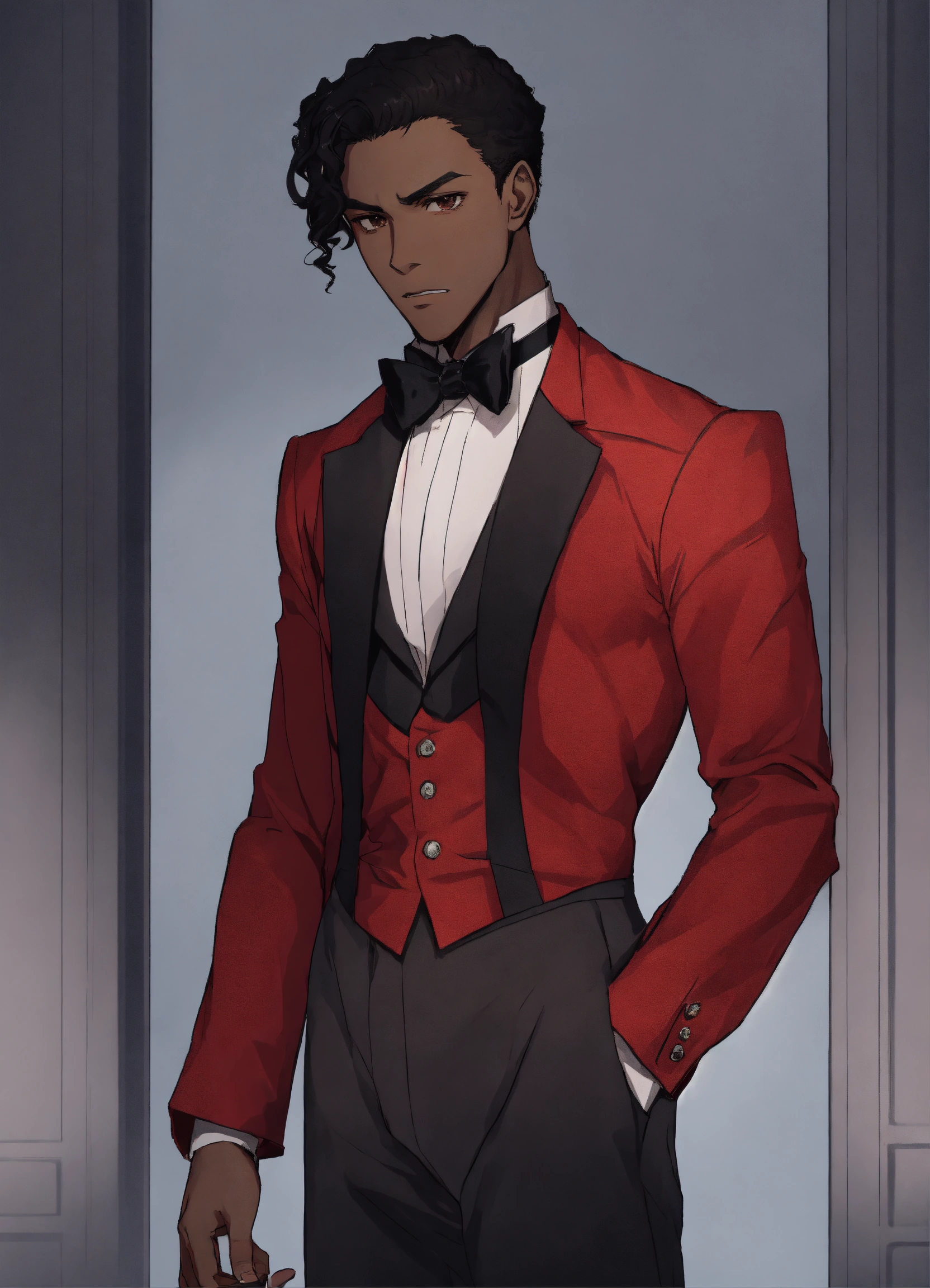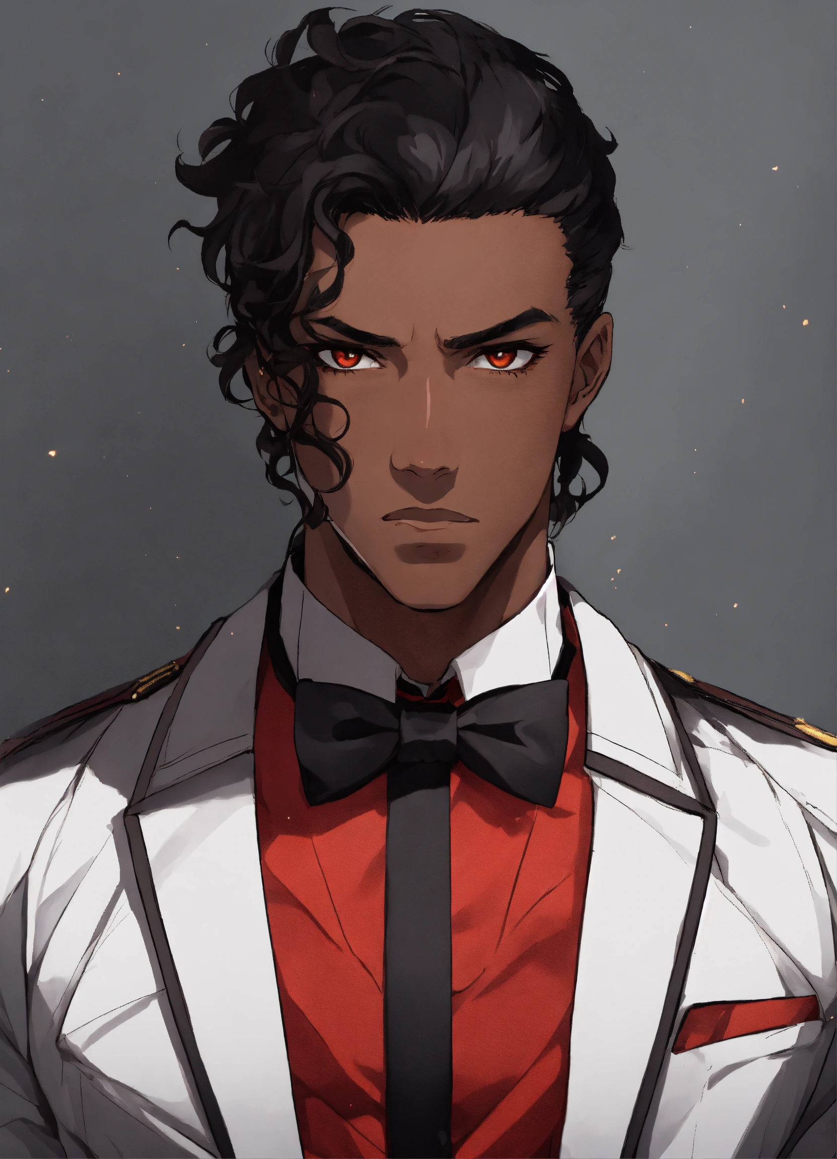 Anime styles, black male with brown eyes, skinny, red shirt with black bowtie, serious expression, black hair, gray wall background, phantom of the opera mask