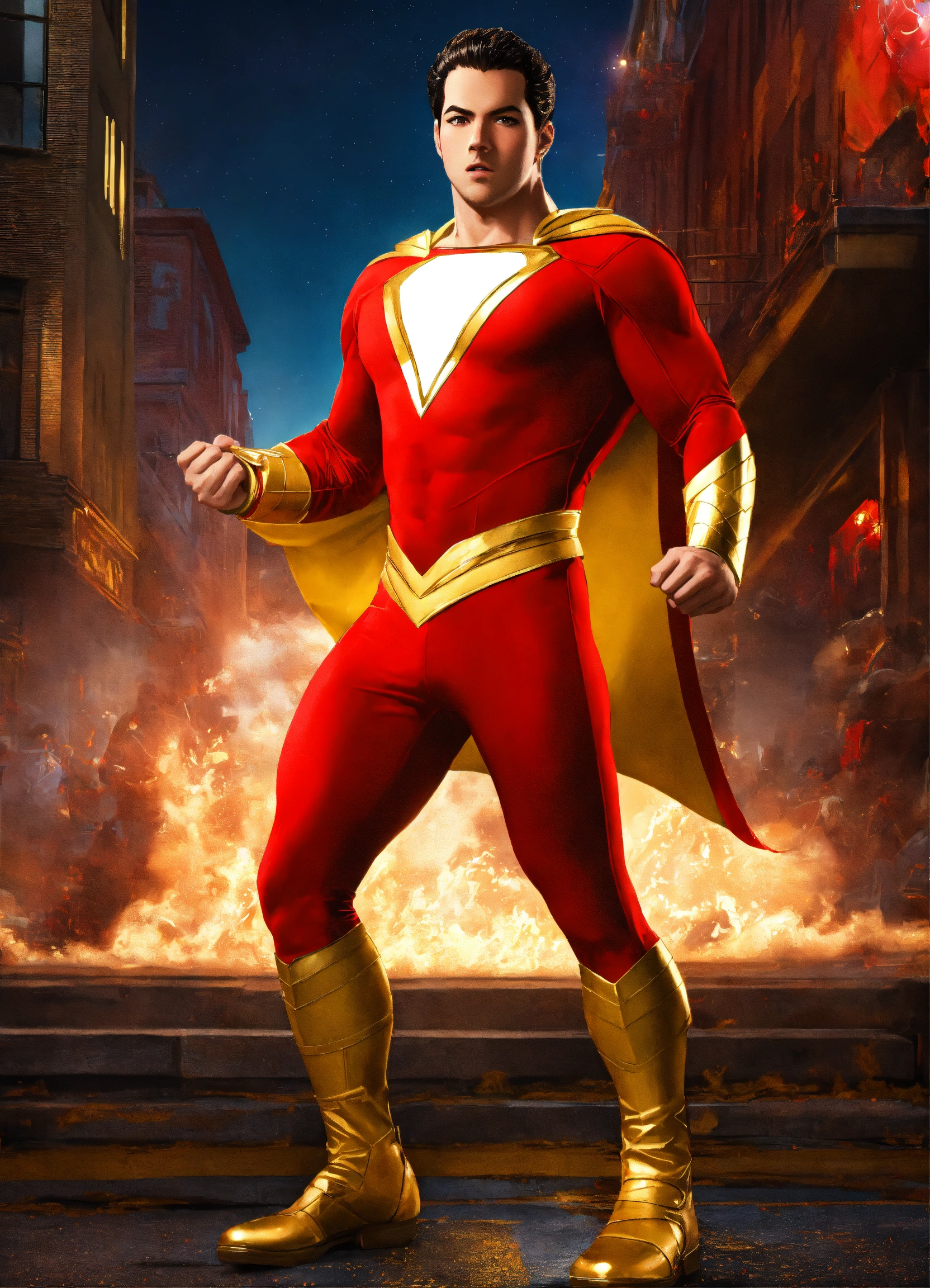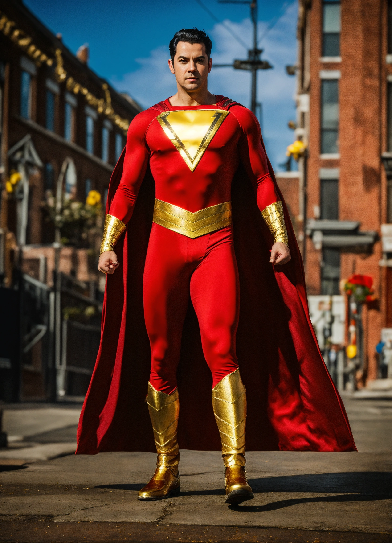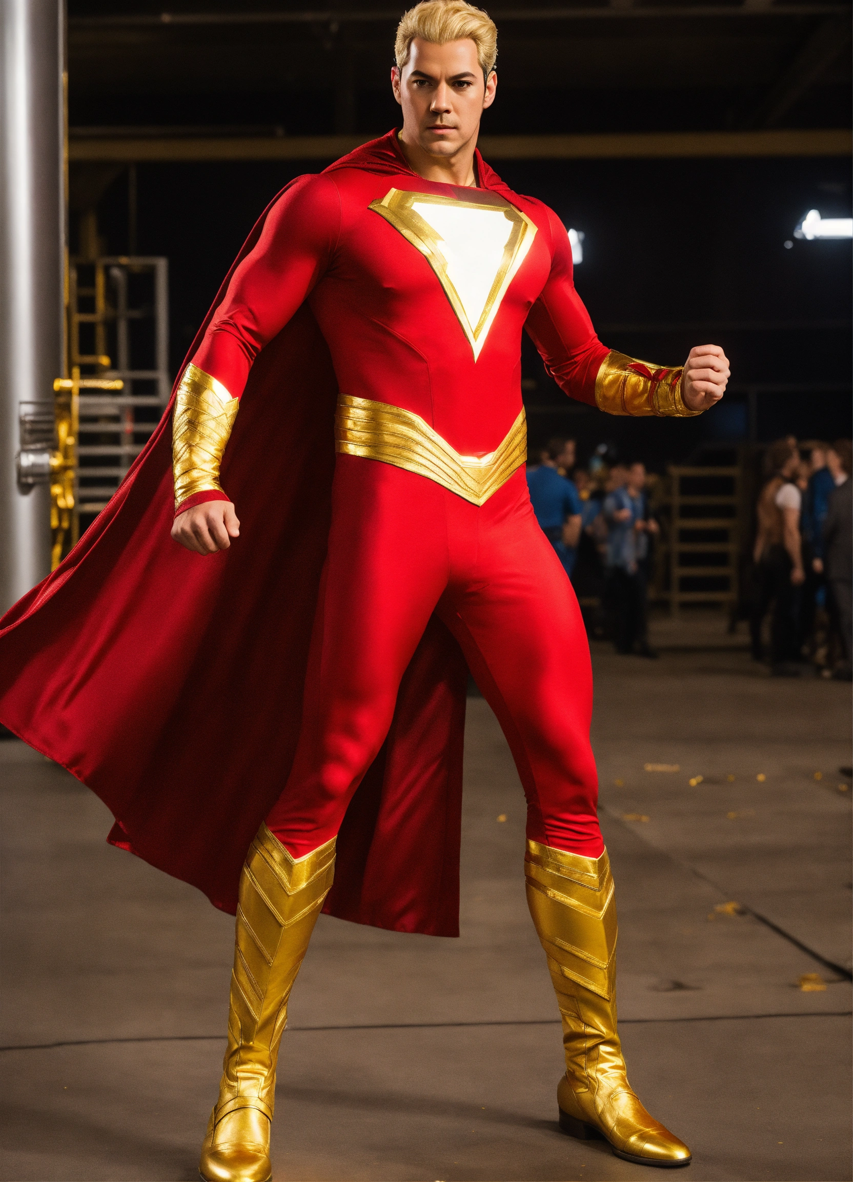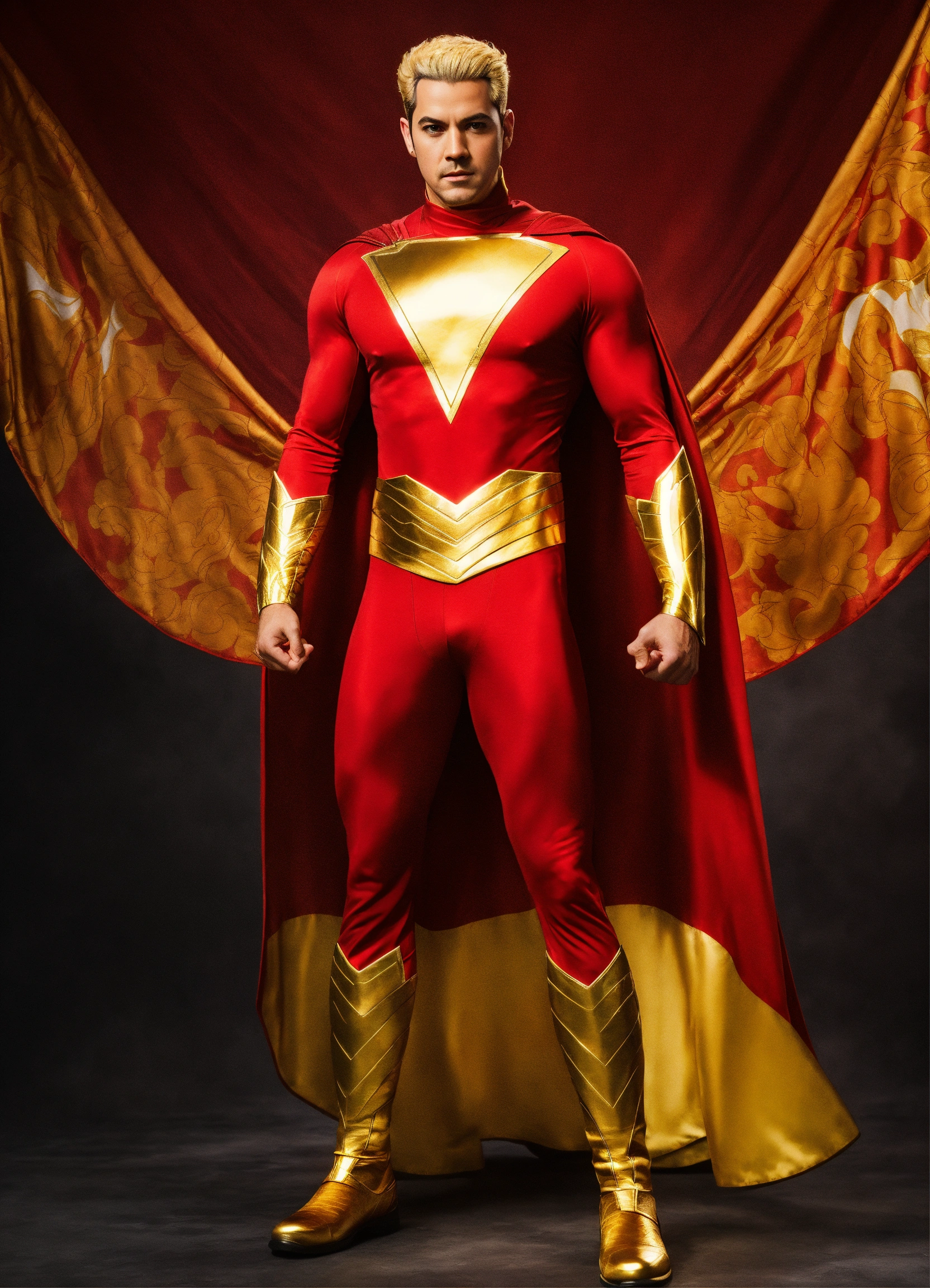 Marvel, highly detailed, red and gold sleek shazam costume, no cape, full body, smooth, curly blonde hair