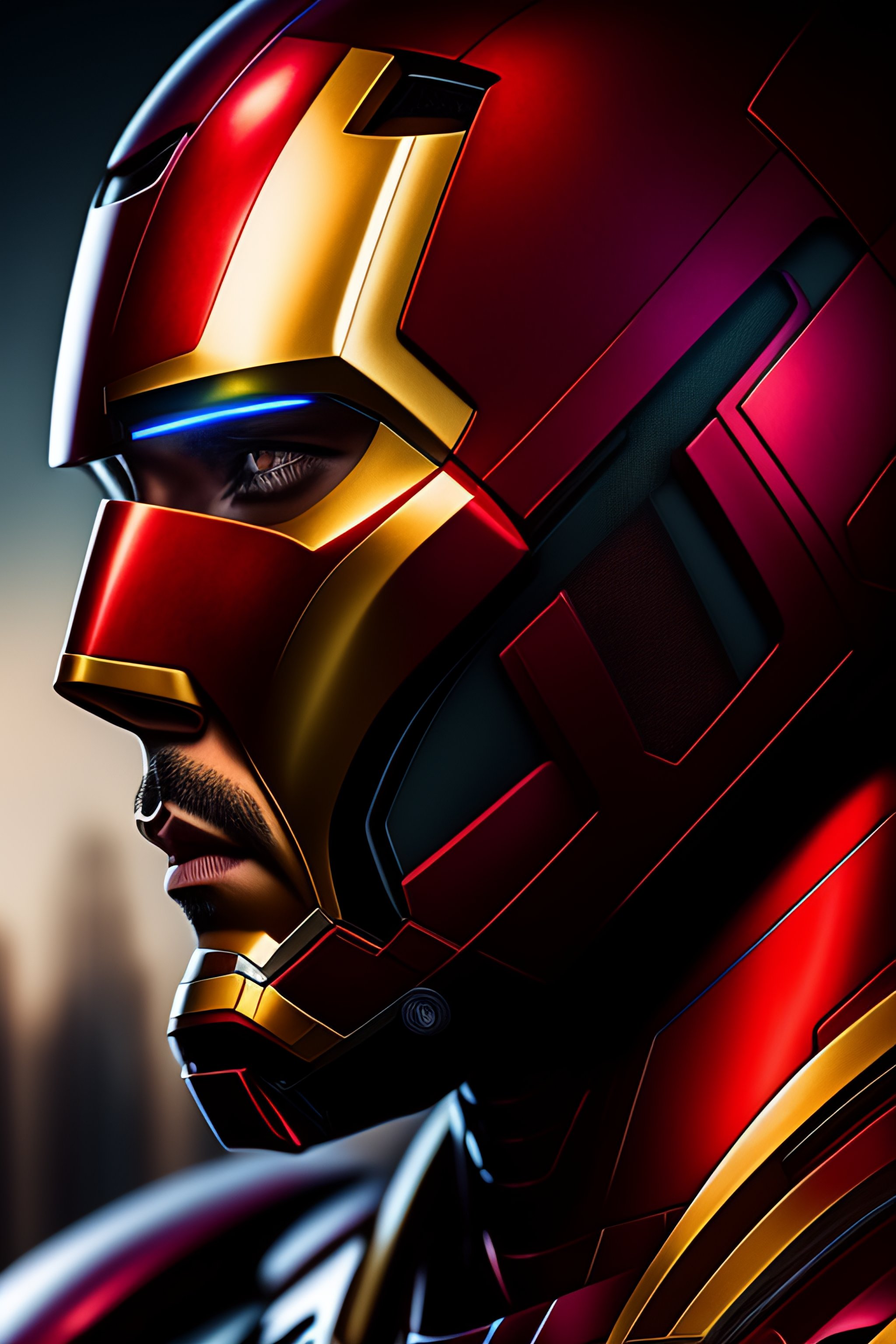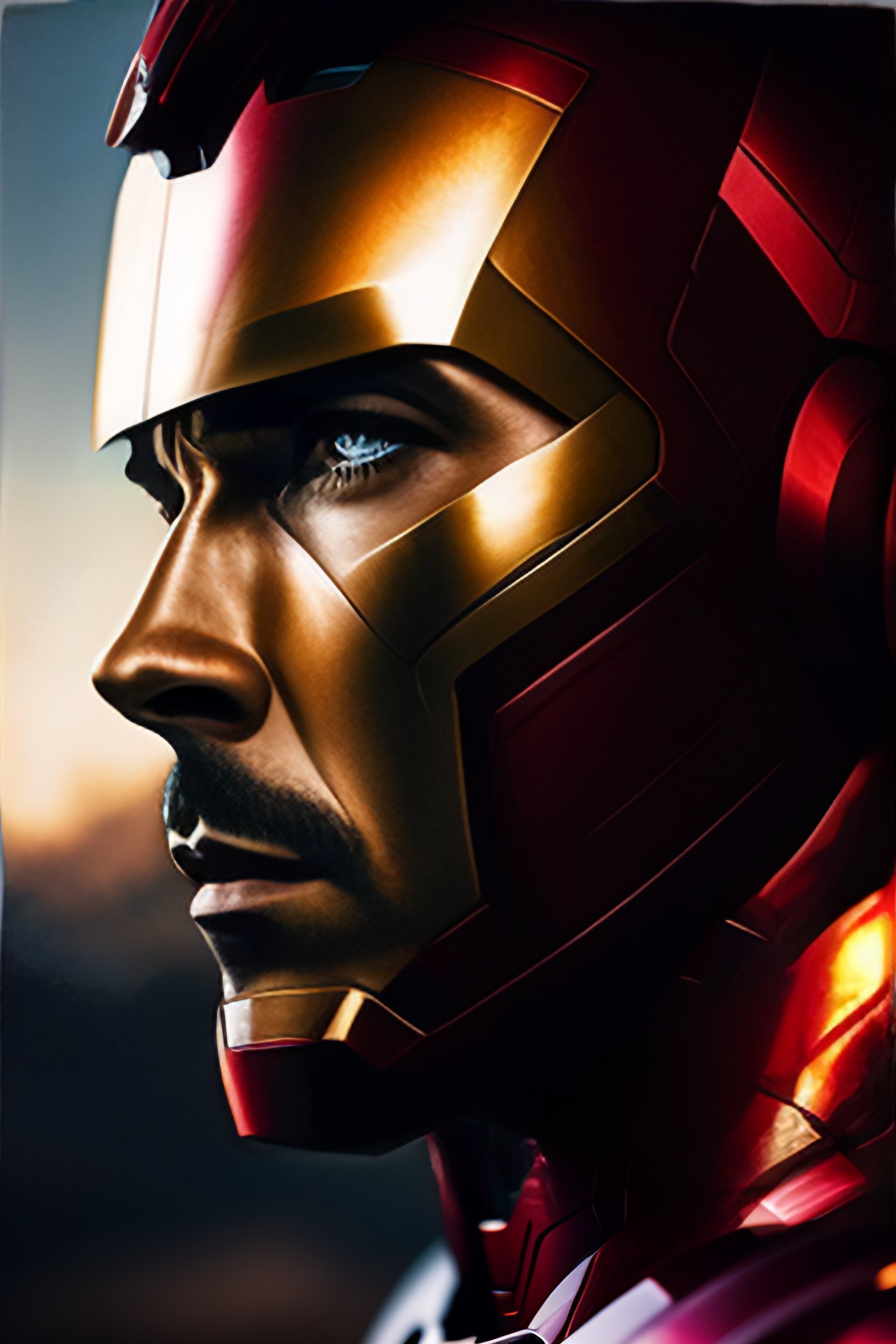 A close-up portrait of ironman, right half of face is ironman, left half of face is tony stark, background is rock and roll, cinematic lighting, --ar 2:3