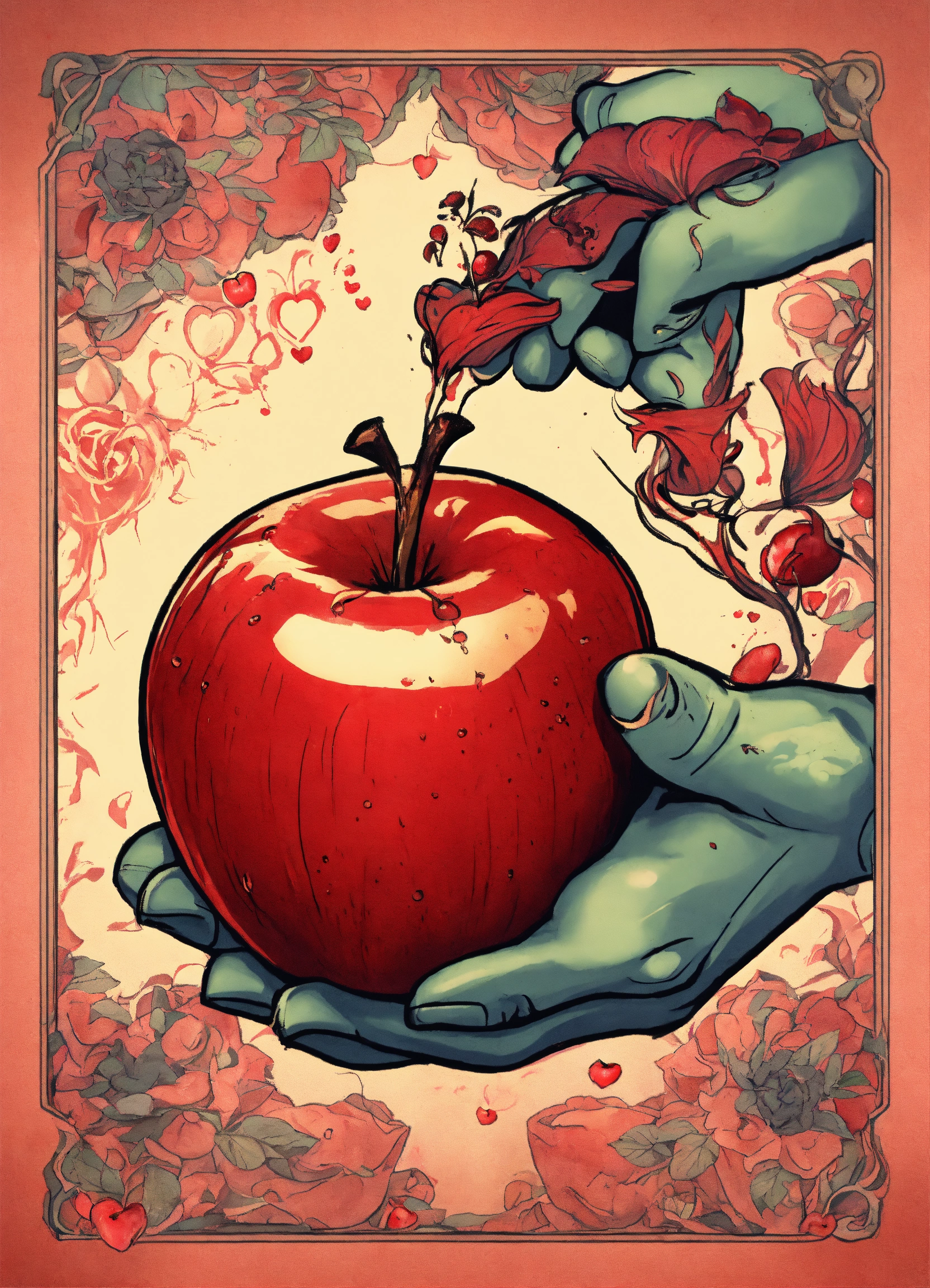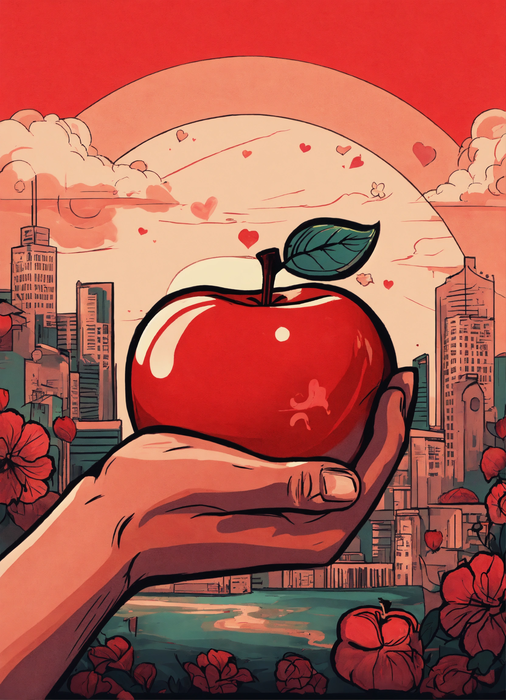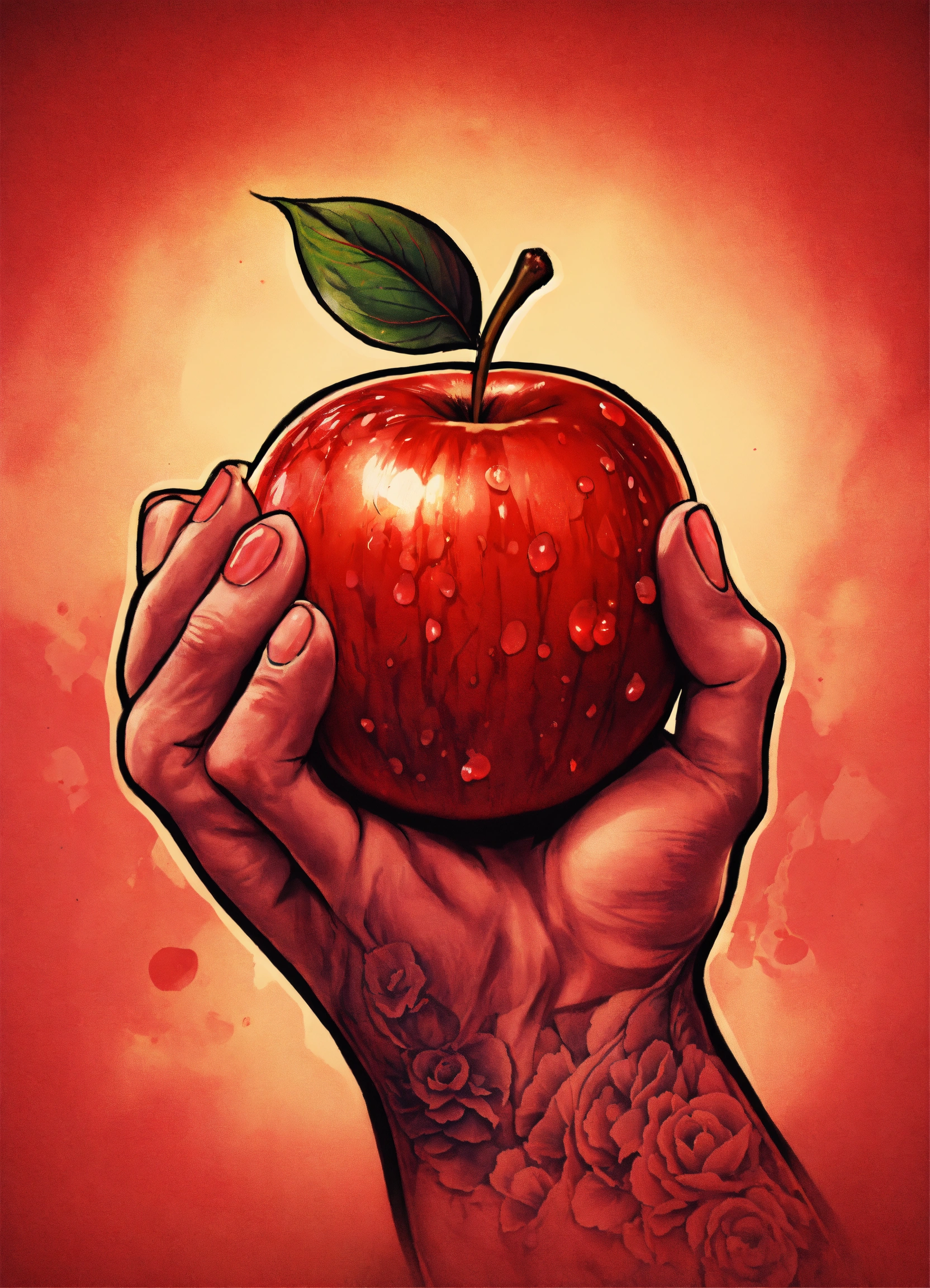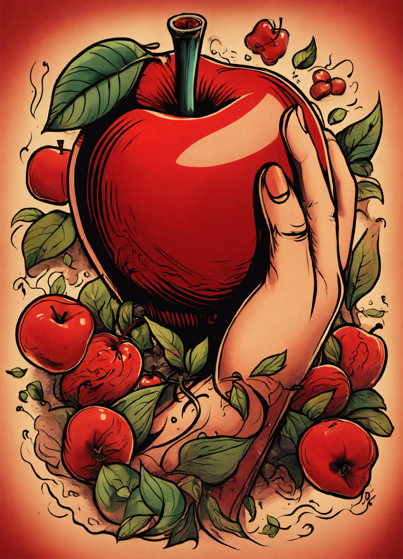 Tattoo style image of an red apple being squeezed by a large hand and the apple is expressing love as juice runs from it