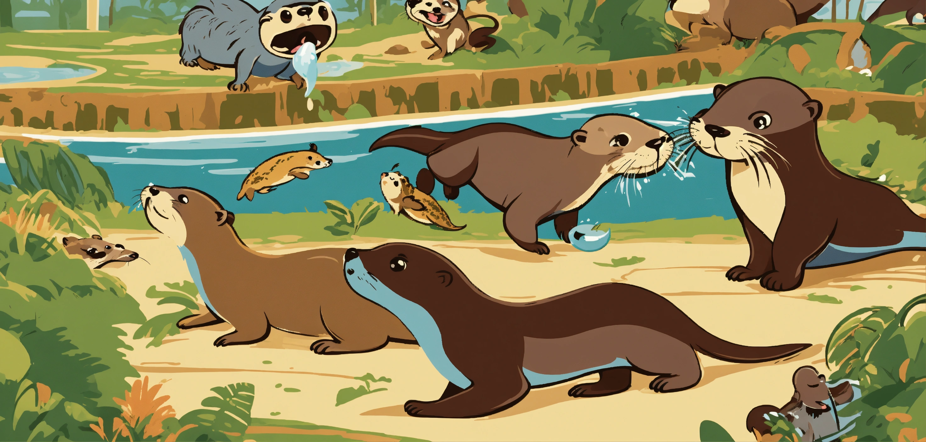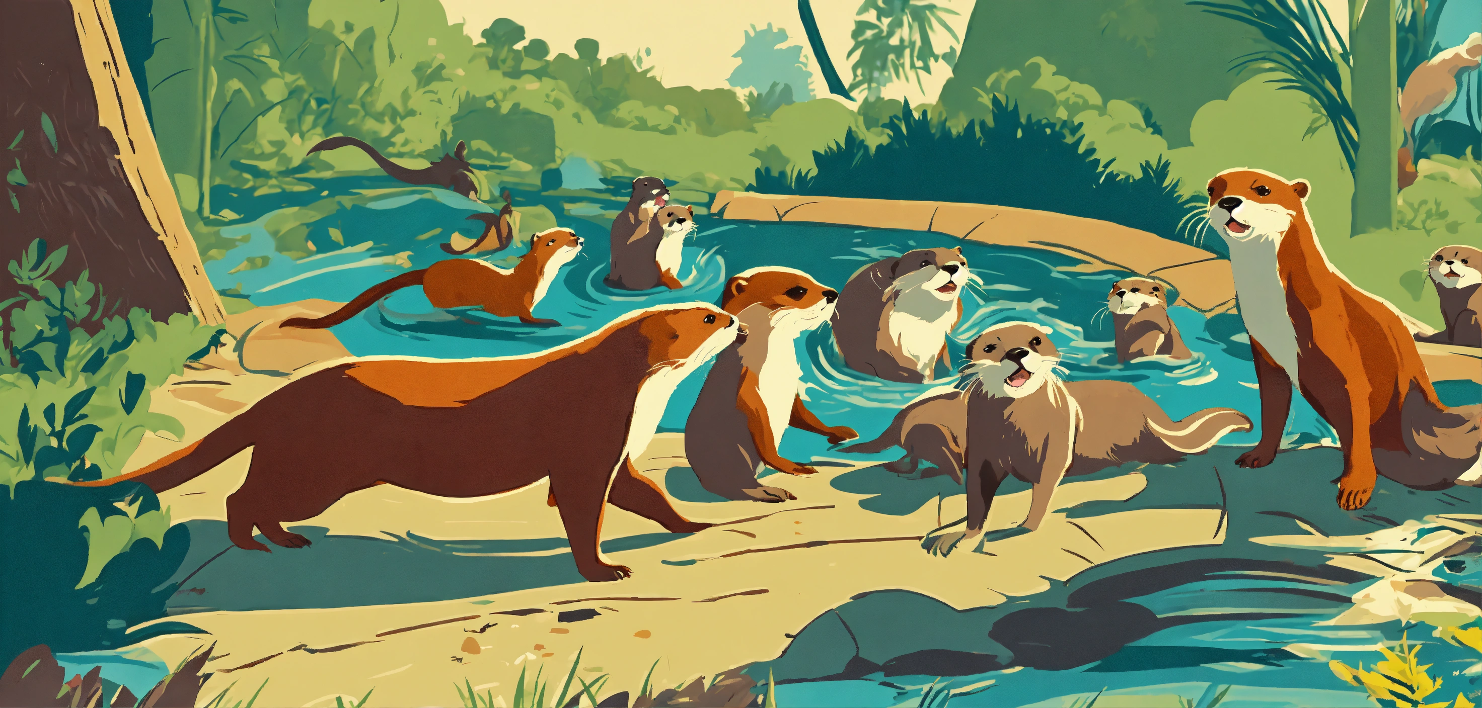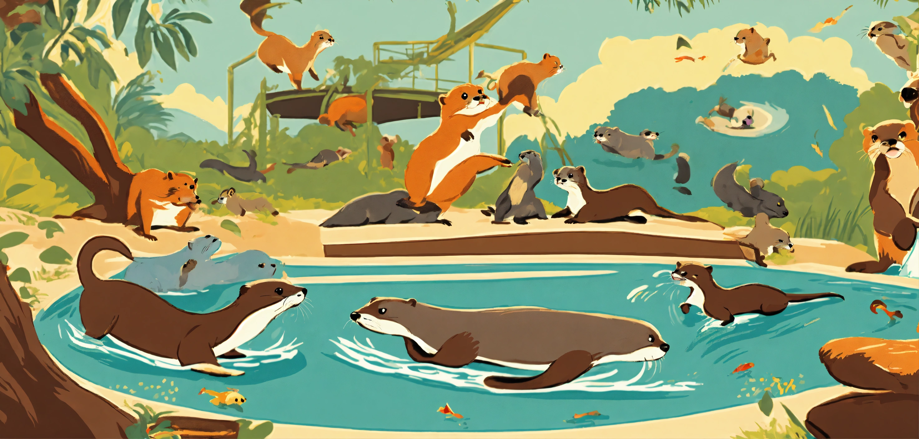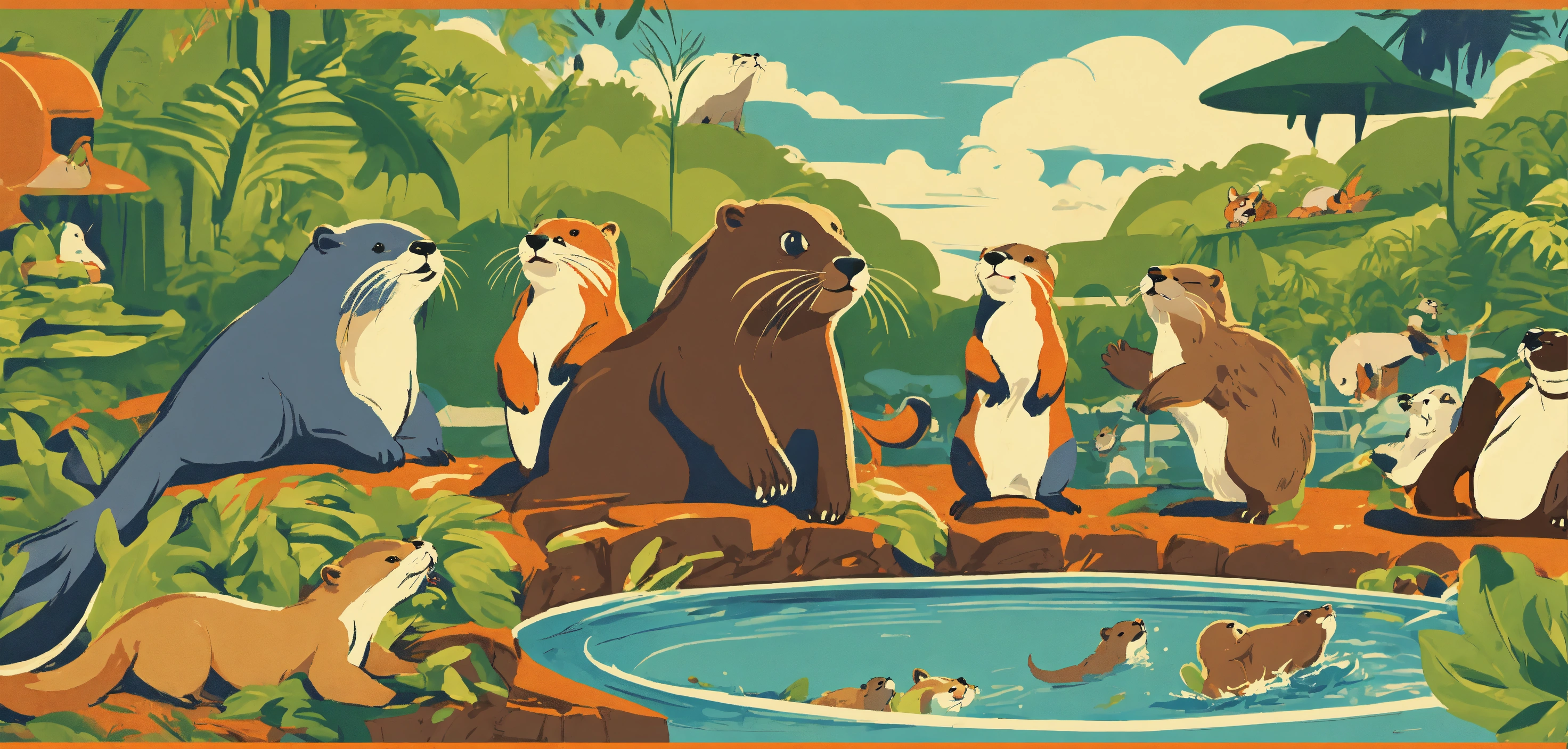 1960's retro poster nostalgic graphic art style. depict a chaotic yet amusing scene of a group of playful otters causing playful havoc around a cartoonish zoo, with other animals and zookeepers reacting in a comically exaggerated manner.