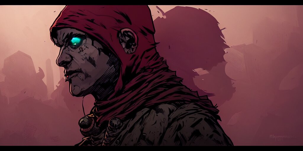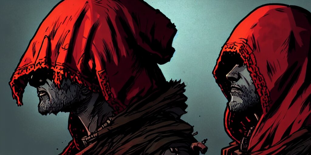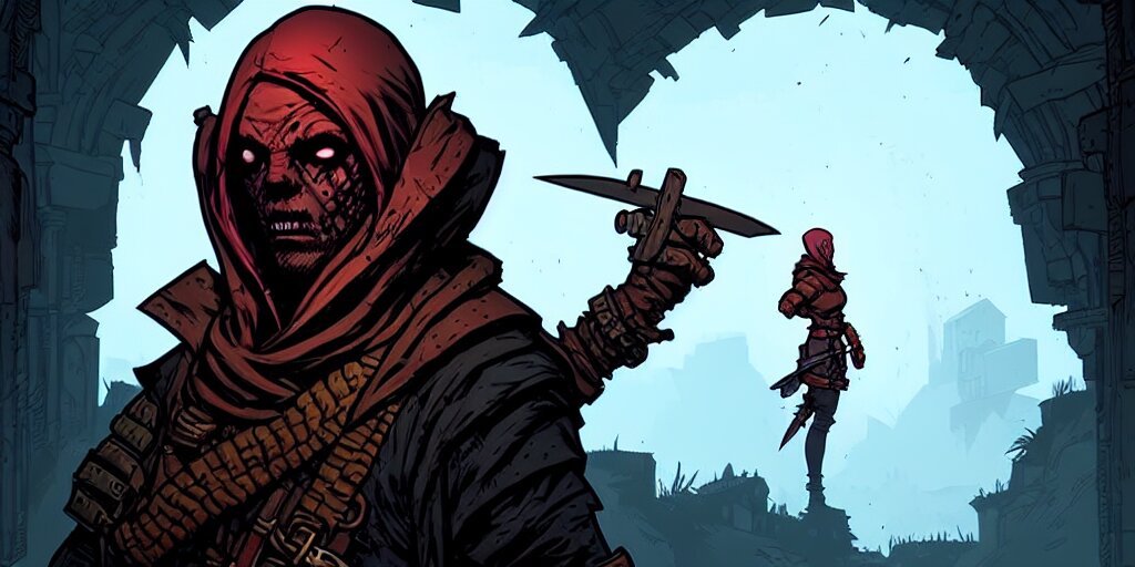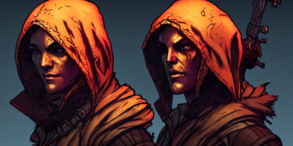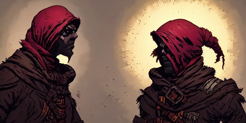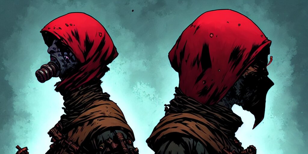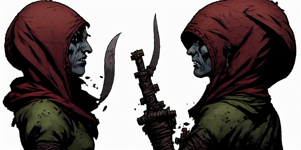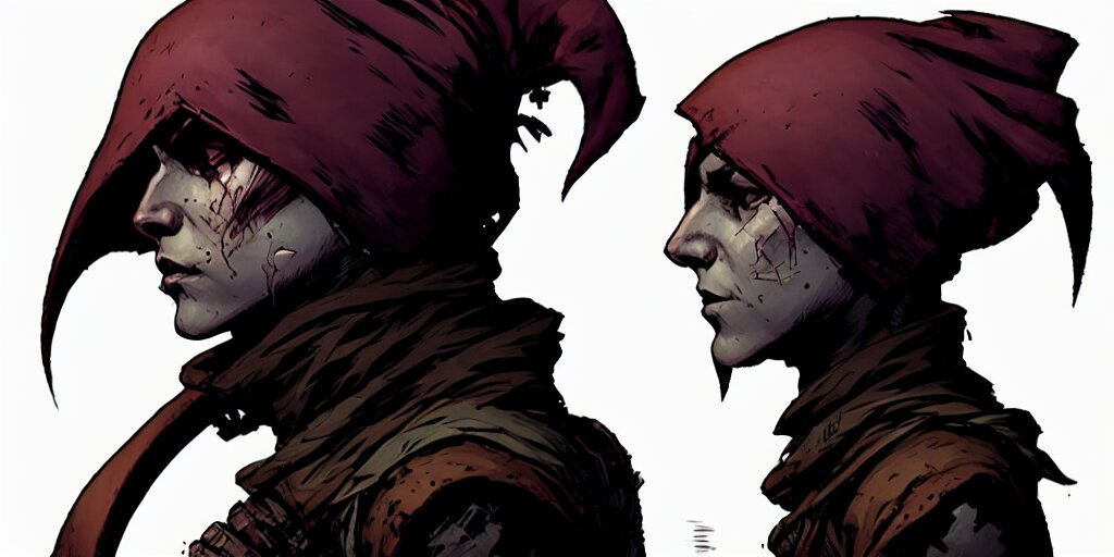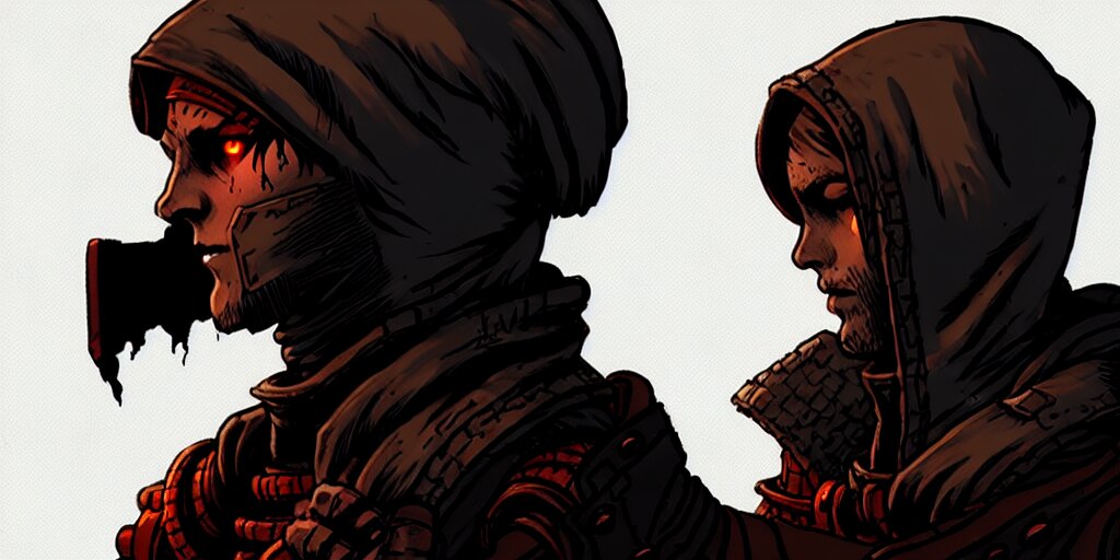 Rogue character portrait, sprite, hood, darkest dungeon, pc game, sideview, art by moebius and greg rutkowski.