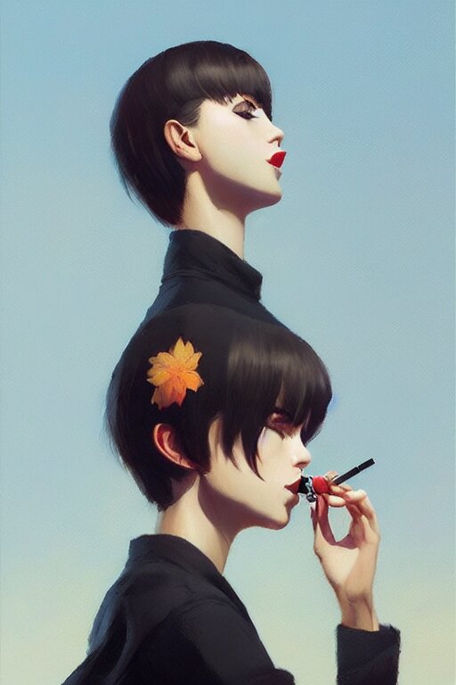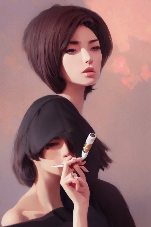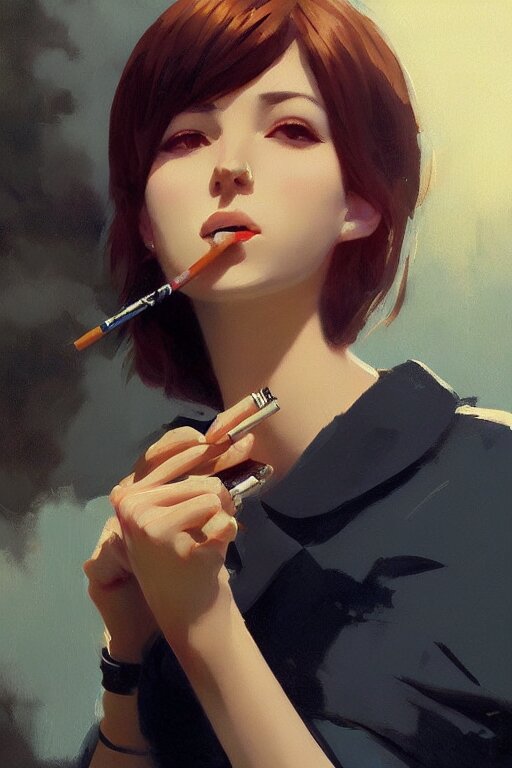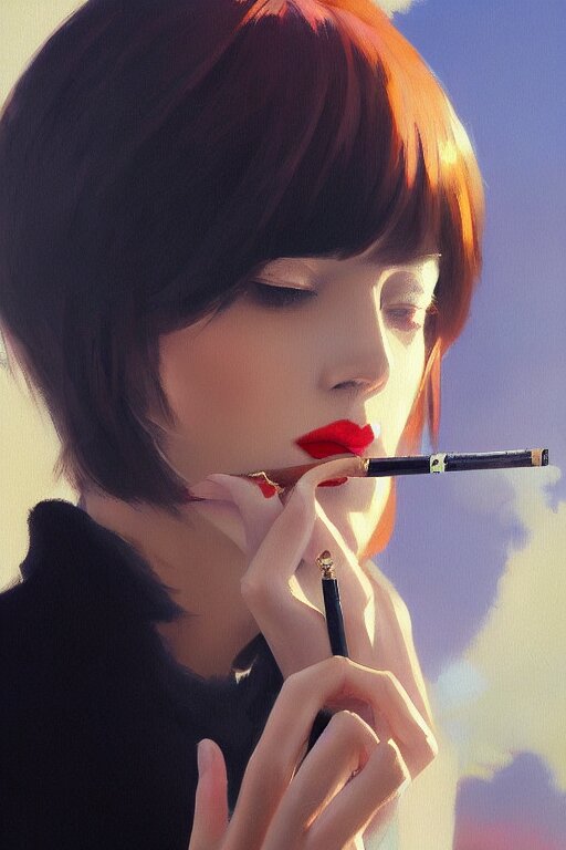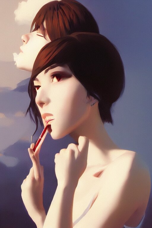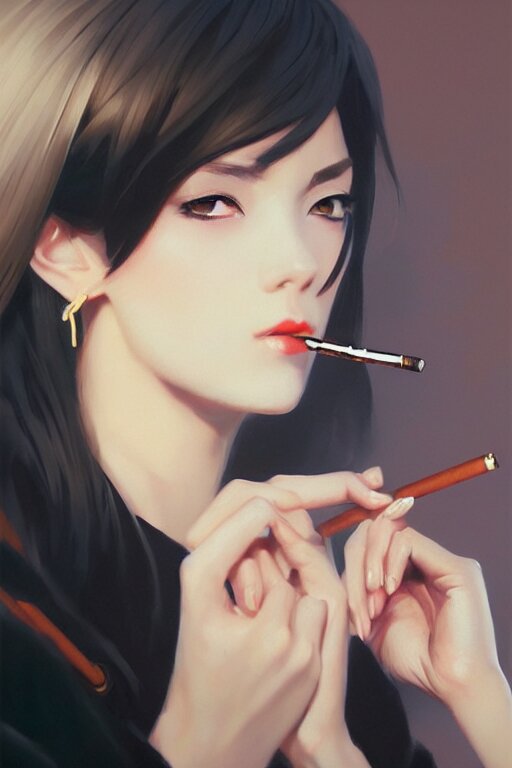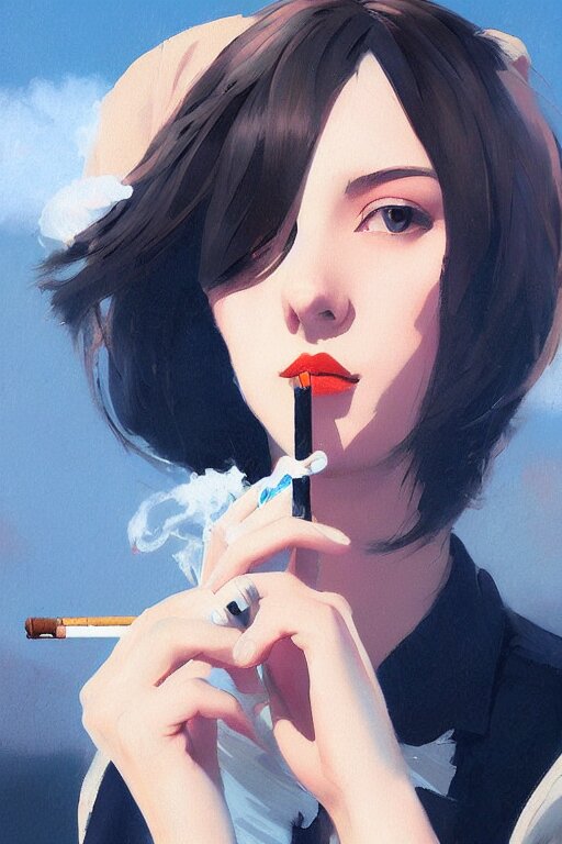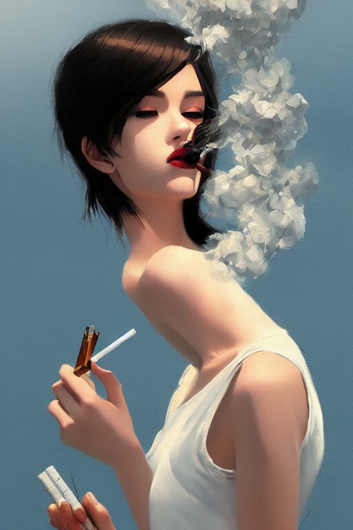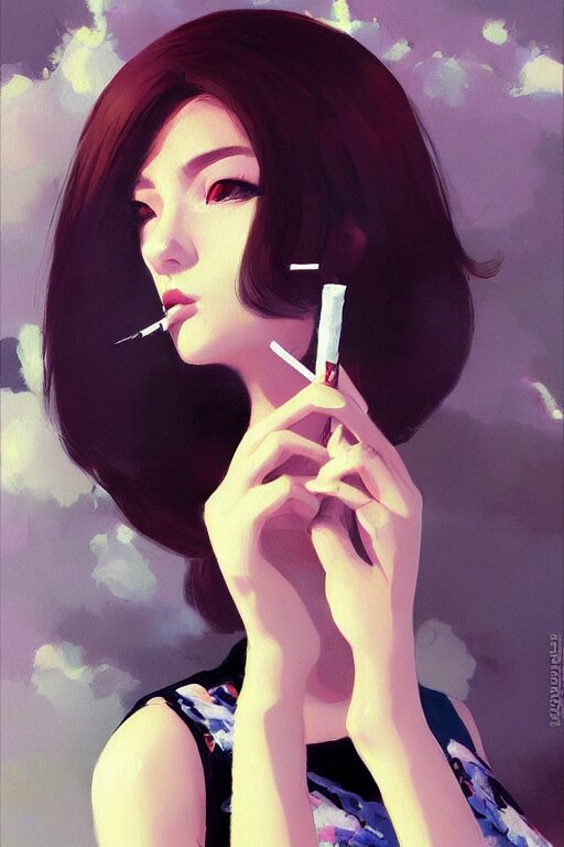 A ultradetailed beautiful panting of a stylish woman smoking a cigarette, oil painting, by ilya kuvshinov, greg rutkowski and makoto shinkai