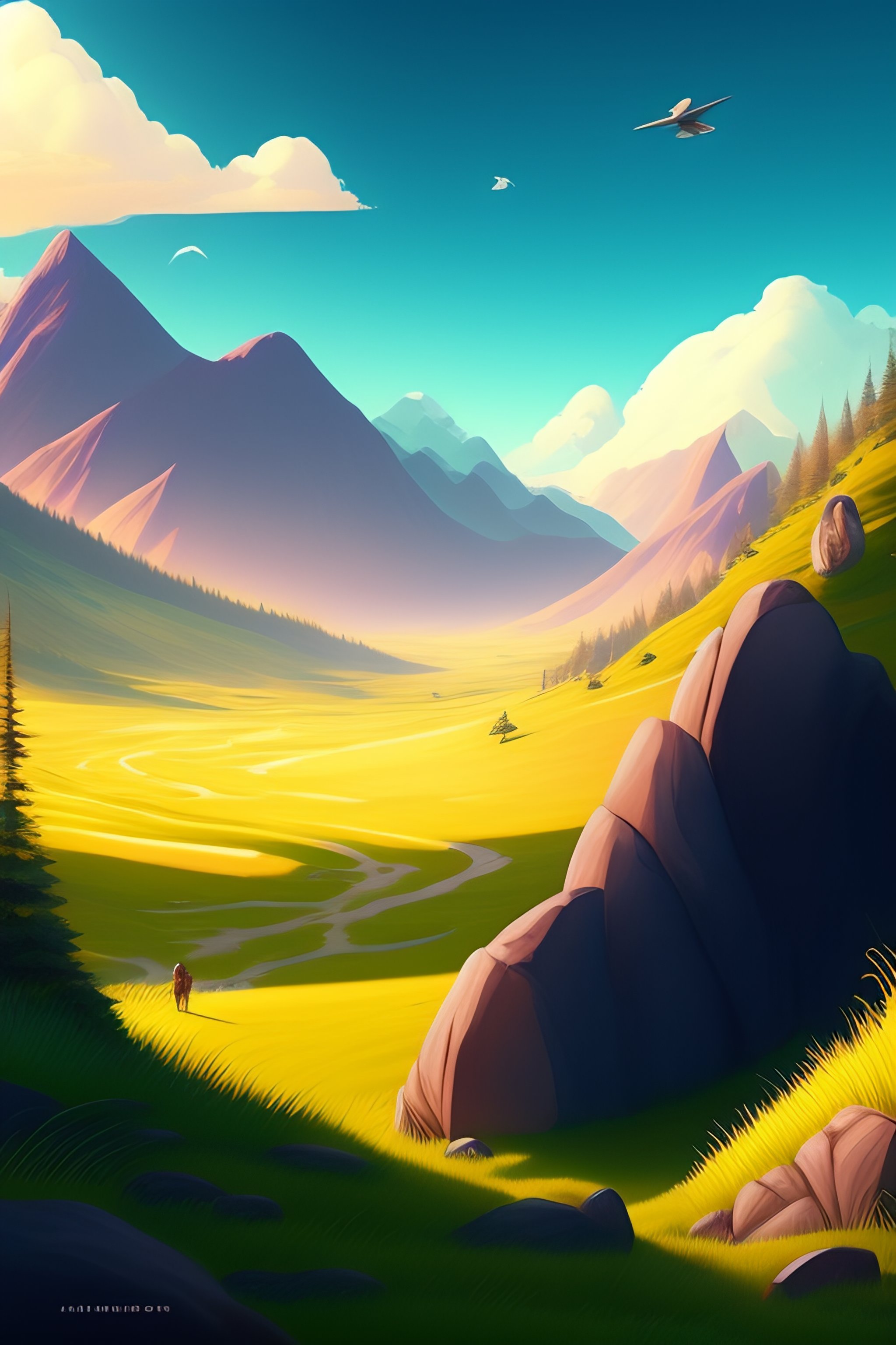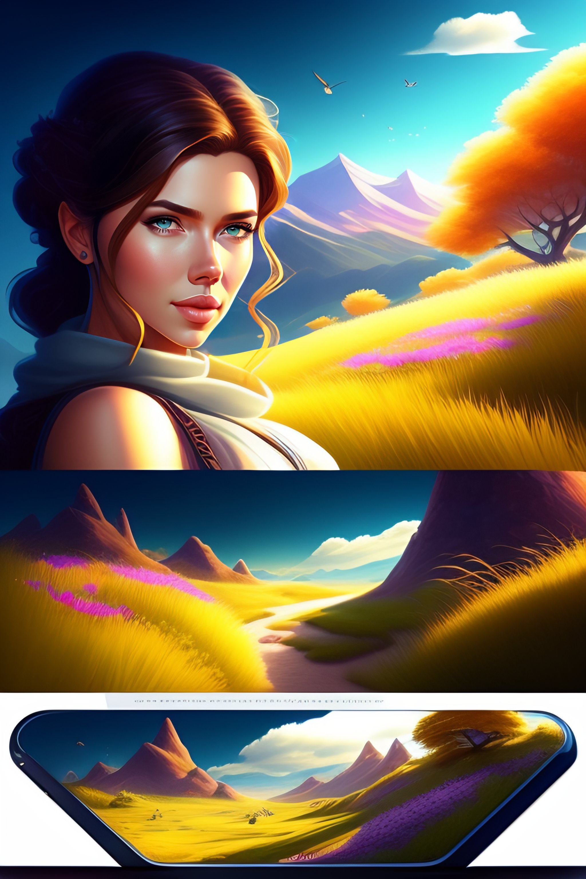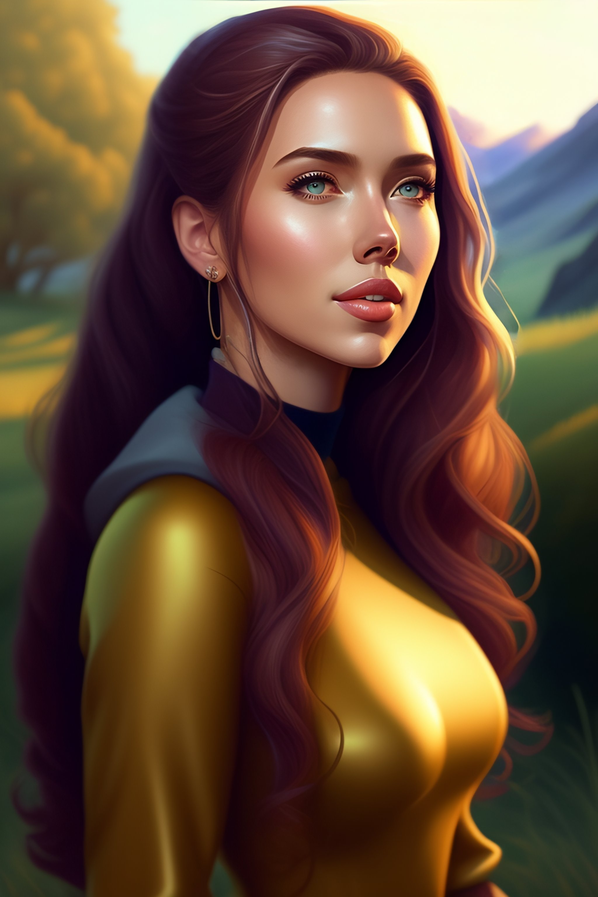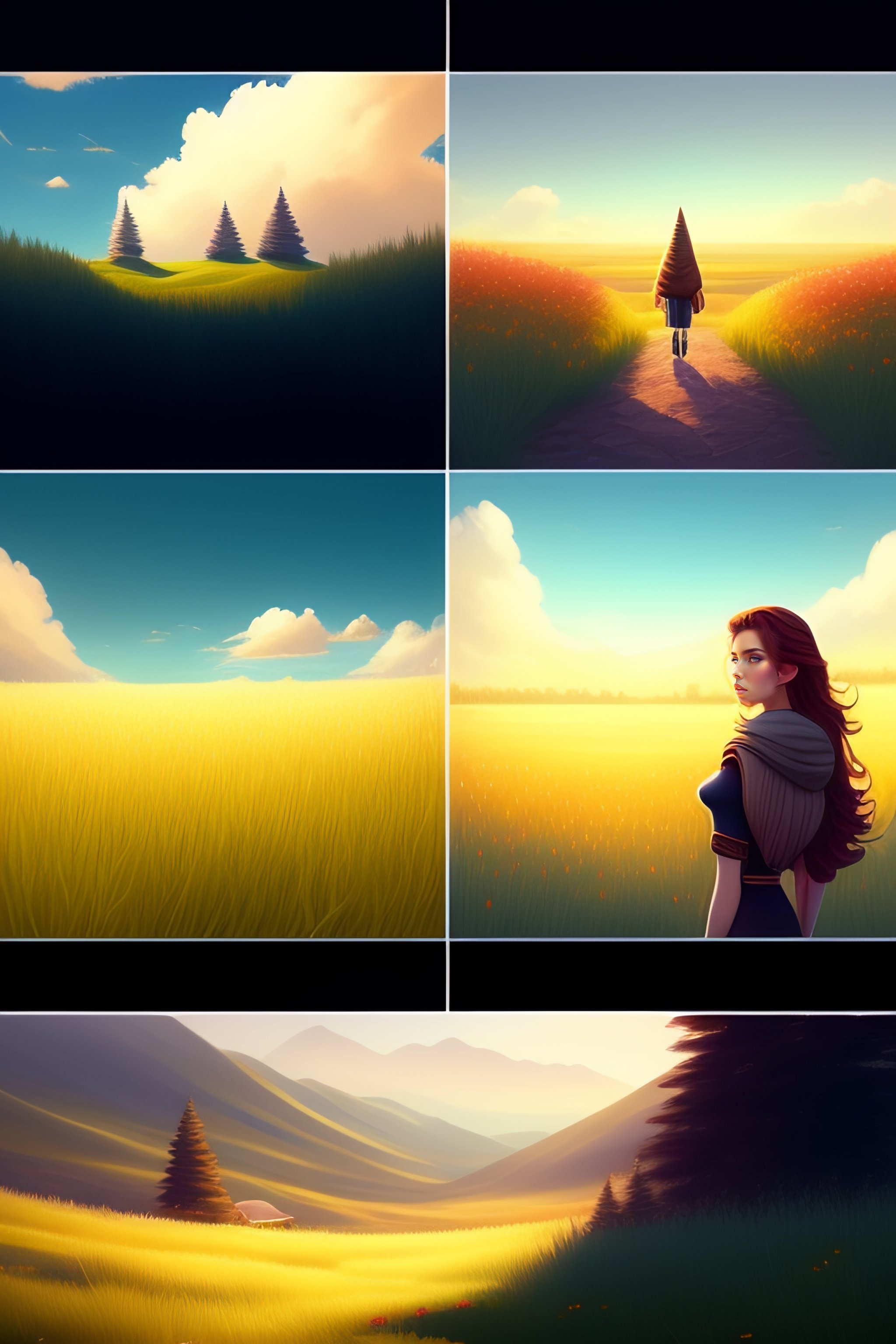 Gorgeous meadow view with scarlett johansson, pixar-style animation, pendleton ward, magali villeneuve, artgerm, rob rey and kentaro miura style, golden ratio, behance, trends in art station