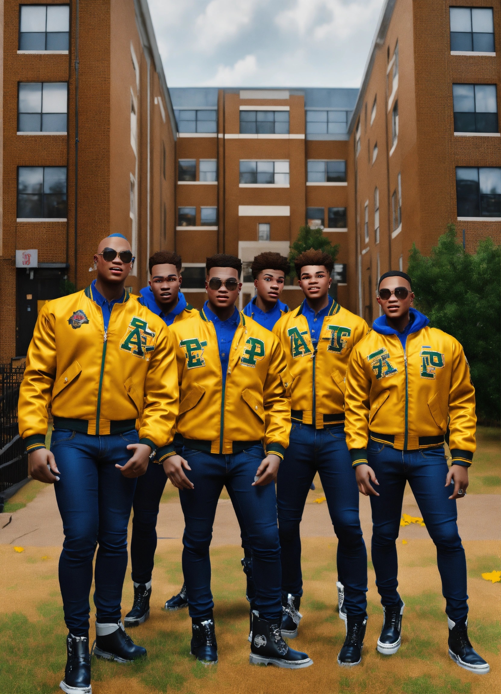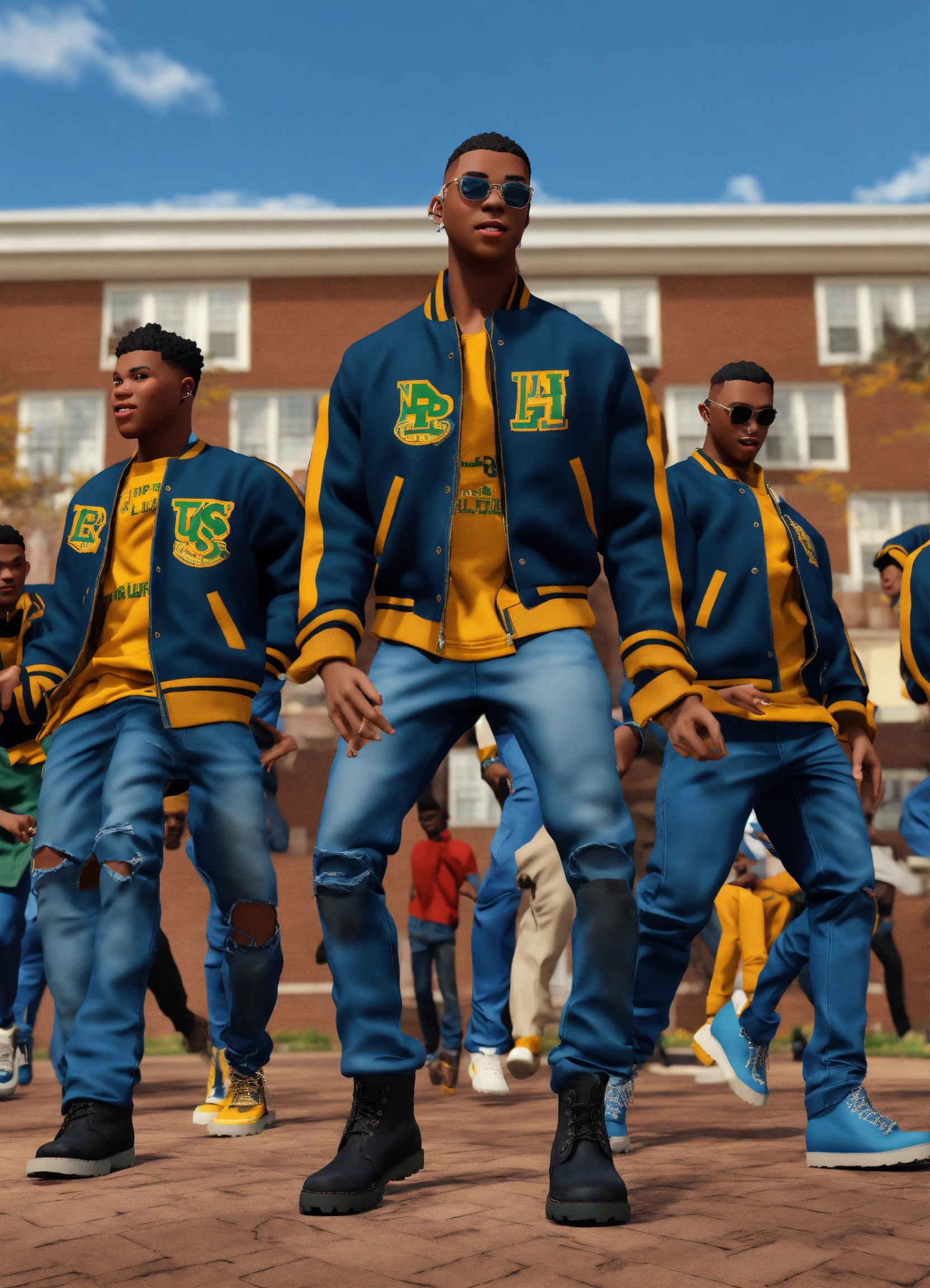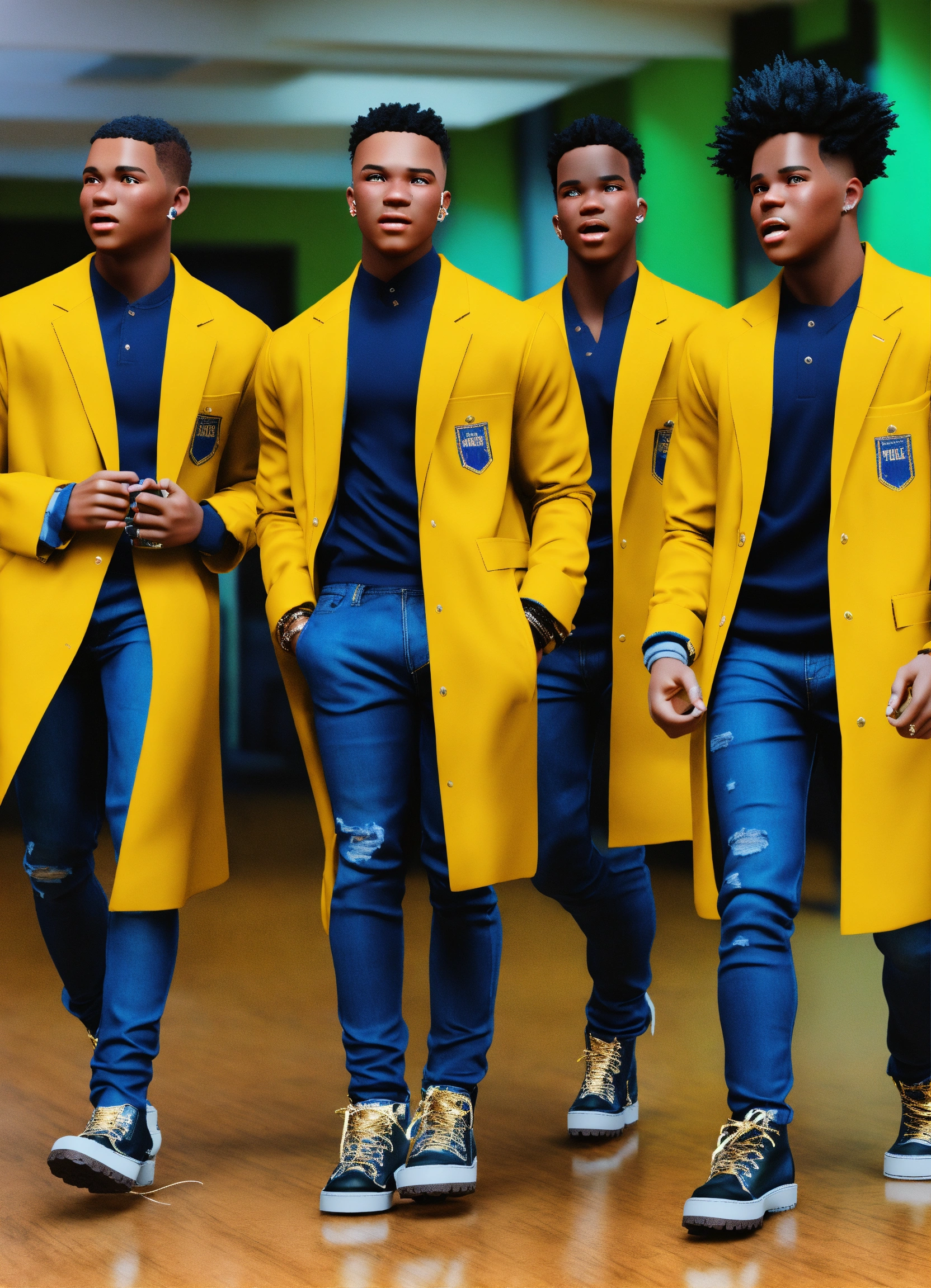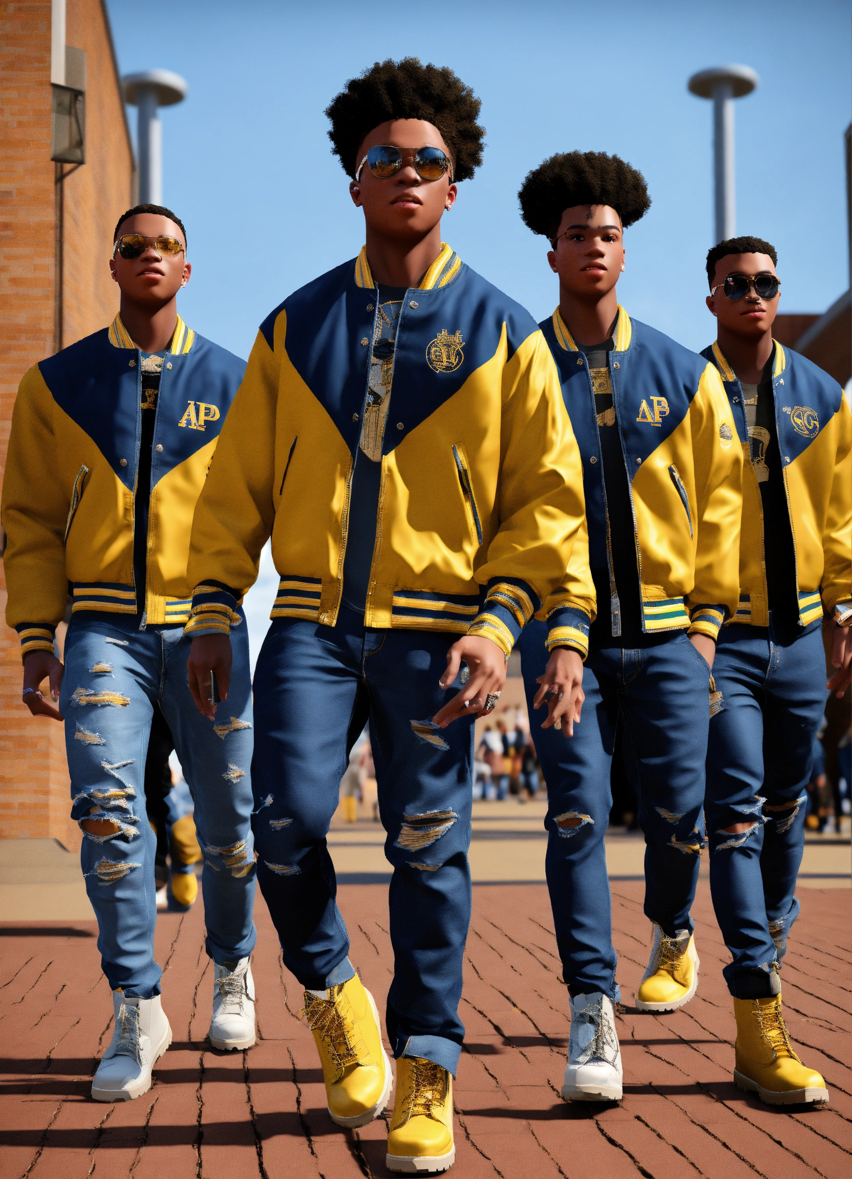 Hbcu at norfolk state in the fall, a diverse group of handsome african american young boys with tapered short haircuts, step dancing at a step show with their black alpha phi alpha jackets, gold shirts, black timberlands, loose blue jeans, 3d animation, 3d render (((no deformation))), (((no extra fingers))), (((no ugly people)))