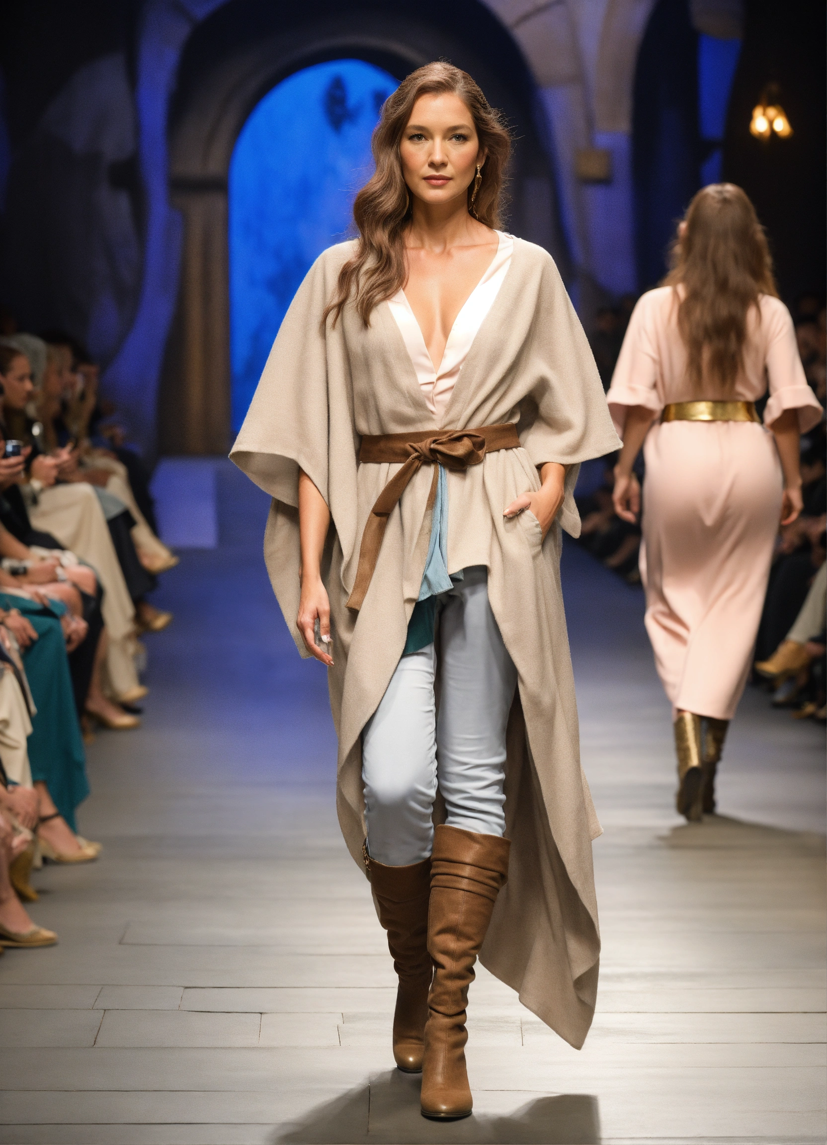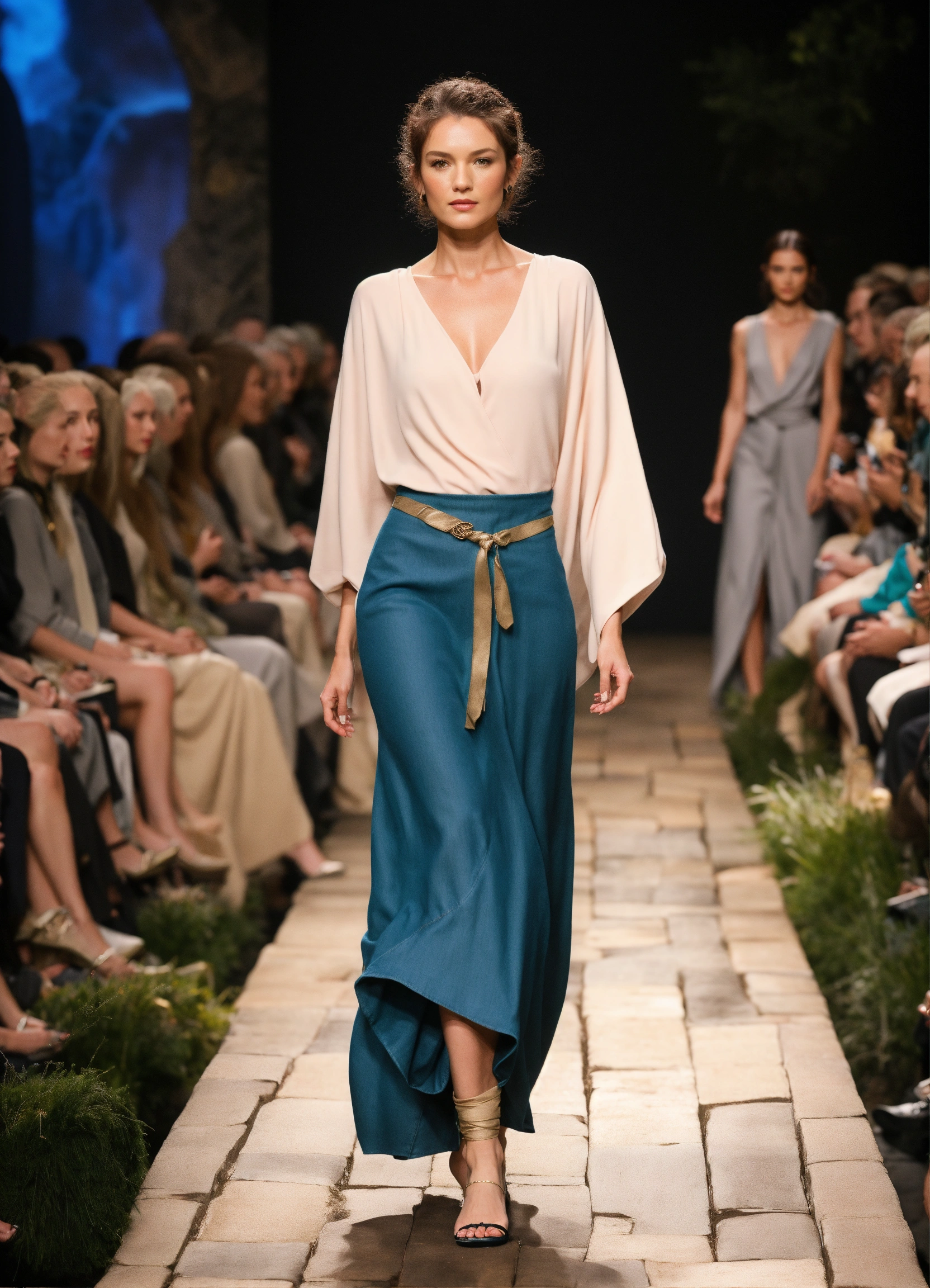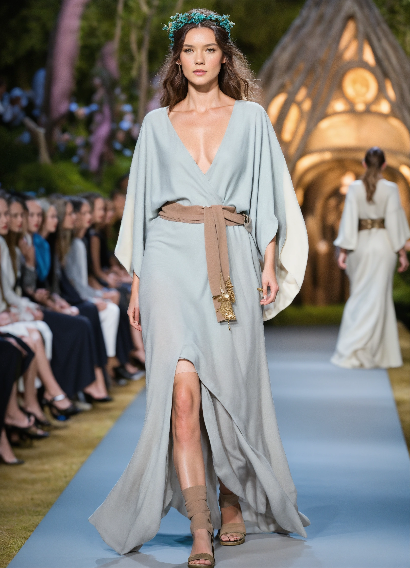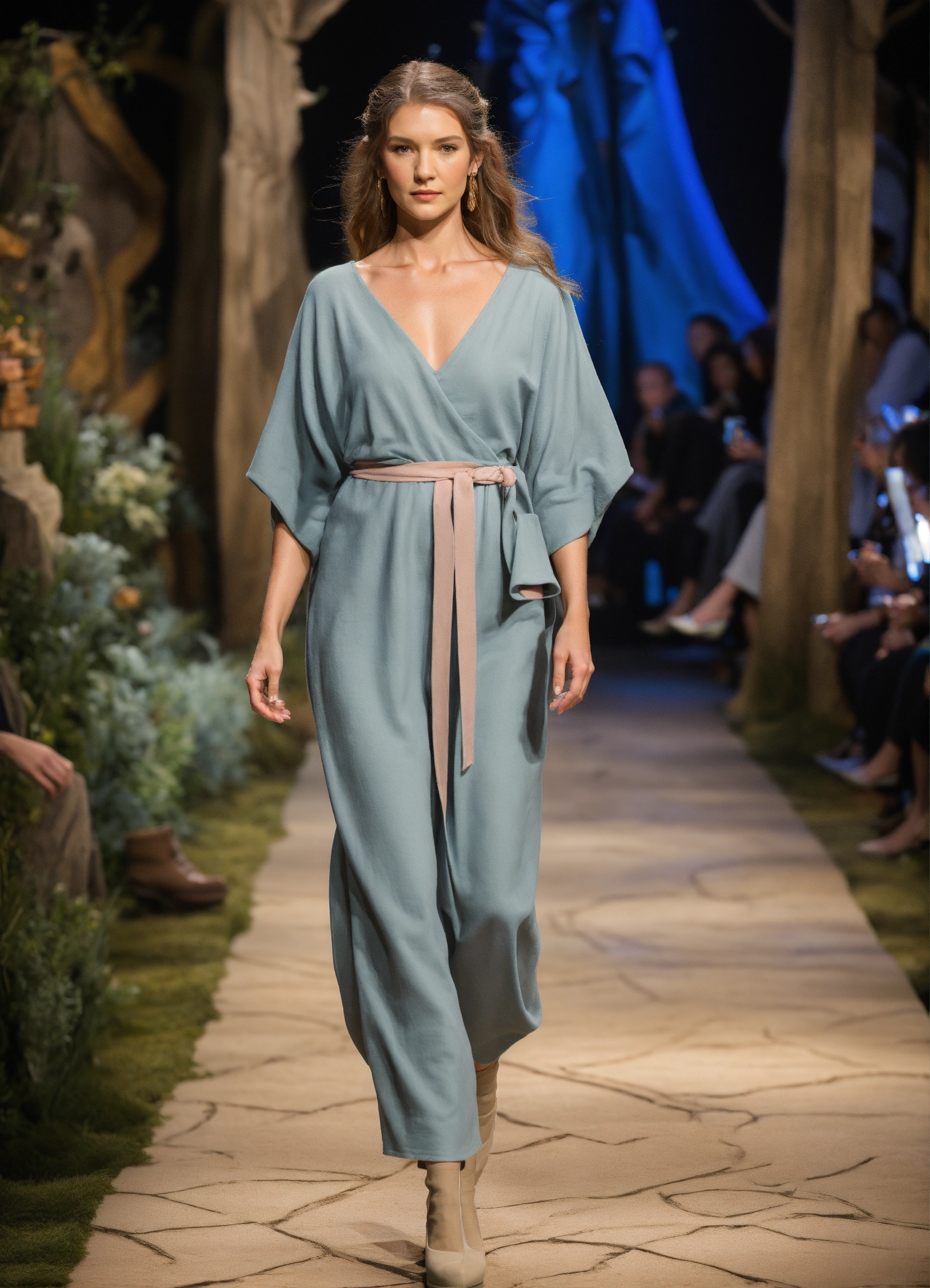 3d realistic photo of female hobbit walking runway during middle earth fashion week wearing dolman sleeve donna karan hobbiton fashion in black, white, blush, grey, beige, stone, gold, denim, blue, teal walking a runway in 5he shire