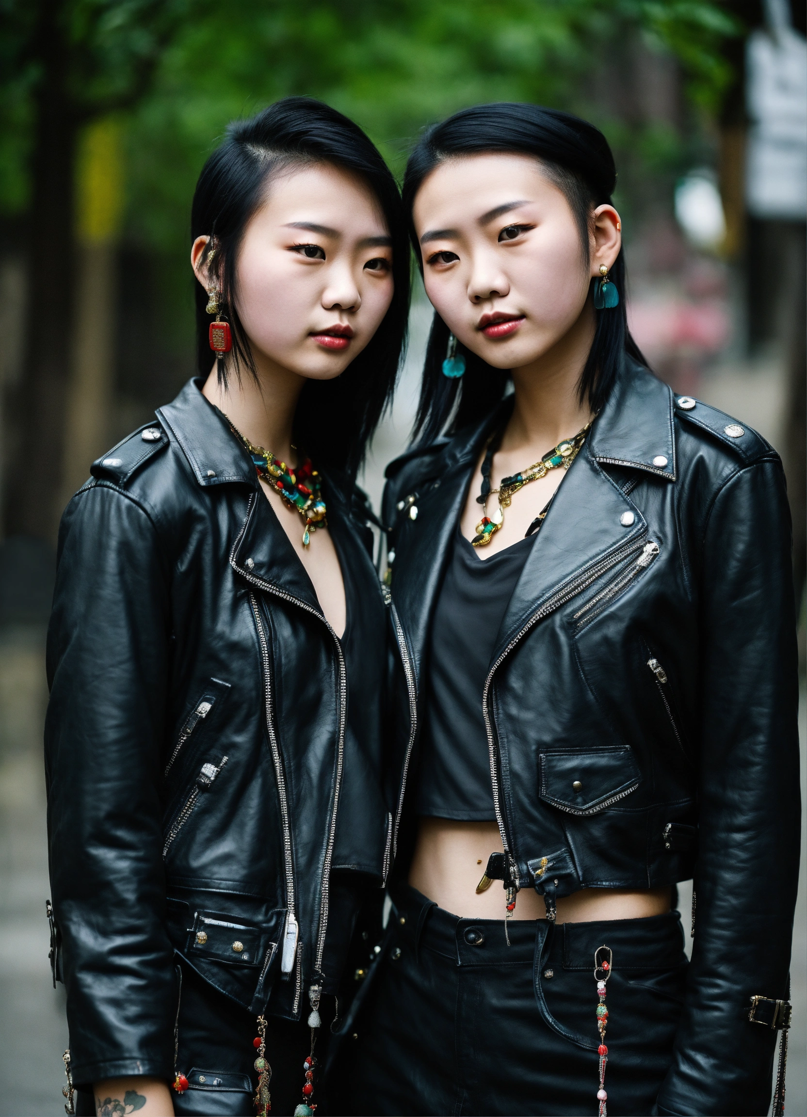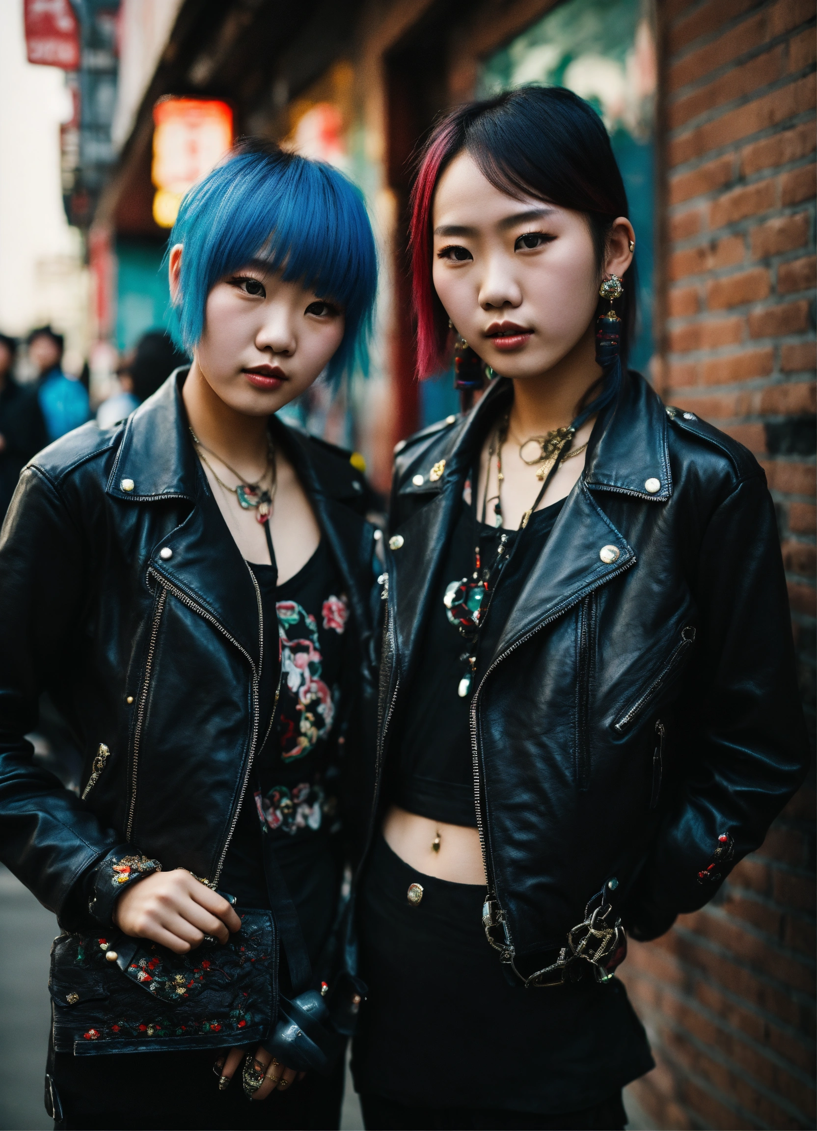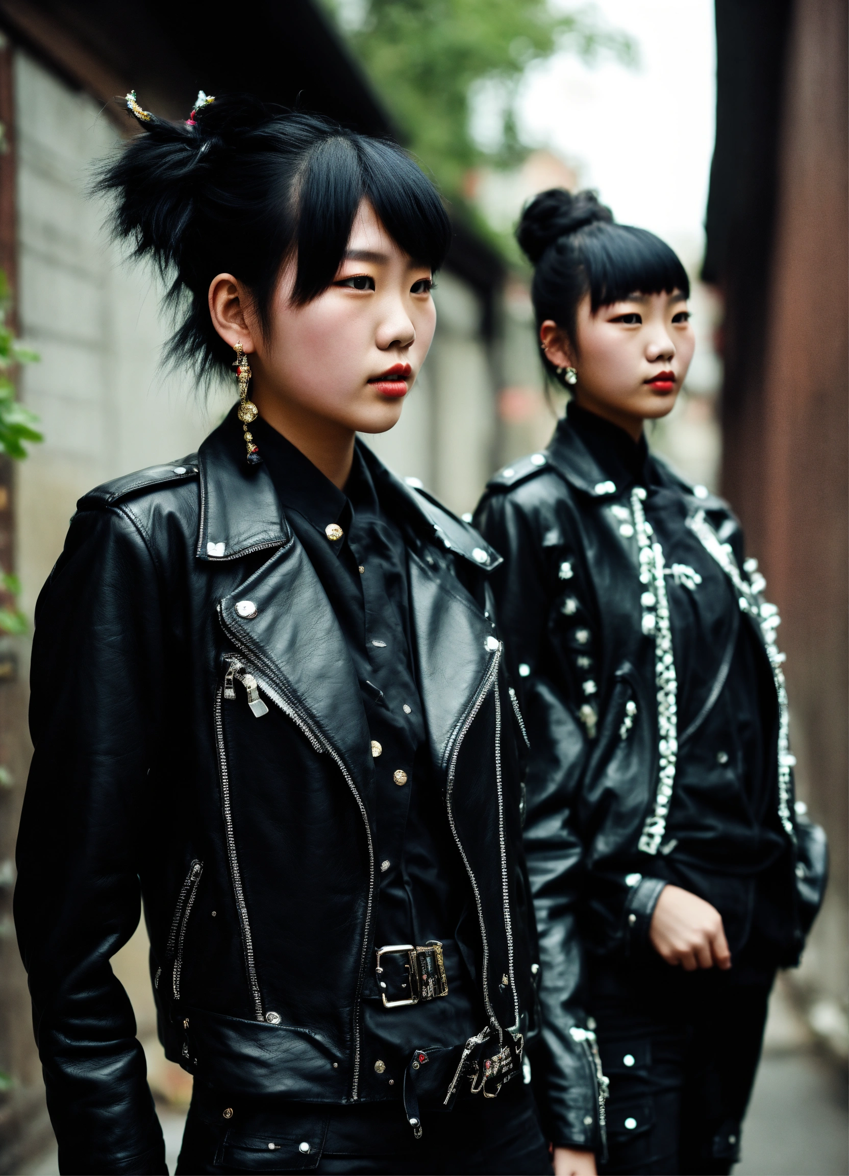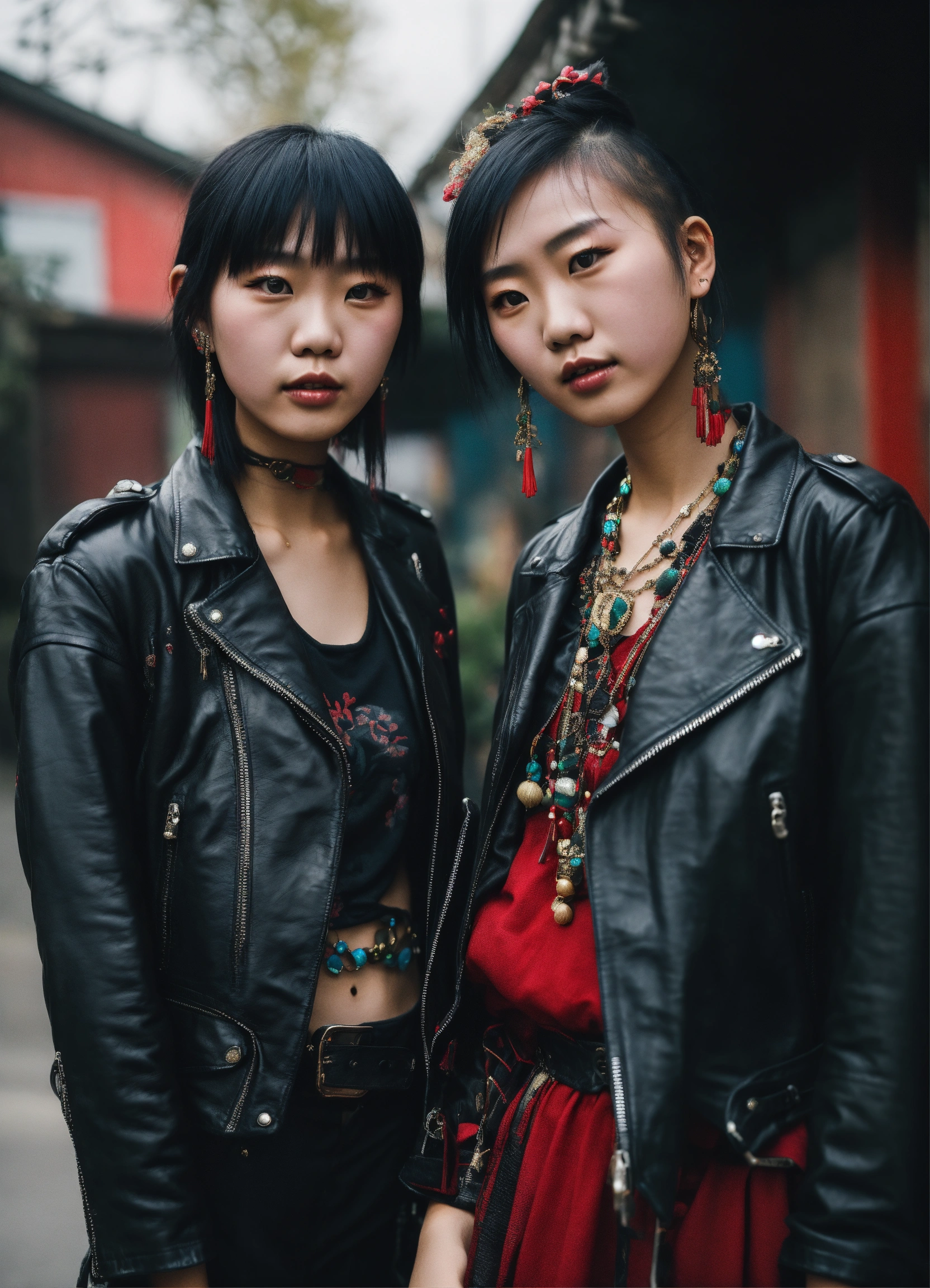 Two 20 year old chinese punk girls wearing a black leather jacket and traditional dress, juwelry, urban enviroment