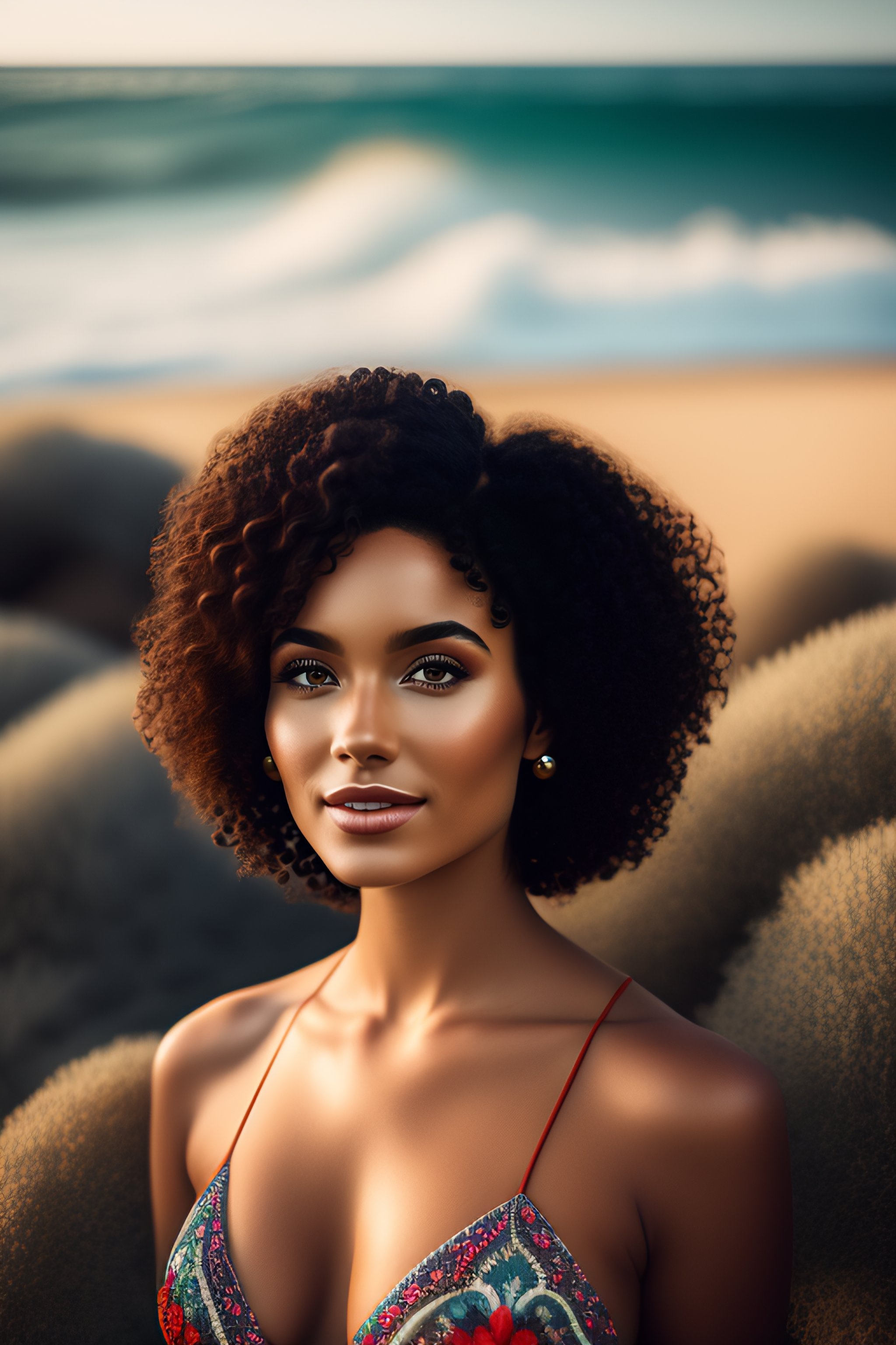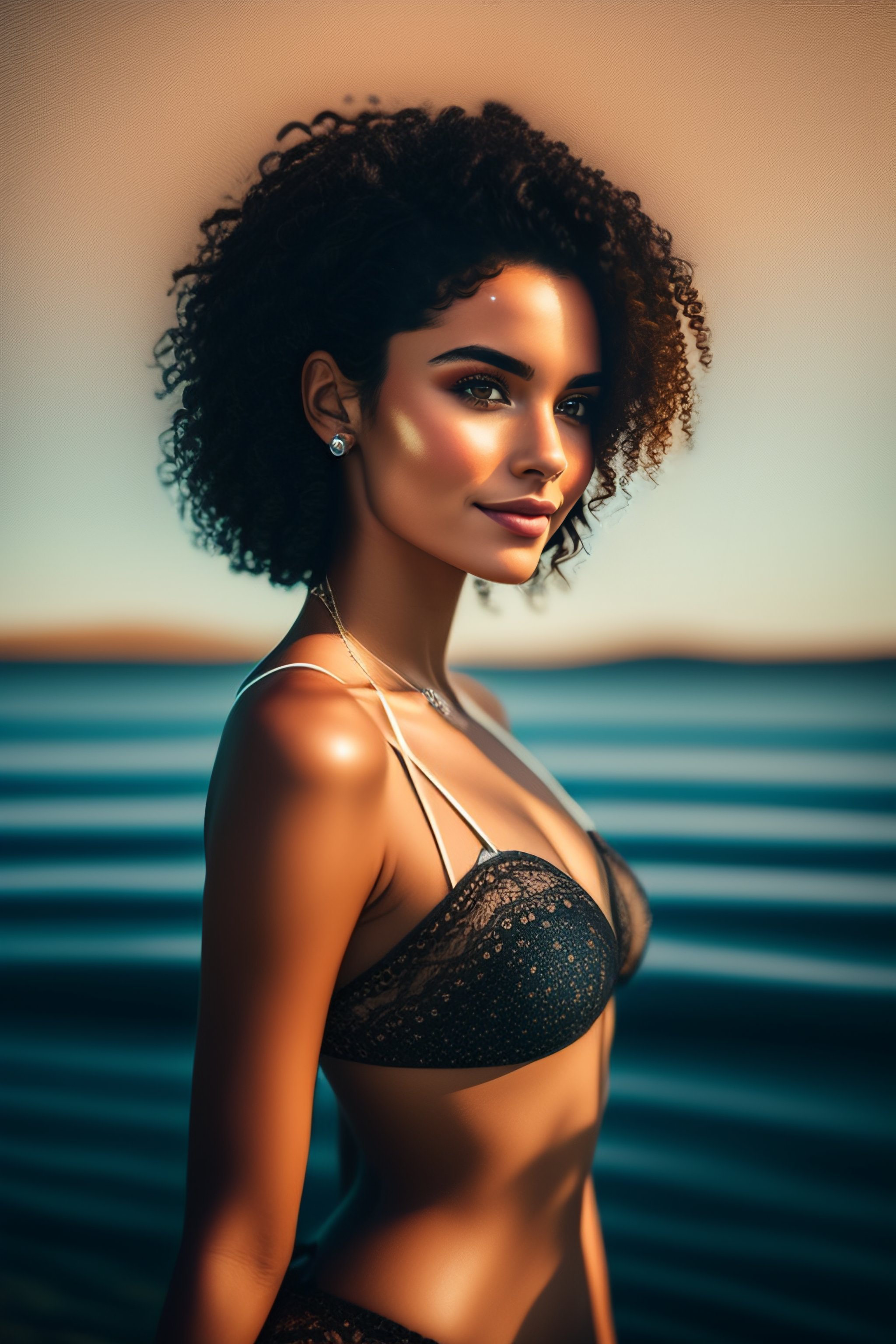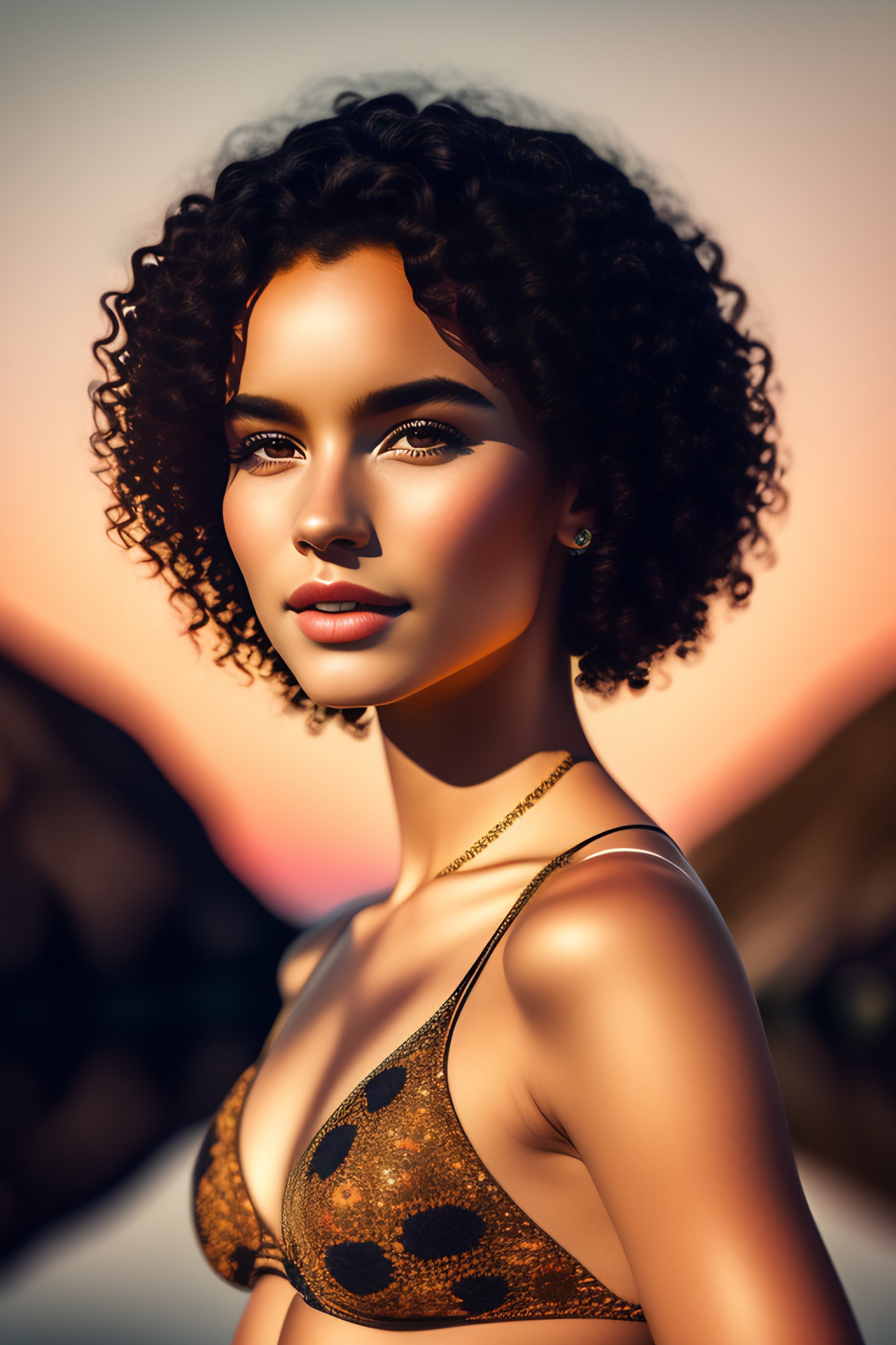 Beautiful cottagecore photo candid of a girl with short black curly hair, round face, cute face, wearing a 34gg size bikini. intricate, elegant. highly detailed, digital upscaled photo, smooth, sharp, focus, illustration.