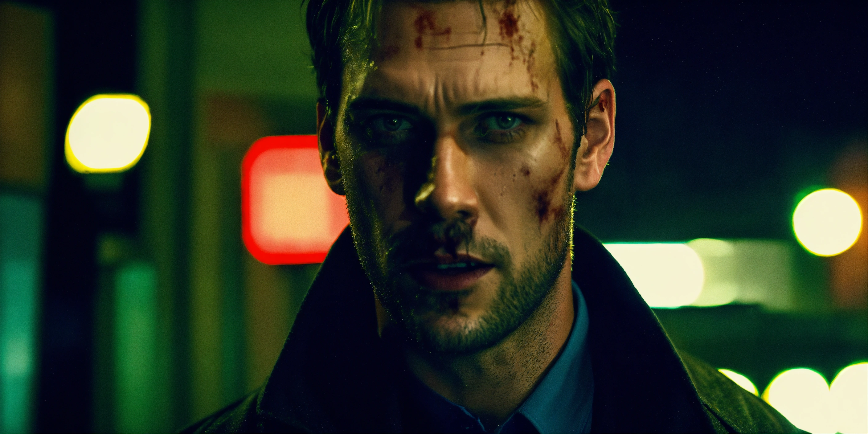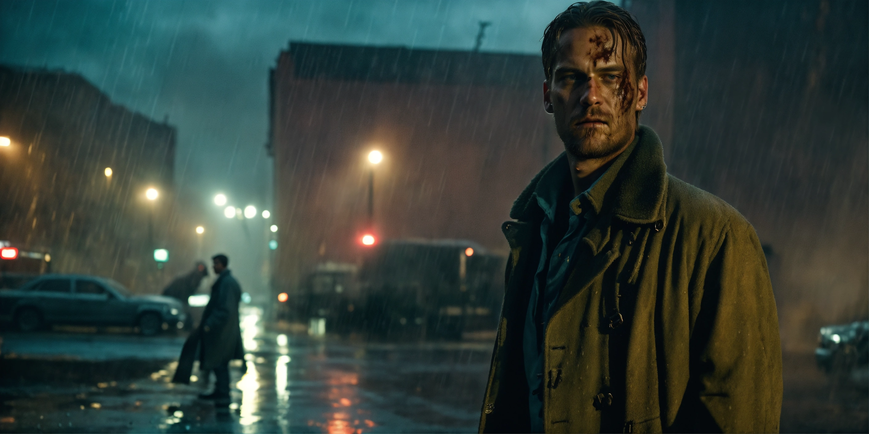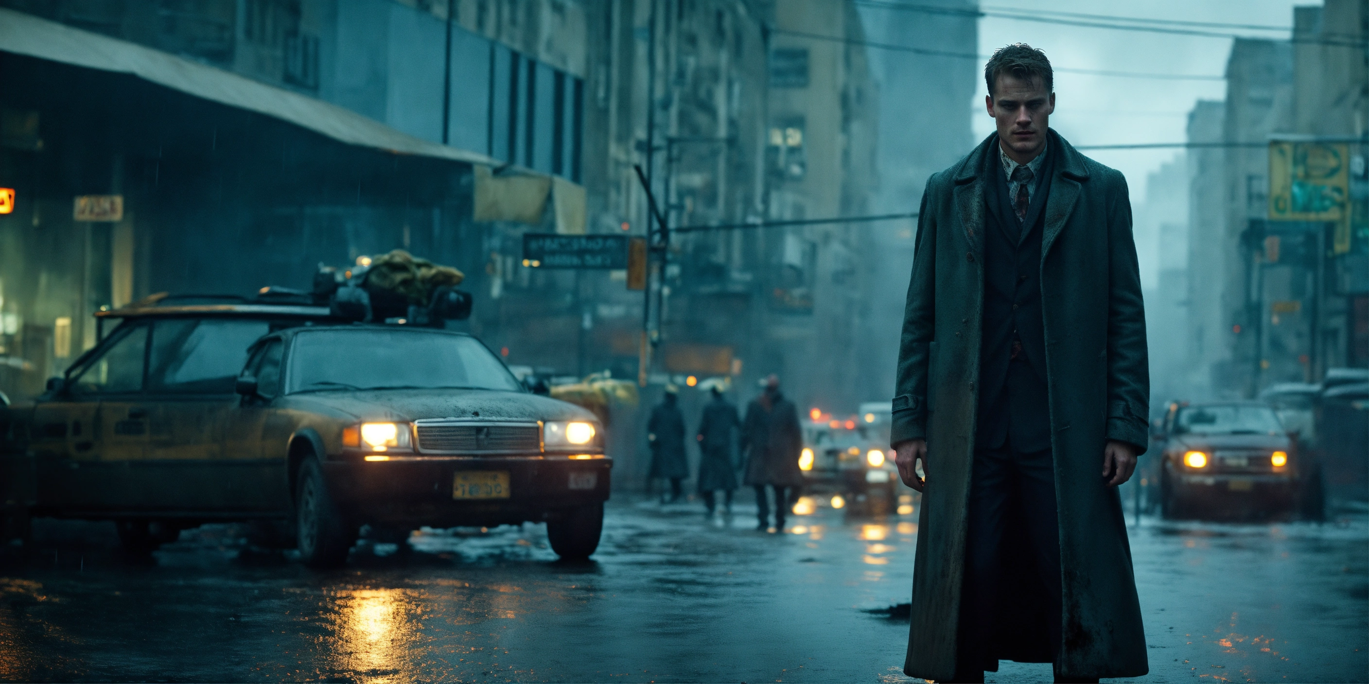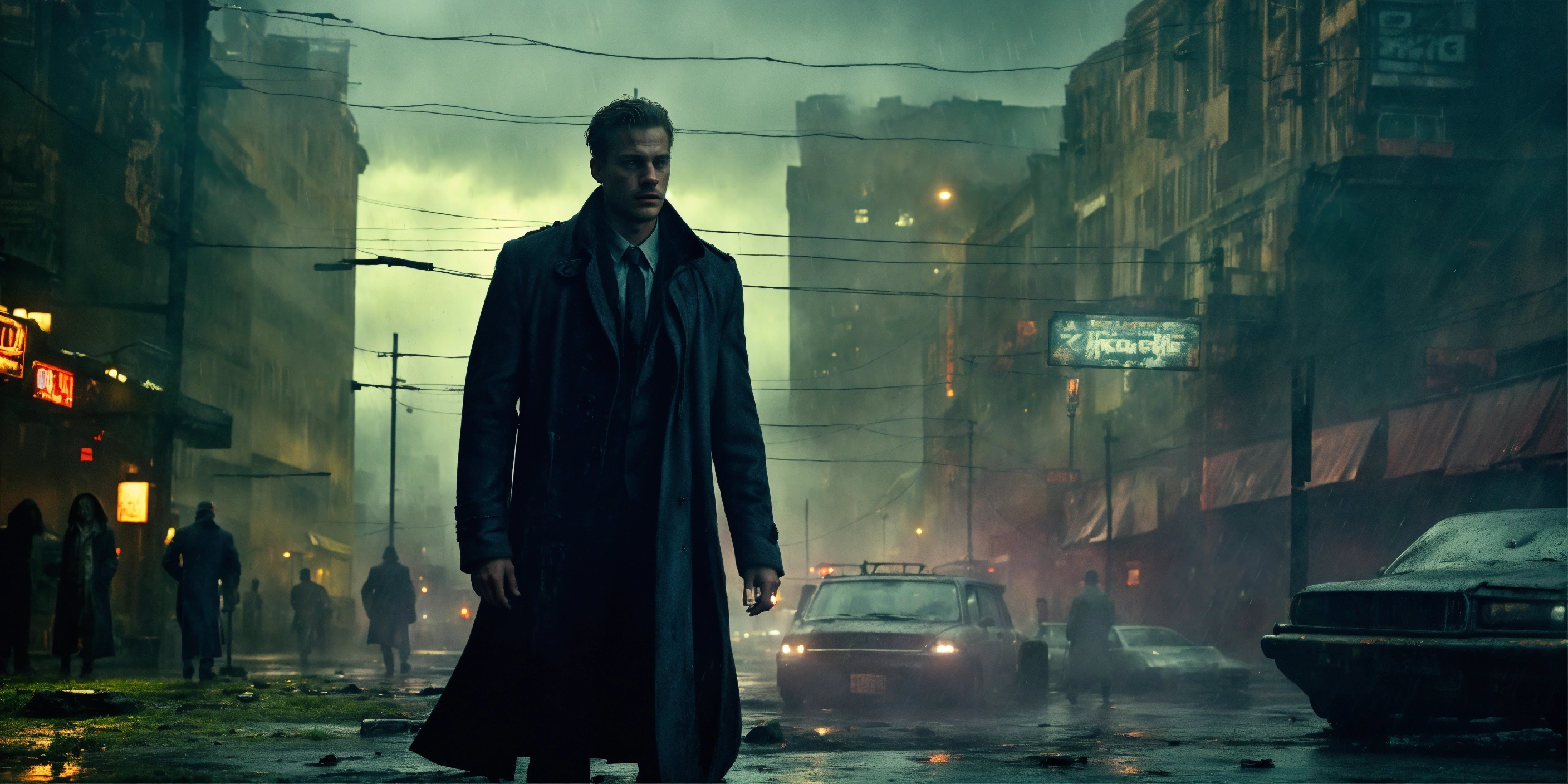 Beautiful tall man, 33 years old kinnaman, zombie-infested city, dark, cinematic, epic, rainy, detailed, realistic photo face, worn-out overcoat