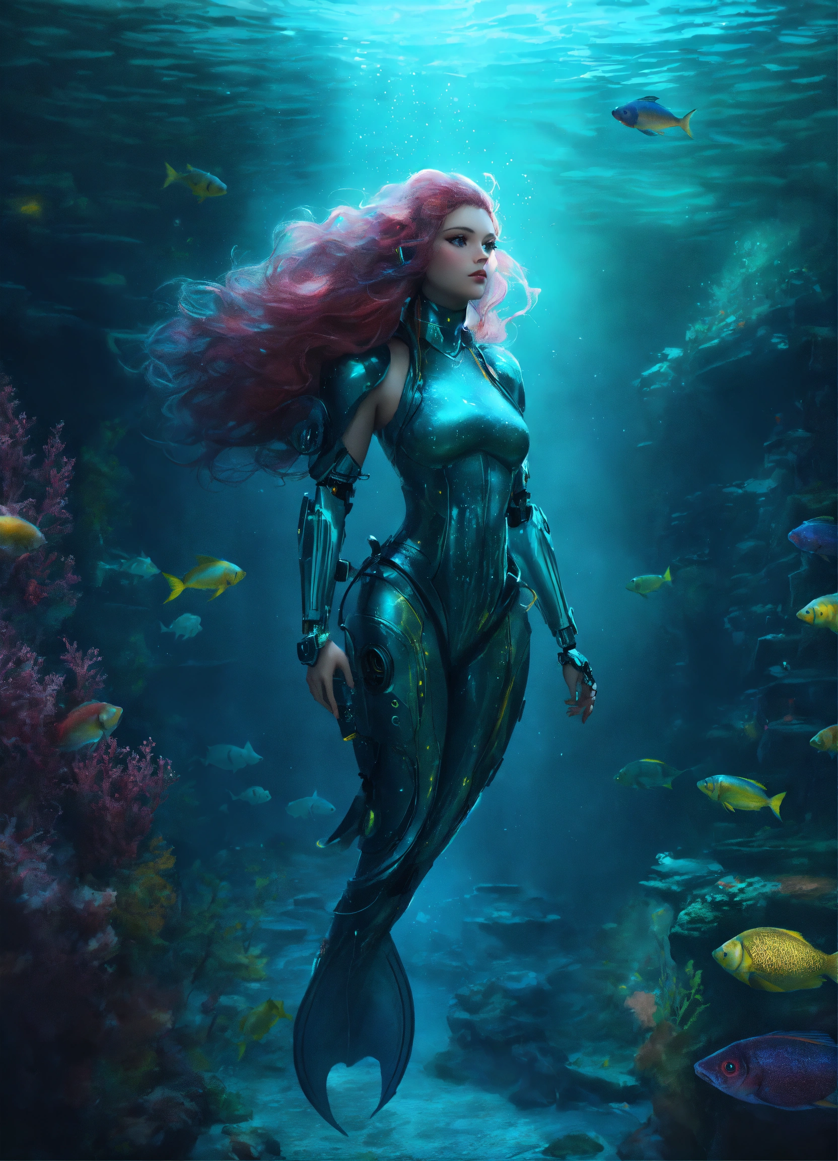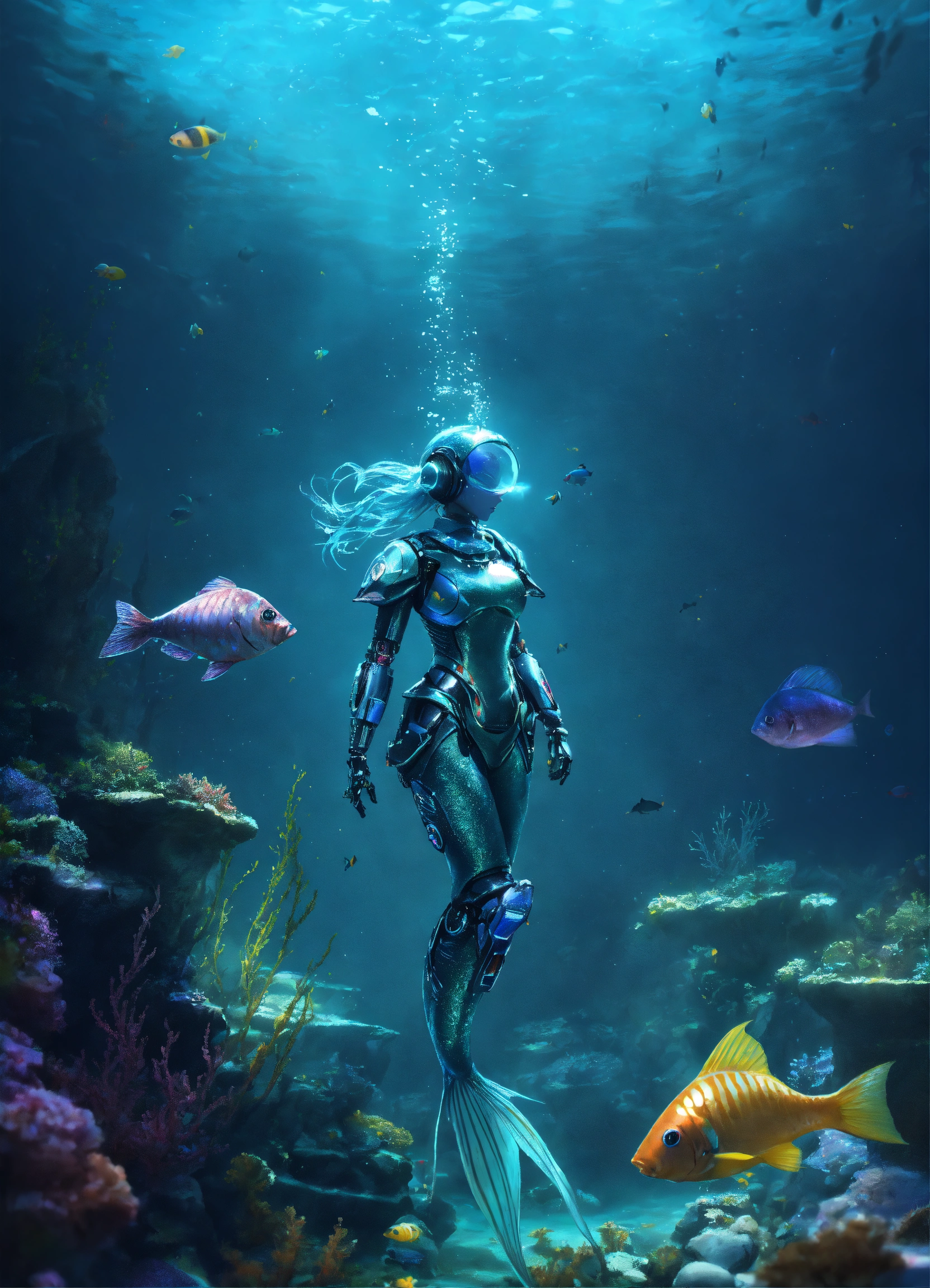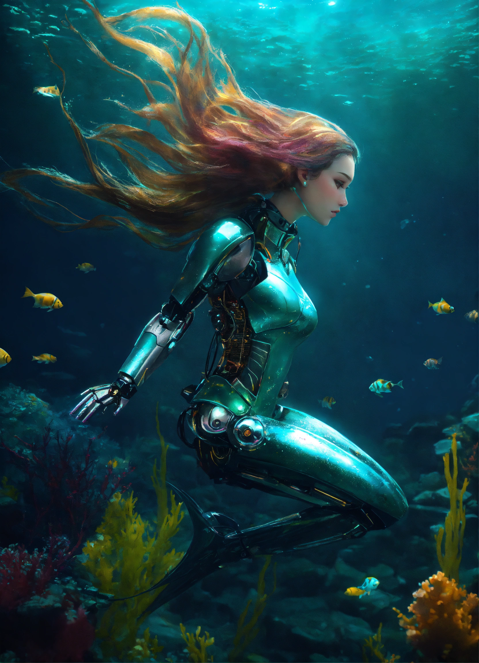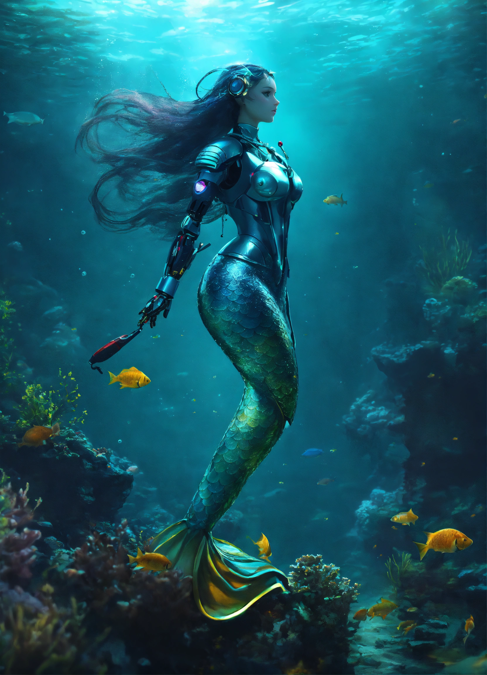 A robot mermaid, in the bottom of the sea, dark light, whit a robotic fishtail, trending in artstation, digital paint hyperrealist photo--s 750