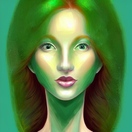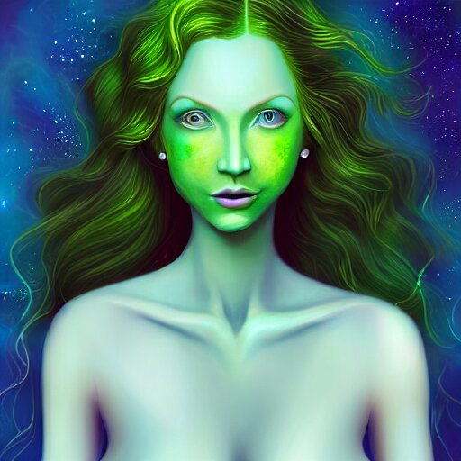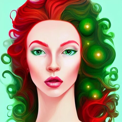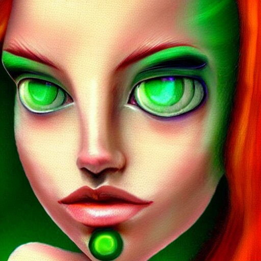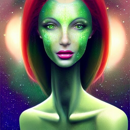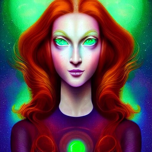 An elegant redhead pleiadian alien human beautiful hybrid feminine woman, green skin, feminine face, long gorgeous red hair in loose curls, with stunning green eyes, cute face and a roundish nose, as a retrofuturistic heroine, face and body, gorgeous psychedelic digital painting, artstation, concept art, smooth, sharp focus, illustration, art by artgerm and donato giancola and joseph christian leyendecker, ross tran, wlop