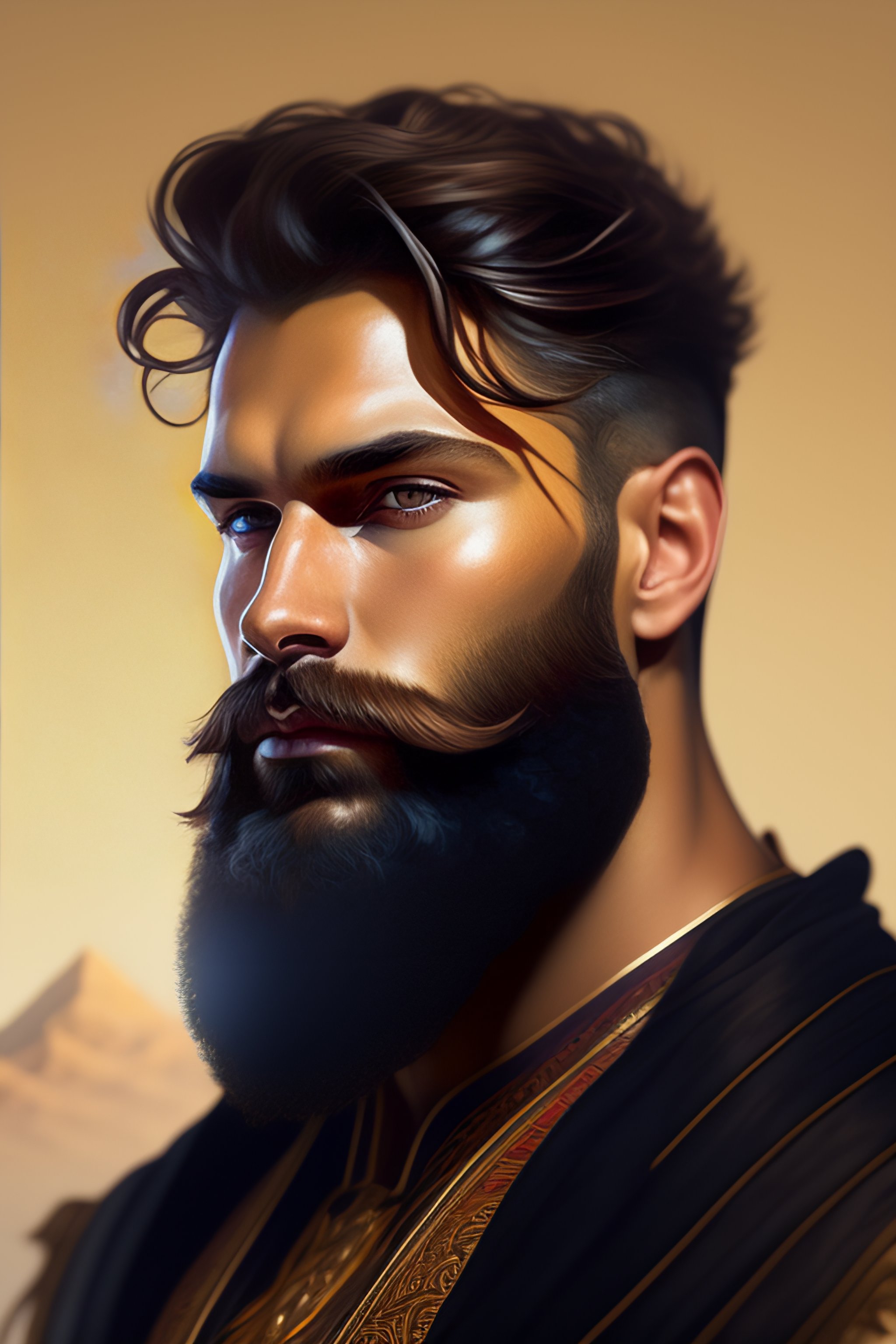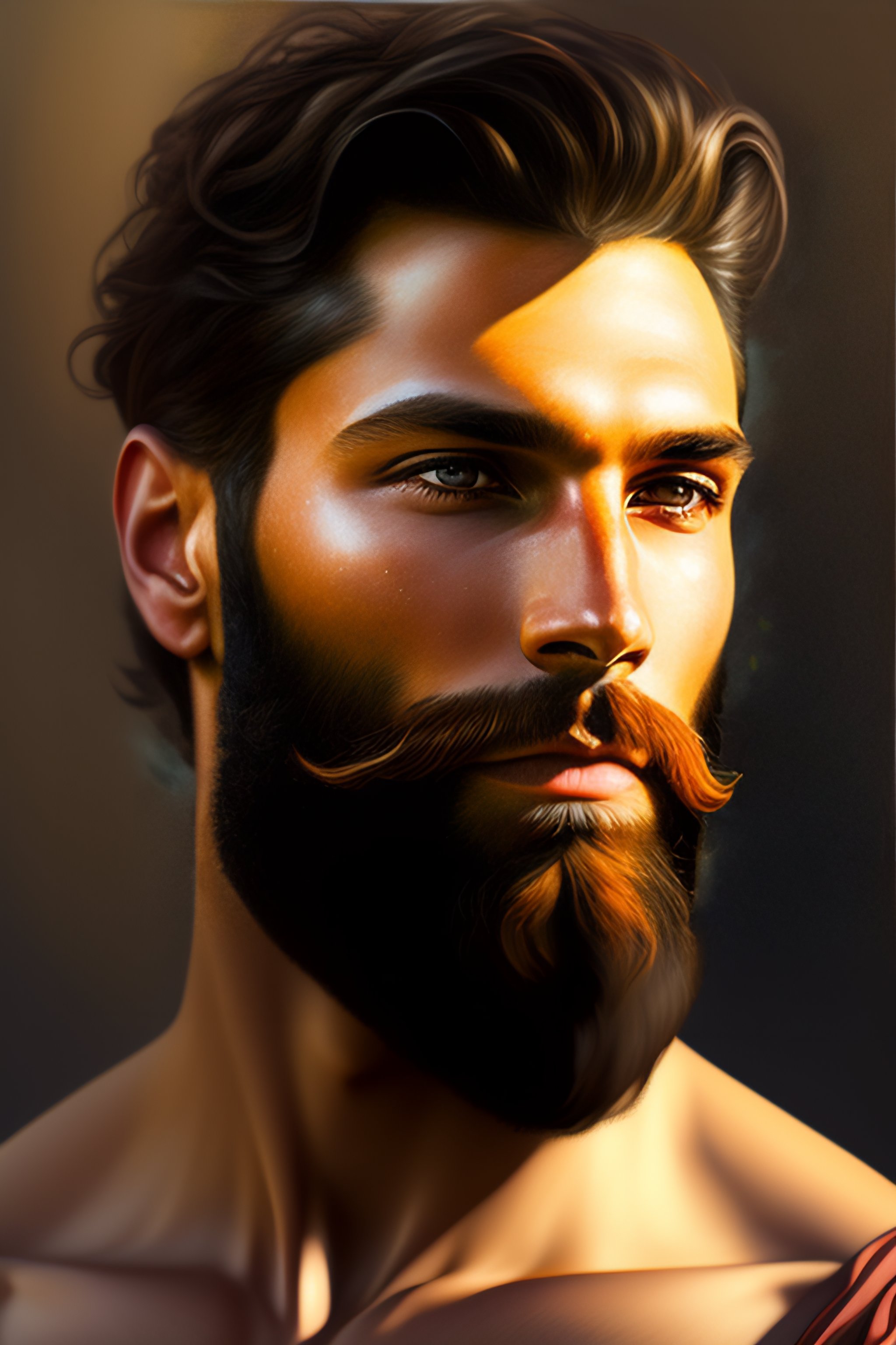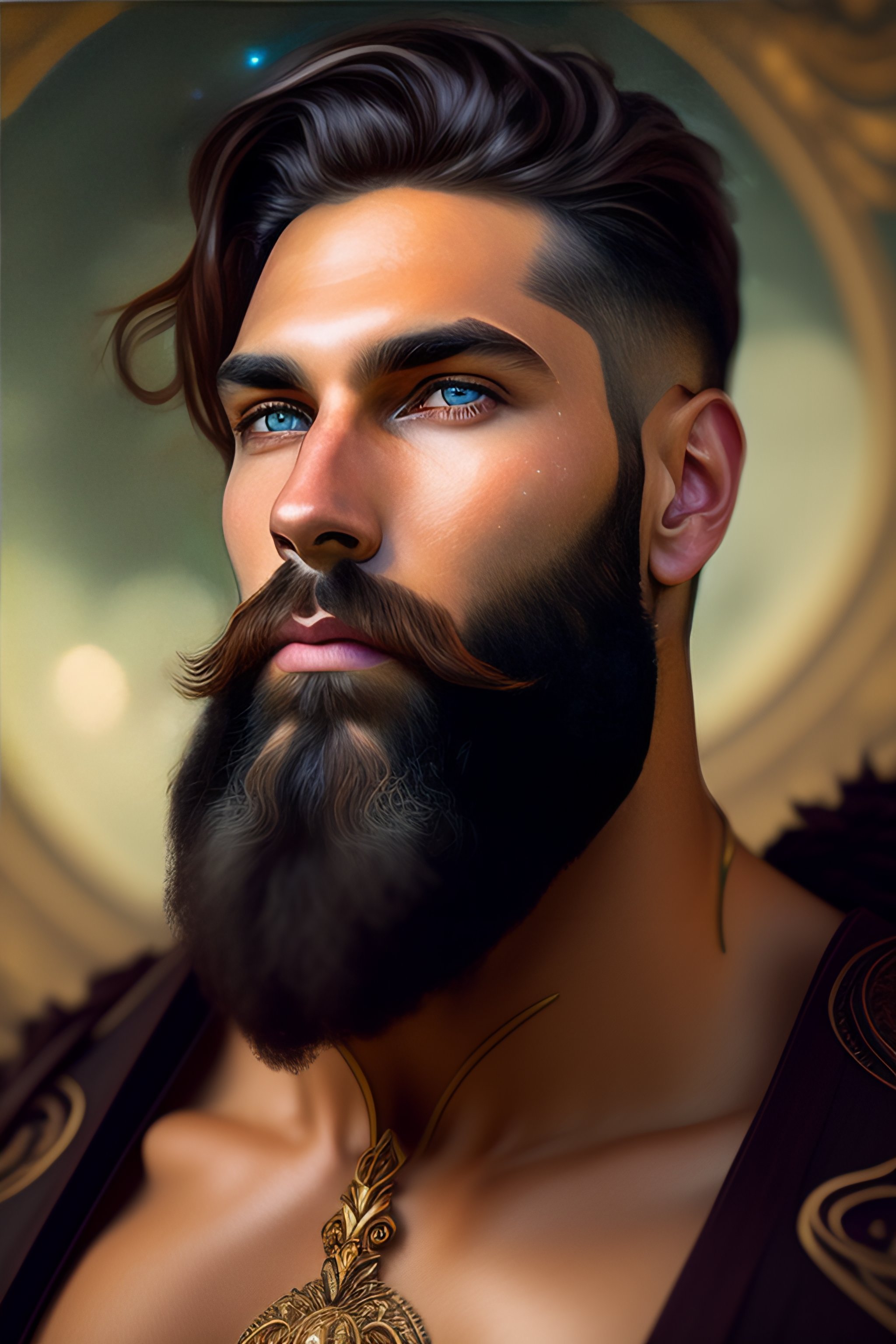 Realistic portrait of a natural strong bearded man, shaped face, natural beauty, handsome man, glowing glass skin, highly realistic, sparkling hazel green eyes, highlighted chestnut brown, confident half smile, face painting, dramatic lighting, intricate, wild, exotic beauty, highly detailed, digital painting, artstation, concept art, smooth, sharp focus, illustration, art by artgerm and greg rutkowski and alphonse mucha, footage from space camera