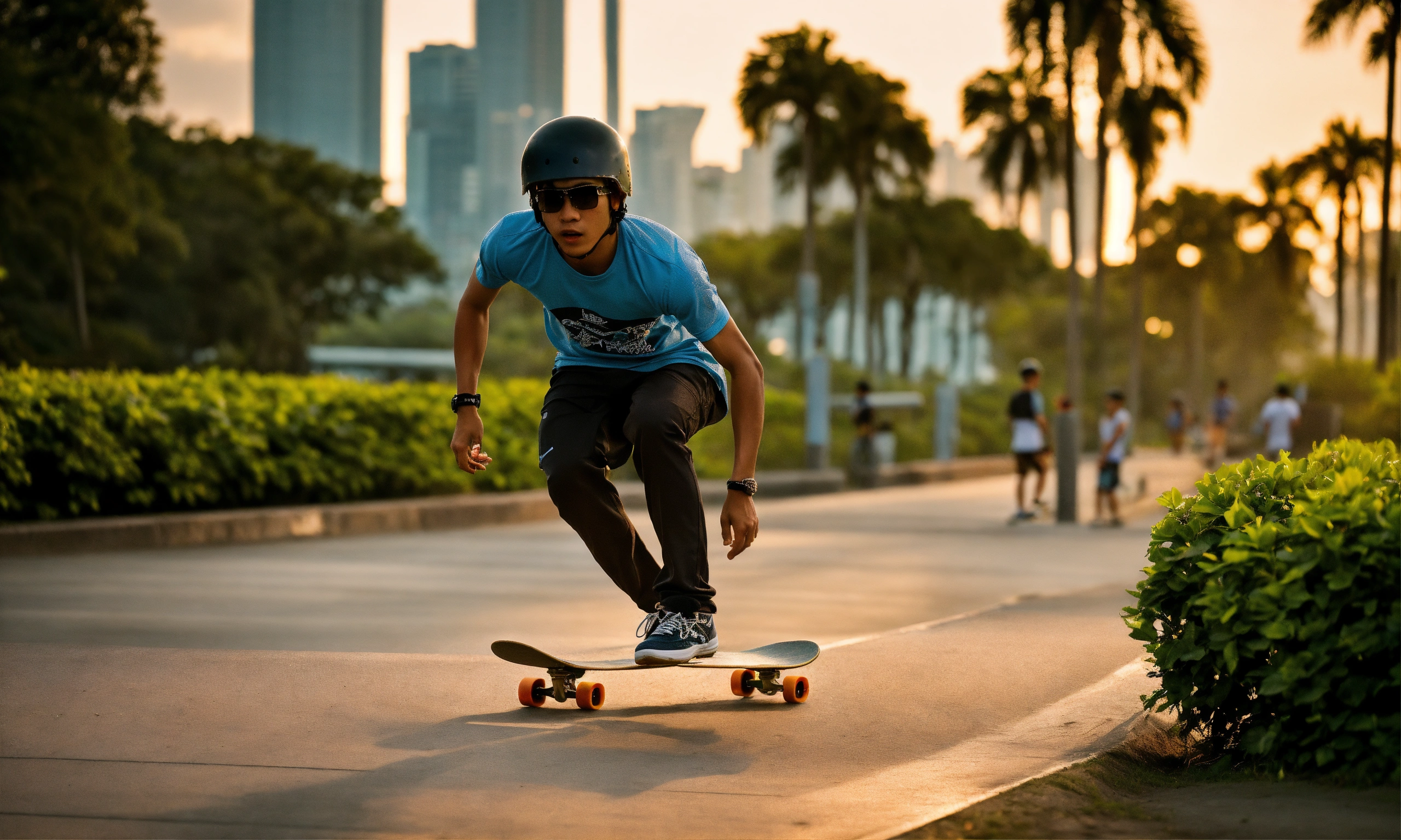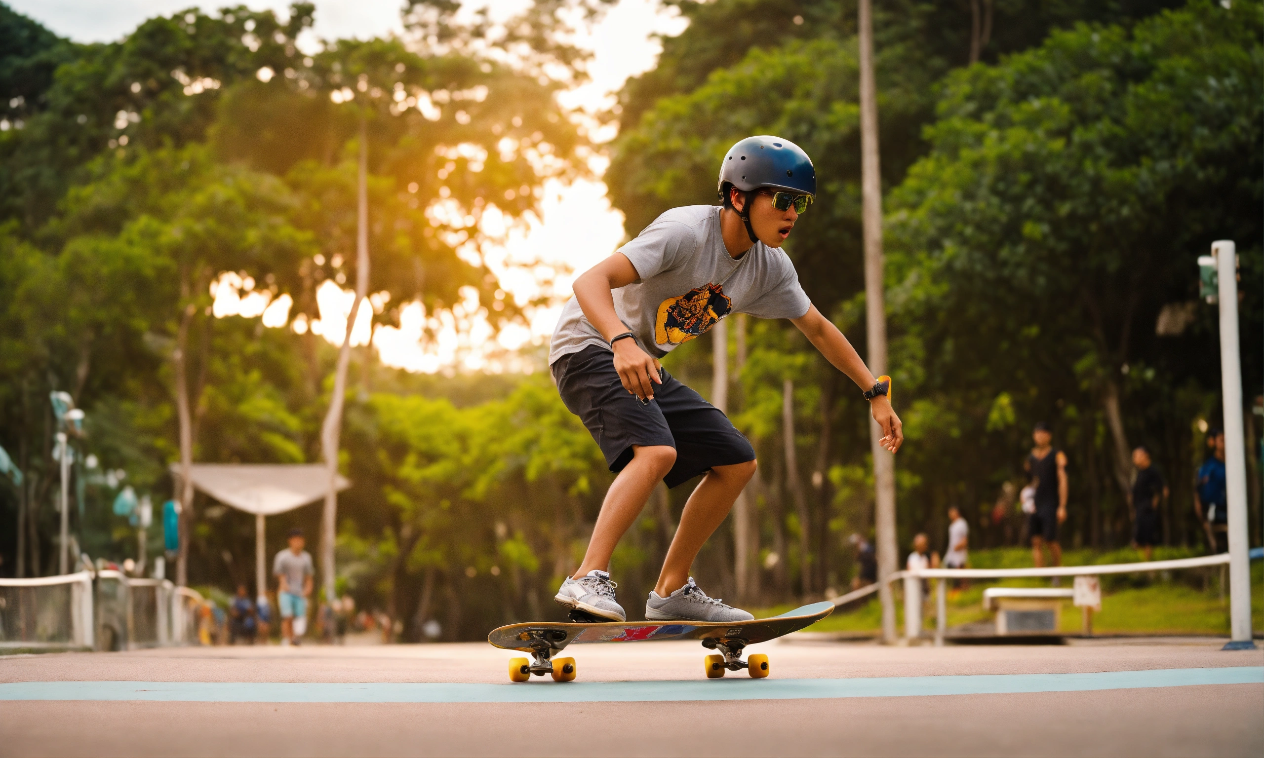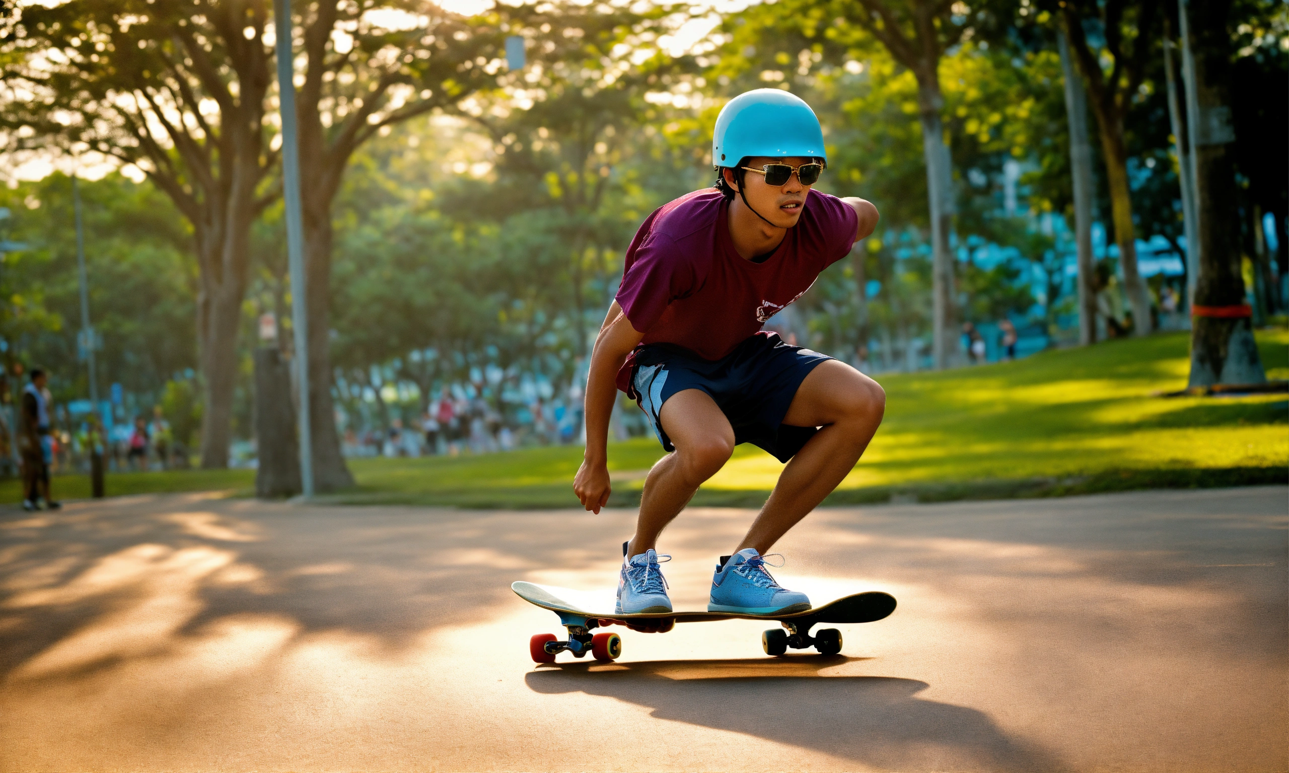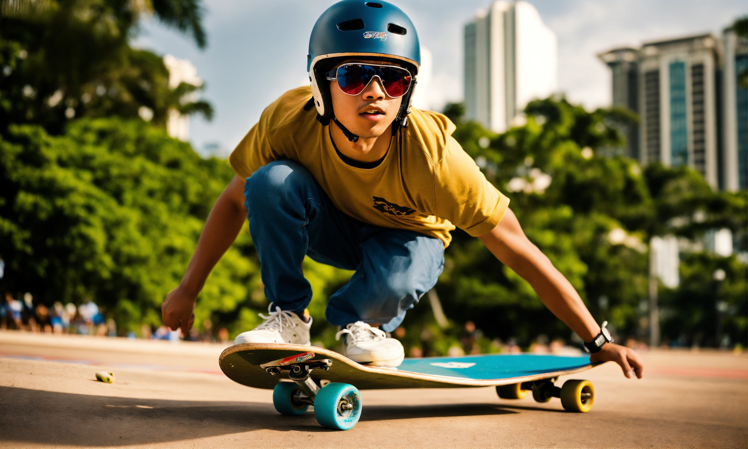Day, ultra-realistic photo, cinematic quality, close-up action shot at singapore's east coast park, singapore, the backdrop showcases the iconic scenery of the park. main focus a 18-year-old malay skateboarder with helmet and sunglasses in mid-air executing a trick, his body contorted in concentration. intense focus radiates from his eyes, sweat glistening on his brow, exuding raw passion and unyielding perseverance; clothing contemporary skateboarding attire including protective gear, a t-shirt, shorts, and sneakers. expression grit and determination, a testament to his dedication to the sport. themes modern nostalgia, overcoming adversity, dynamic lighting emphasizes the contours of his face and body against the backdrop of east coast park, 50mm camera lens producing sharpness with a blurred background, portra 400 film, subtle film grain adding depth and emphasizing the raw energy of the moment.