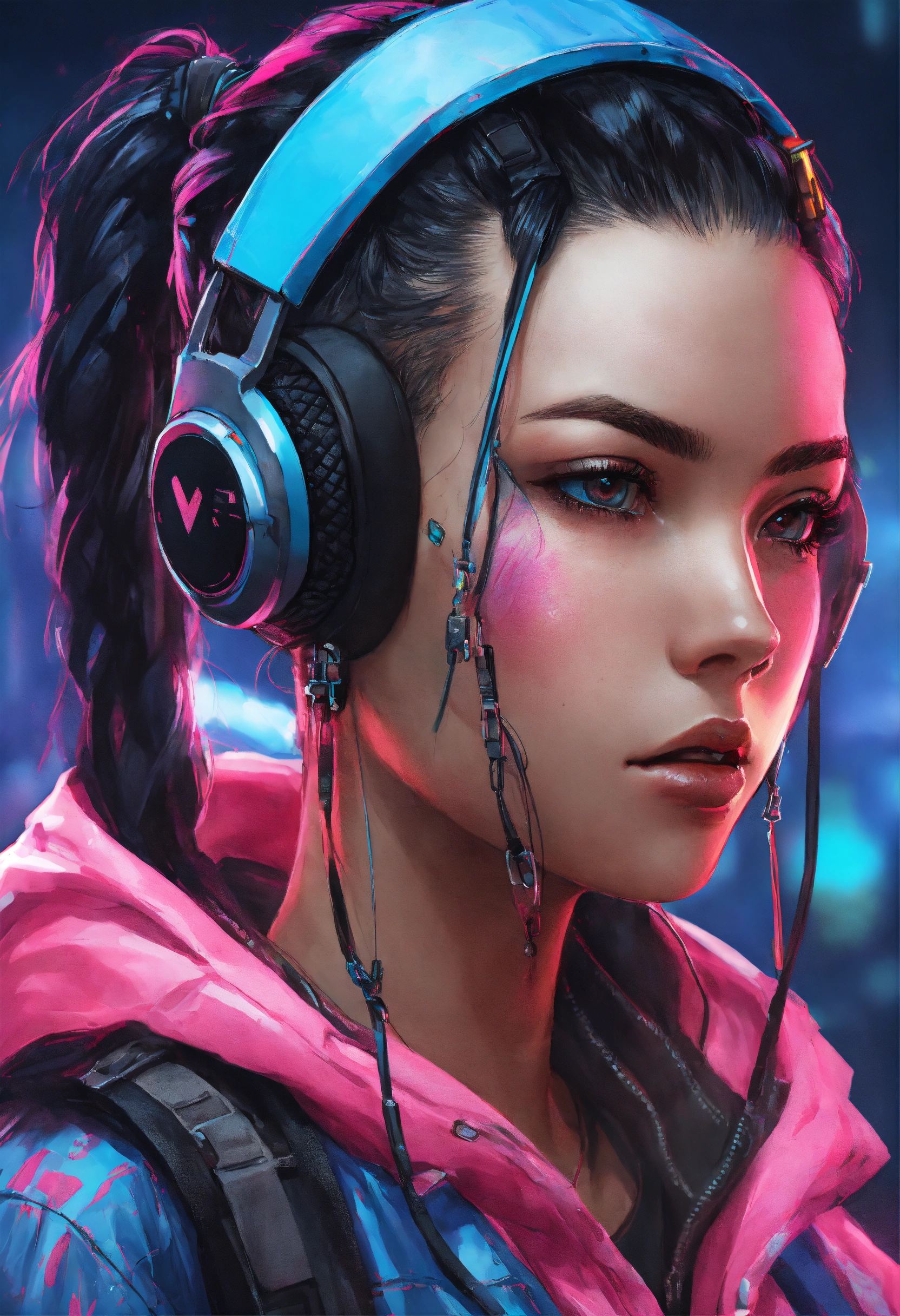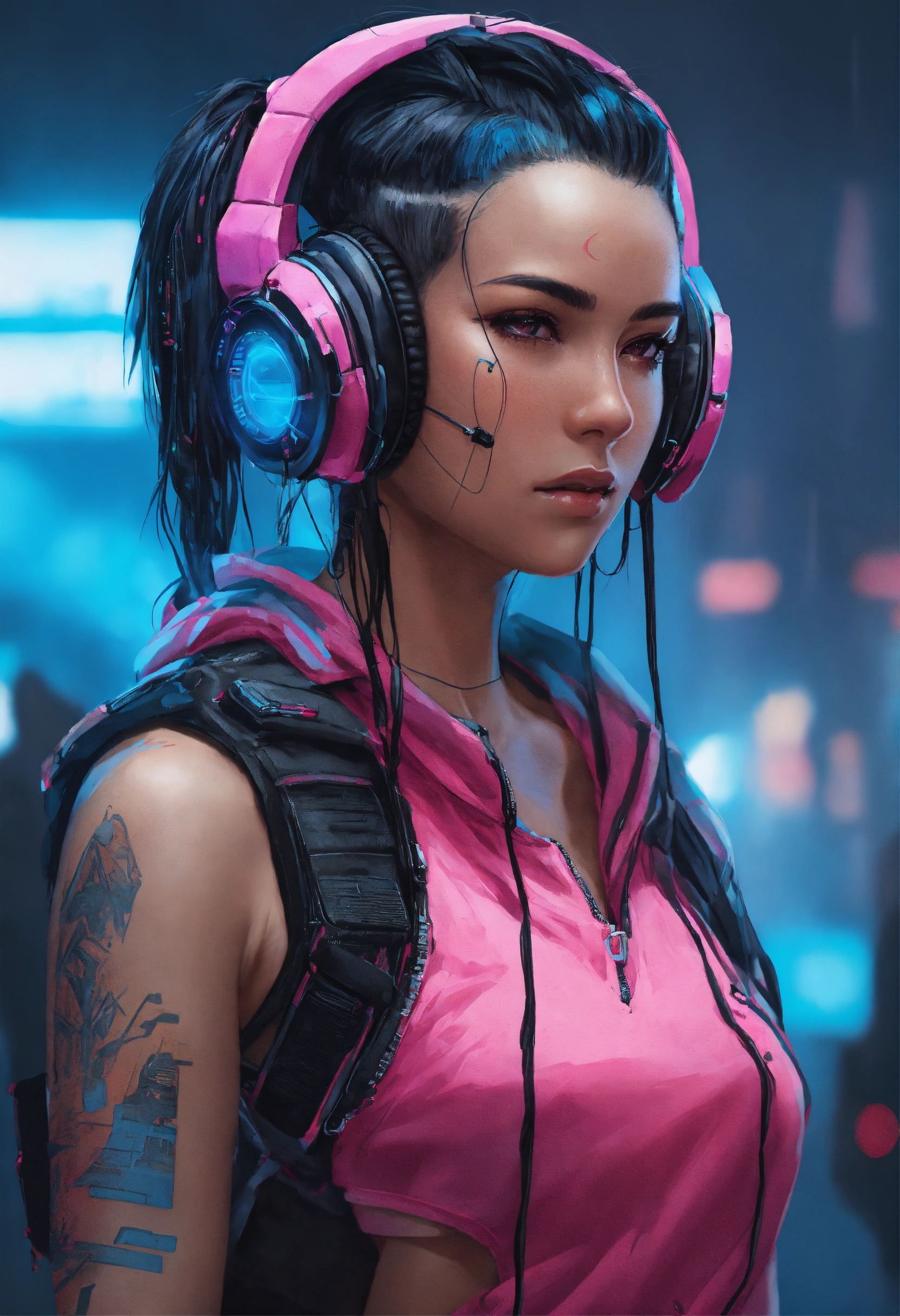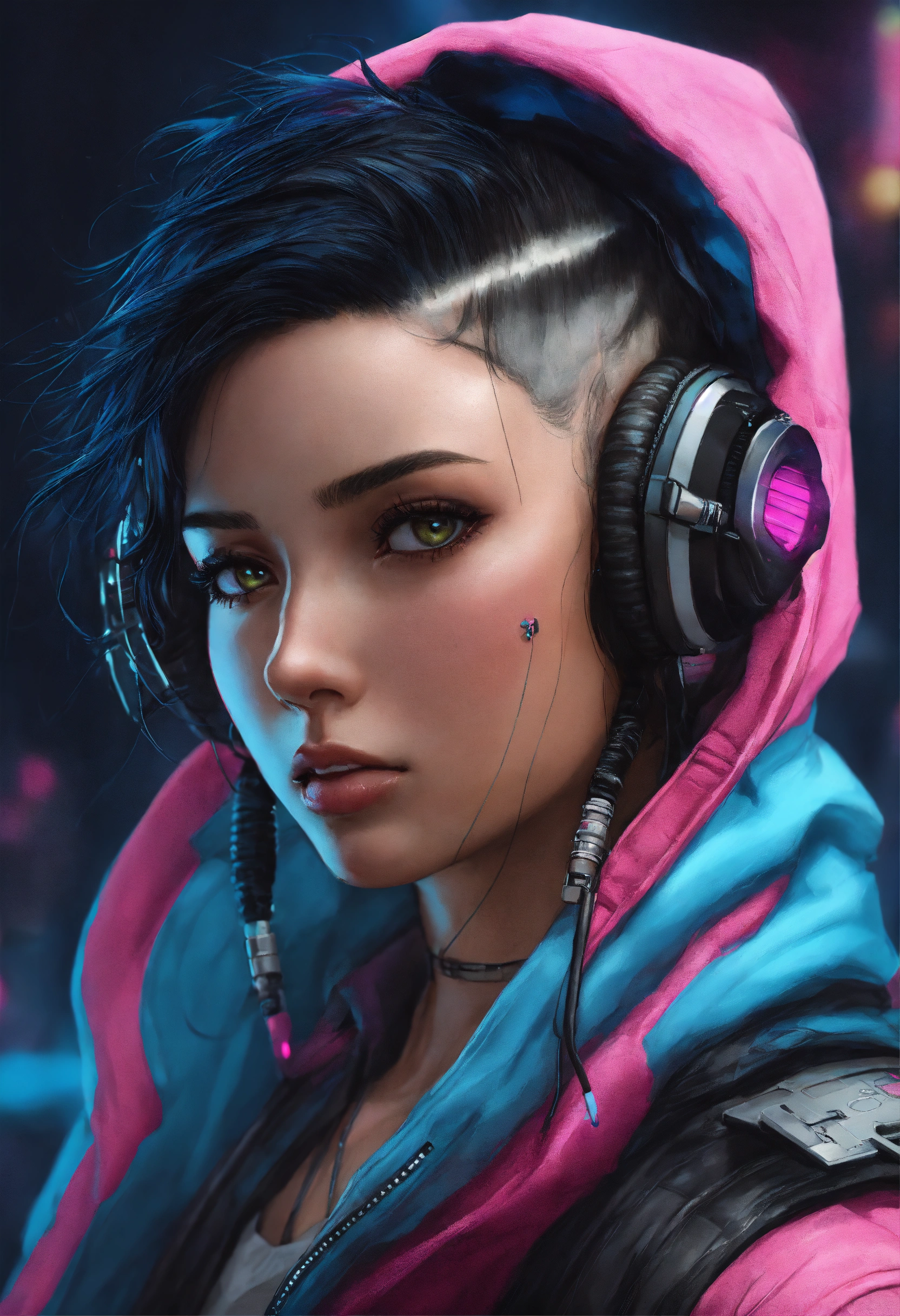 Highly detailed portrait of a cyberpunk woman, with two pigtails, shaven sides, black hair with pink tips, blue sleeveless hood, no headphones!!!