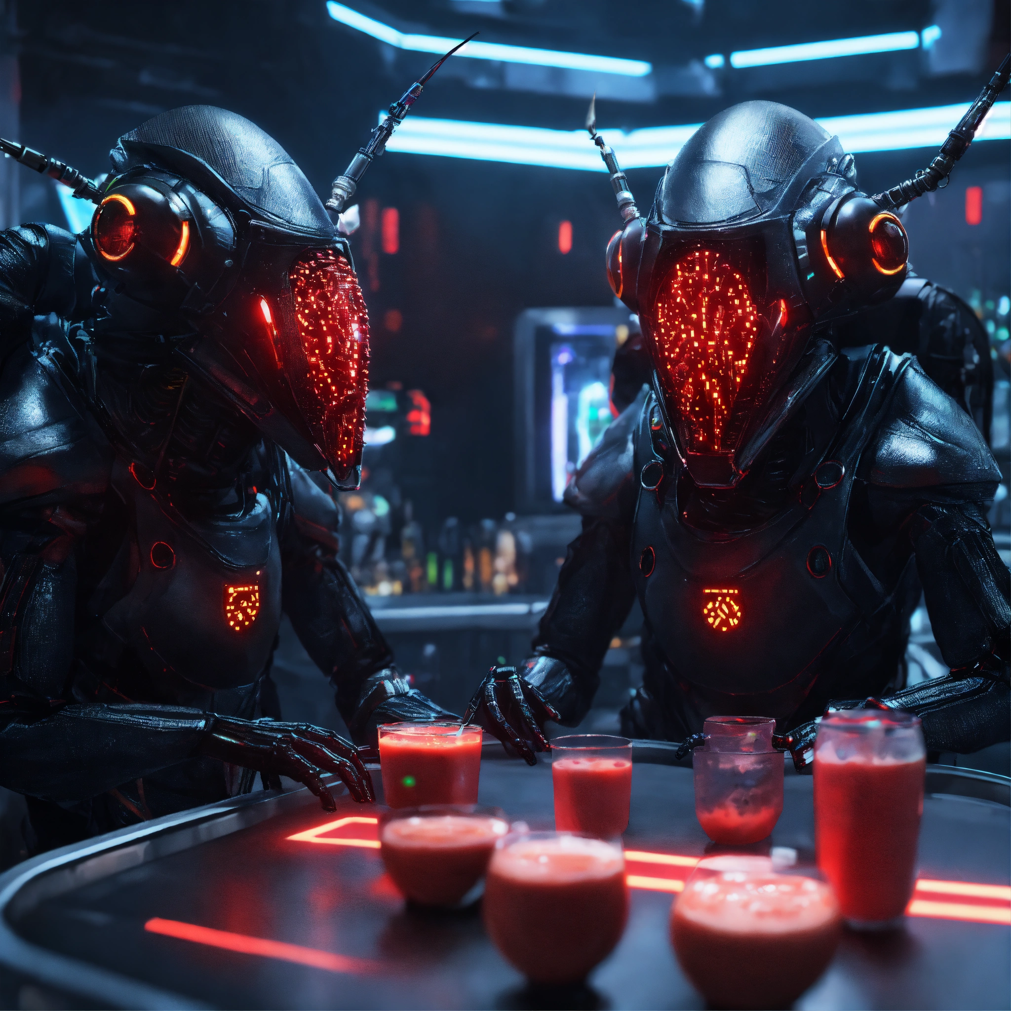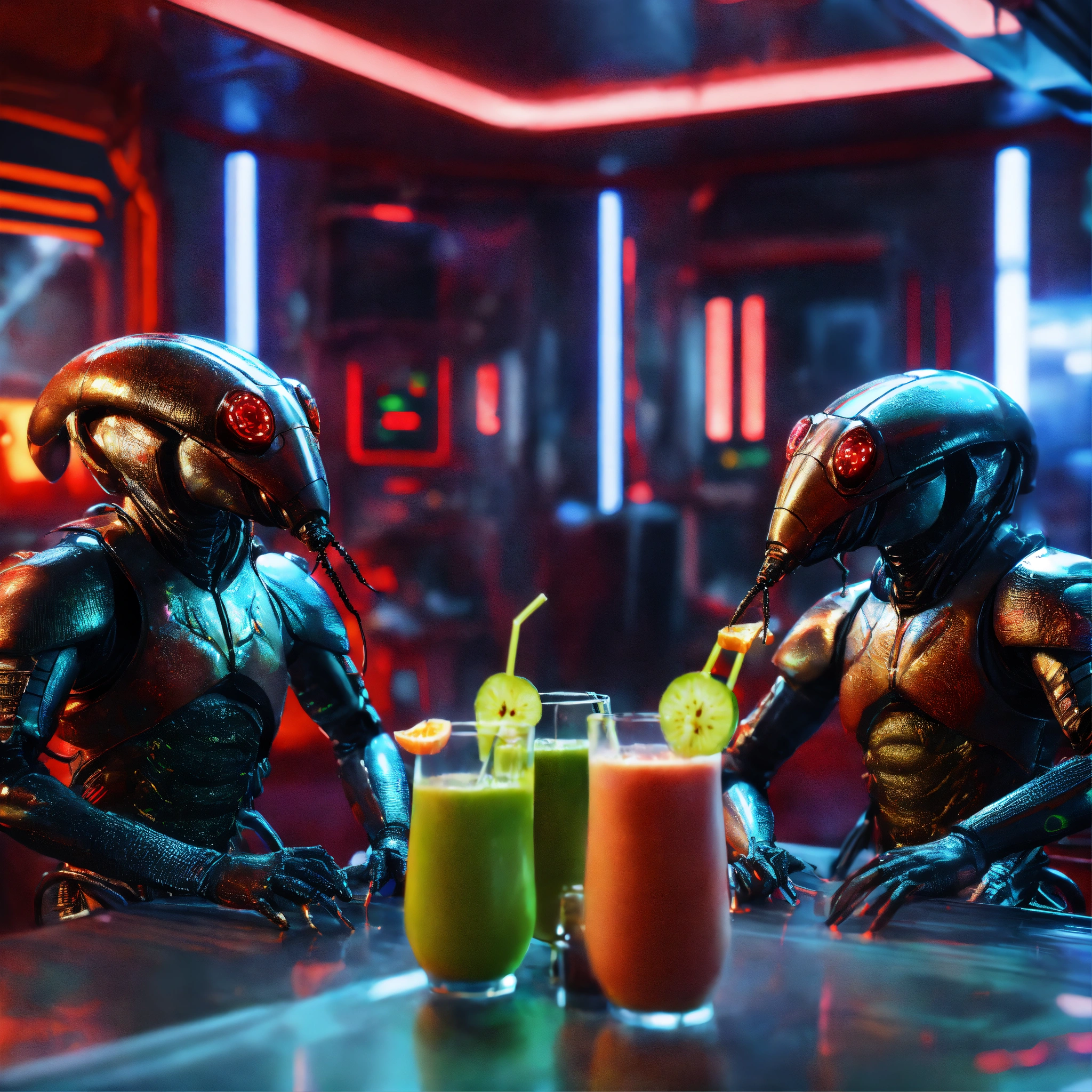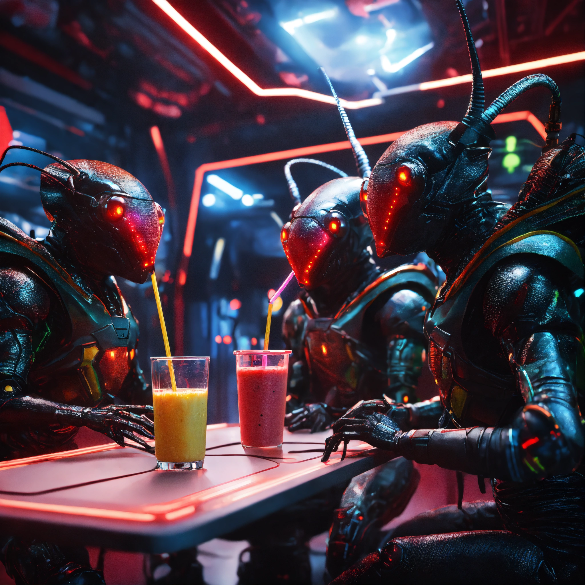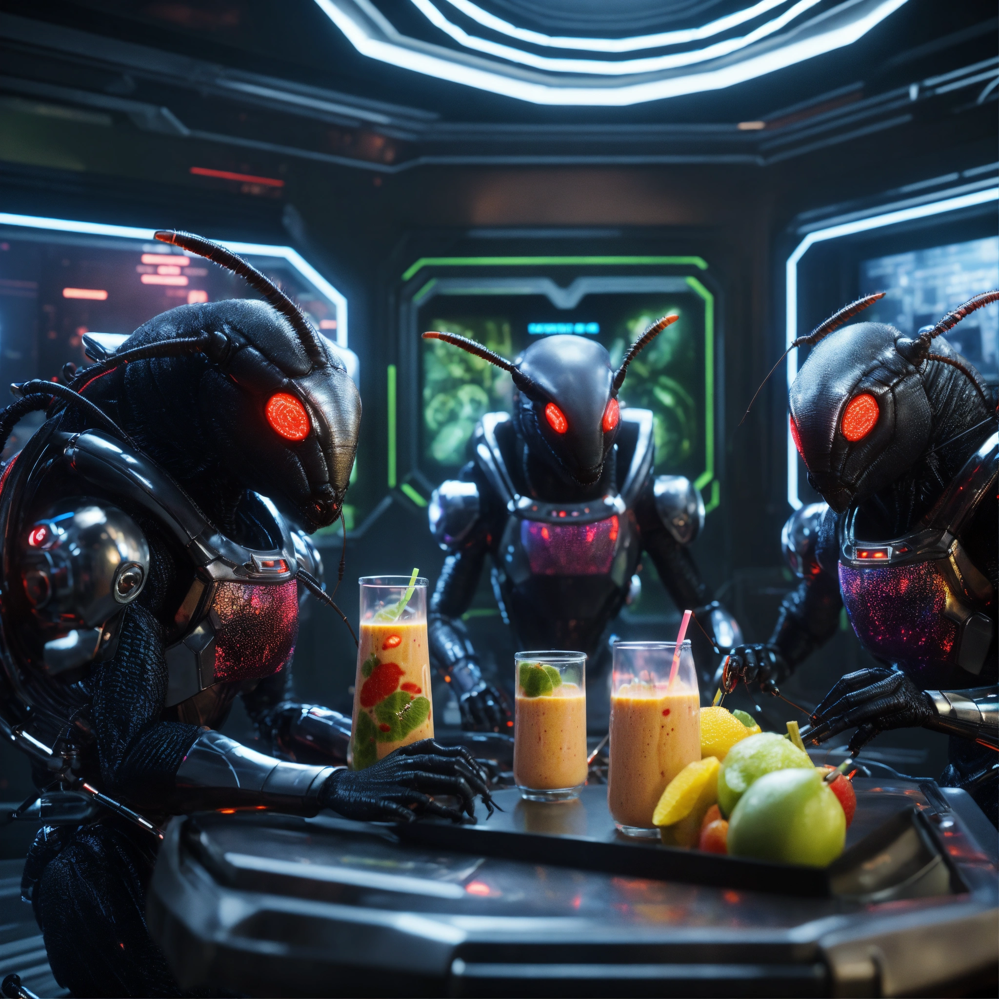 3 black cockroach faced humanoids with red eyes and detailed circuitry markings, drinking a fruit smoothie in a hi tech alien holographic control room, realistic, 8k, unreal engine, pixar