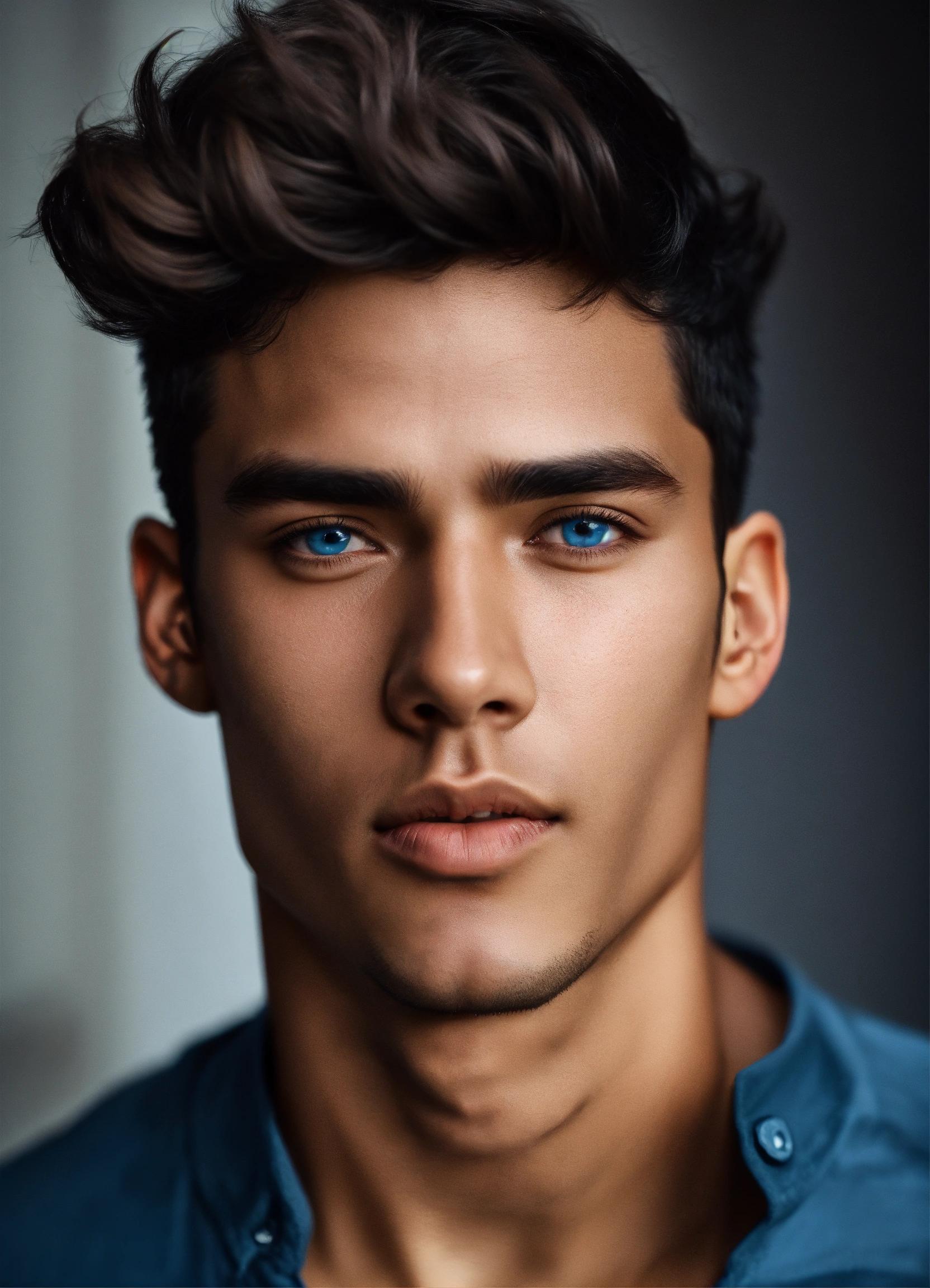 Young man; deep caramel tan skin, angular features; sharp cheek bones; thin yet full lips, thin strong nose, pointed ears; upturned deep ocean blue eyes; short black fade hairstyle