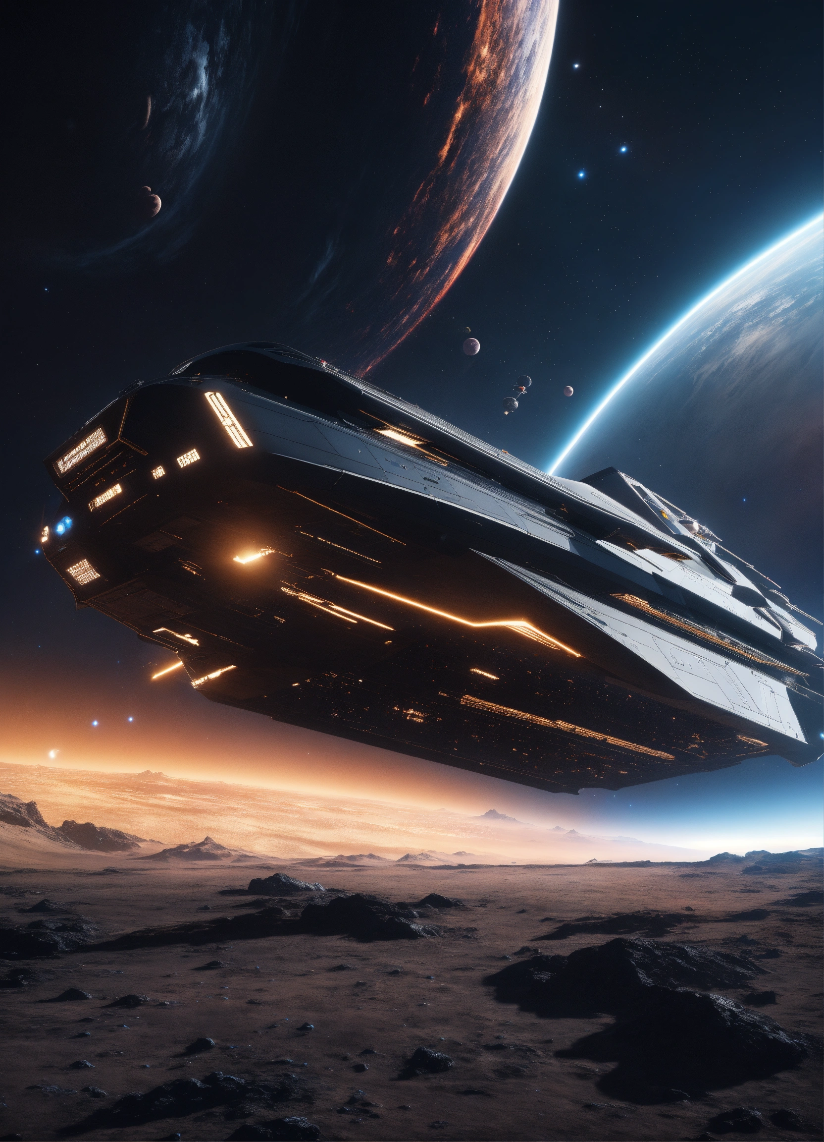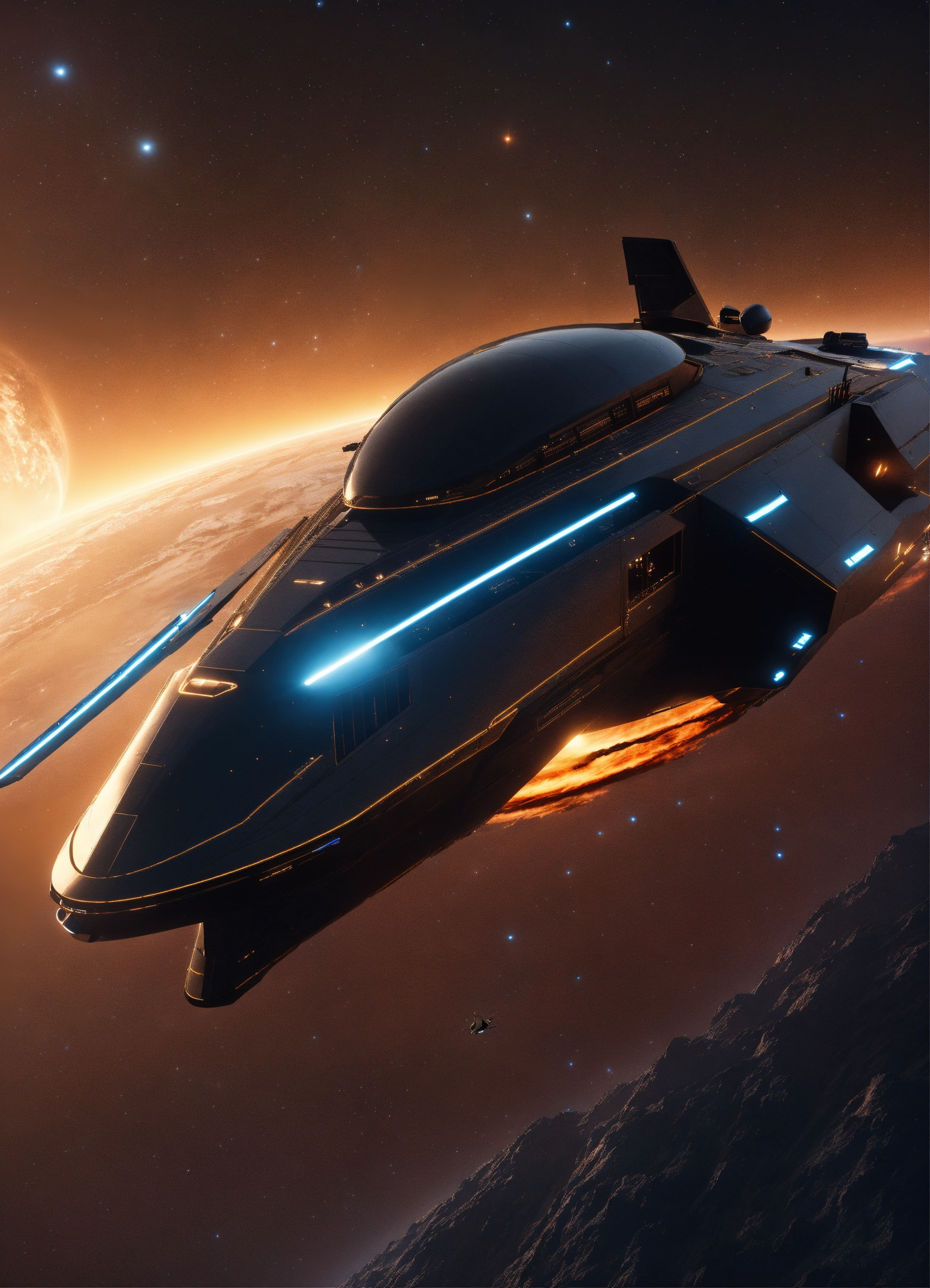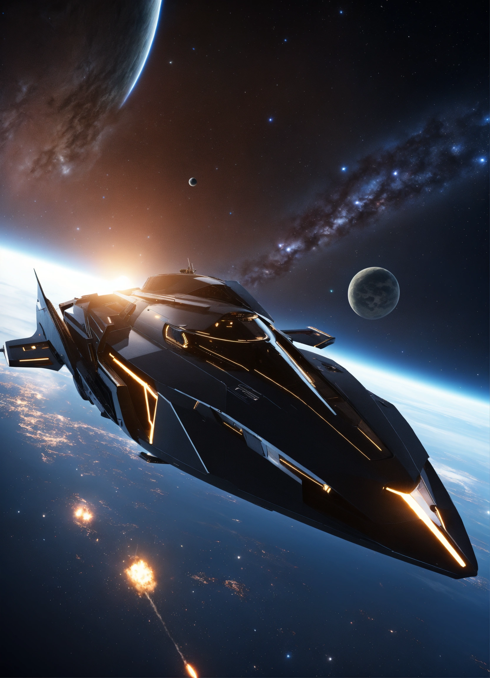 Luxurious sleek black space yacht shooting out in deep space, future hi tech exterior, sci fi, unreal engine, realistic.