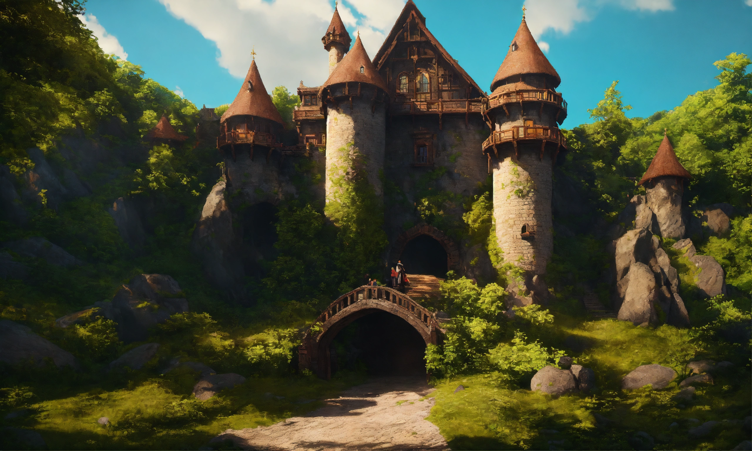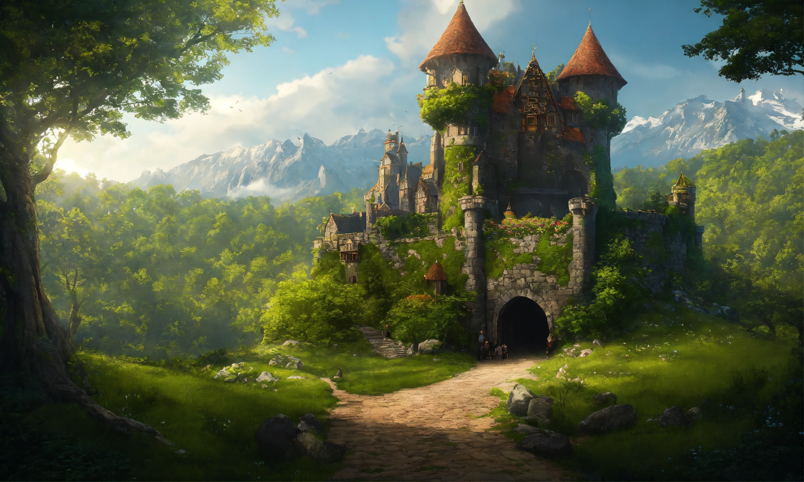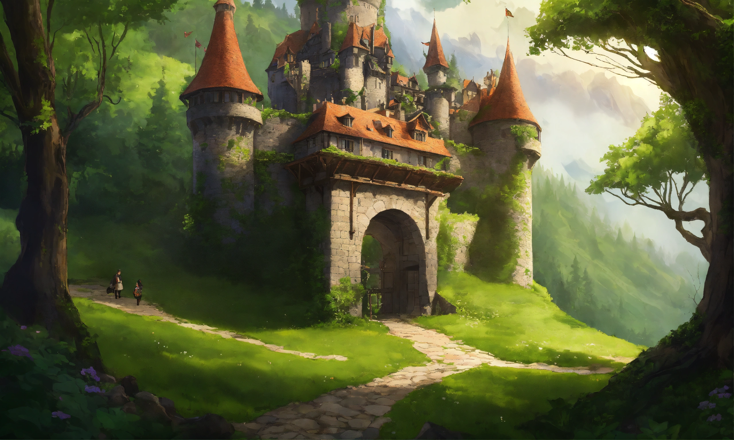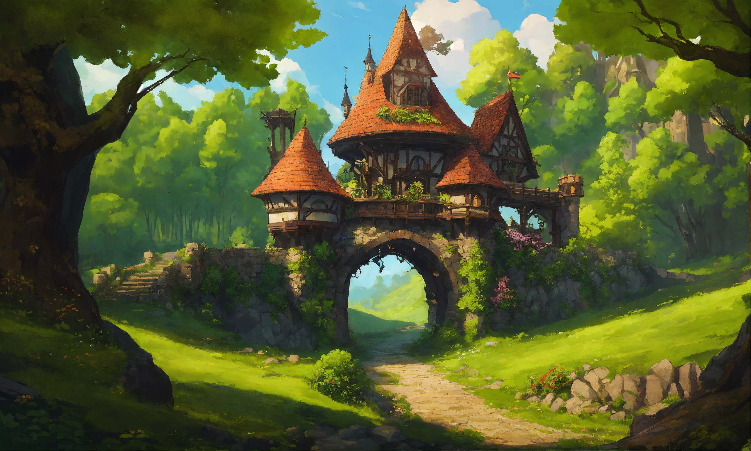 A castle surrounded by a wild forest, there is a village around it with dark wood tones and green roof, the castle entrance is made of two trees that collide at one point on the top of this arch