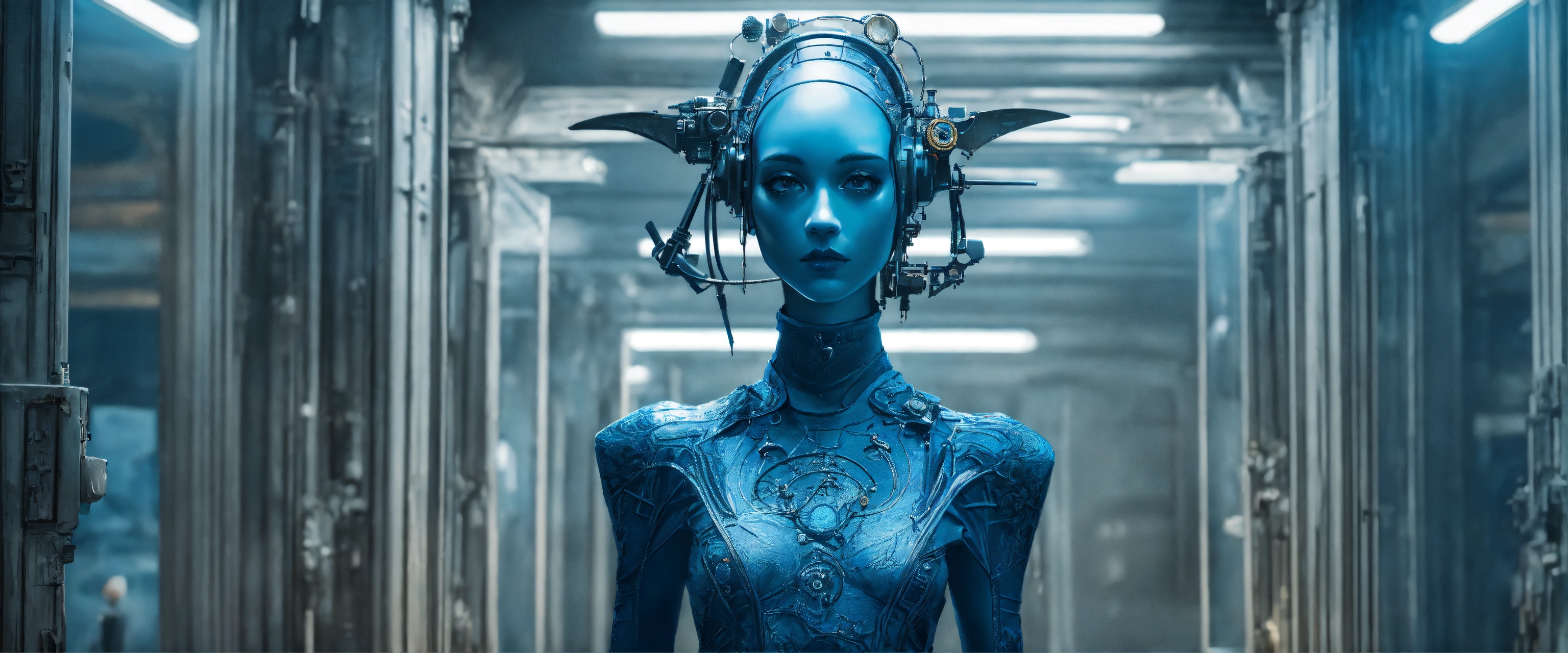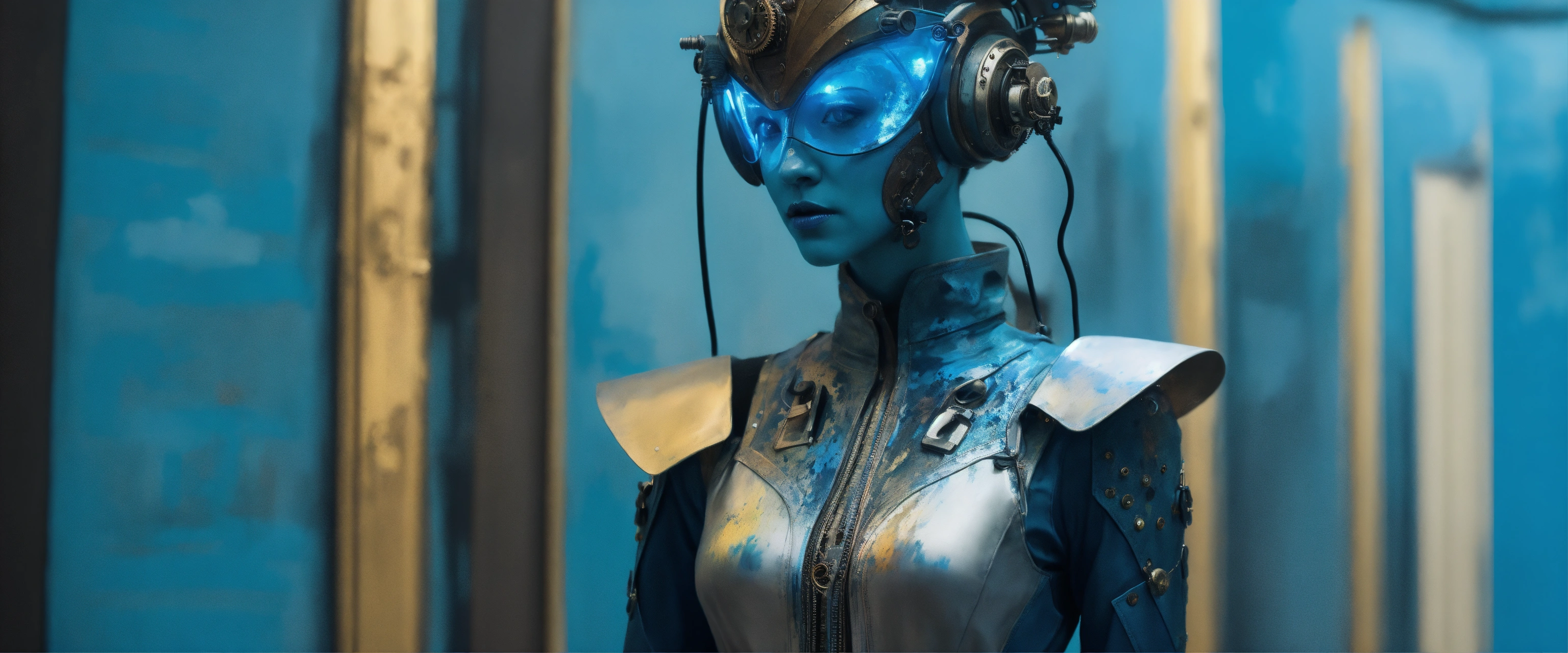 Photo realist 8k, ethereal minimalist alien race steampunk fashion photography painting, in the style of monochromatic blue, heavy use of palette knives, full body wide shot painting of teachment, intricate, sharp_focus, concept_art, simple white backround.