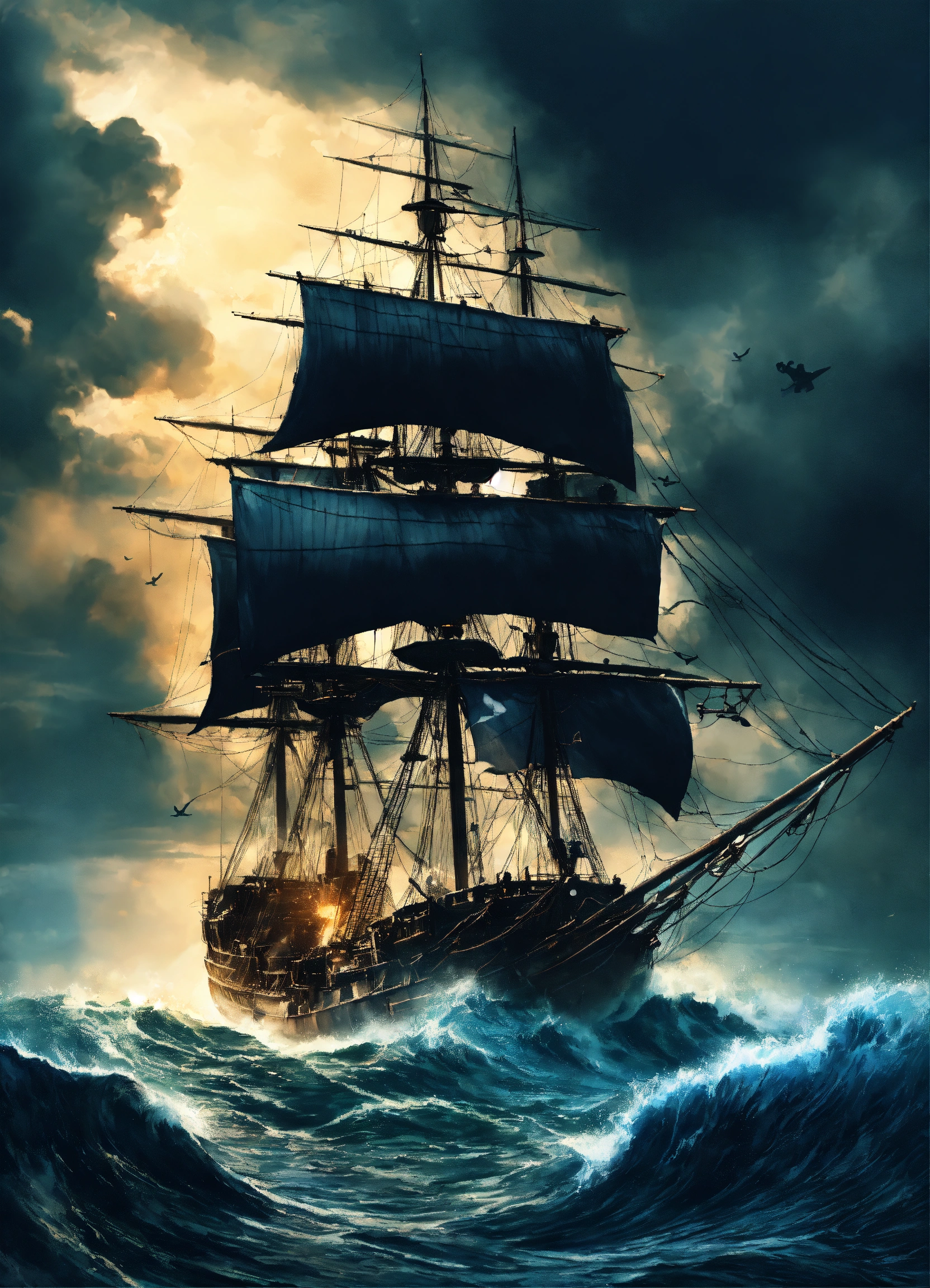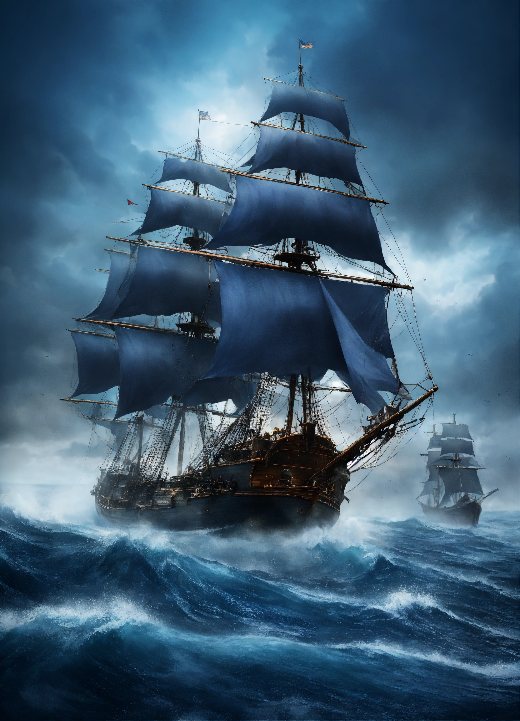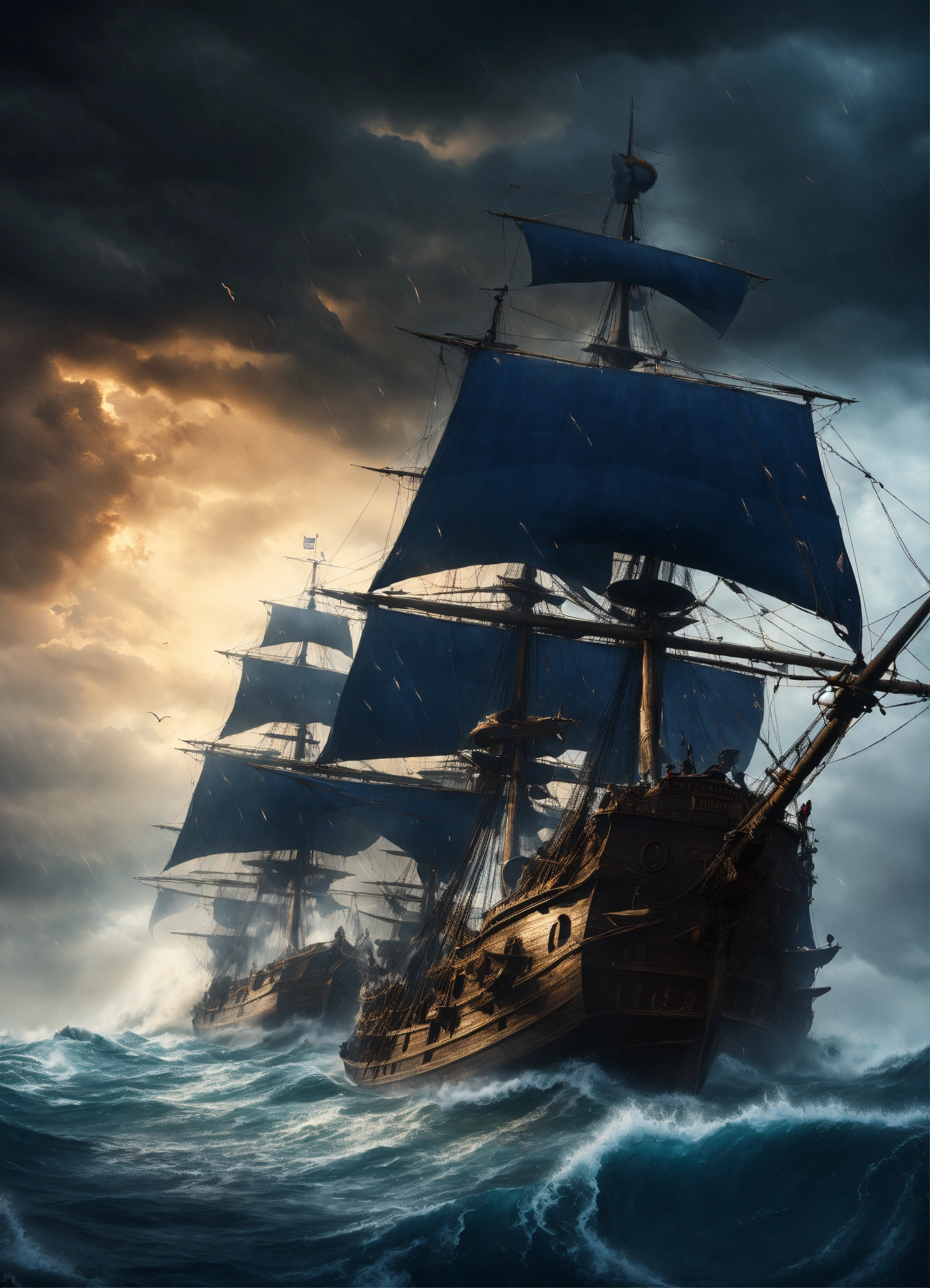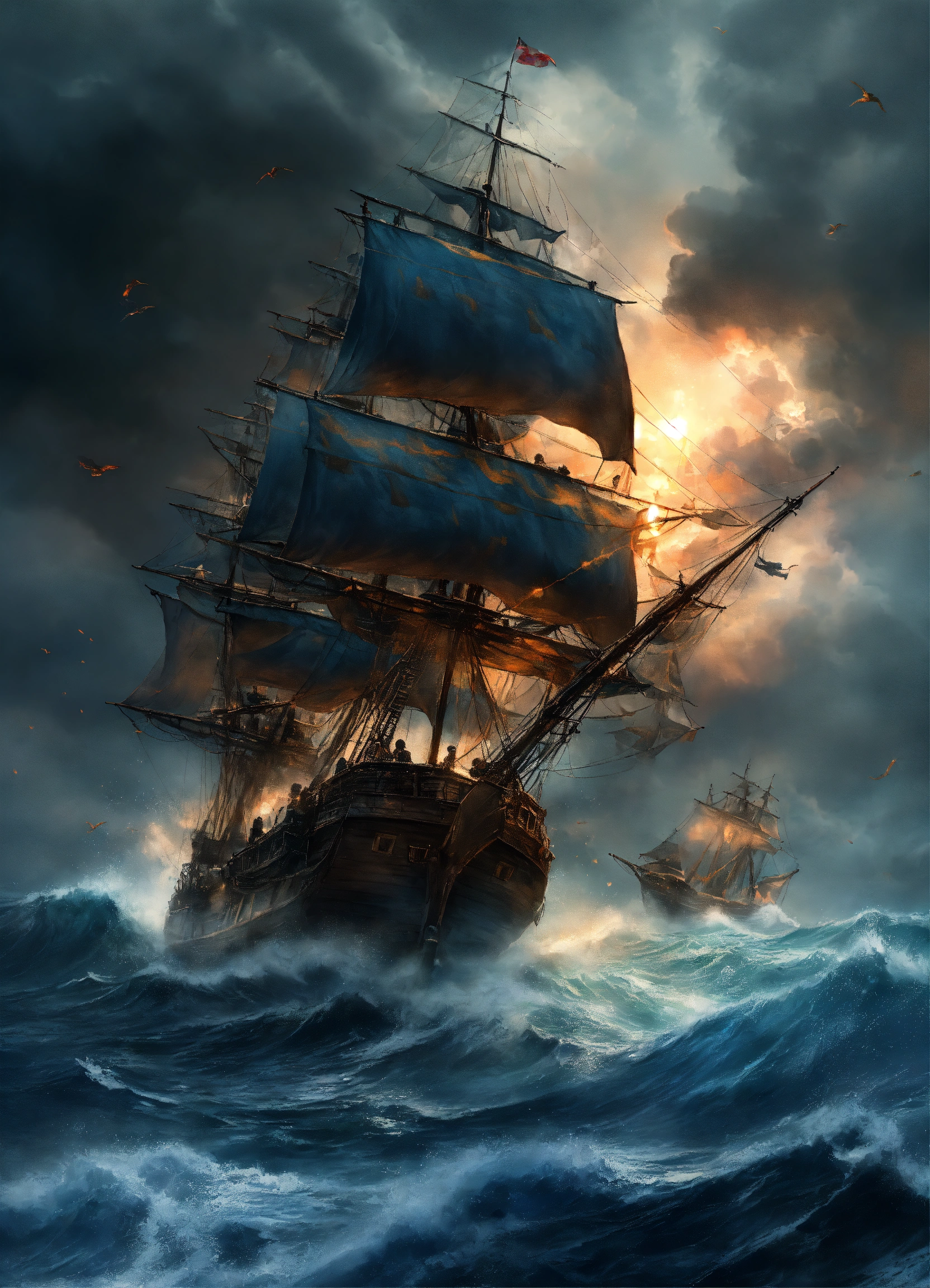 Very realistic two fighting pirateships in the war and they are fighting - dark color blue and storm and high waves