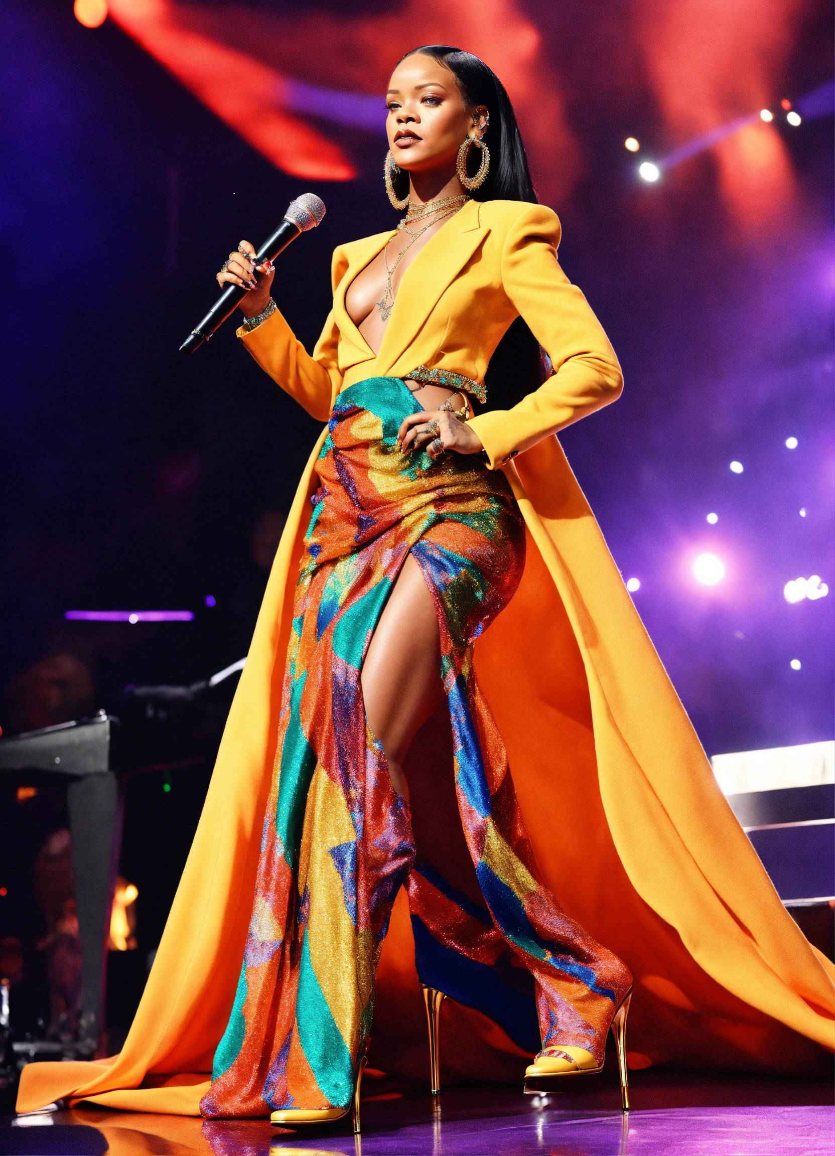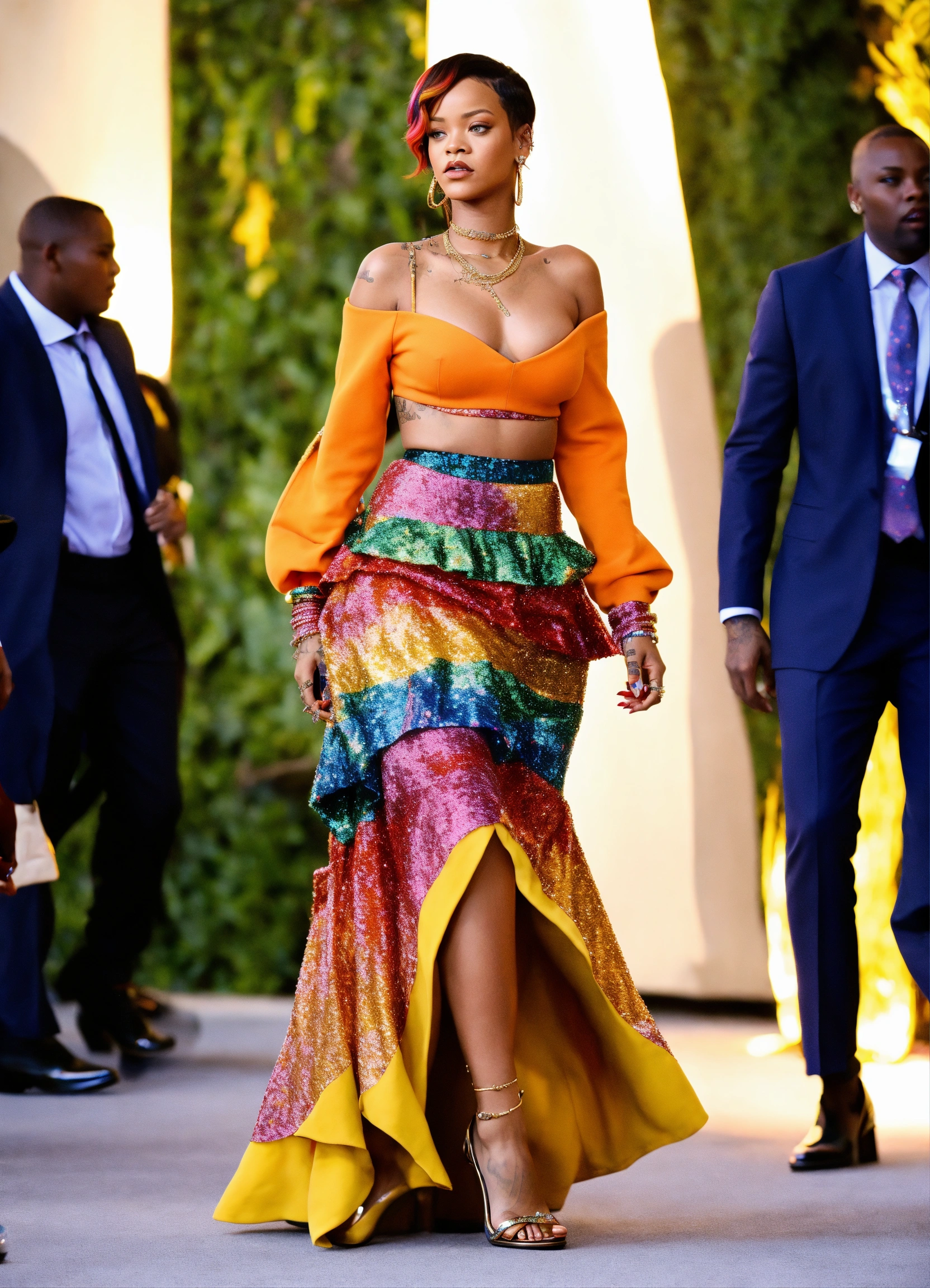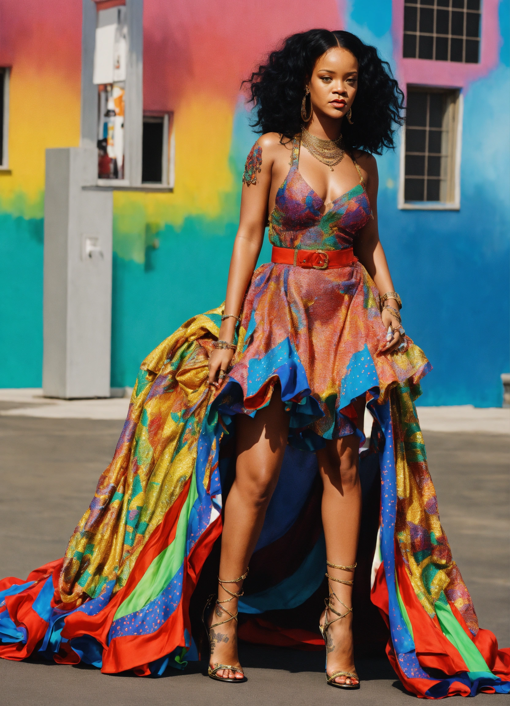 Rihanna sparkling colorful full outfit with high heels with medium african flowy skirt