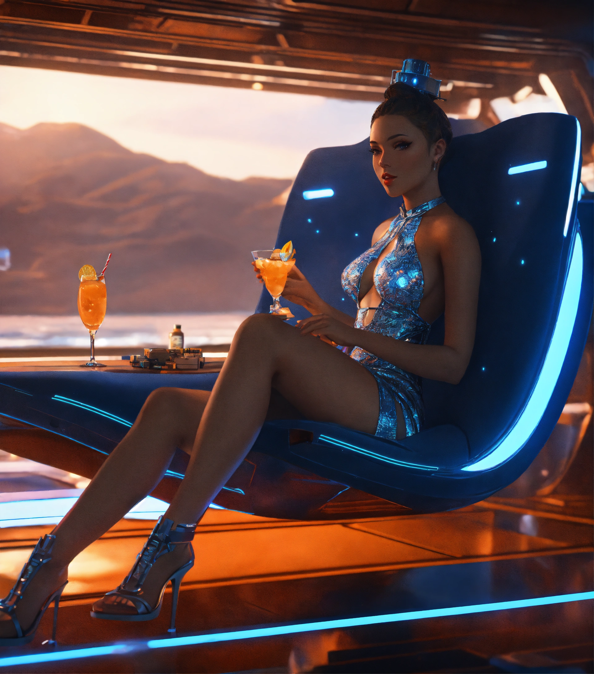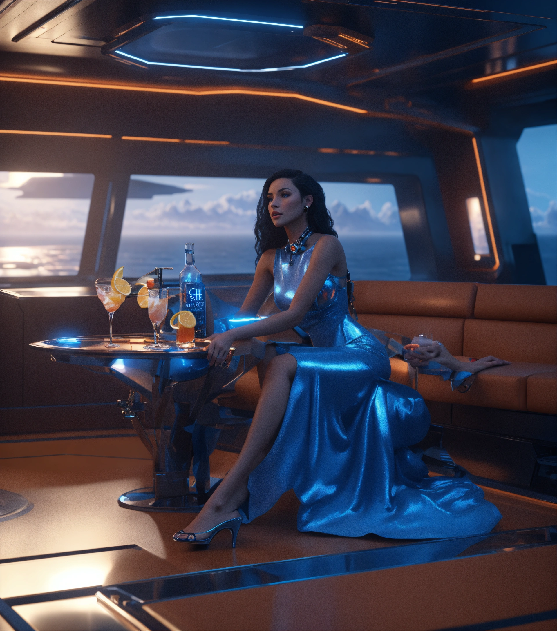 Zoom out full body of a beautiful blue skin babe lounging in dress with a drink on a hi tech space yacht, realistic, futuristic, sci-fi, 8k, unreal engine