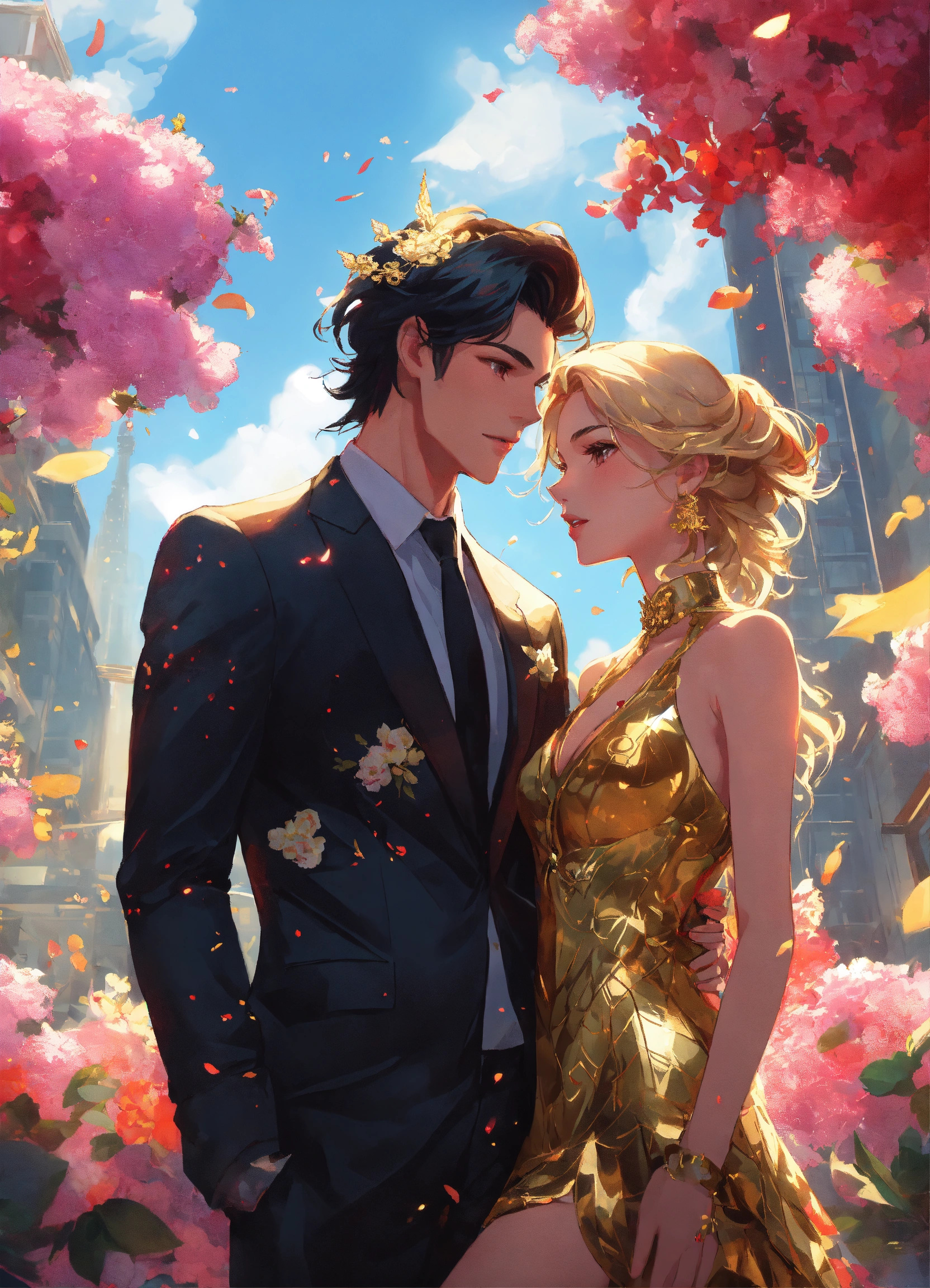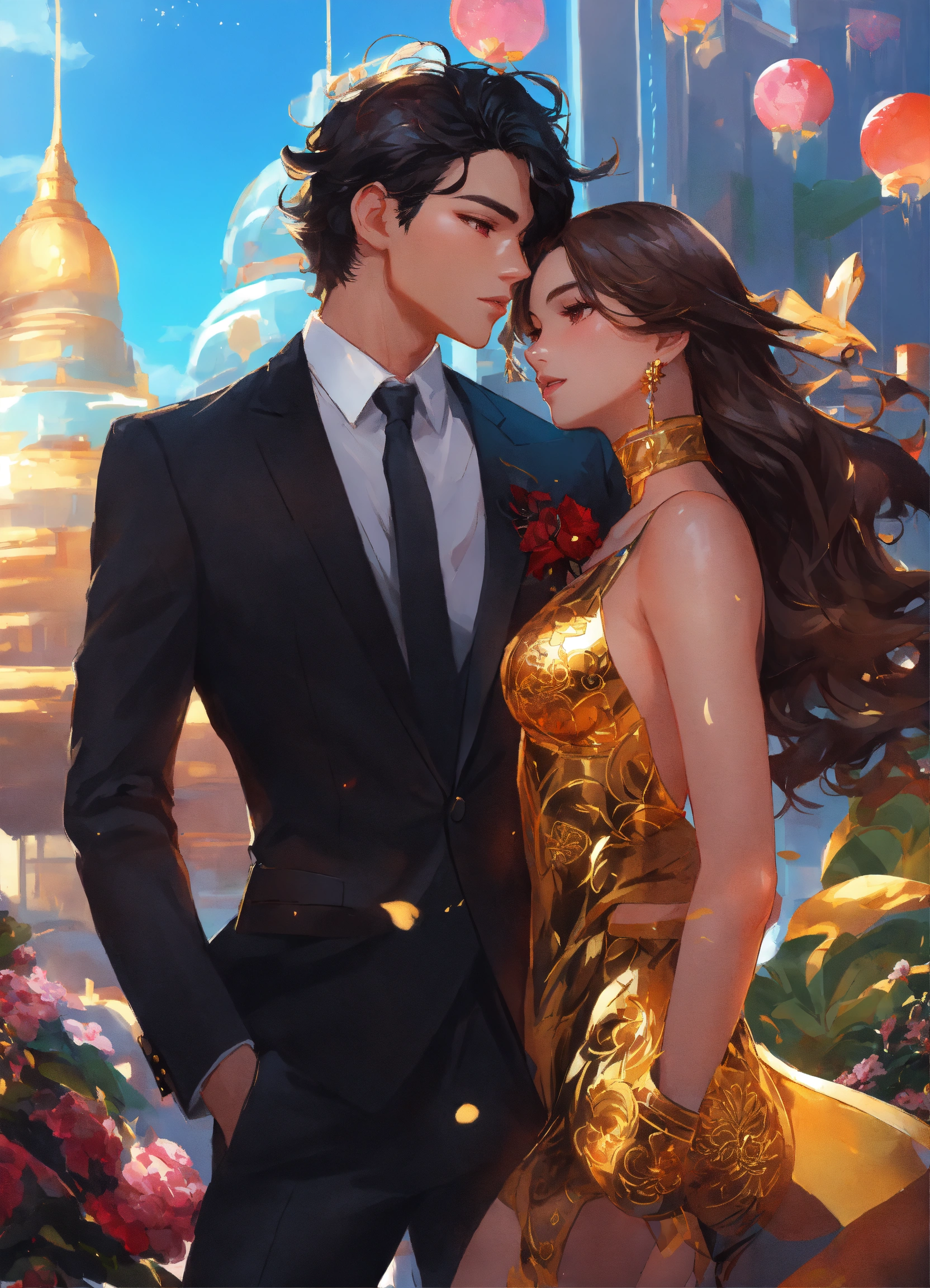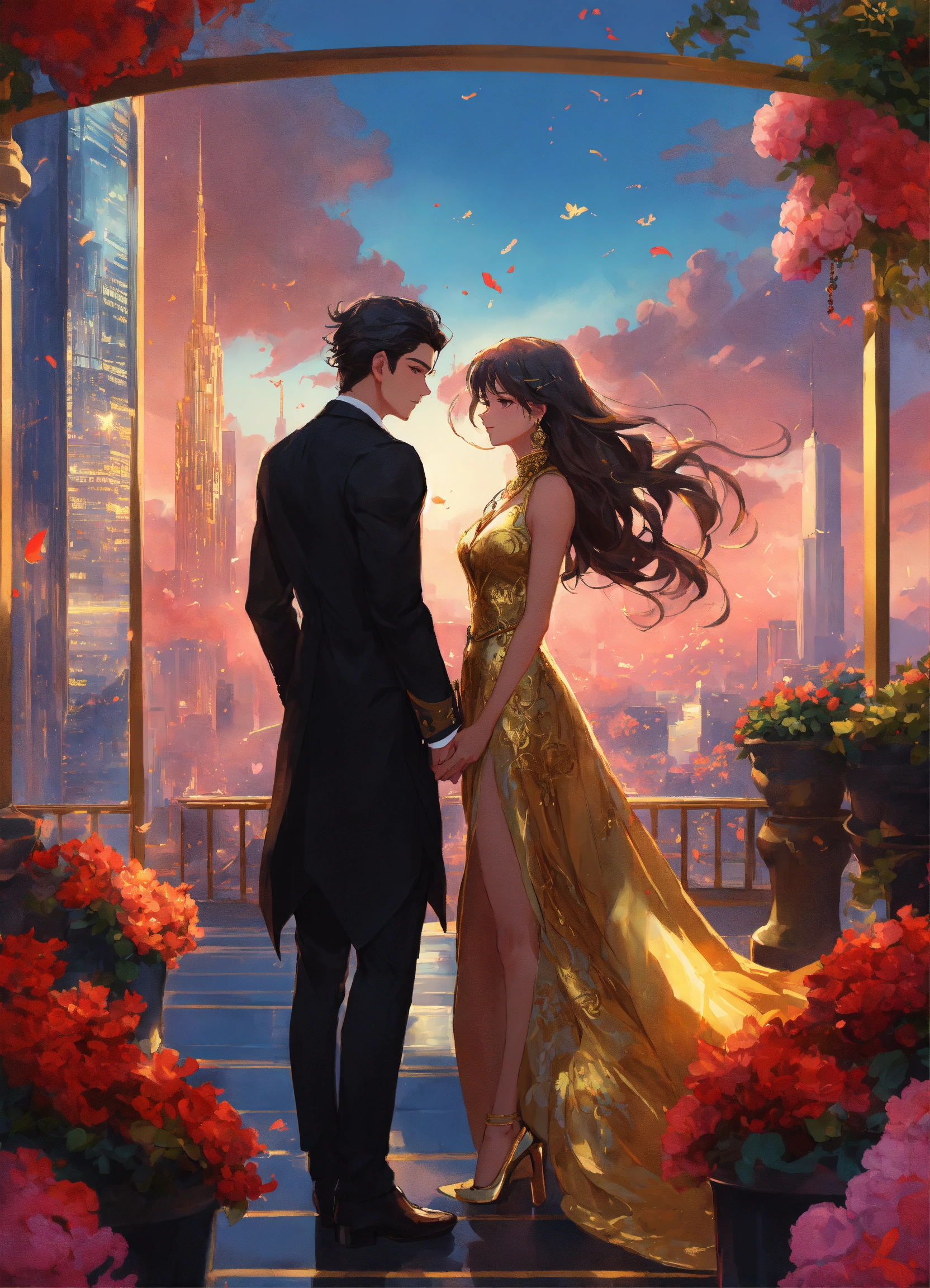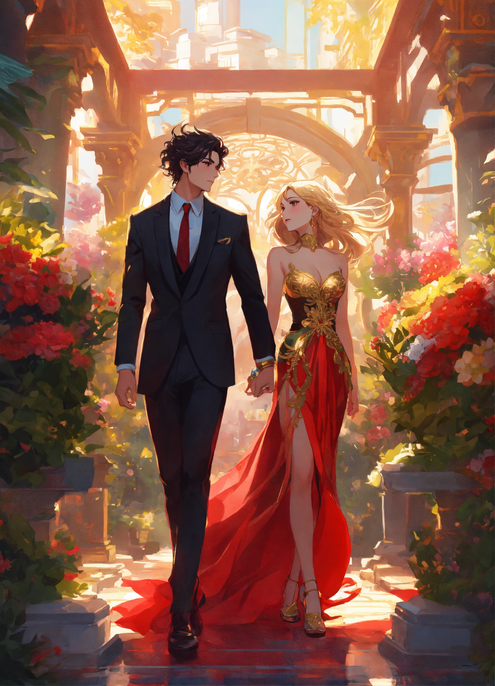 Illustration of beautiful city of towering skyscrapers, islands, vibrant colors, fair skin, the young man wears a intricate black suit with gold ornaments, has wavy black tousled hair, the golden haired woman wears a red intricate dress with gold adornments that shows legs, maximalist, 8k photo, animestyle, by artgerm, by rossdraws, trending on artstation, garden, windy, flowers, circular perspective, romantic, facing each other