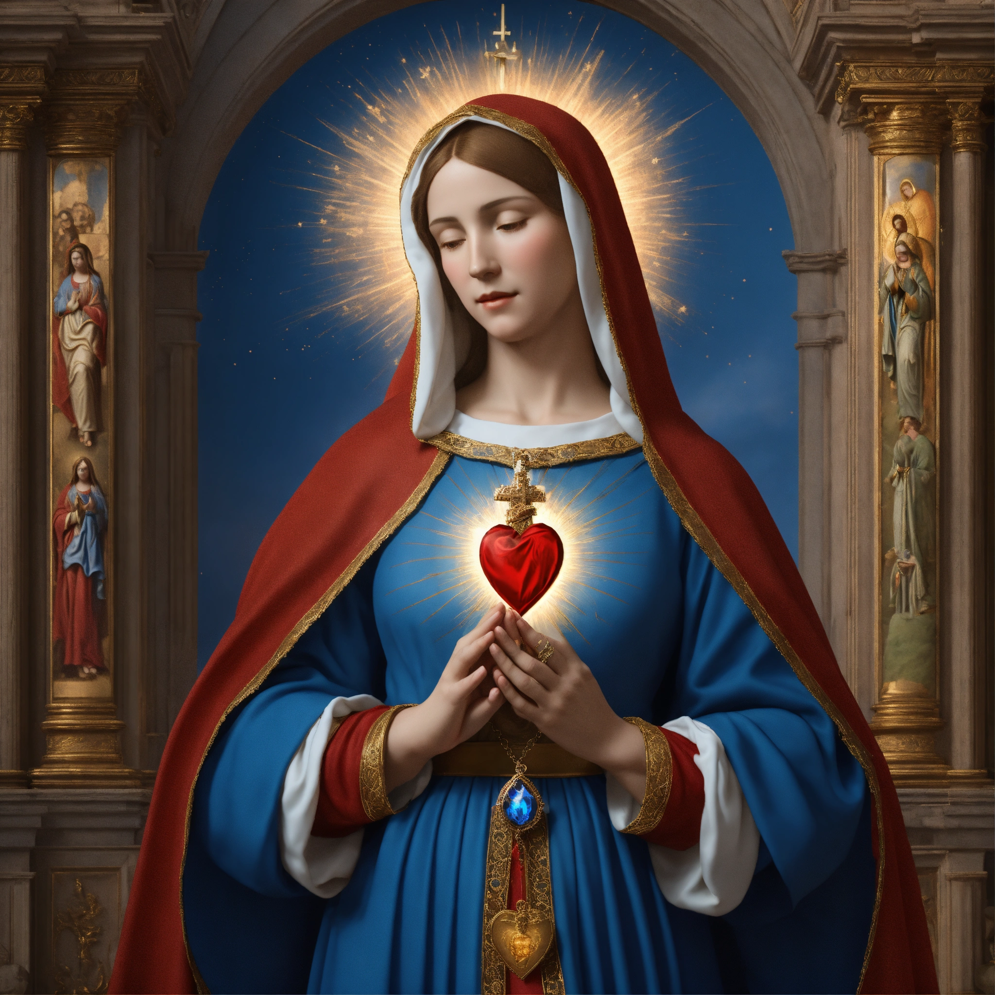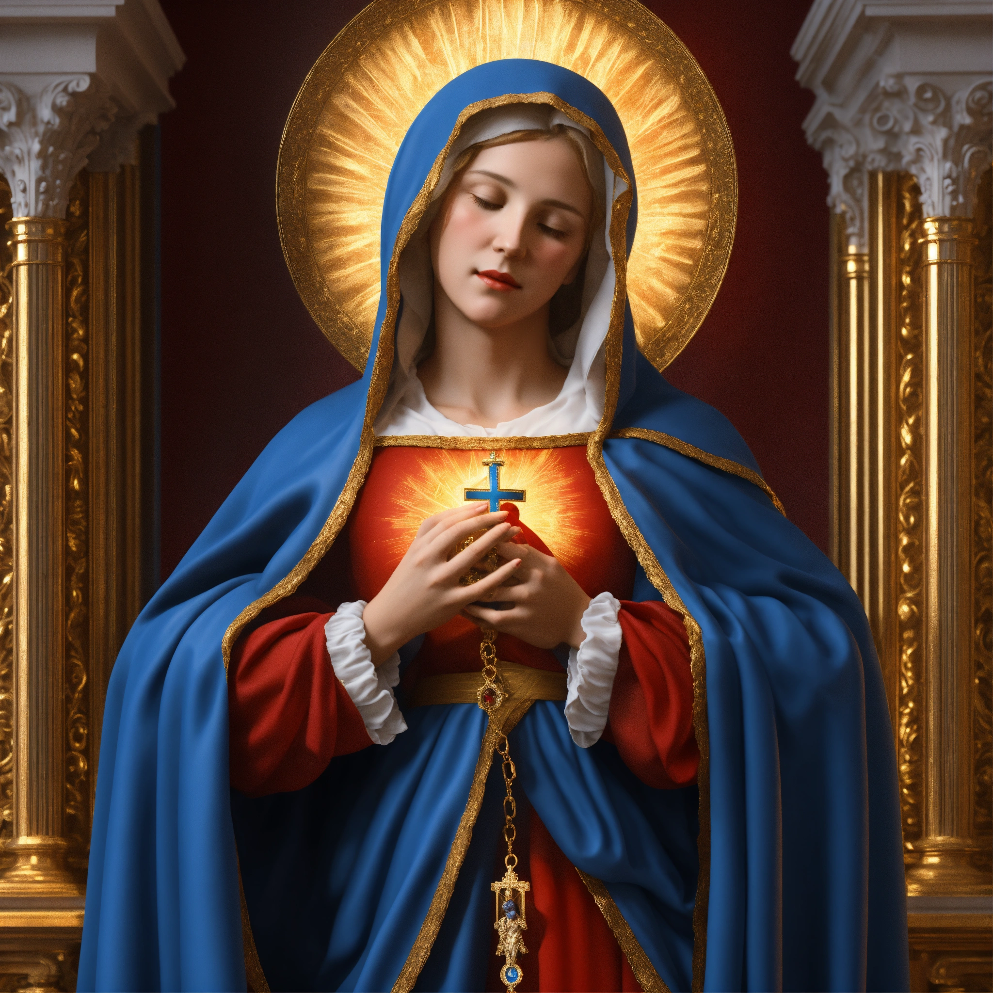 Full body catholic portrait of immaculate heart of mary mother in a red cape and blue robe praying with her hands together and holding a rosary, using leonardo ai image generation with the following settings dreamshaper v7, alchemy 3d render