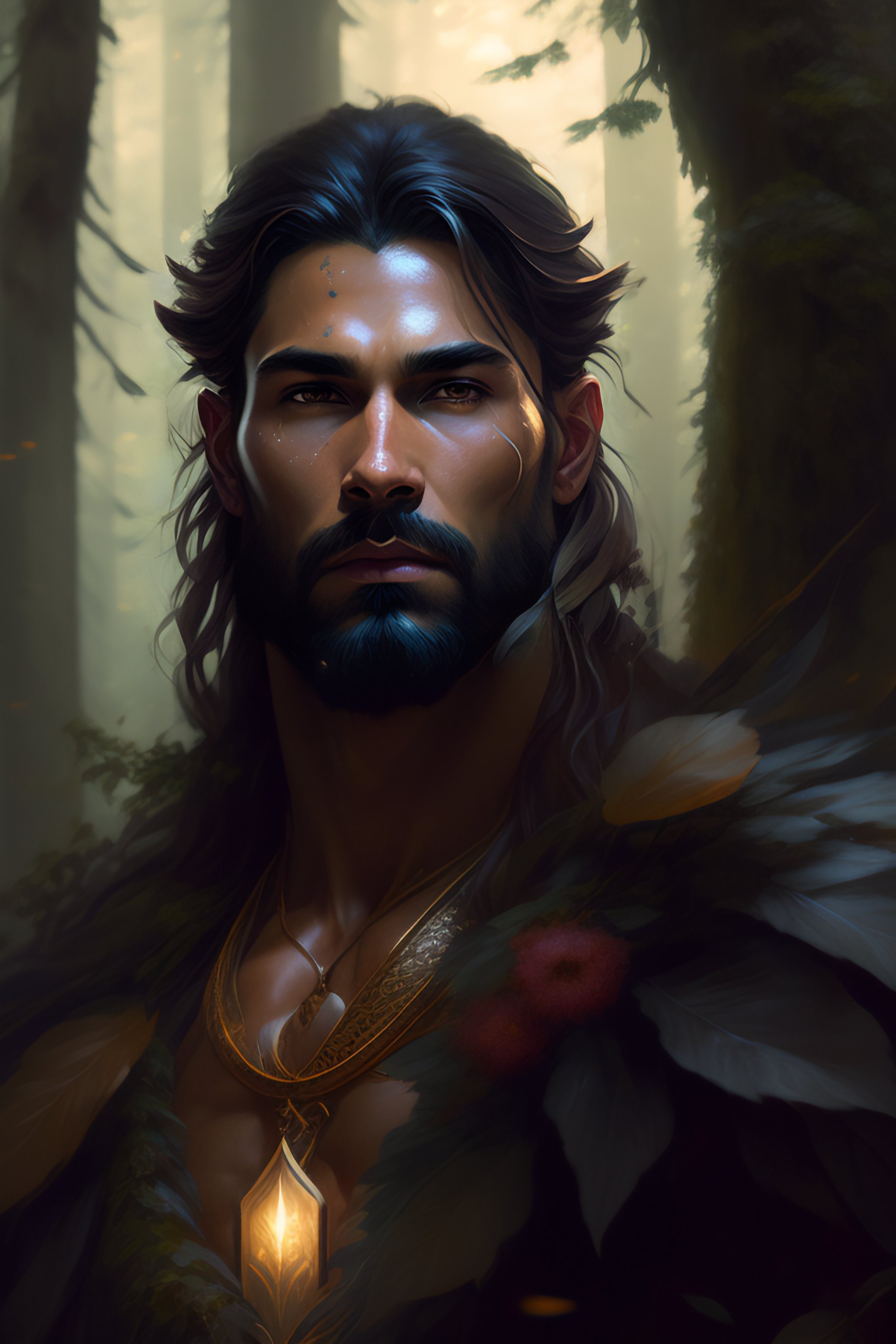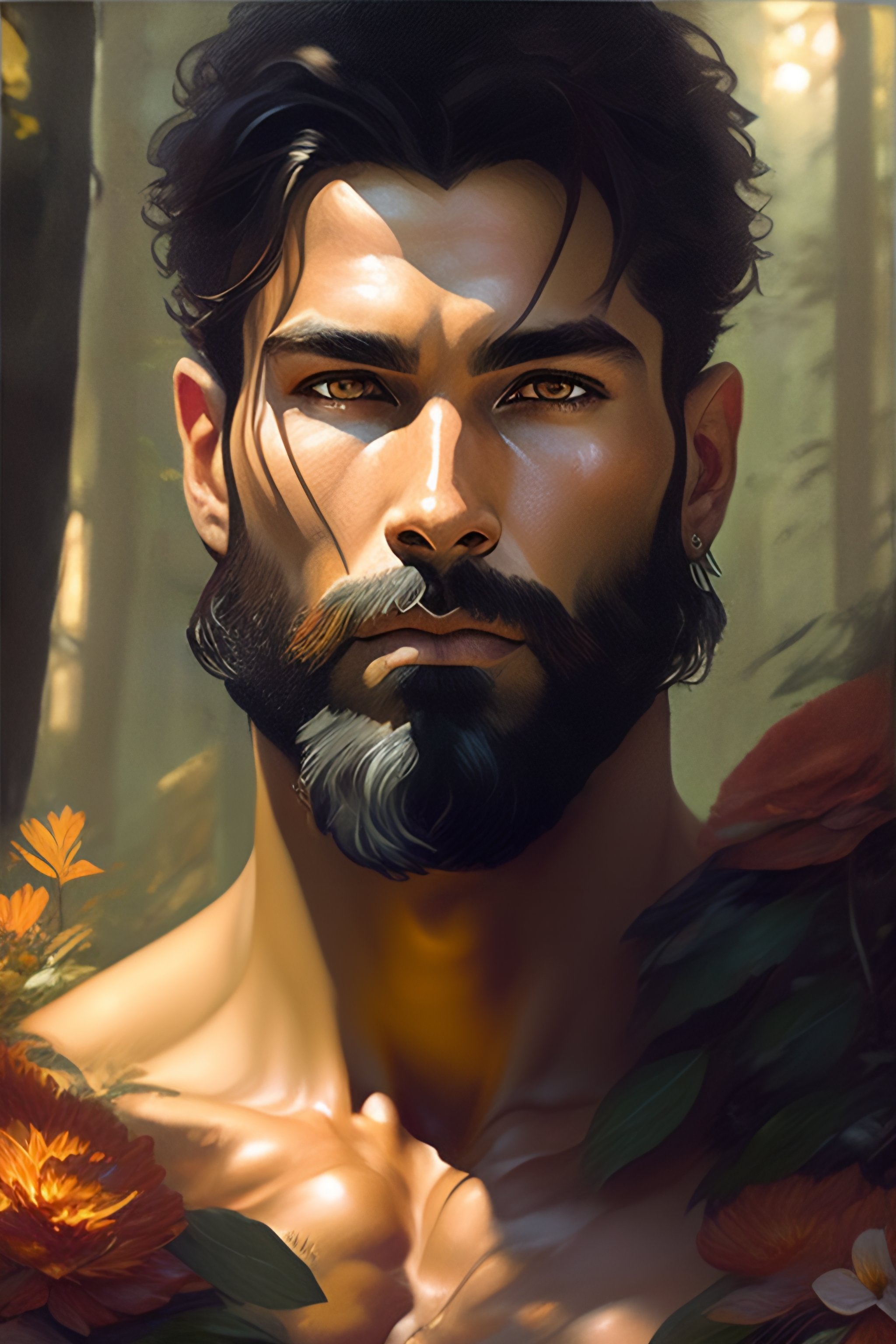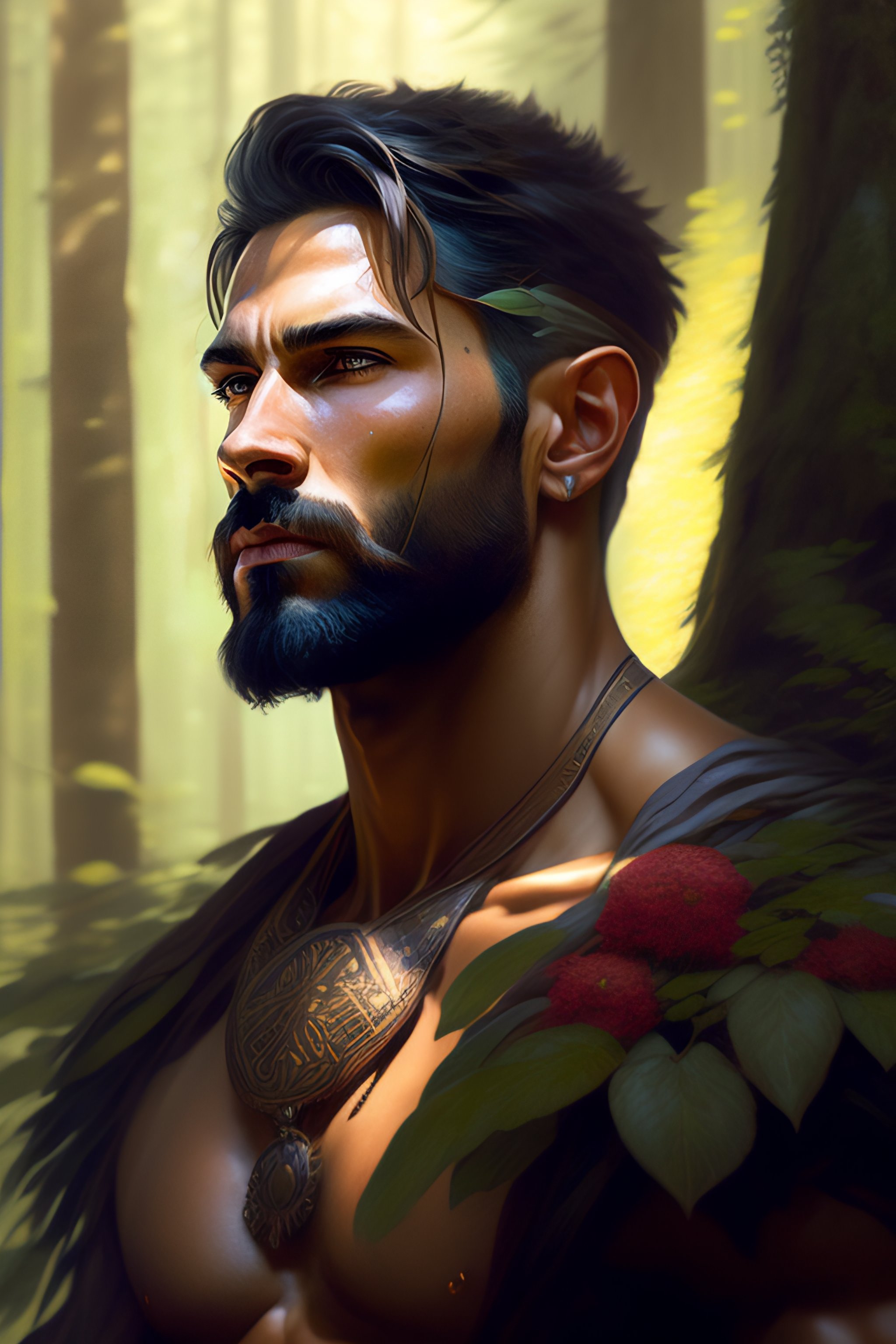 God of the forest, 3 0 years old, rugged, handsome, male, detailed face, clean lines, atmospheric lighting, amazing, full body, dviantart, flowers, muscular, intricate, highly detailed, digital painting, concept art, sharp focus, illustration, art by greg rutkowski and alphonse mucha