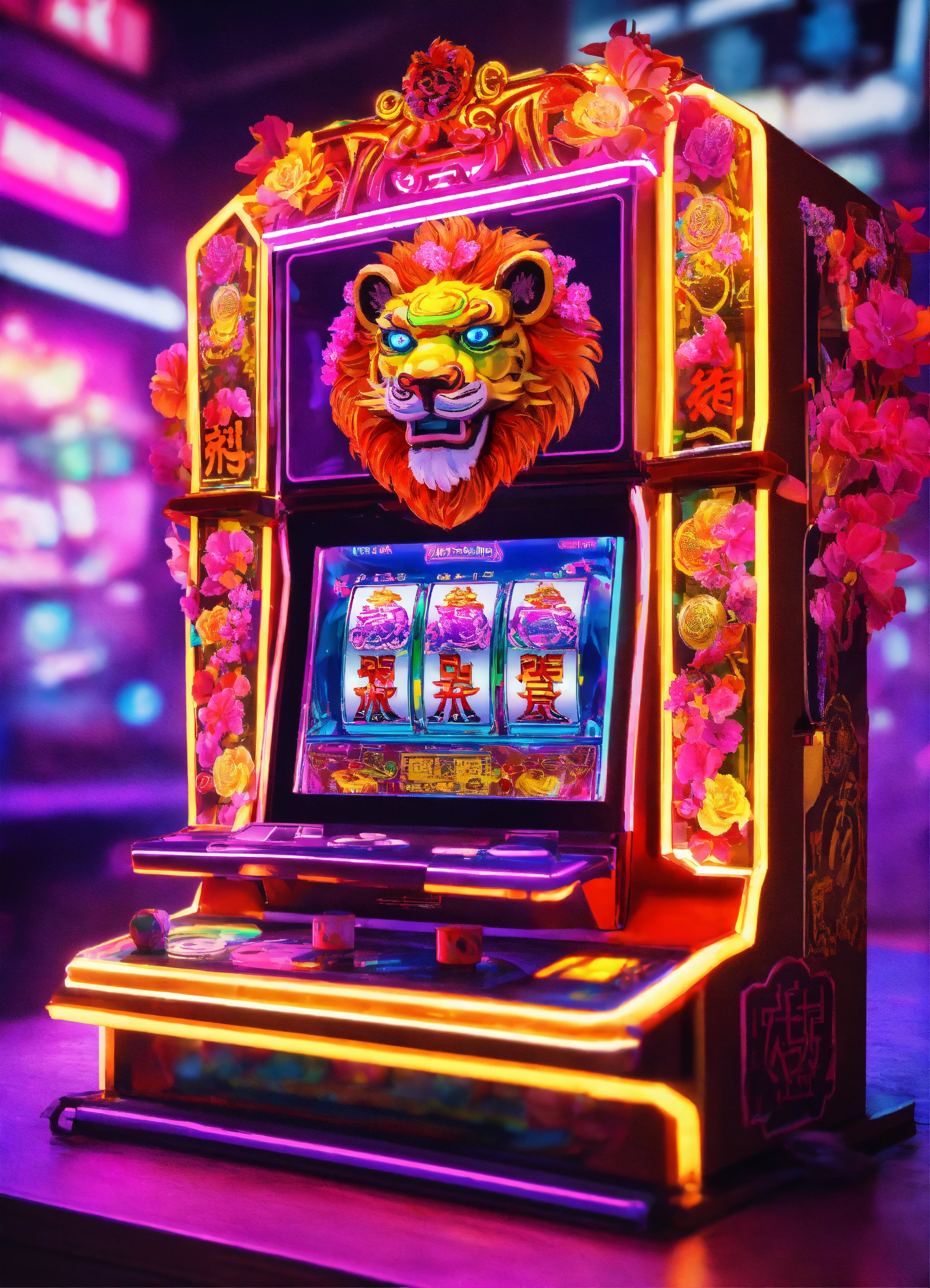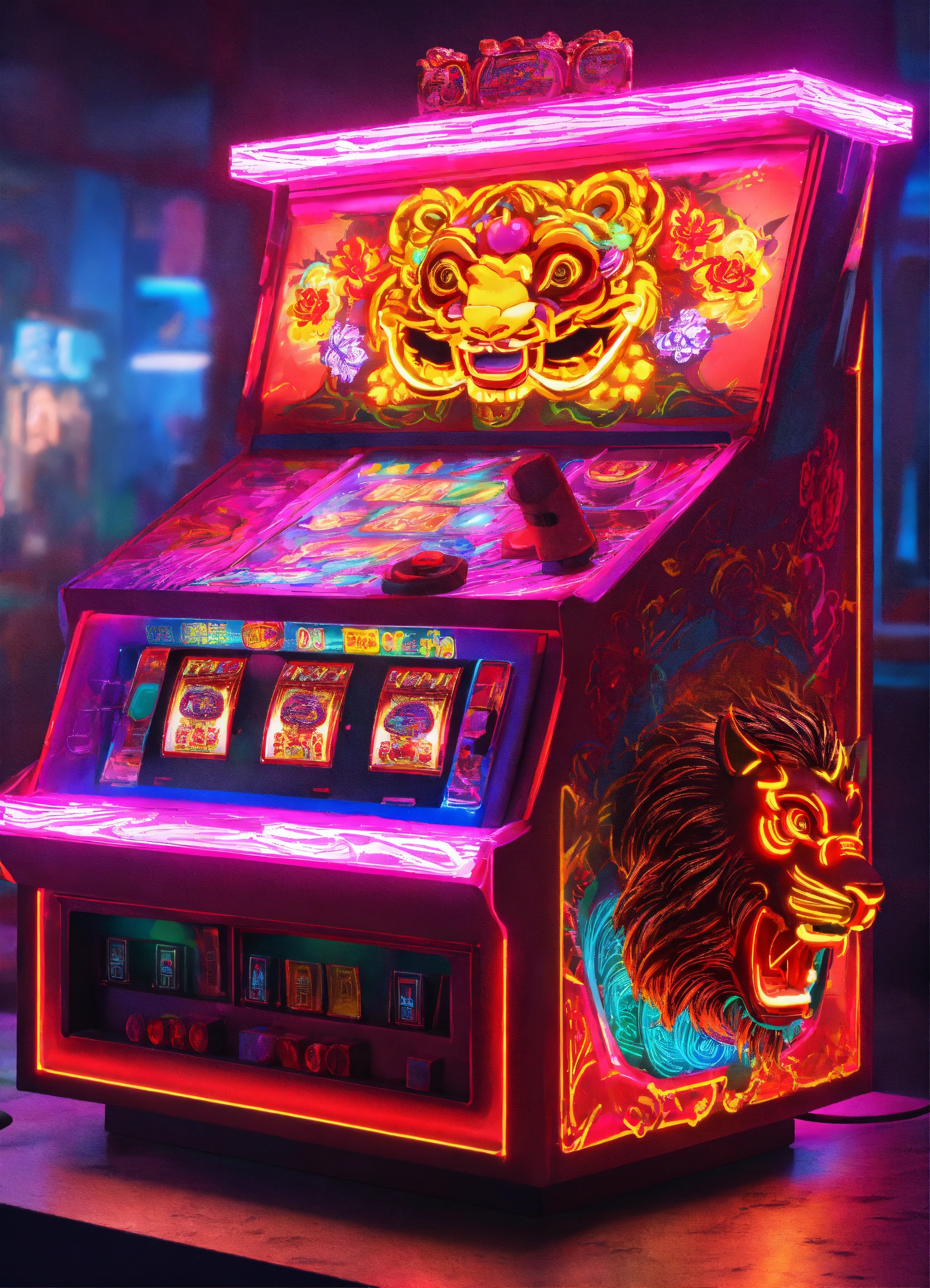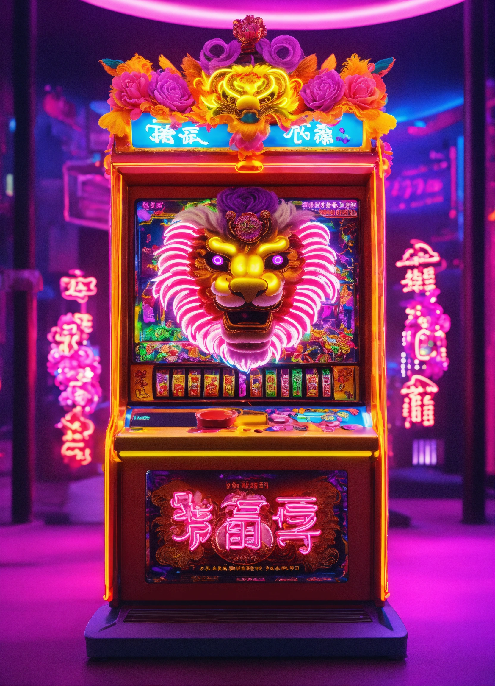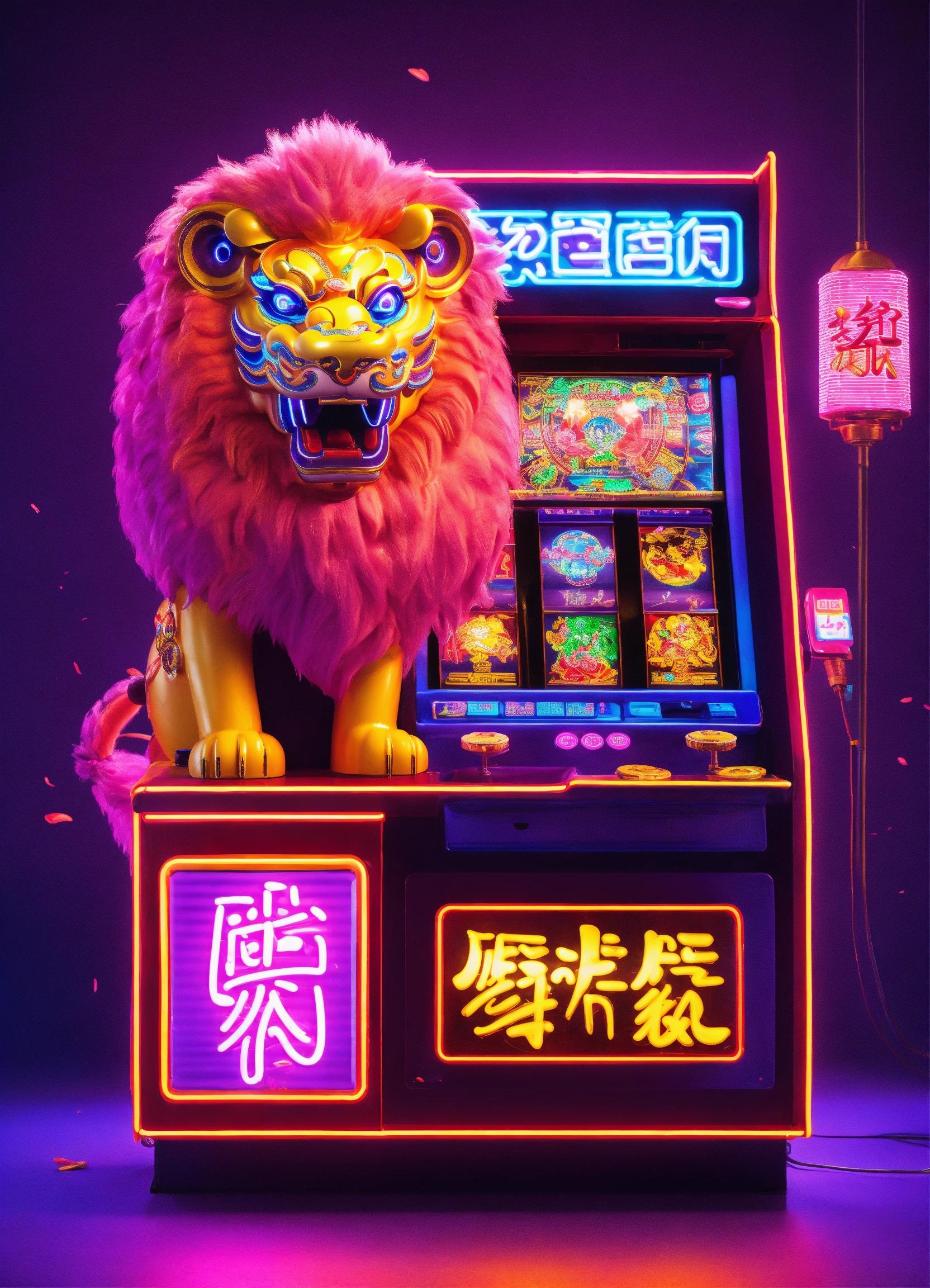 3d lion dance slot machine neon-filled with lavender cyberpunk