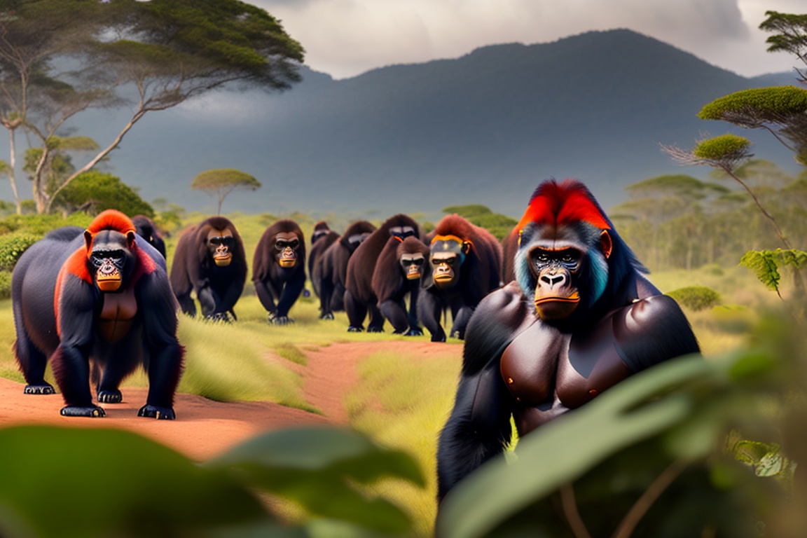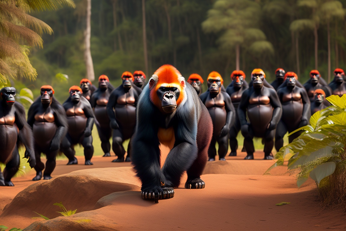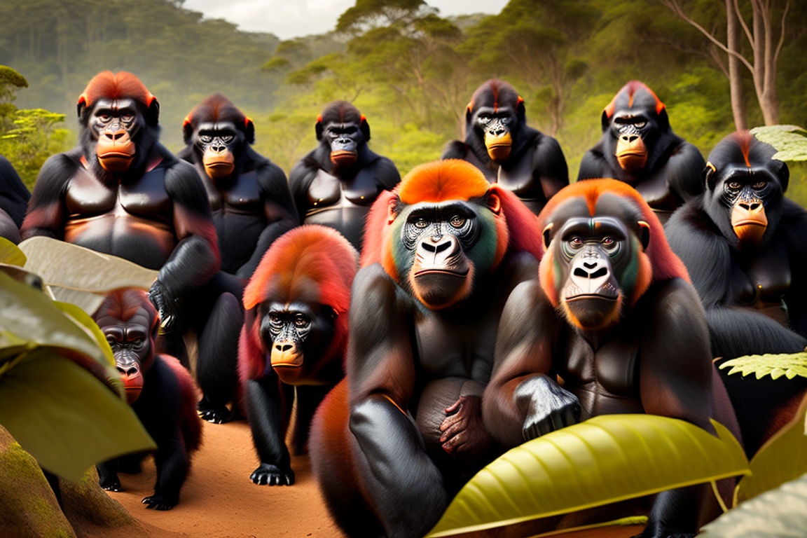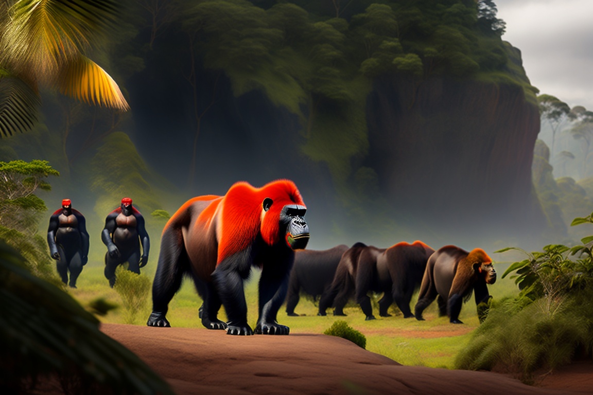 A group of 10 or more black gorillas with the amazon rainforest in the background, with one red-haired gorilla among the group, which has a slim body. the composition shows a view of it from far away.
