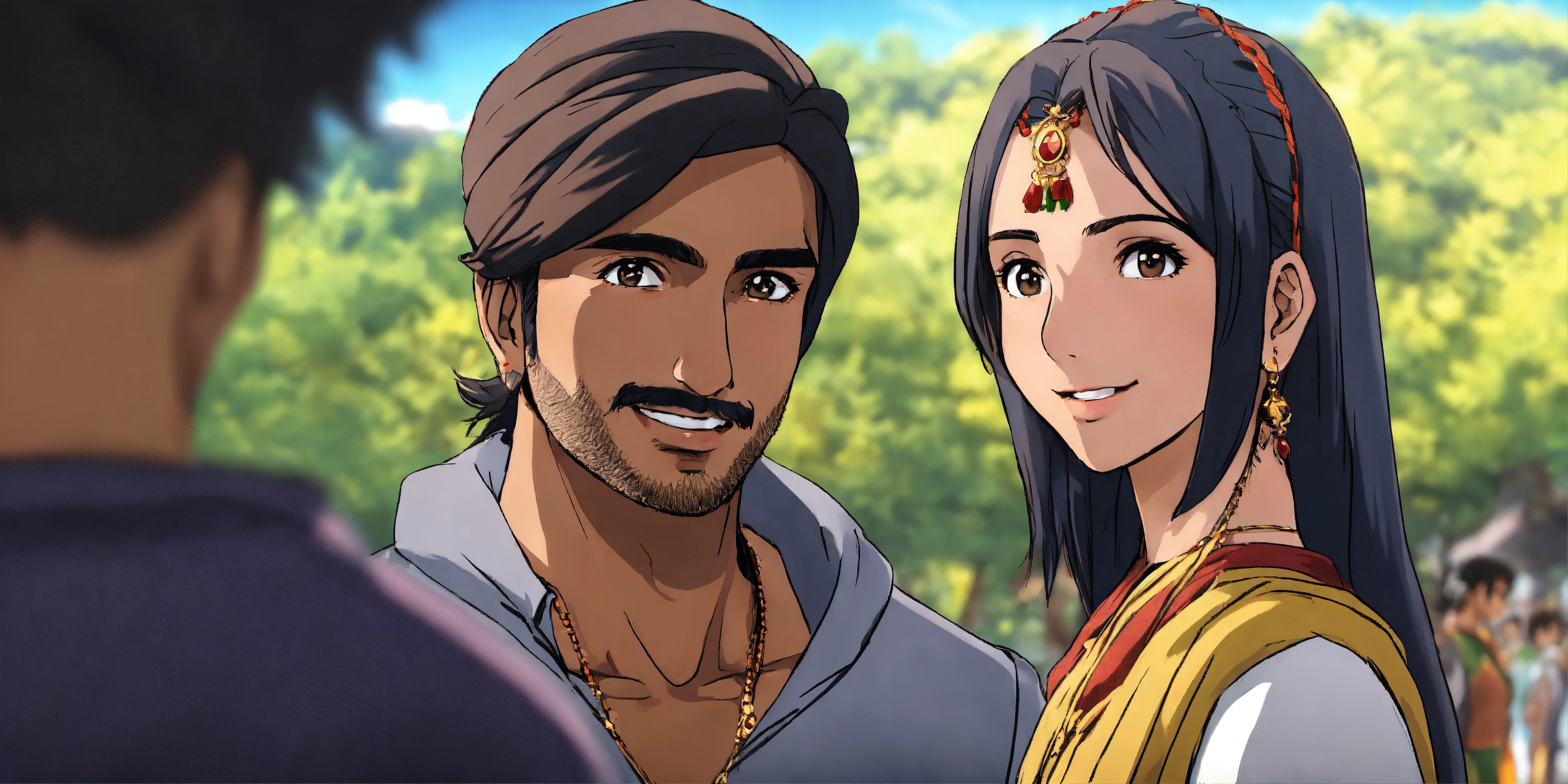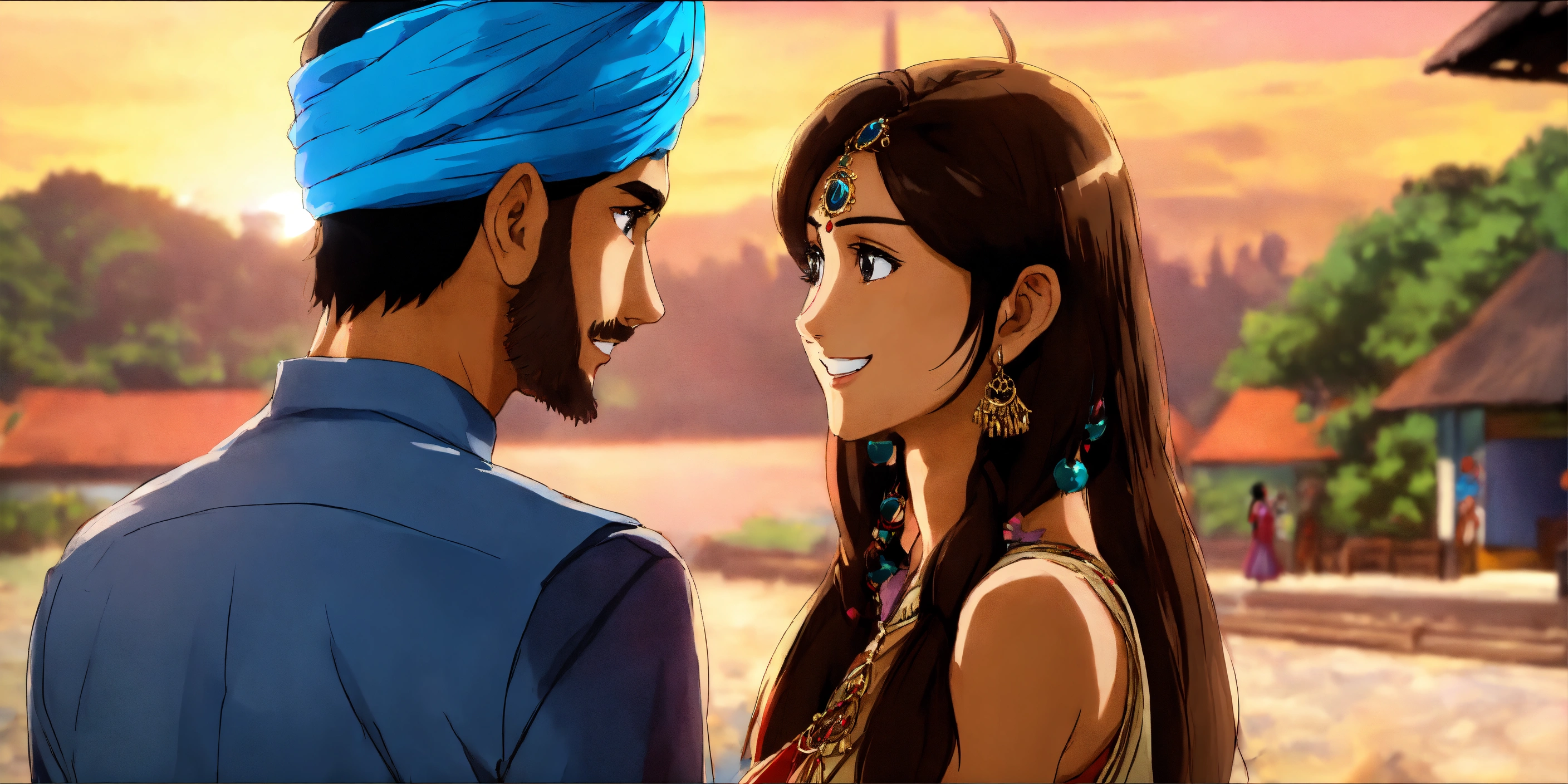 Indian turban guy looking at beautifull indian girl with smile on his face from far anime anime very realistic