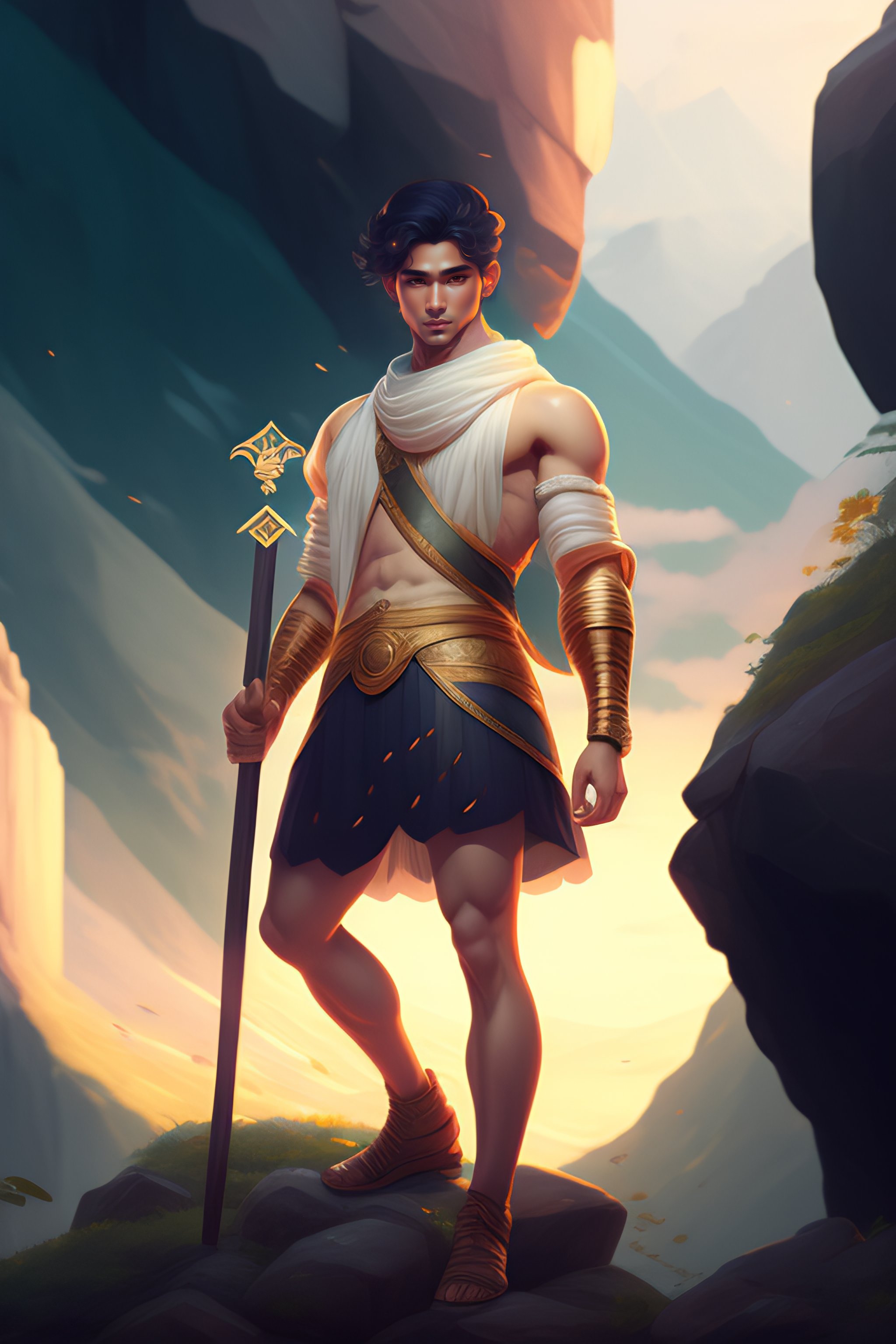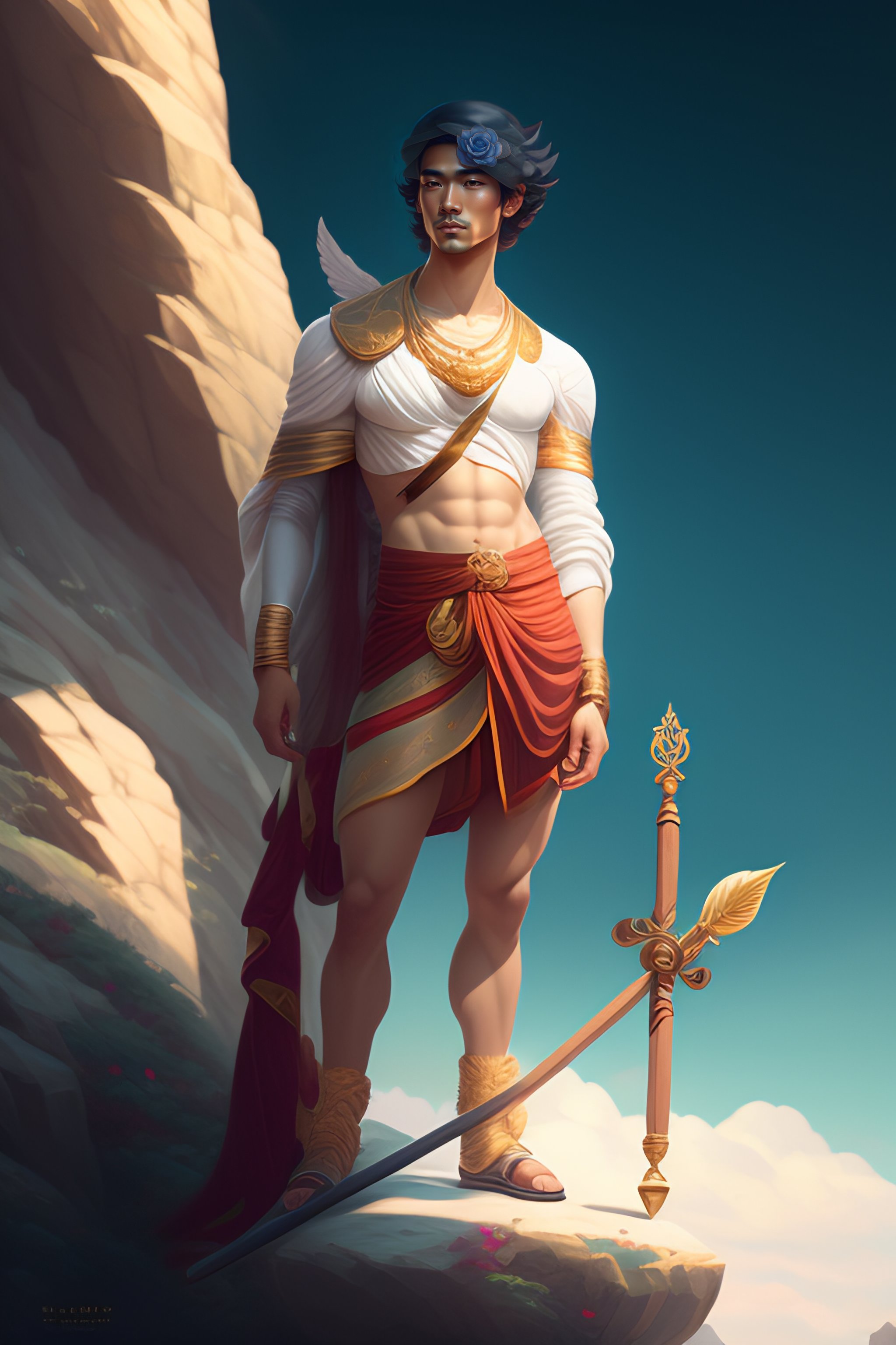 Young ancient greek man at the edg of a cliff holding a wooden stick in the right hand and a white rose on the left hand. art inspired by sachin teng and sam yang!! and artgerm!! and alphonse mucha, lois van baarle and ross tran!!. in the style of digital art, symmetry, hyper detailed. octane render. trending on artstation