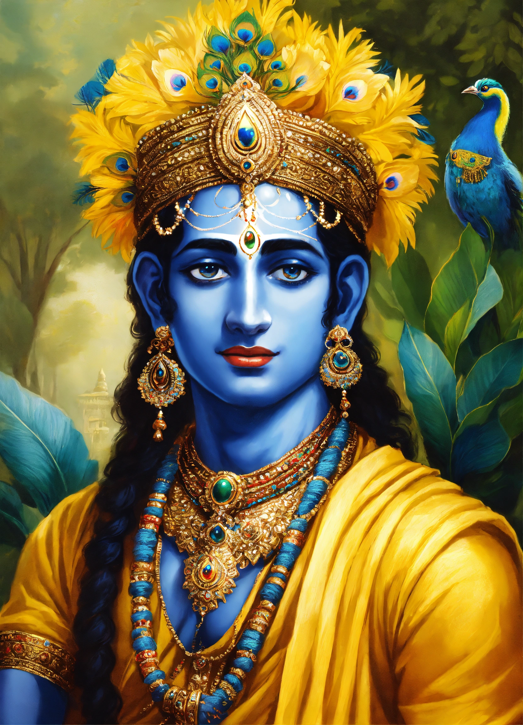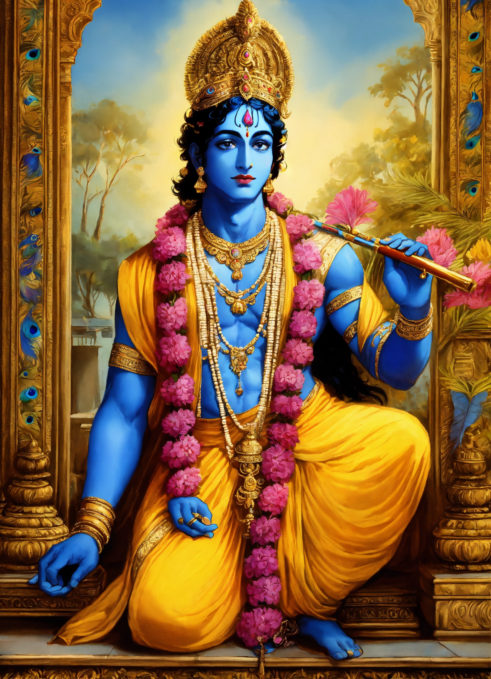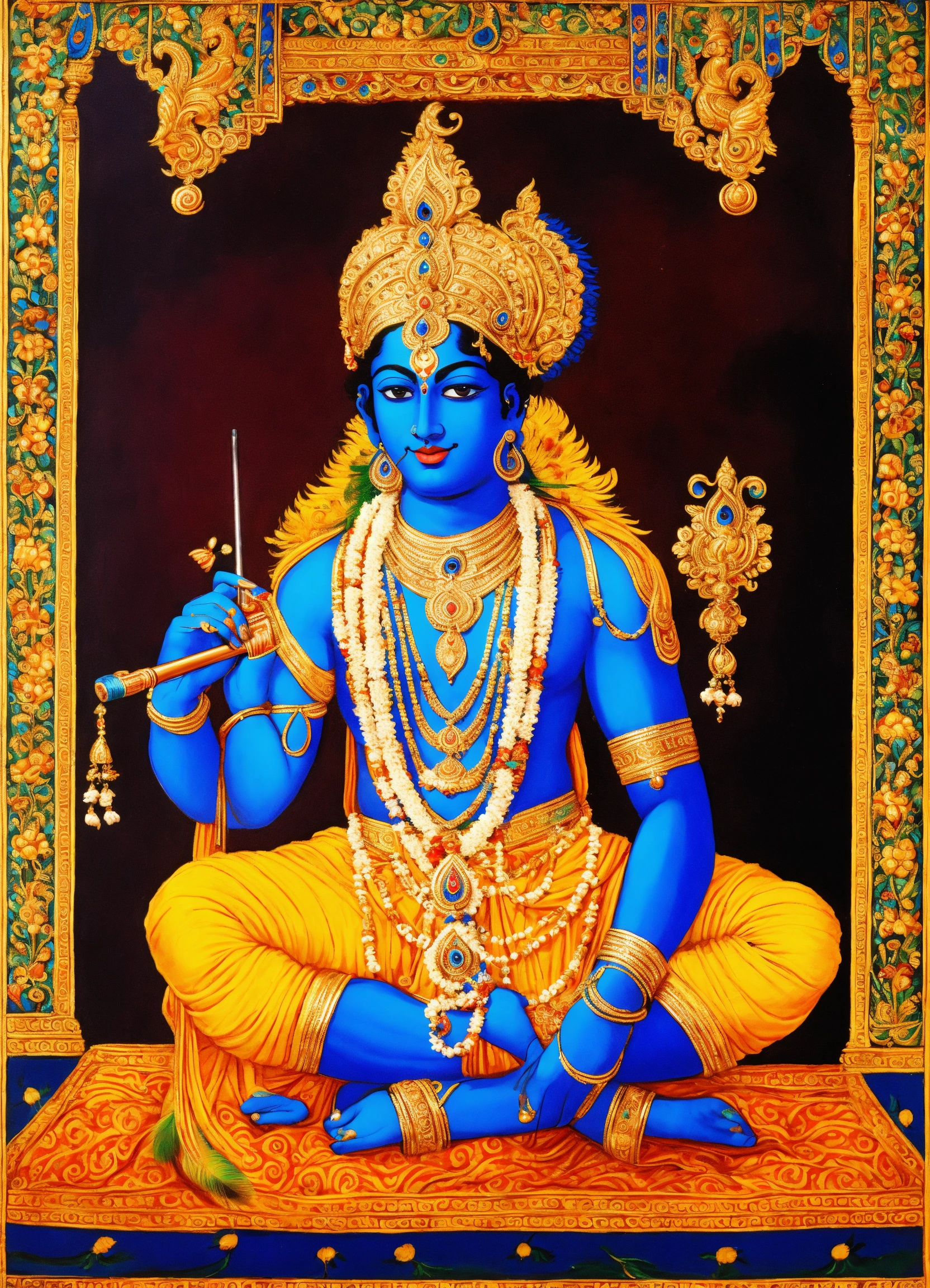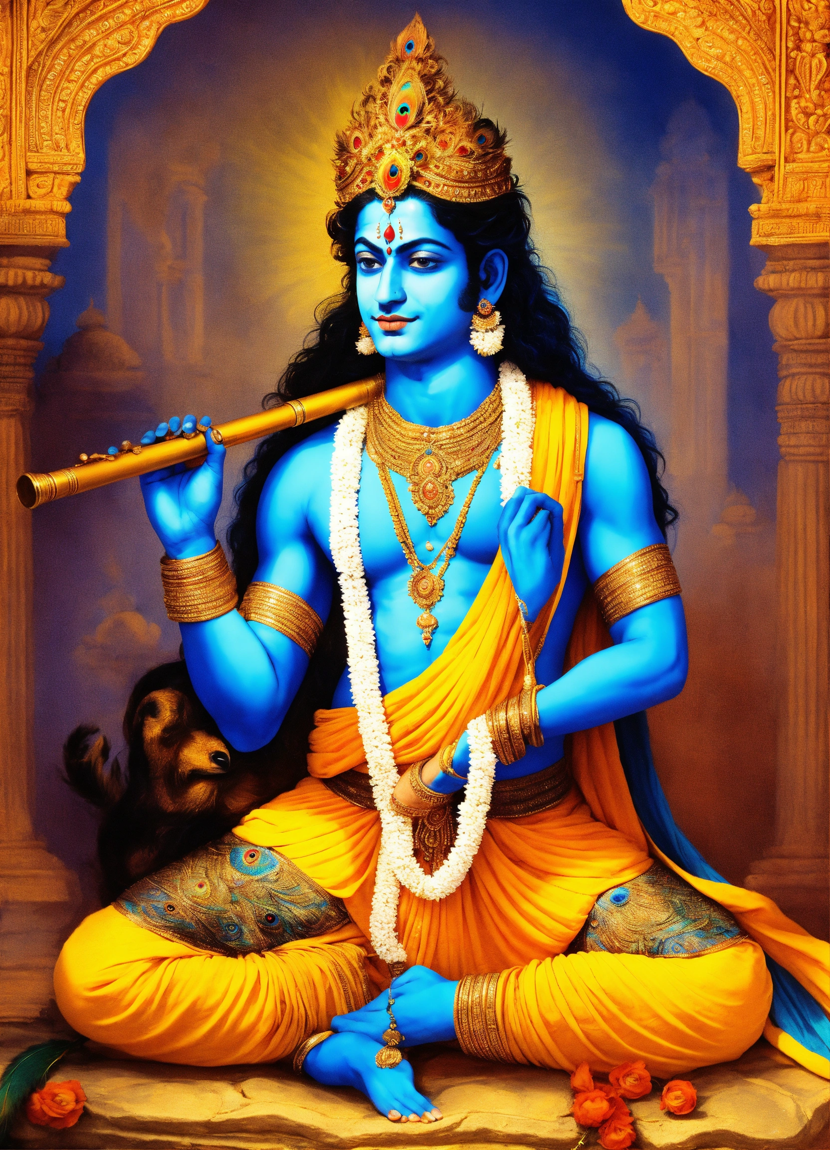 Krishna is traditionally depicted with blue skin, symbolizing his divine nature. his attire often includes a peacock feather crown, yellow dhoti, and a flute.