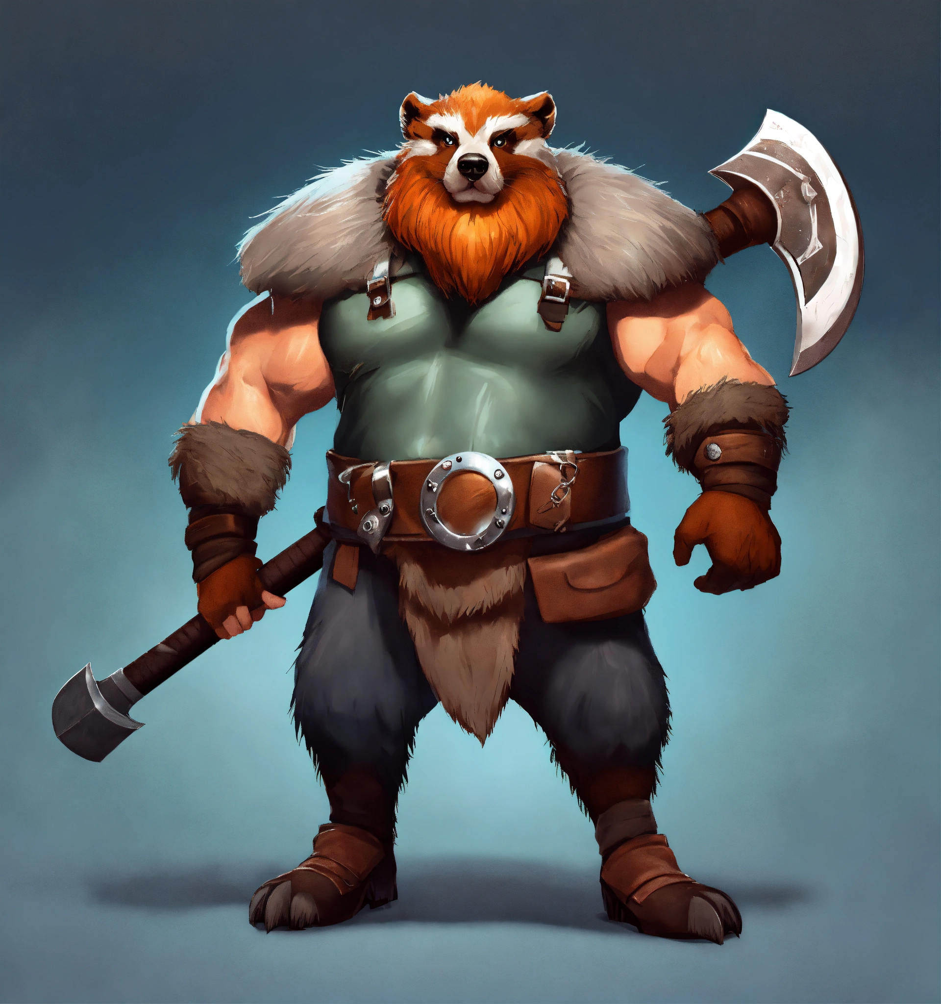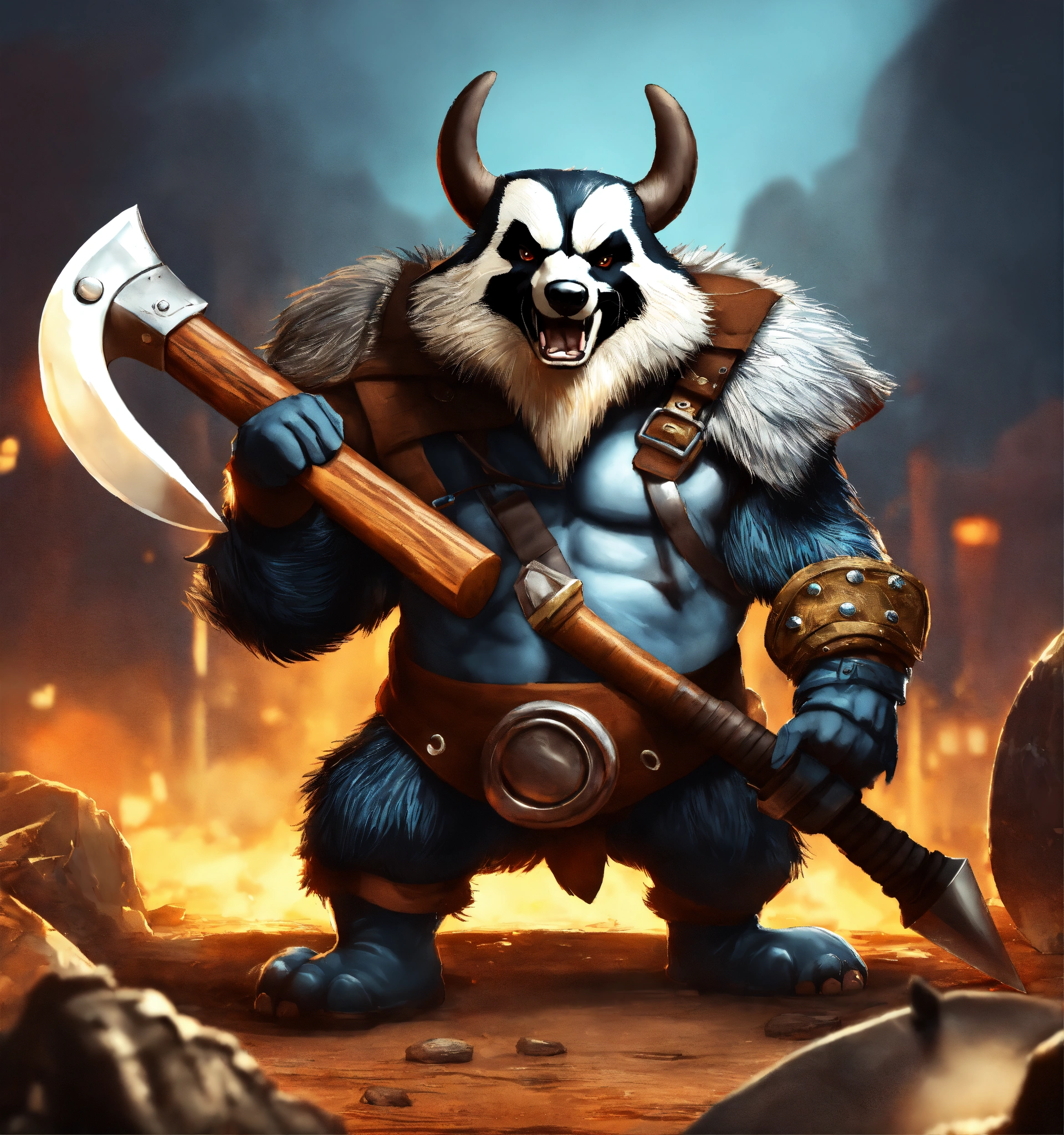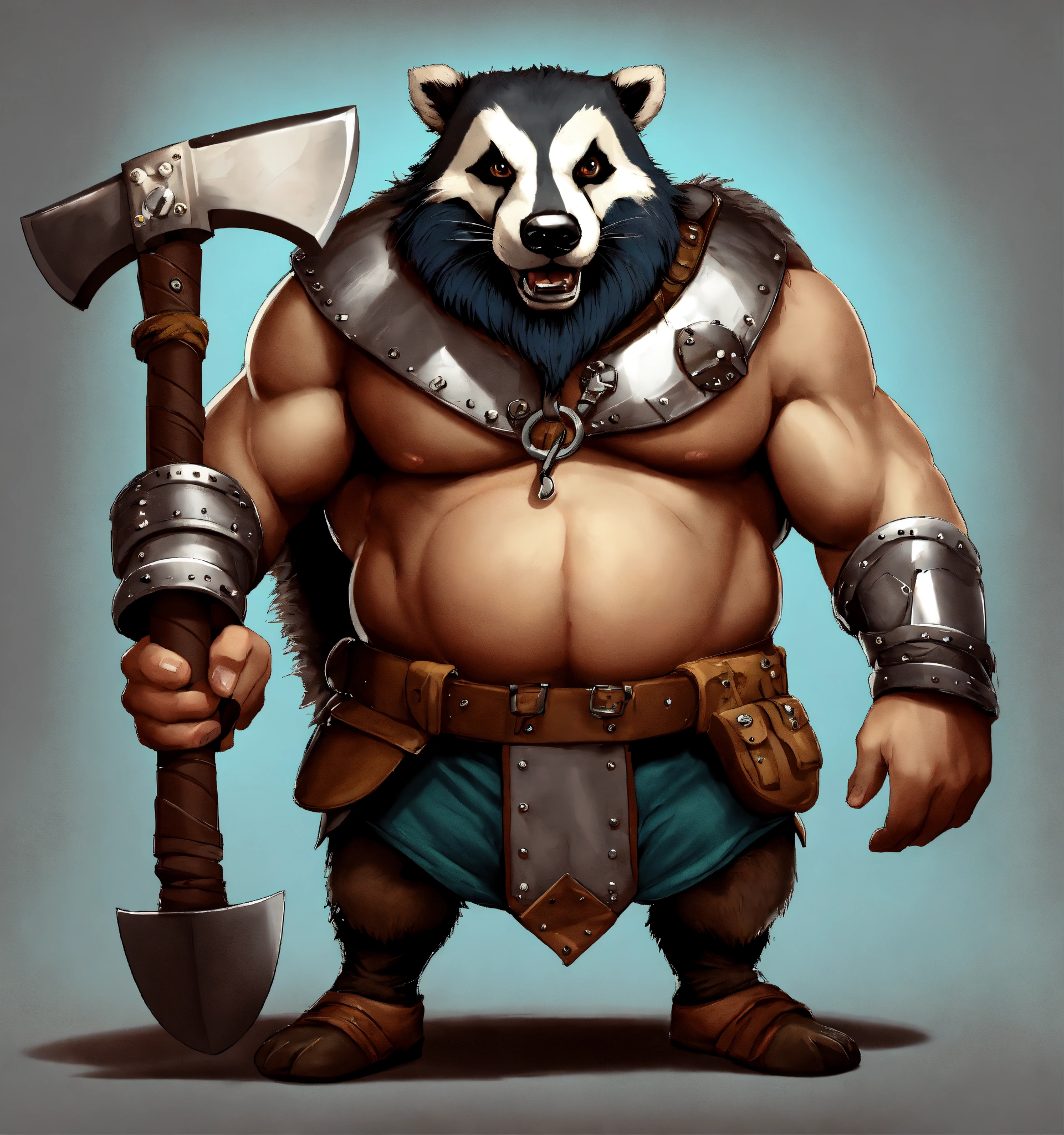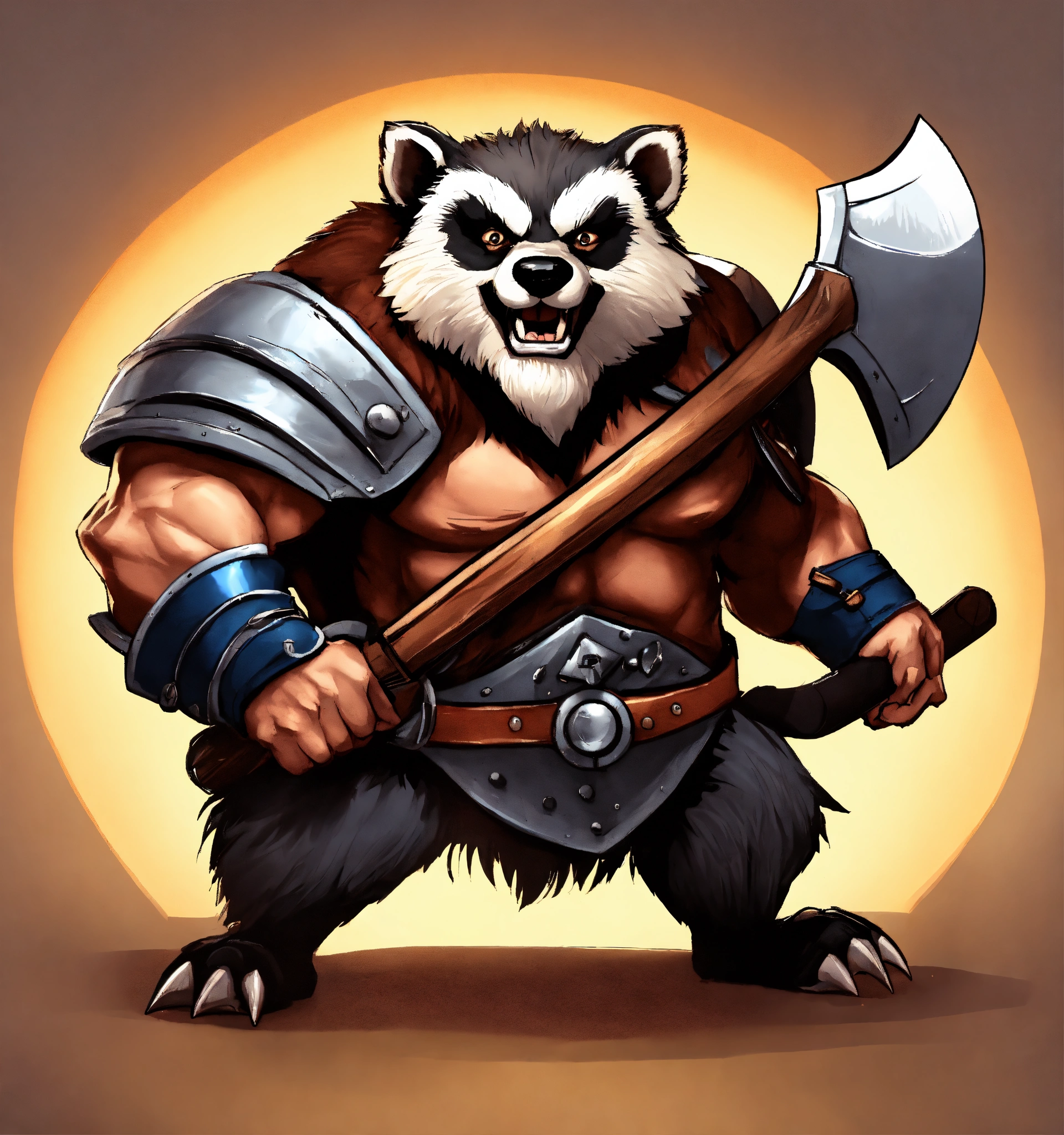 A game character cartoonish realistic heavy metal round body devious badger viking with a battle axe