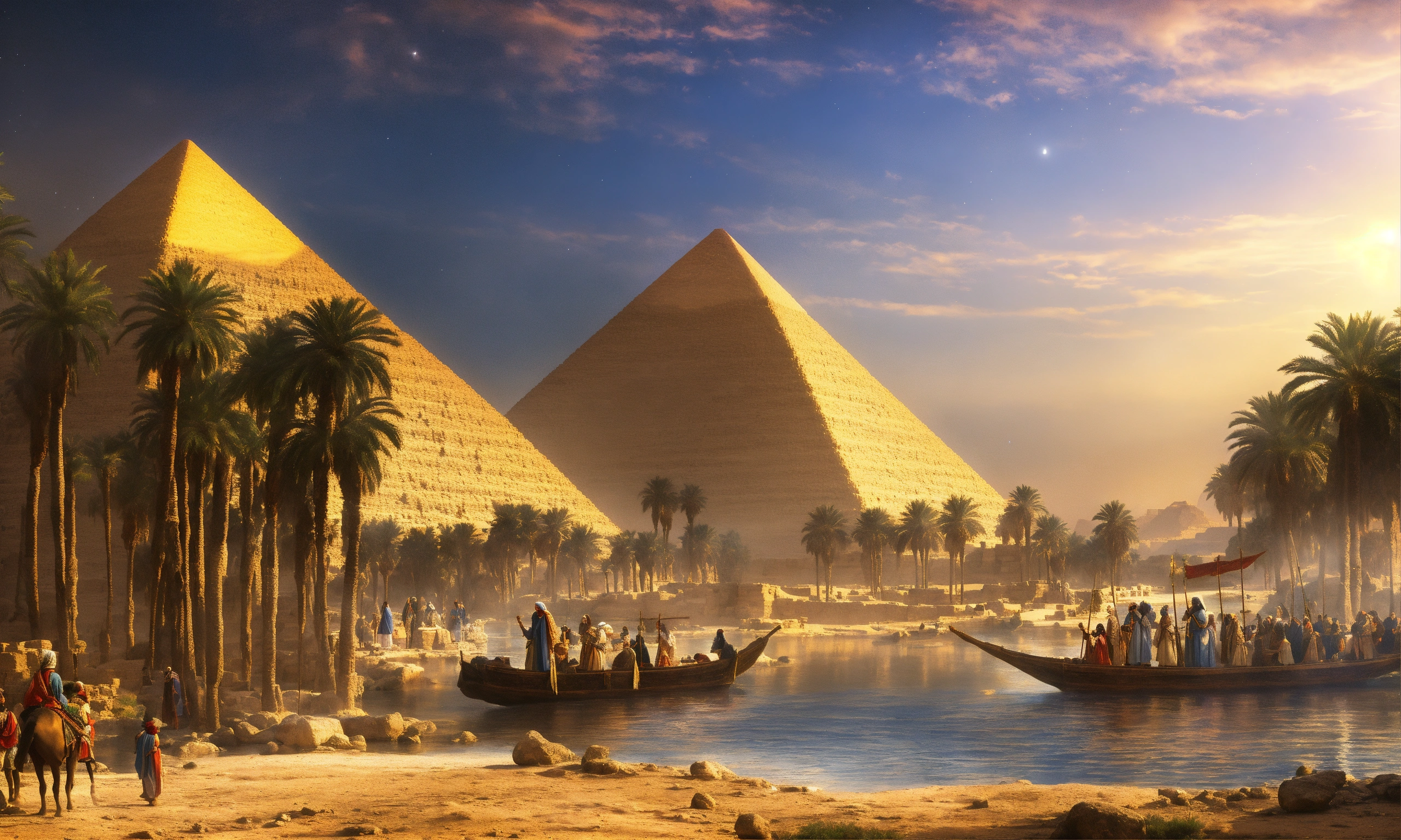 The background should include historical and mystical landscapes of egypt. symbols such as the nile river and pyramids should represent egypt. in front, hz. moses should be portrayed as a great leader. he must be shown in traditional hebrew garb and confidently leading the hebrew people. he must have stone tablets in his hands, on which he carries the commands he received from god. hebrews, hz. it should be shown preparing to leave egypt under the leadership of moses. their celebration of this moment of departure with their belongings and their children should be depicted. it should be designed as a night scene. the sky is covered with stars and the lighting creates a visual oasis. this atmosphere symbolizes hope and freedom. the nile river should also be included in the image. hz. moses and the hebrews should be depicted crossing the river. the water may appear to split. 8k
