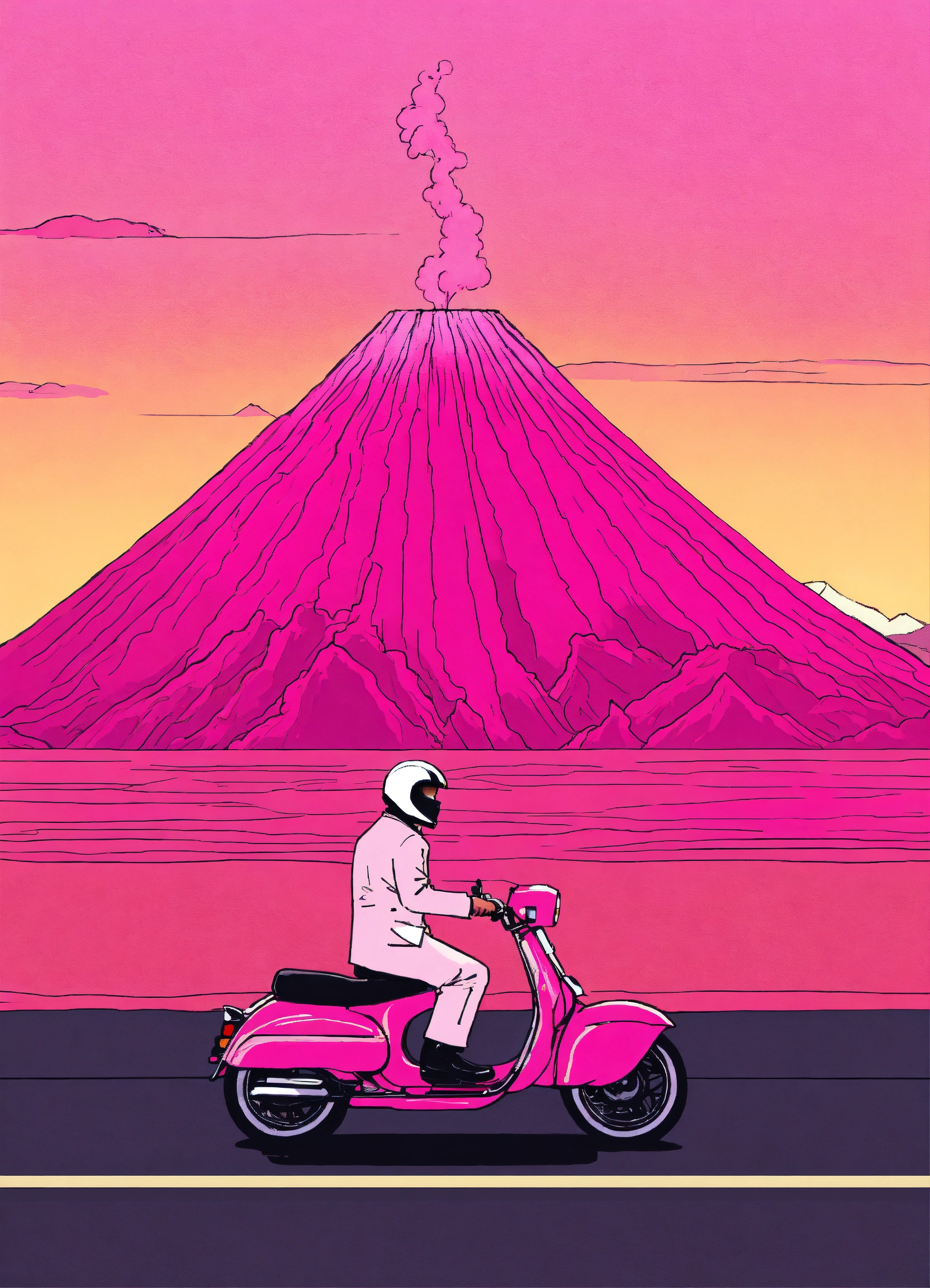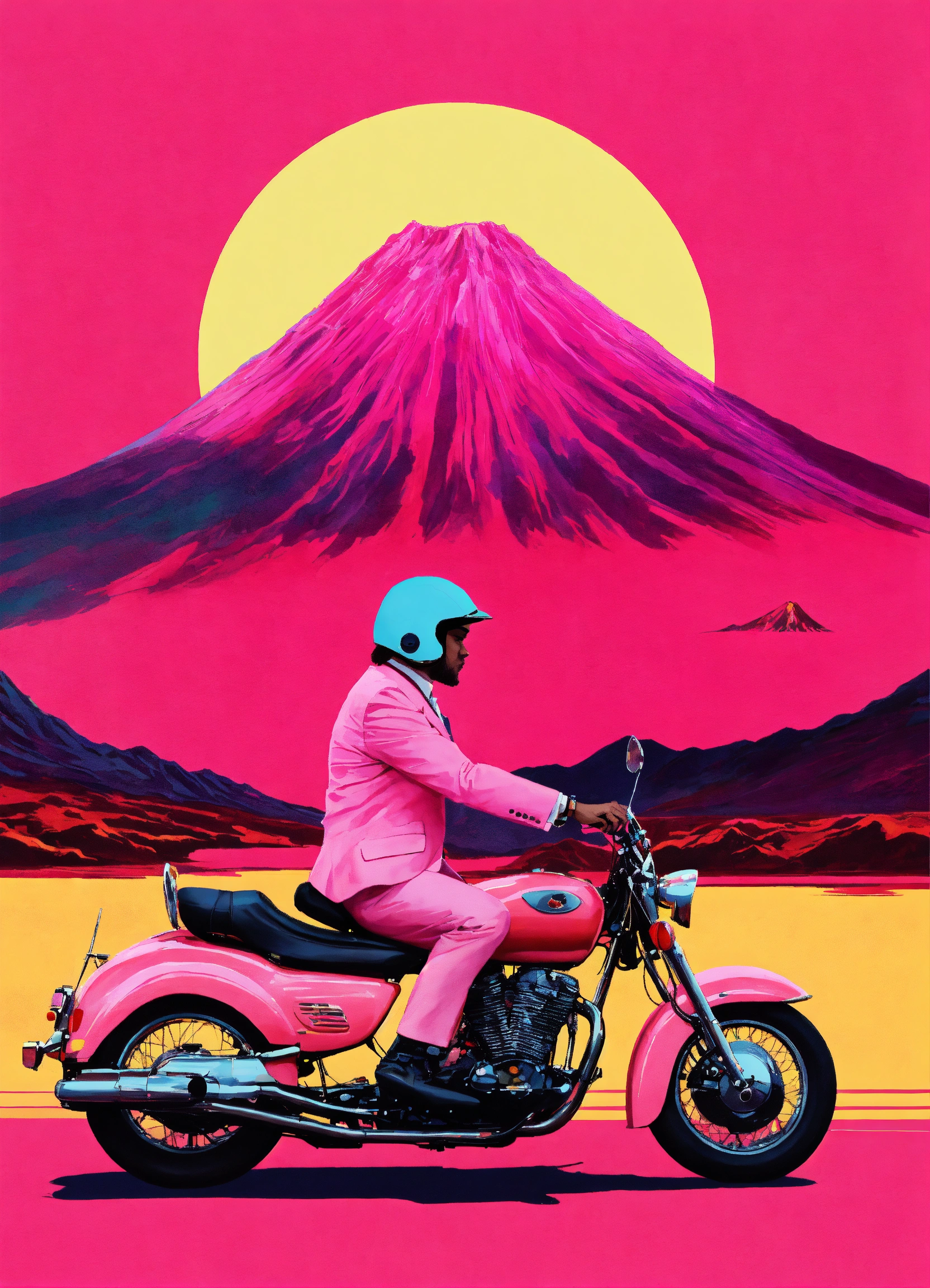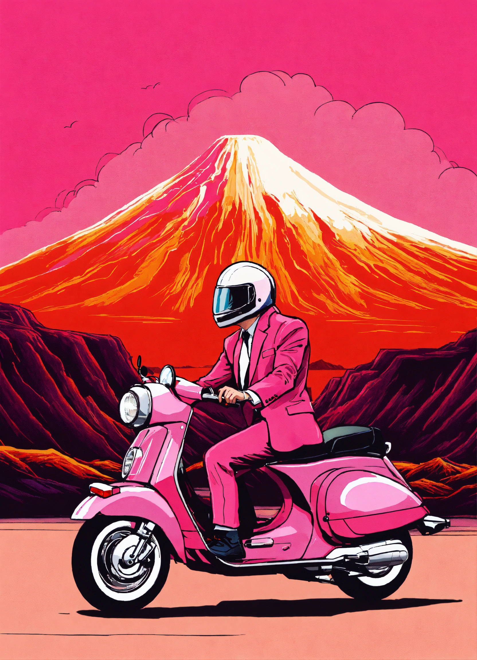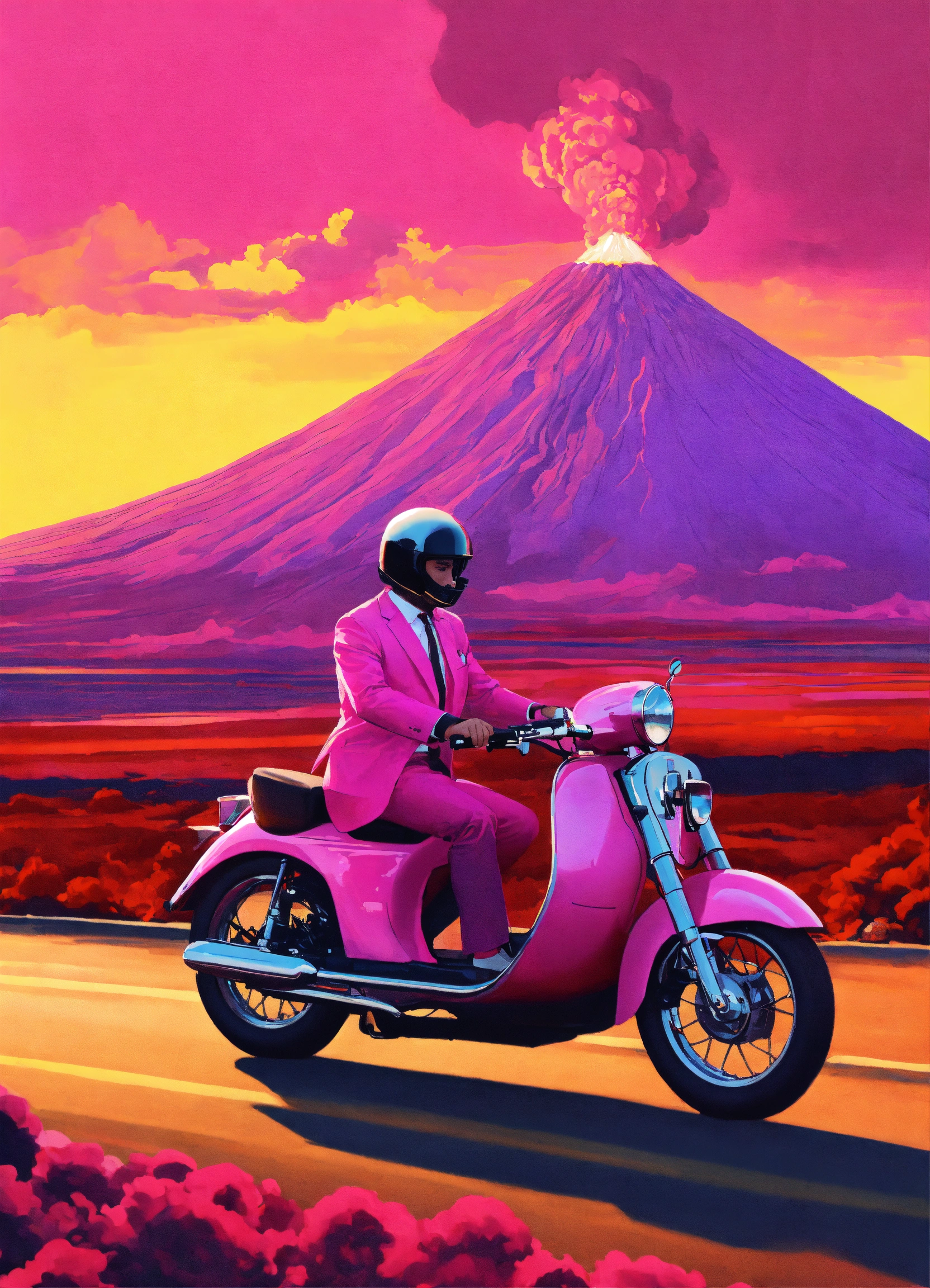 A man wearing a pink suit, walking on a motorcycle in front of a giant volcano, in the style of digital painting and drawing, classic american cars, iconic album covers, synthetism-inspired, cinquecento, shock art, wimmelbilder --s 750