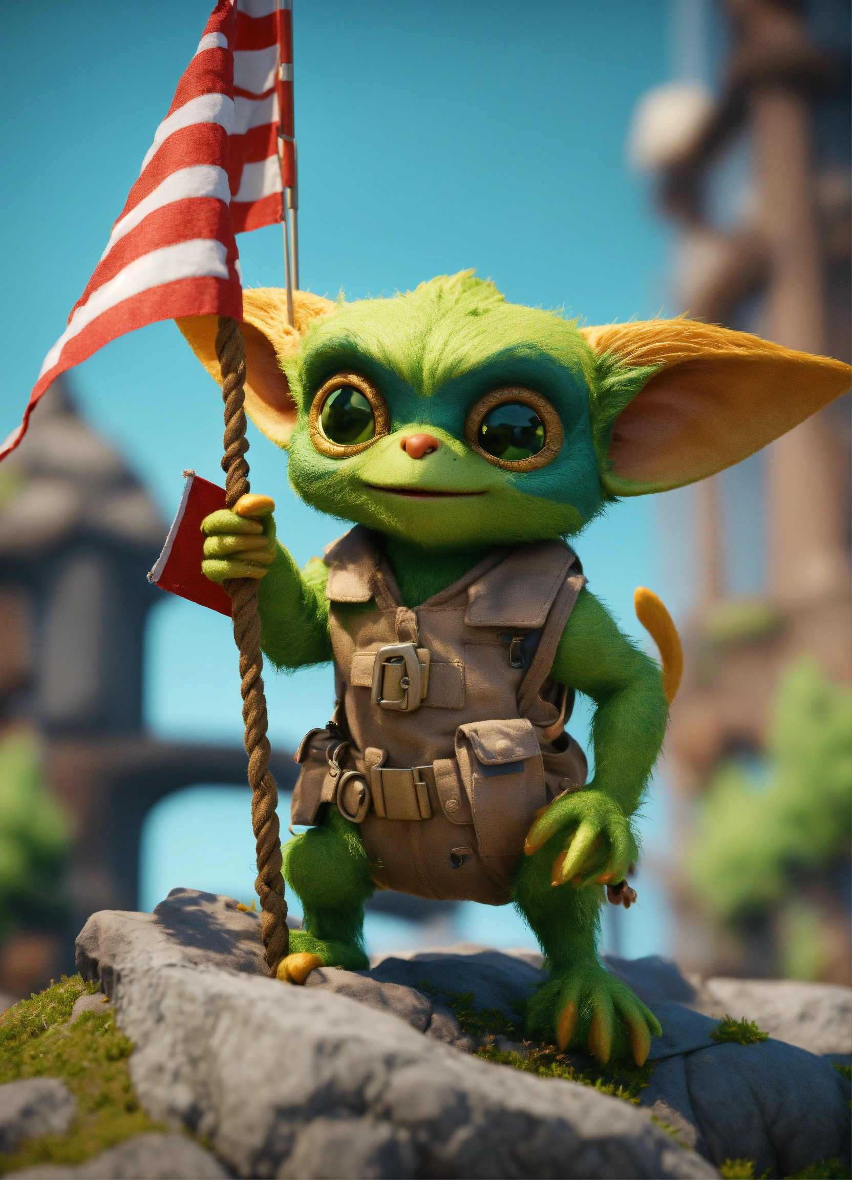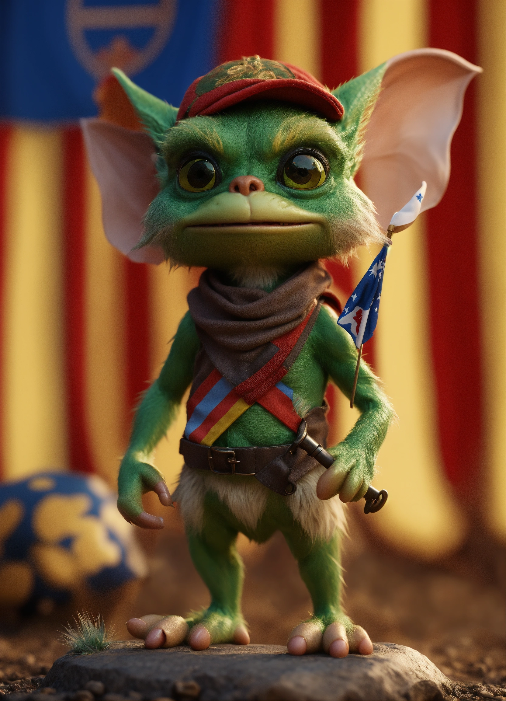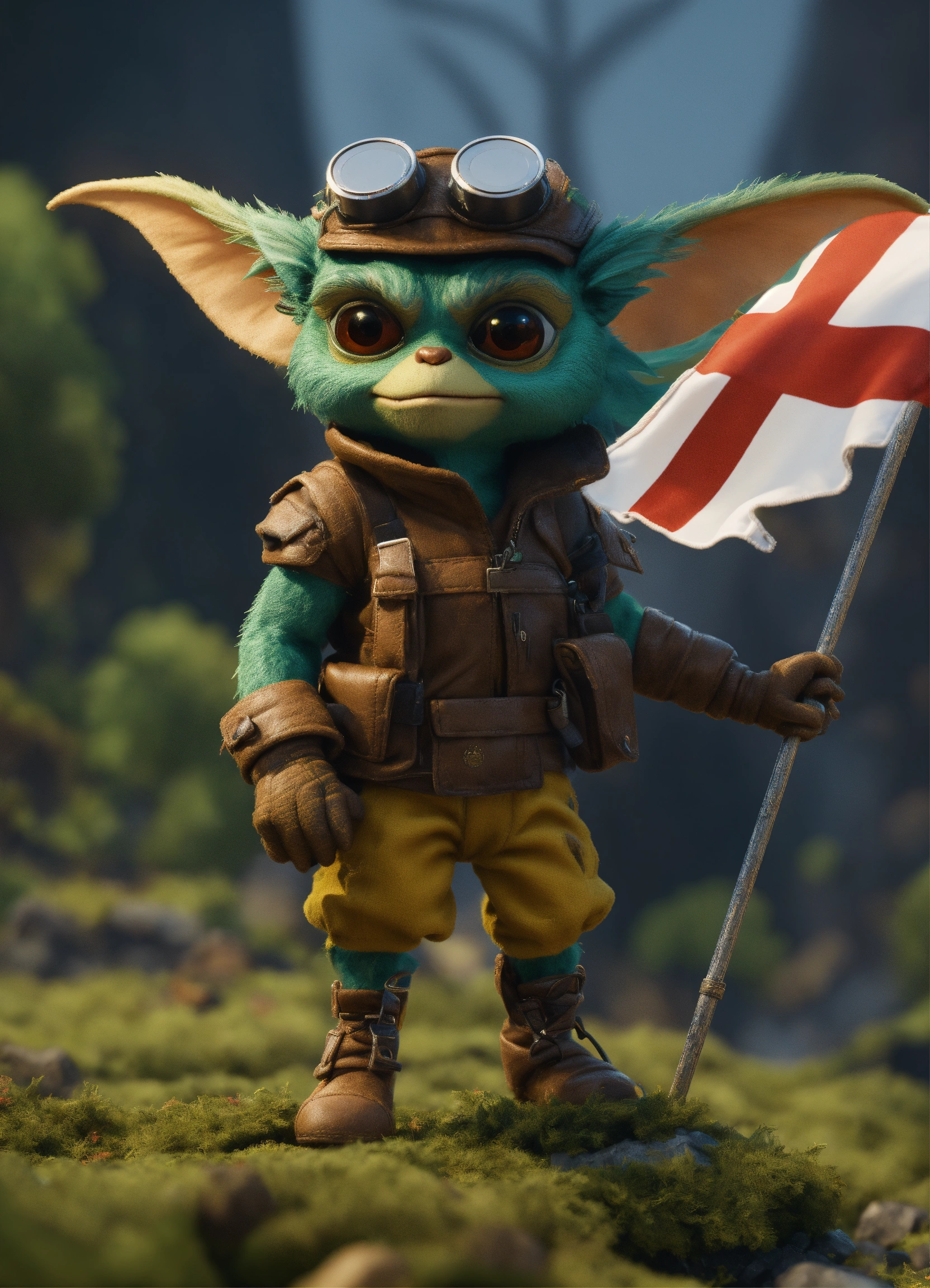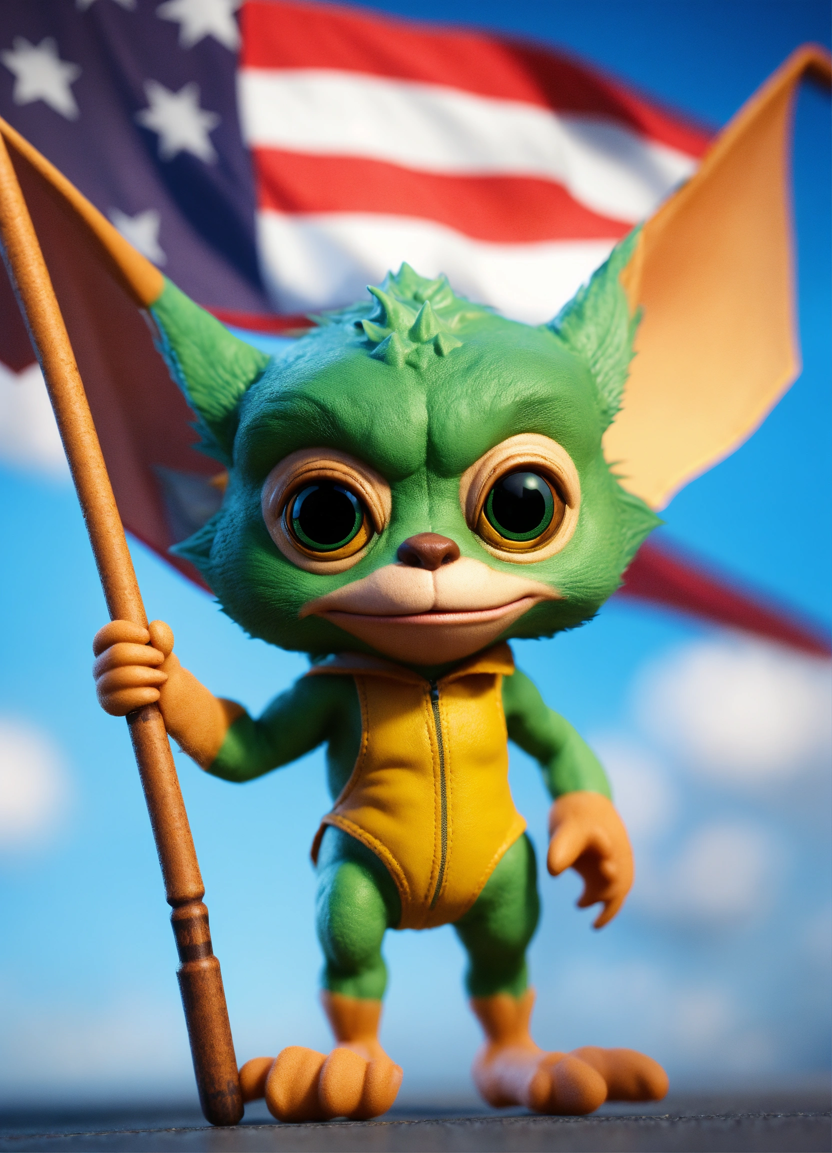 Leica portrait of a gremlin waving a flag to guide towards the north, coded patterns, sparse and simple, cartoon and claymation style, unreal engine render, 8k, intricate details