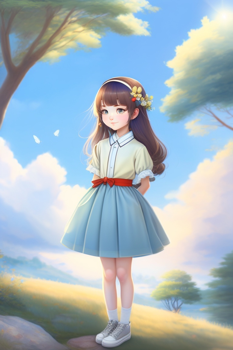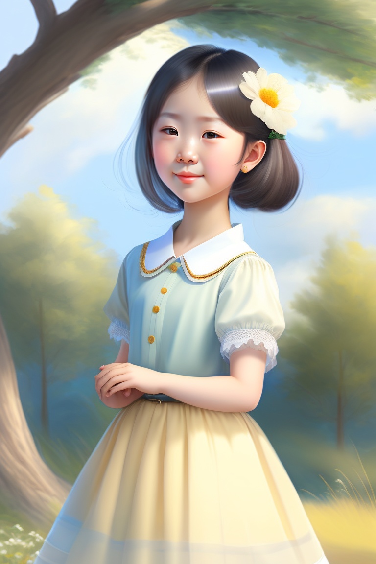 Cute korean girl around 5'2 feet height, fair skin tone, portrait, free hair, light yellow frock, crystal thin necklace, smiling very softly, peace on her face, sparkling eyes, a star hairclip on head, dented cheeks, big eyes, round face, notebook in her hand, cloudy blue white sky in background, standing near a tree