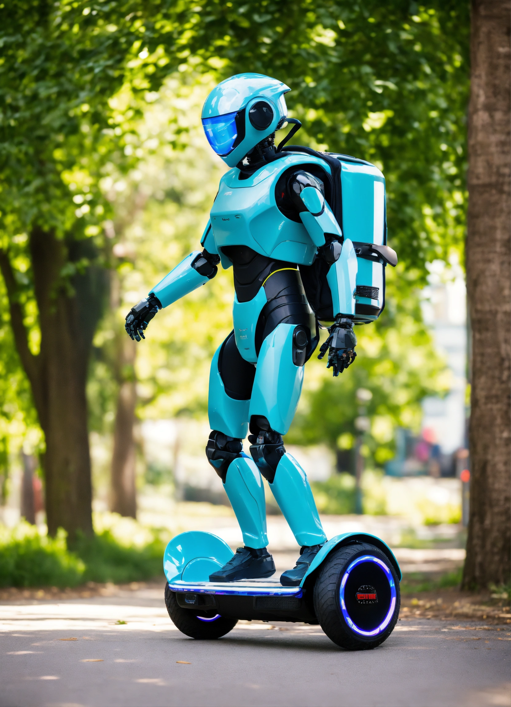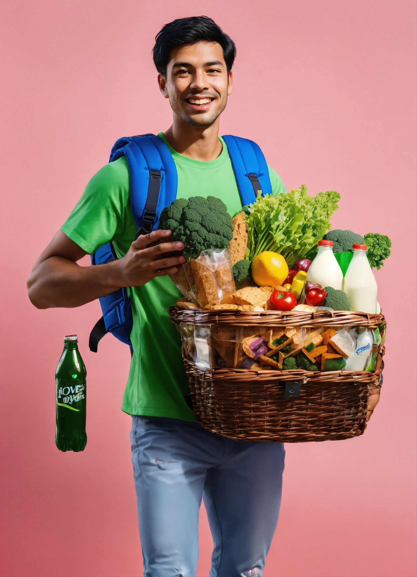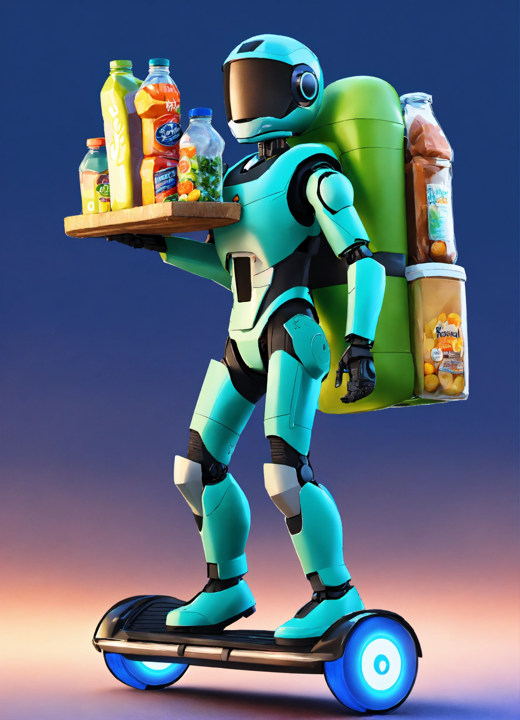 A passionate male robot on hoverboard, realistic man face, clear eyes, black hair, full appearance, delivering groceries, assorted milk bottle, bread pack, soft drink, and some assorted vegetables basket on hands. sports backpack. transparent background, the predominant design colors are gradients of blue and green. no background images, background should be gradients of blue and green