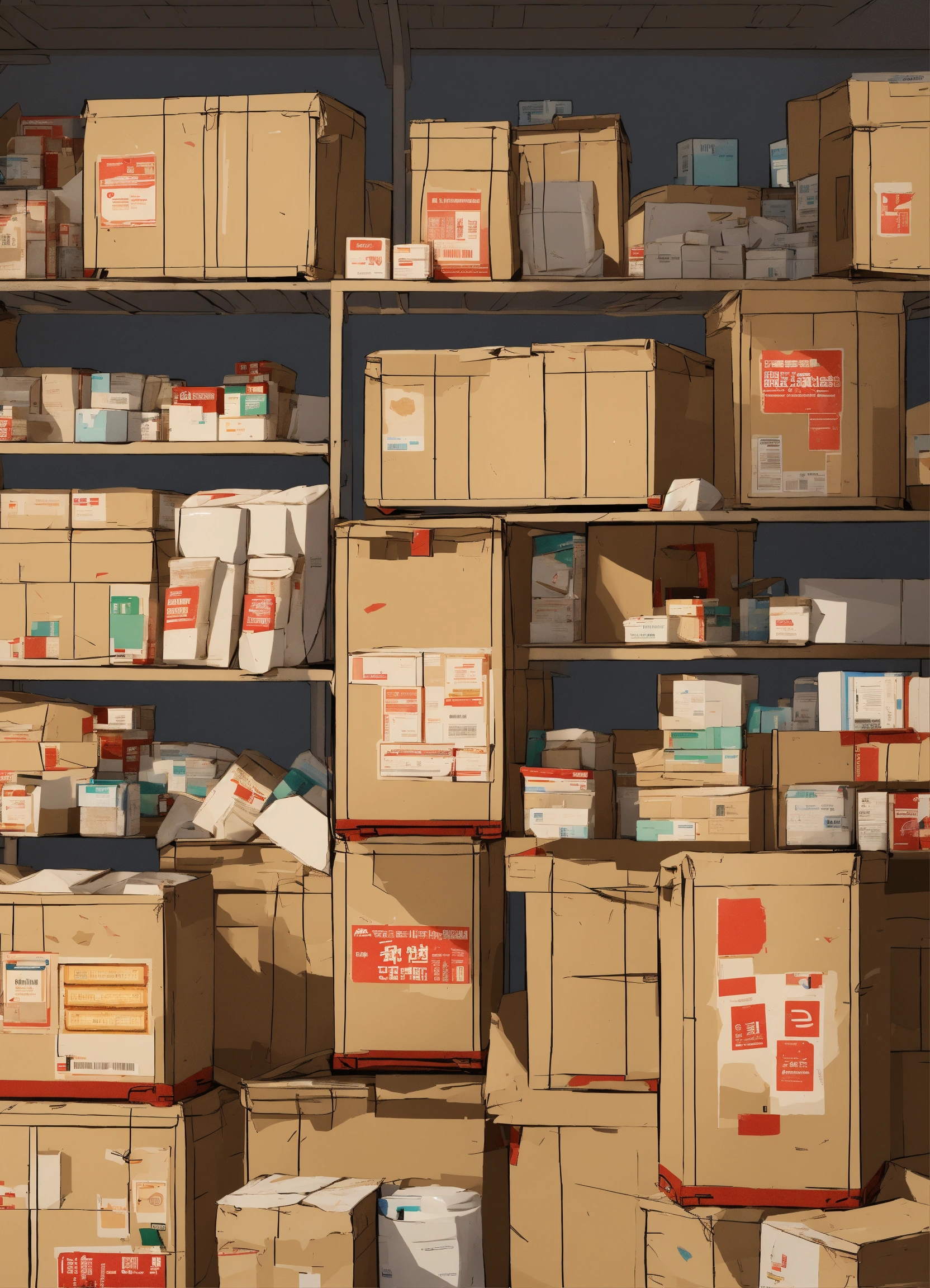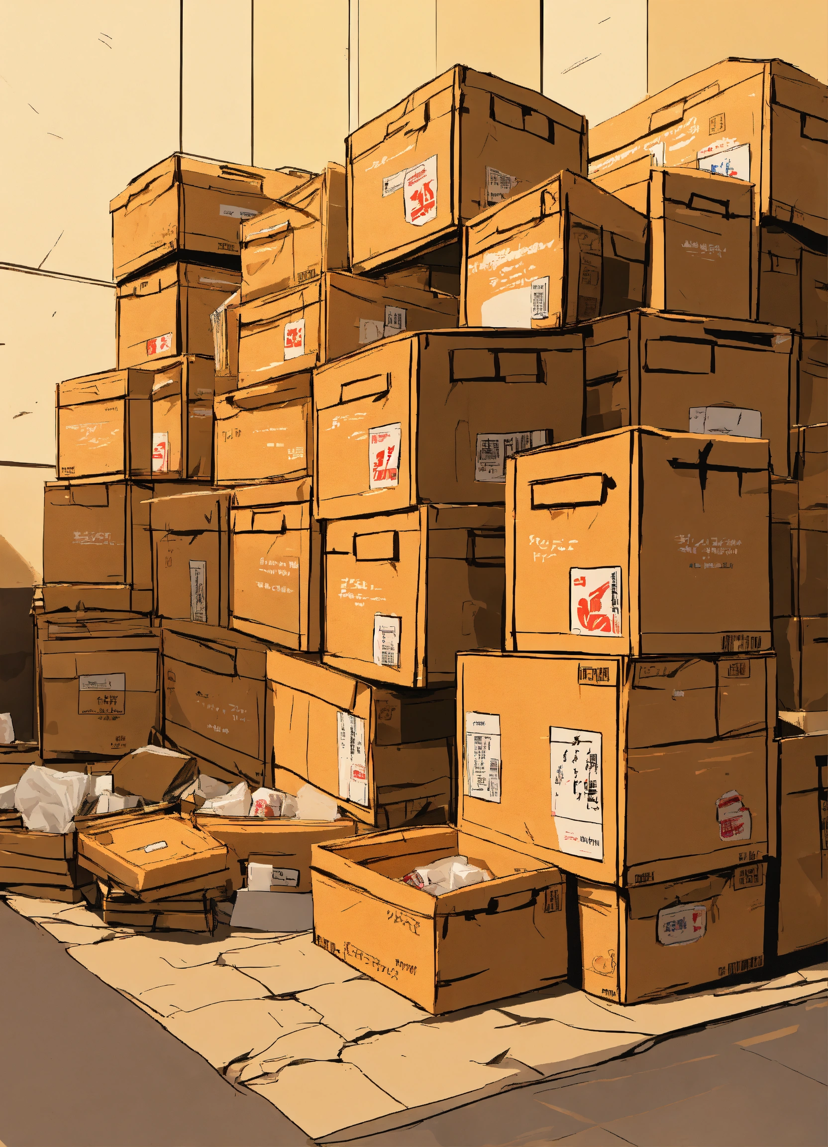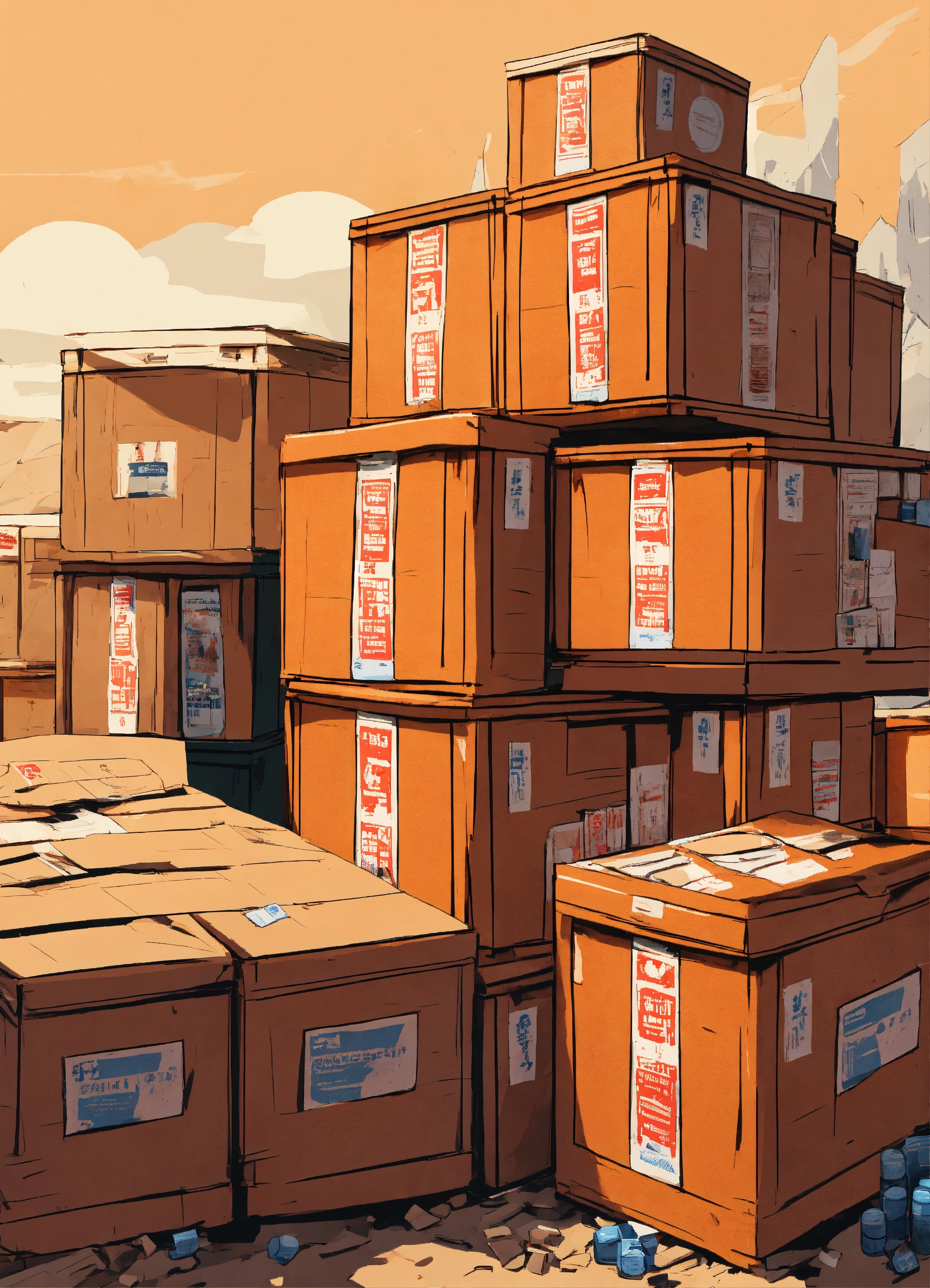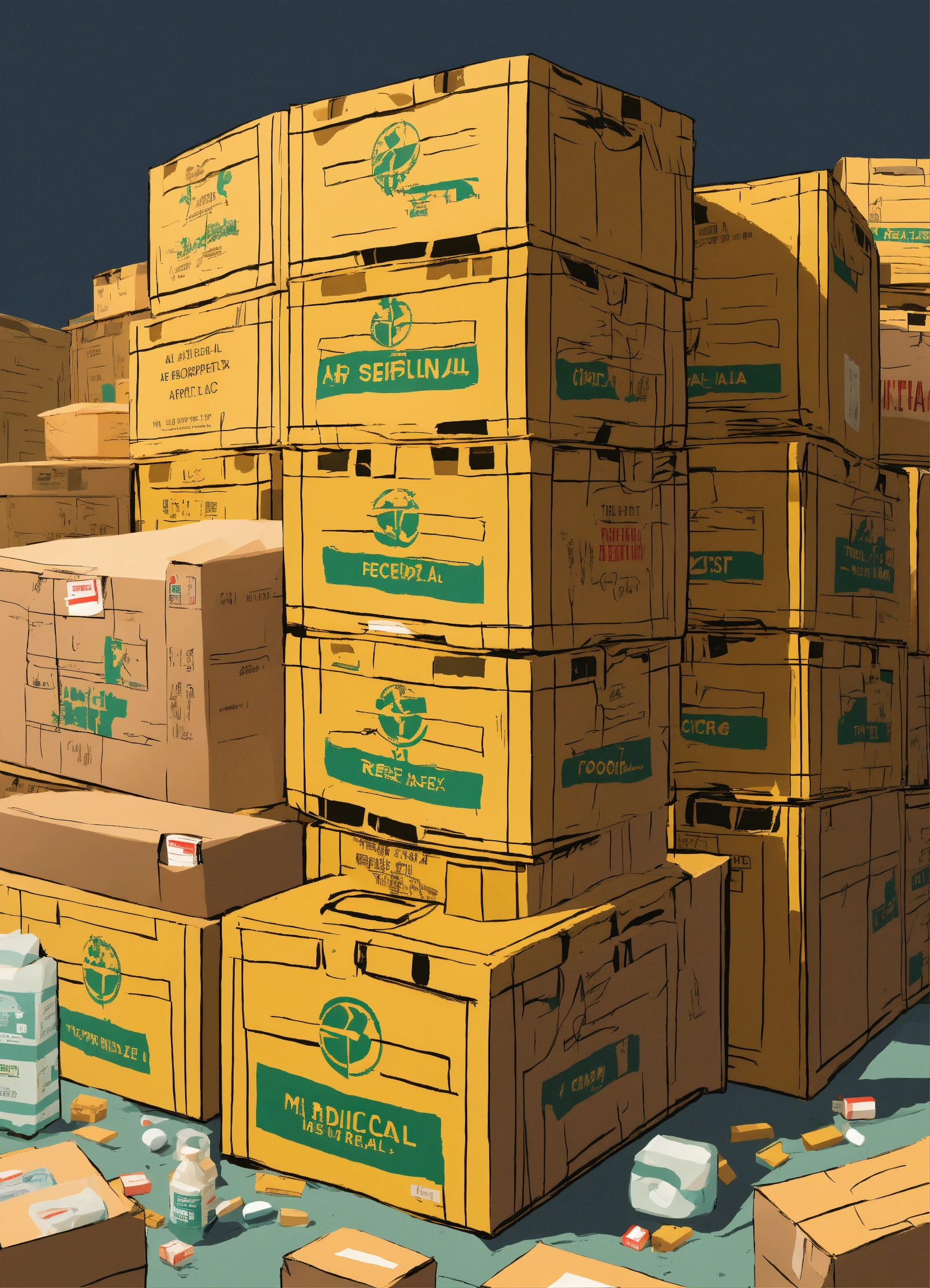 Numerous relief boxes, strategically piled up, containing aid supplies such as medicine, food, and medical equipment rendered as an illustration.