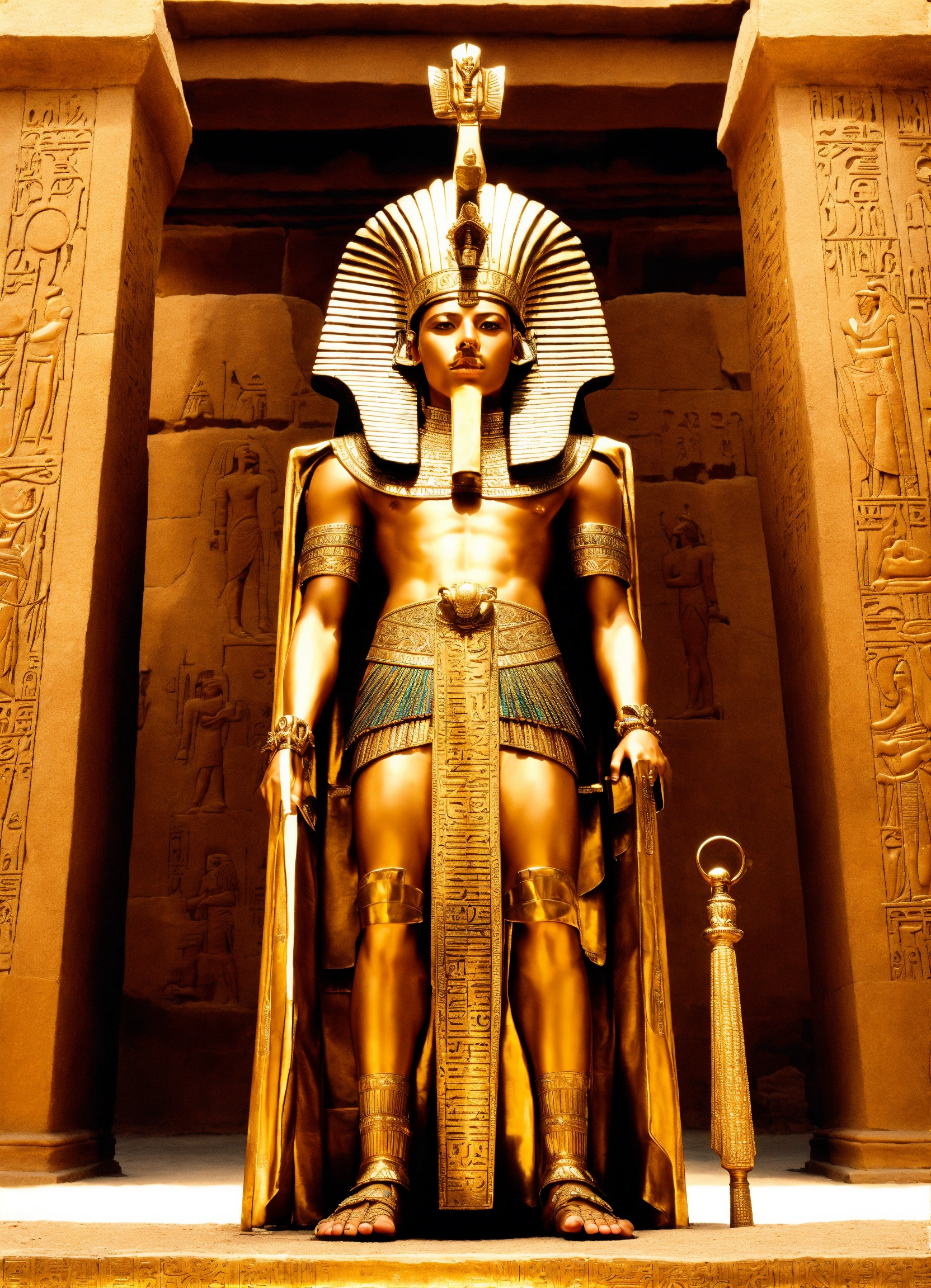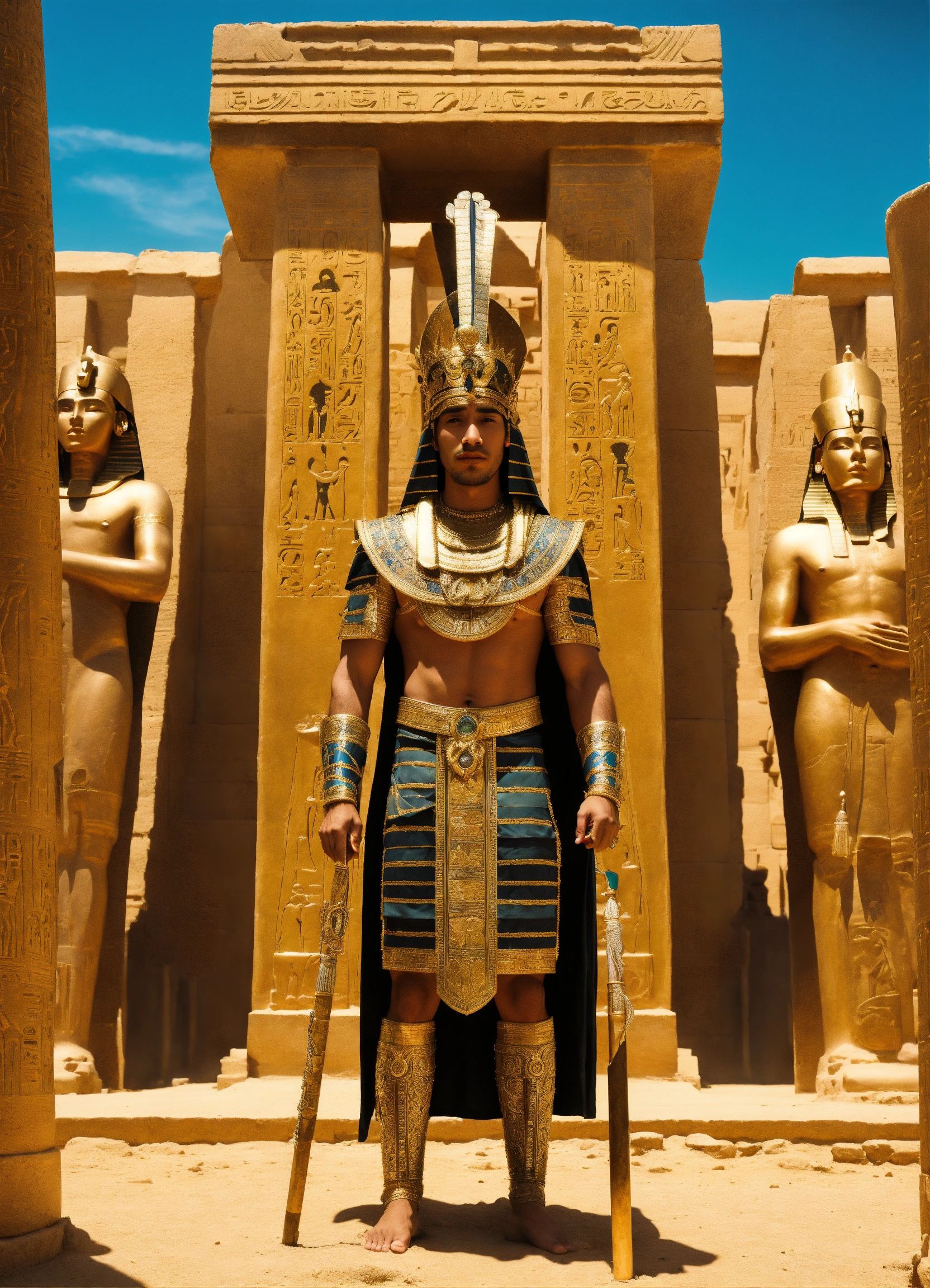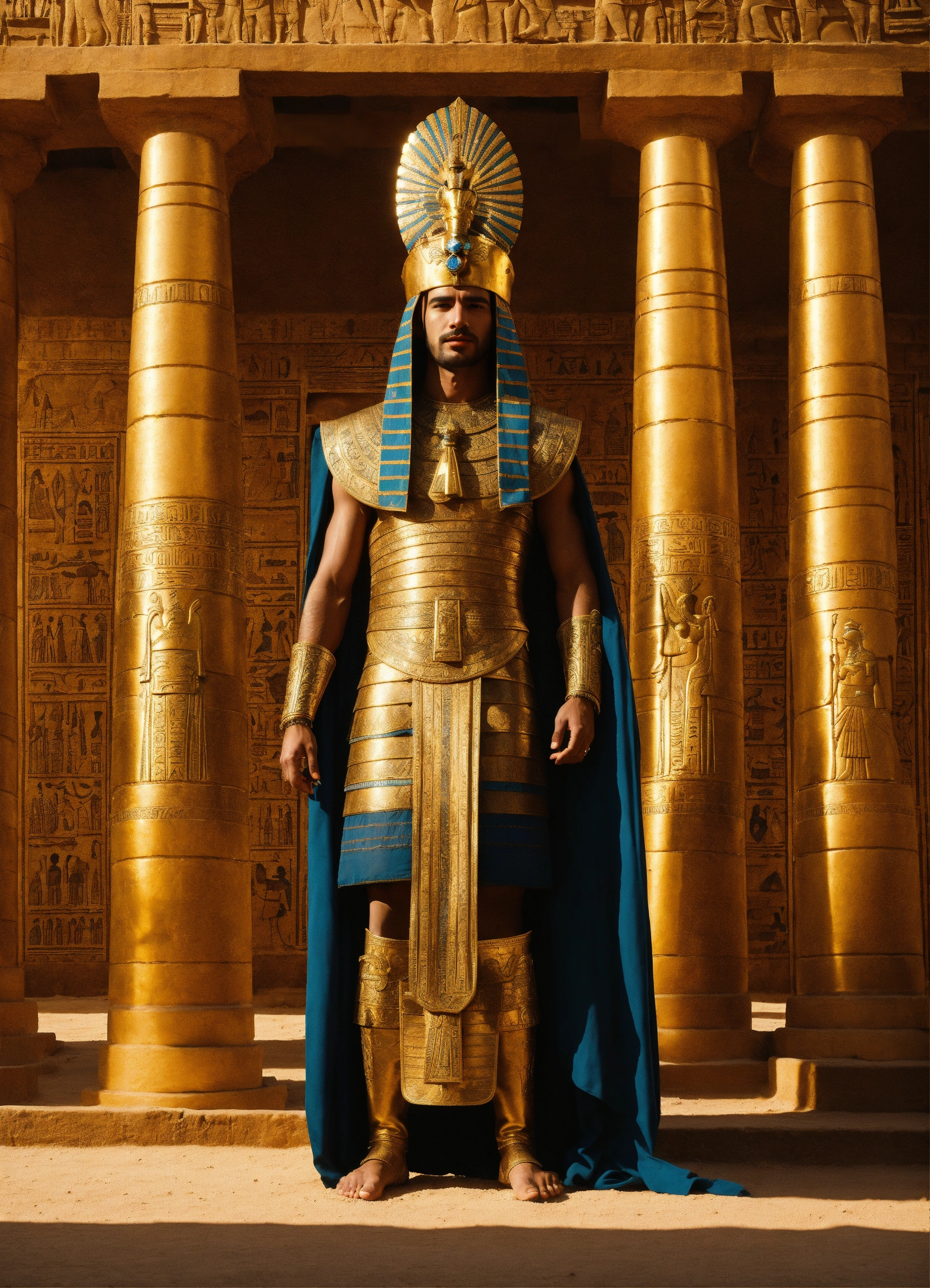 "alejandro magno, radiating divine aura, egypt 331 bc, ornate armor with golden details, oracle of siwa, being crowned by priests, temple pillars with the vast desert beyond, medium shot, hyper-realistic, photo realism, cinematography --ar 916"