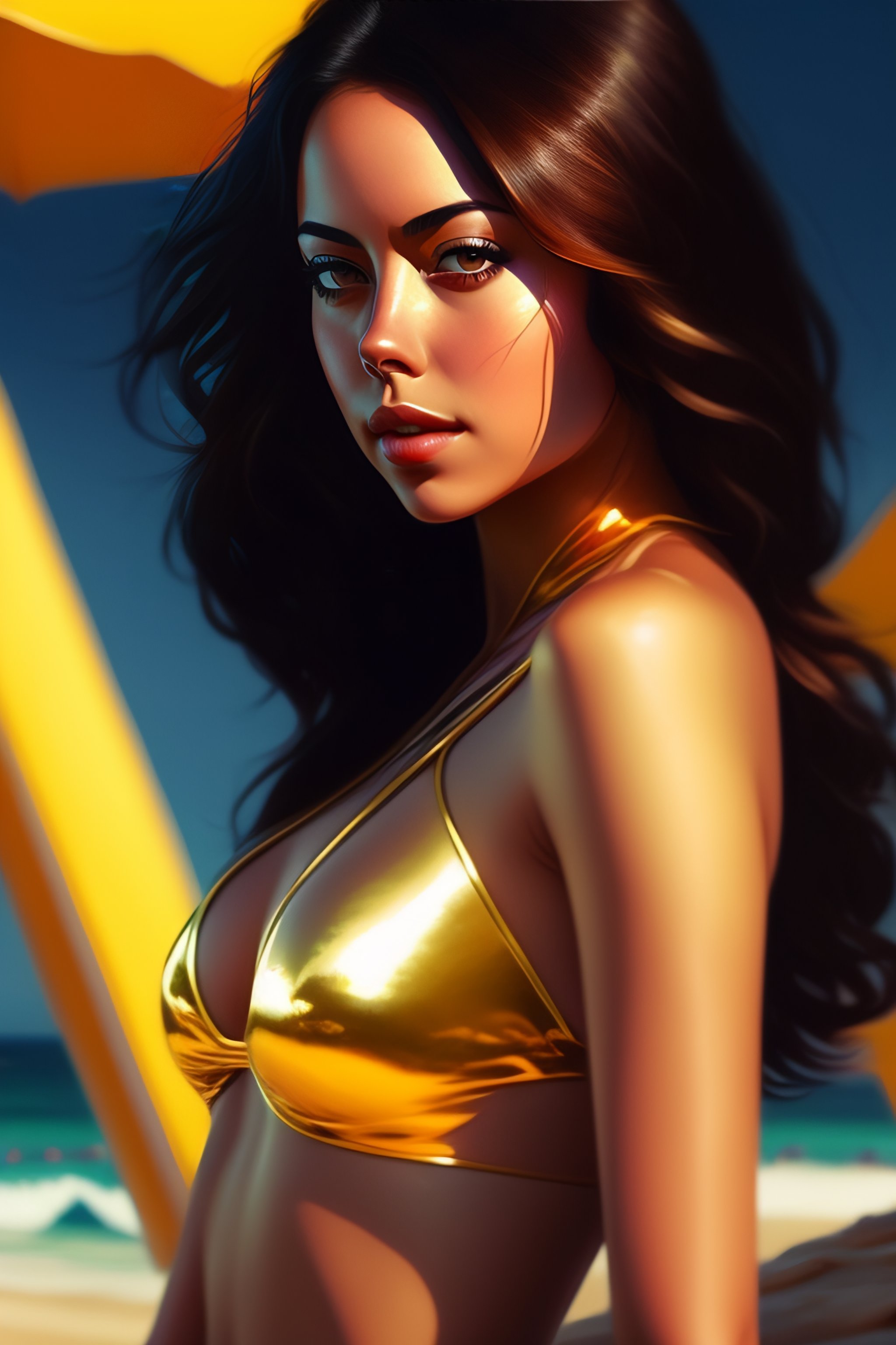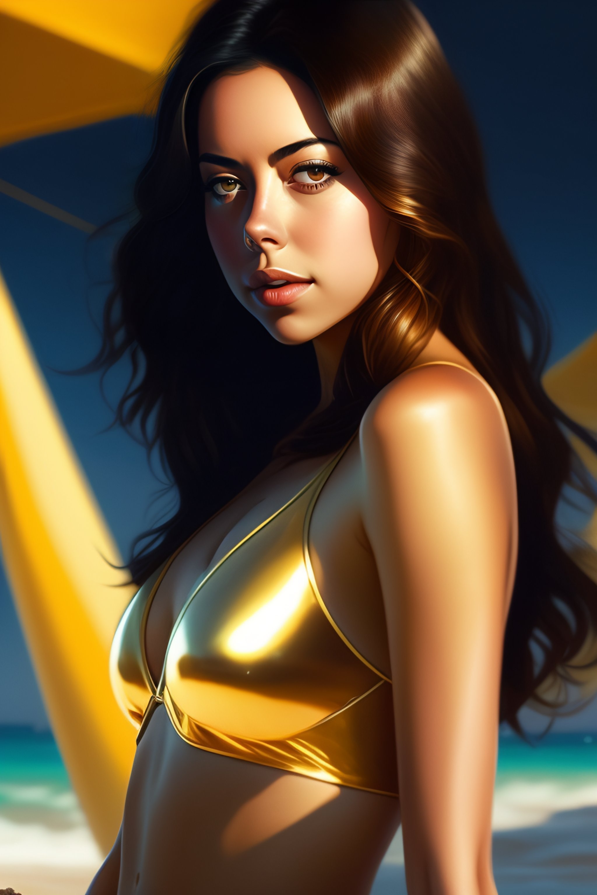 A young sexy aubrey plaza in a revealing gold bikini by the beach, illustration by greg rutkowski makoto shinkai kyoto animation key art feminine mid shot