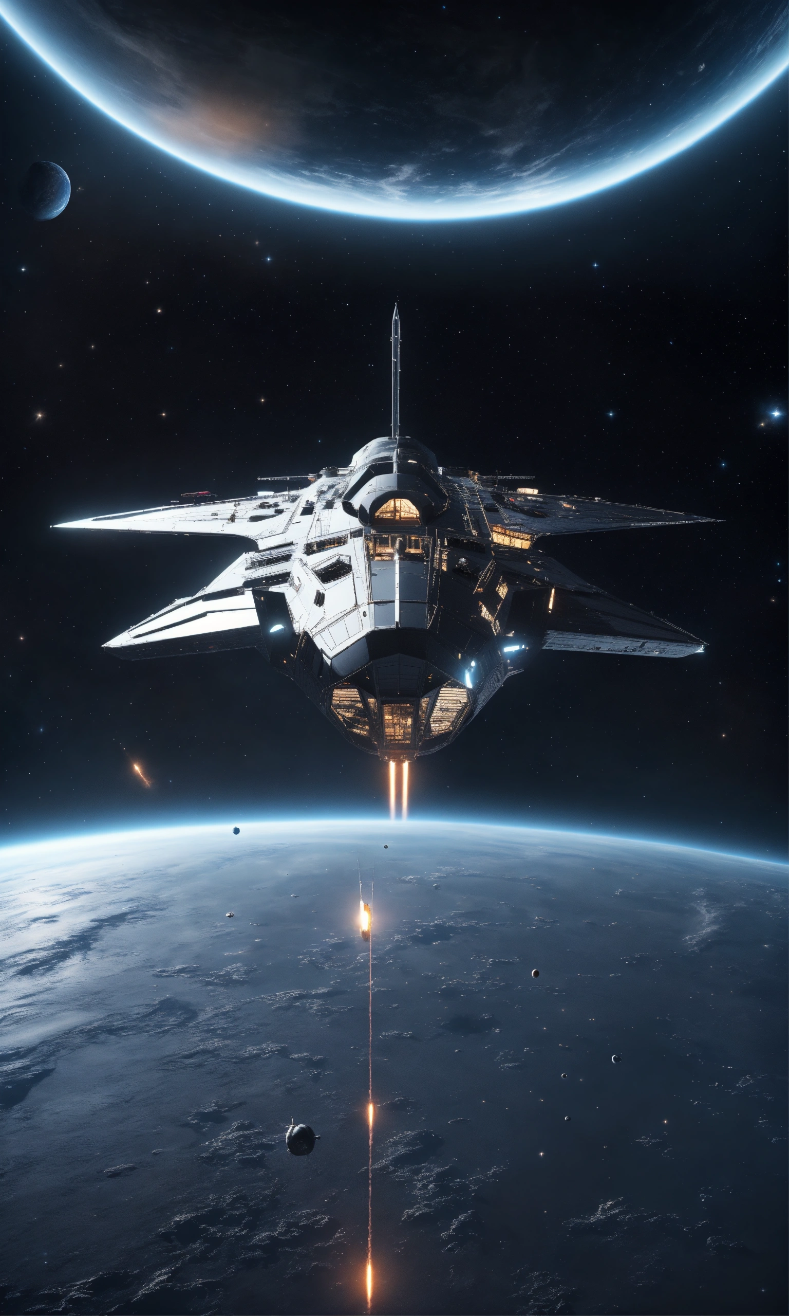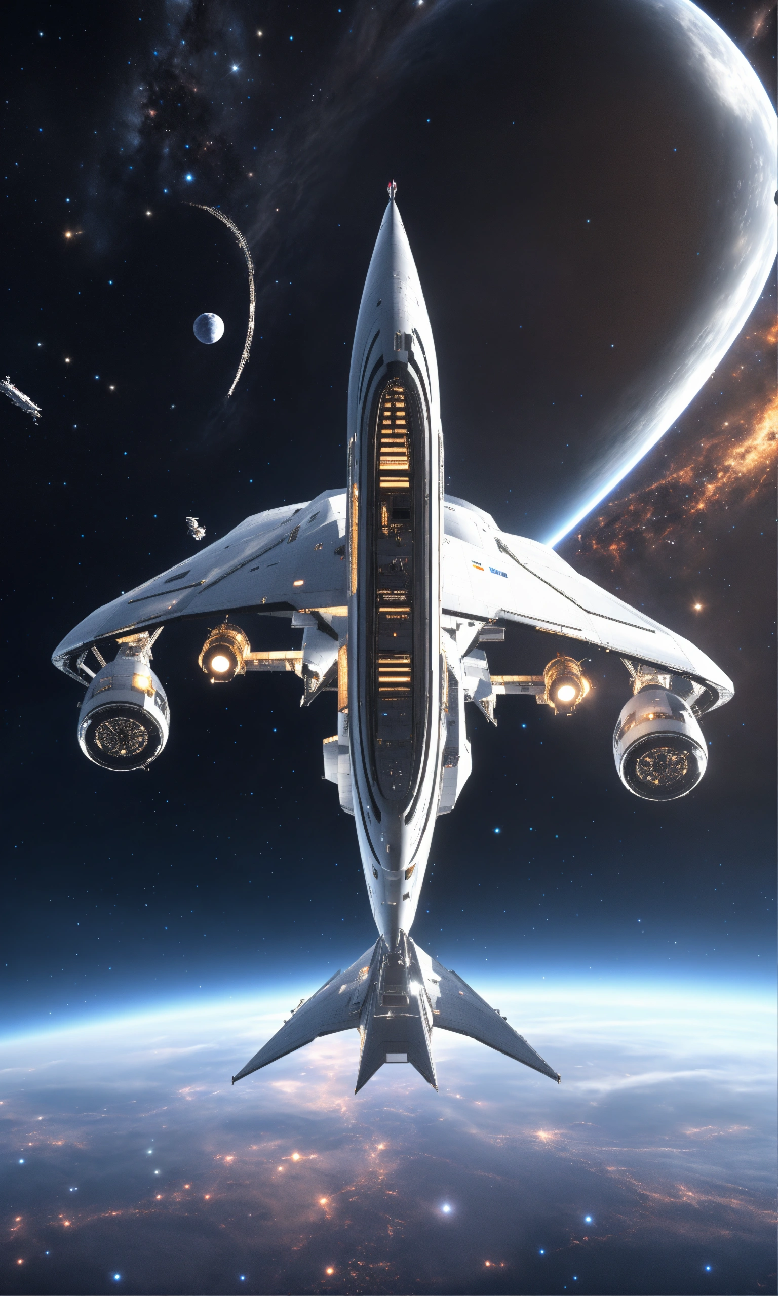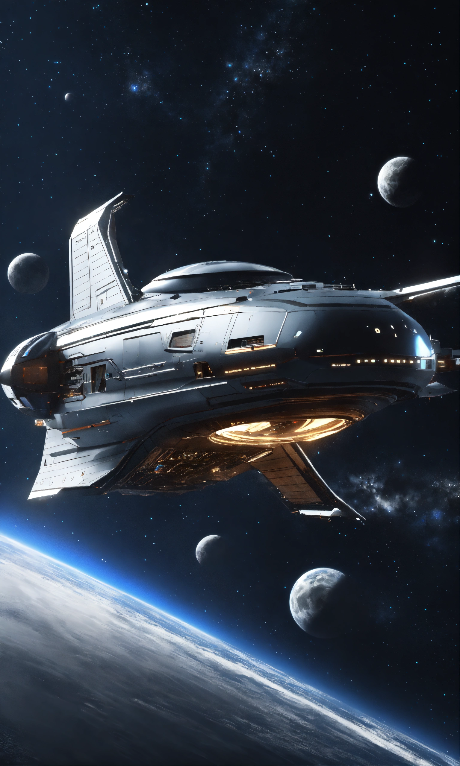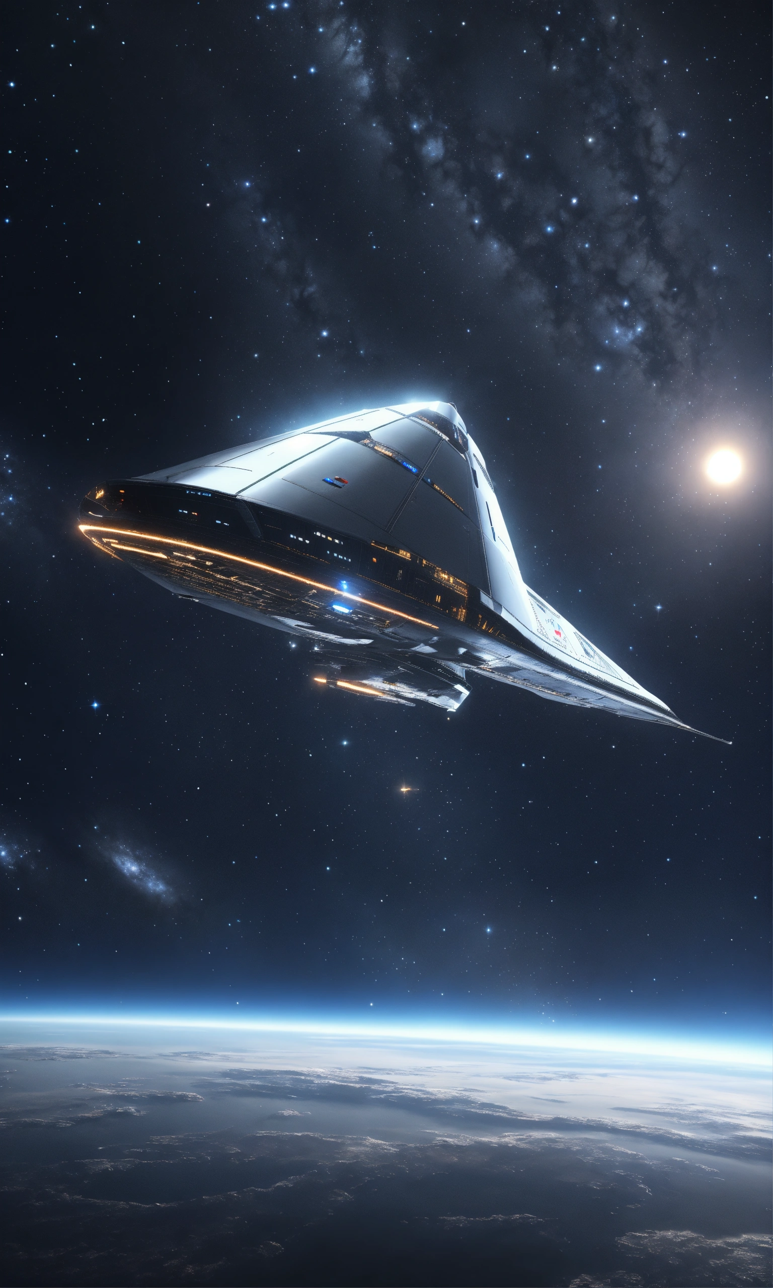 Zoom out of sleek silver space yacht flying in starry black space