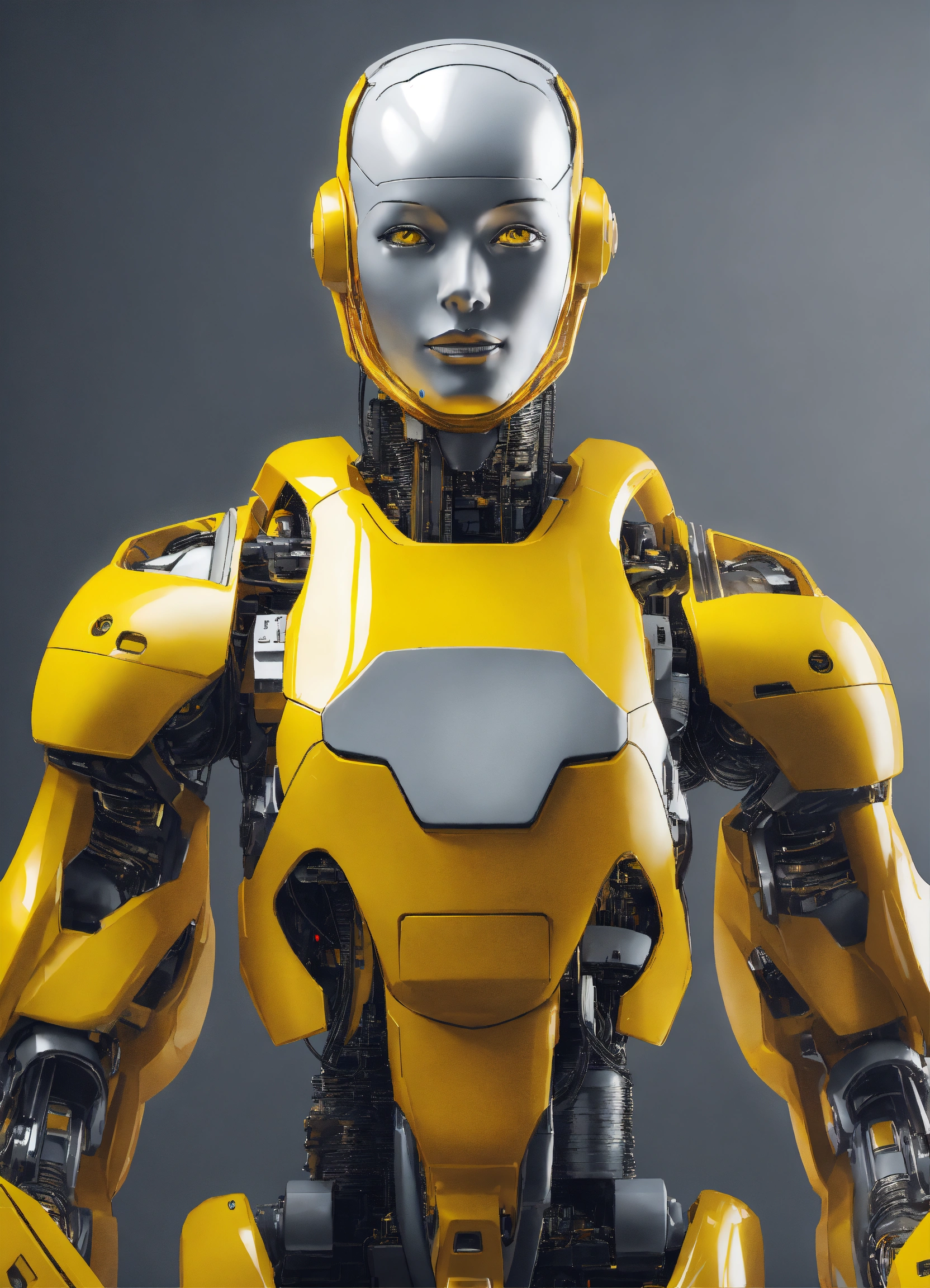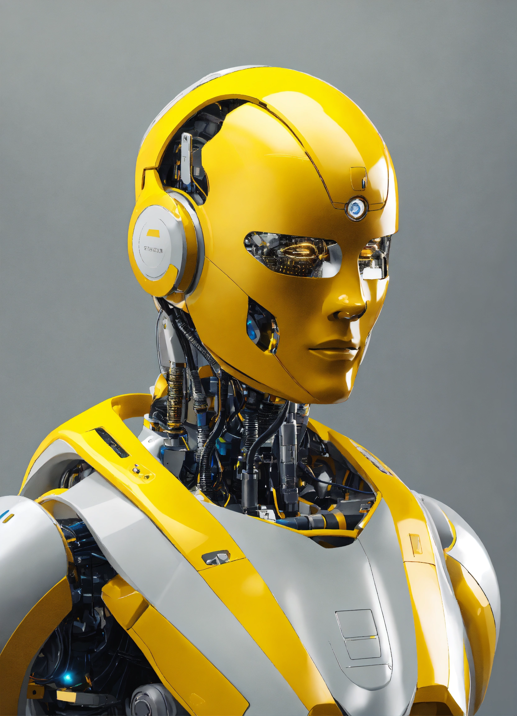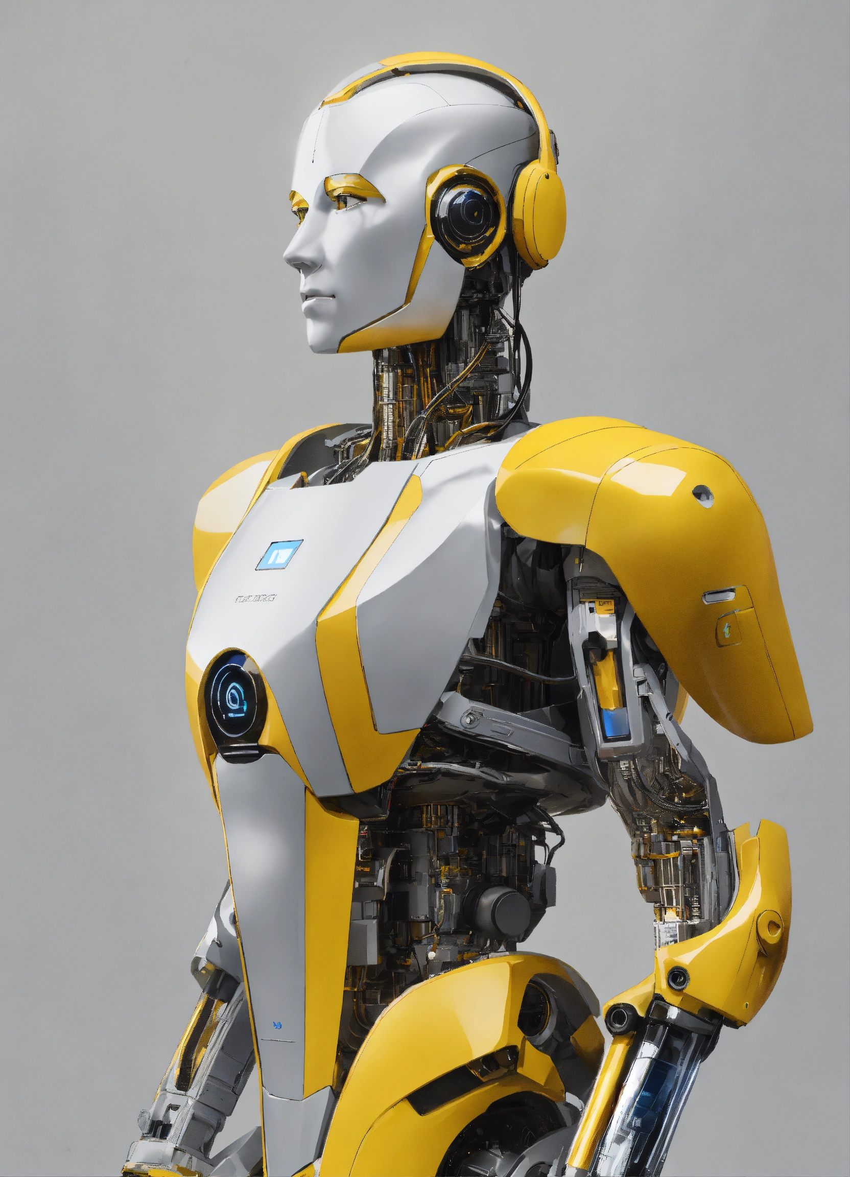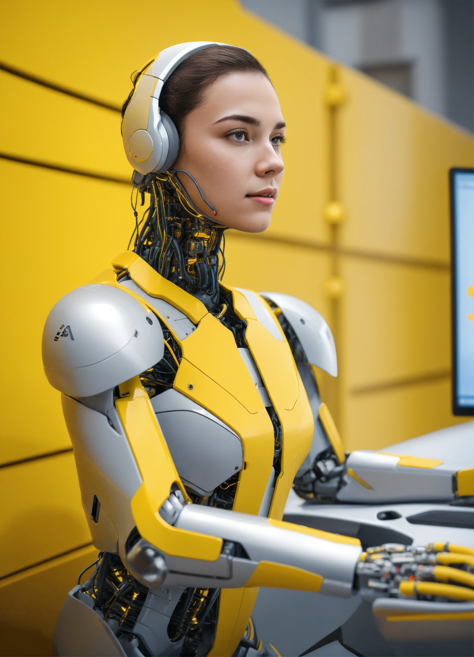 Generate a realistic image that represents artificial intelligence man assistance in the business world, with a focus on improving customer service and efficiency of a brand, light gray and yellow background